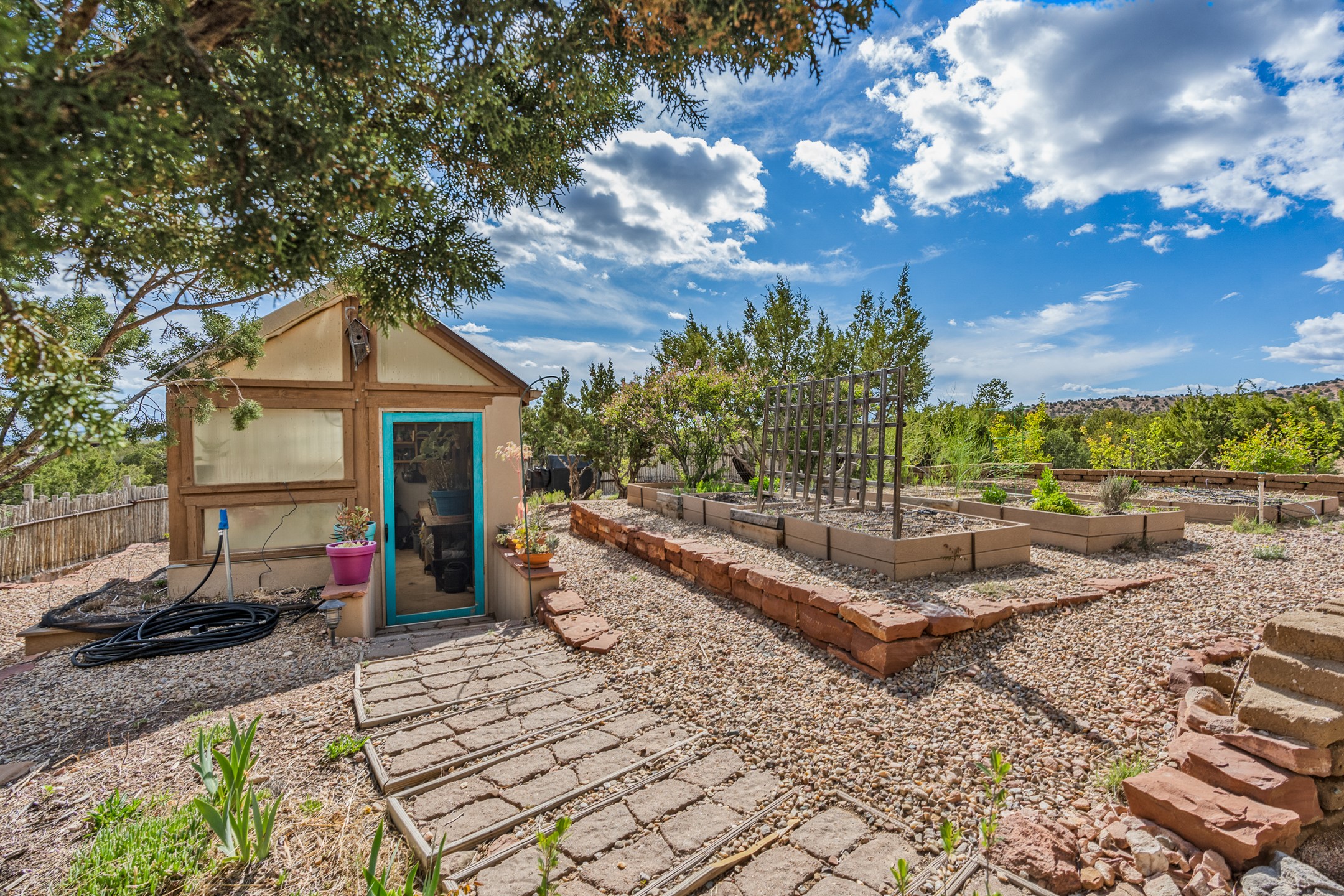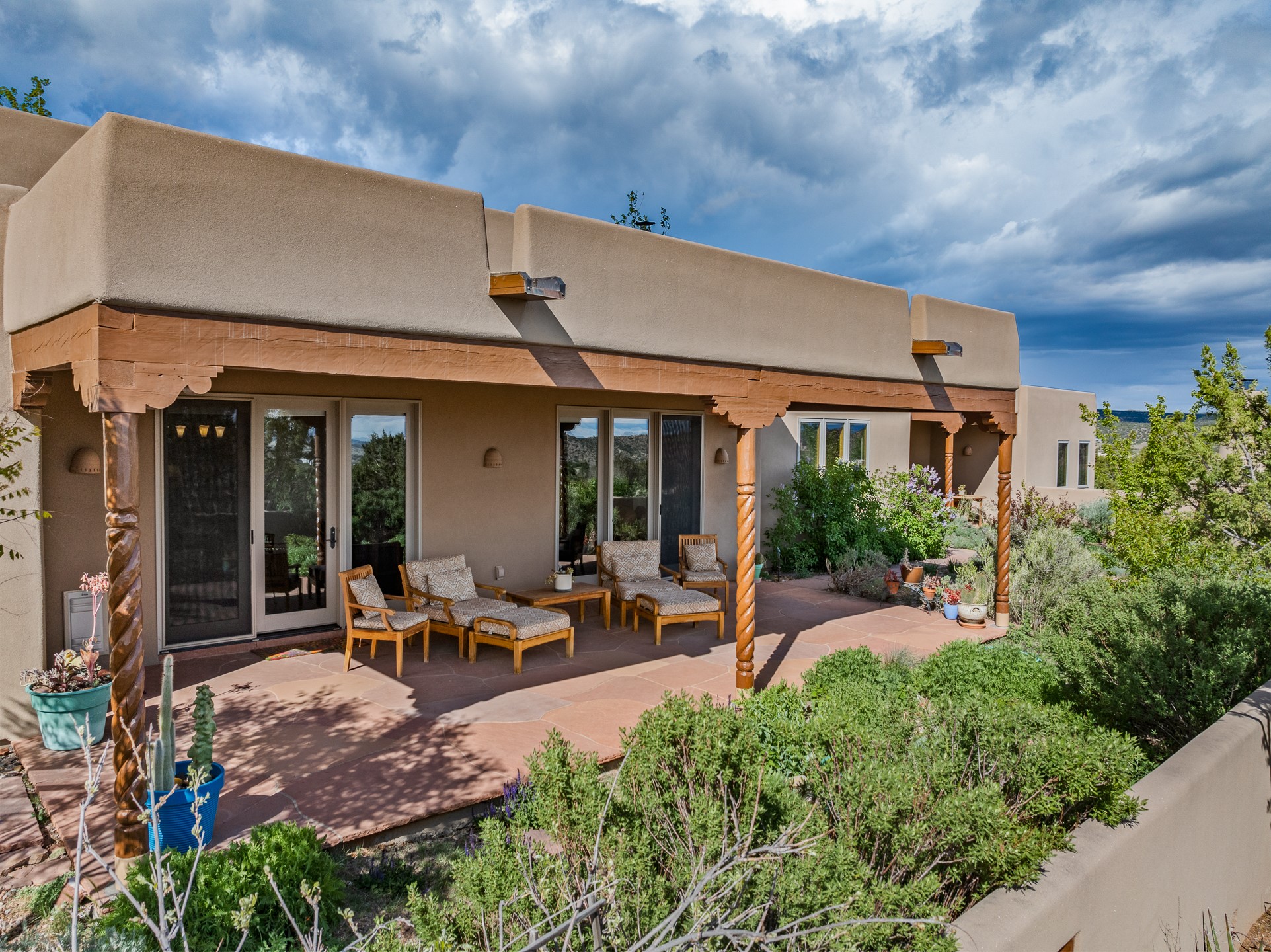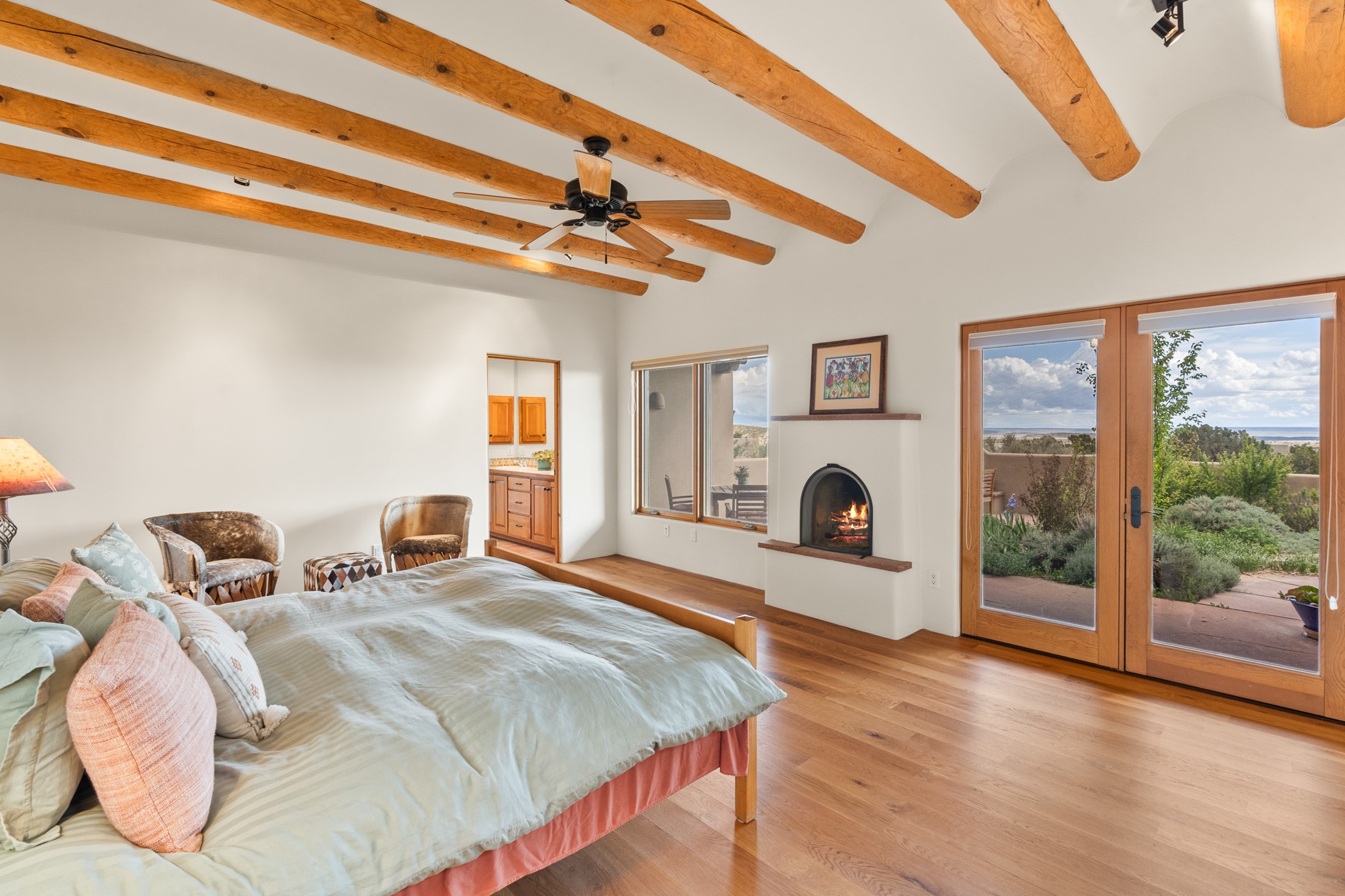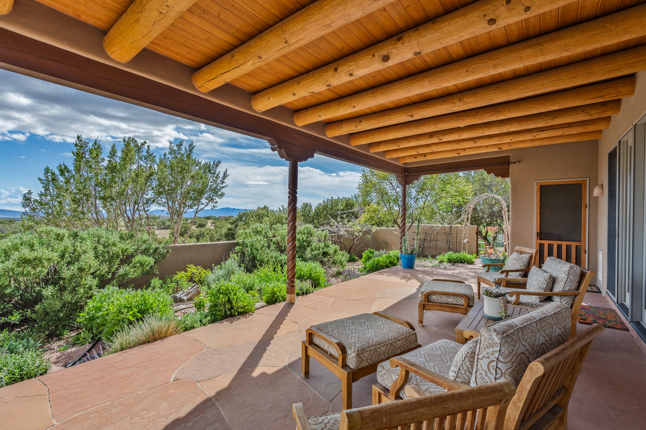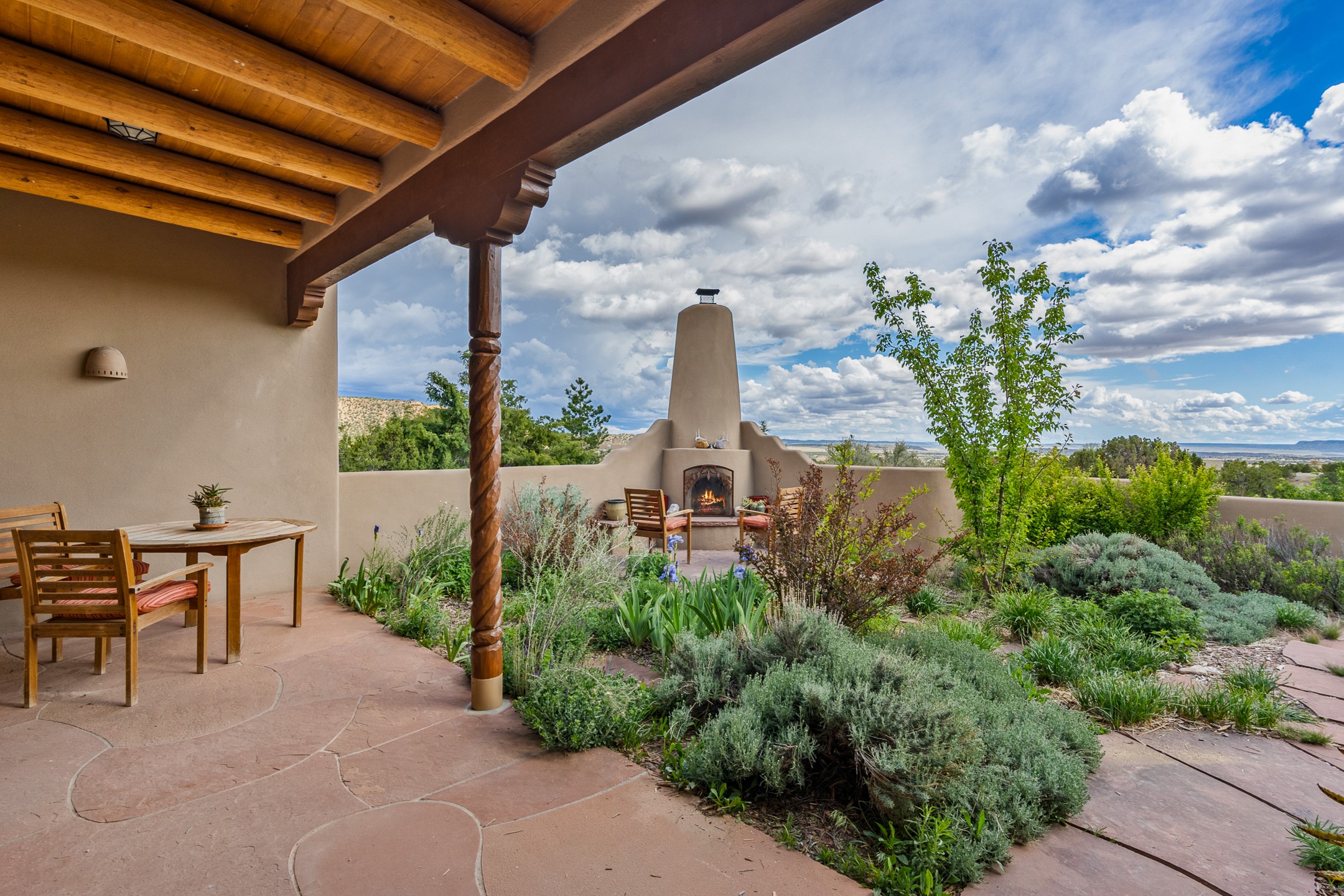 Nestled atop a quiet 3.79-acre ridge in the exclusive Spirit Wind Ranch, 45 Cerro Alto is more than a home--it's a way of life. With 3,600 square feet of beautifully crafted Santa Fe-style architecture and sweeping views of the Galisteo Basin, this private haven blends sustainability, self-sufficiency, and serene luxury in perfect harmony. From the moment you enter the aspen-lined courtyard, you're greeted by nature's quiet abundance. Mature, fruit-bearing trees--apple, jujube, and peach--offer seasonal bounty, while young apricot, pear, and plum trees promise years of harvests. For the passionate gardener, an adobe-walled greenhouse sits beside raised beds with drip irrigation, all nurtured organically for nearly a decade. A 3,000-gallon underground rainwater collection system supports irrigation, ensuring both sustainability and simplicity. This is a retreat designed for mindful living. A 10 kW ground-mounted solar array (installed in 2017) powers the home, eliminating electric bills. A Regency Hearth Heater wood stove offers cozy, efficient warmth, reducing reliance on the propane-powered radiant floor system. Enjoy filtered instant hot water throughout, thanks to a whole-house circulation and RO system. Inside, Santa Fe's timeless character shines through hand-hewn vigas, tile and hardwood floors, and three fireplaces that warm both heart and home. The main residence features three bedrooms, a sun-filled library, and a generous primary suite with its own fireplace. A detached casita offers flexibility for guests, a studio, or a private retreat. Deep portals invite you outdoors--to relax in the shade, dine al fresco, or simply lose yourself in the golden light dancing across the landscape. Every corner of this property invites reflection, creation, and connection to the land. A spacious three-car garage with an attached workshop completes this remarkable offering--ready for your tools, hobbies, or dreams, with paved access, total privacy, and unmatched natural beauty.