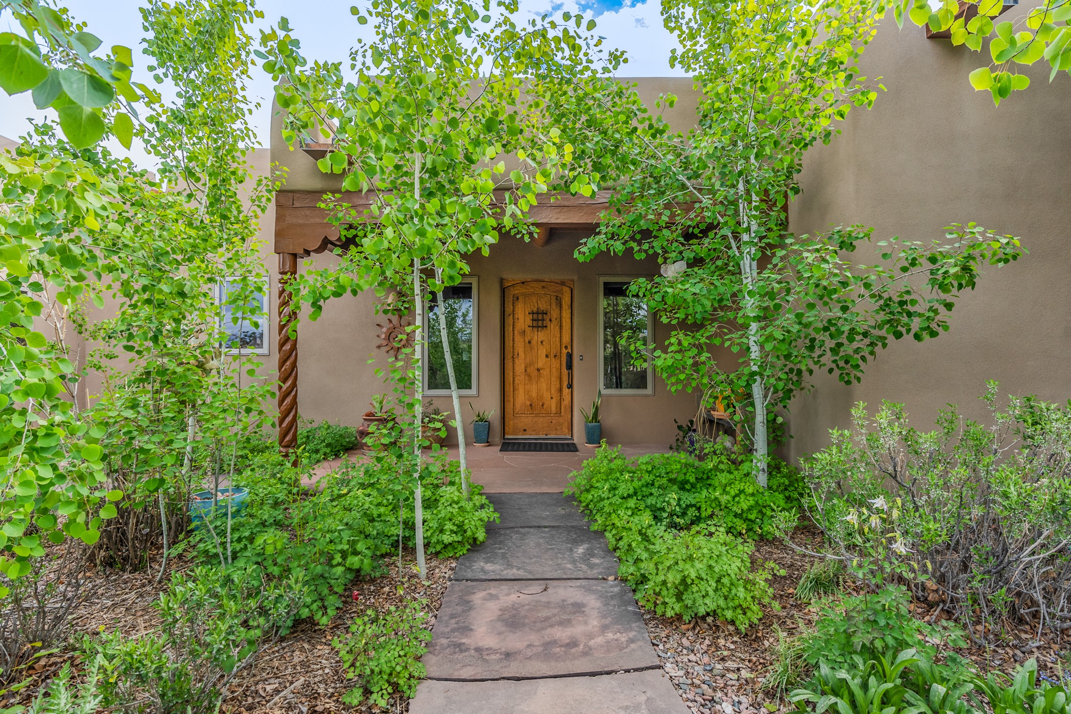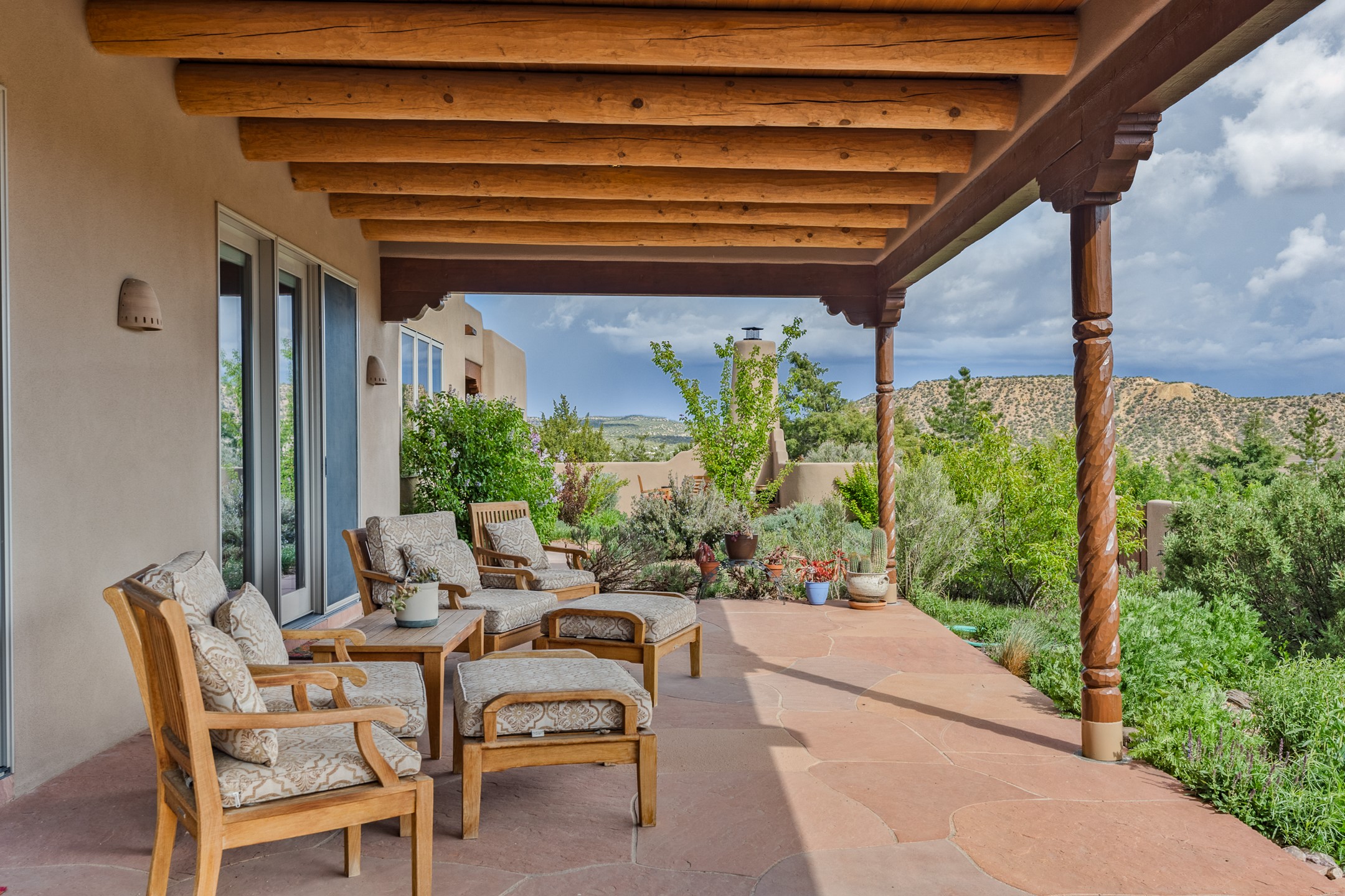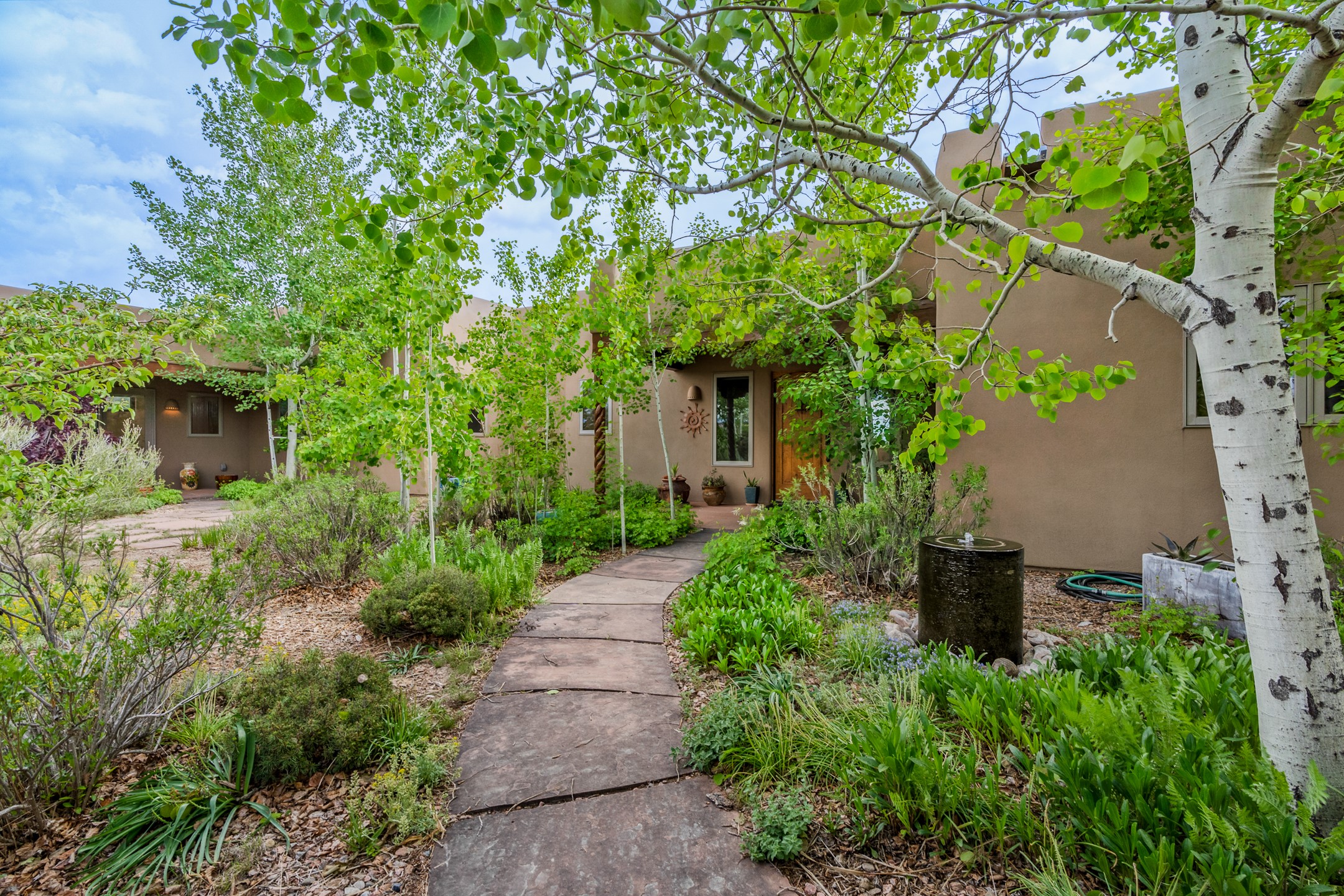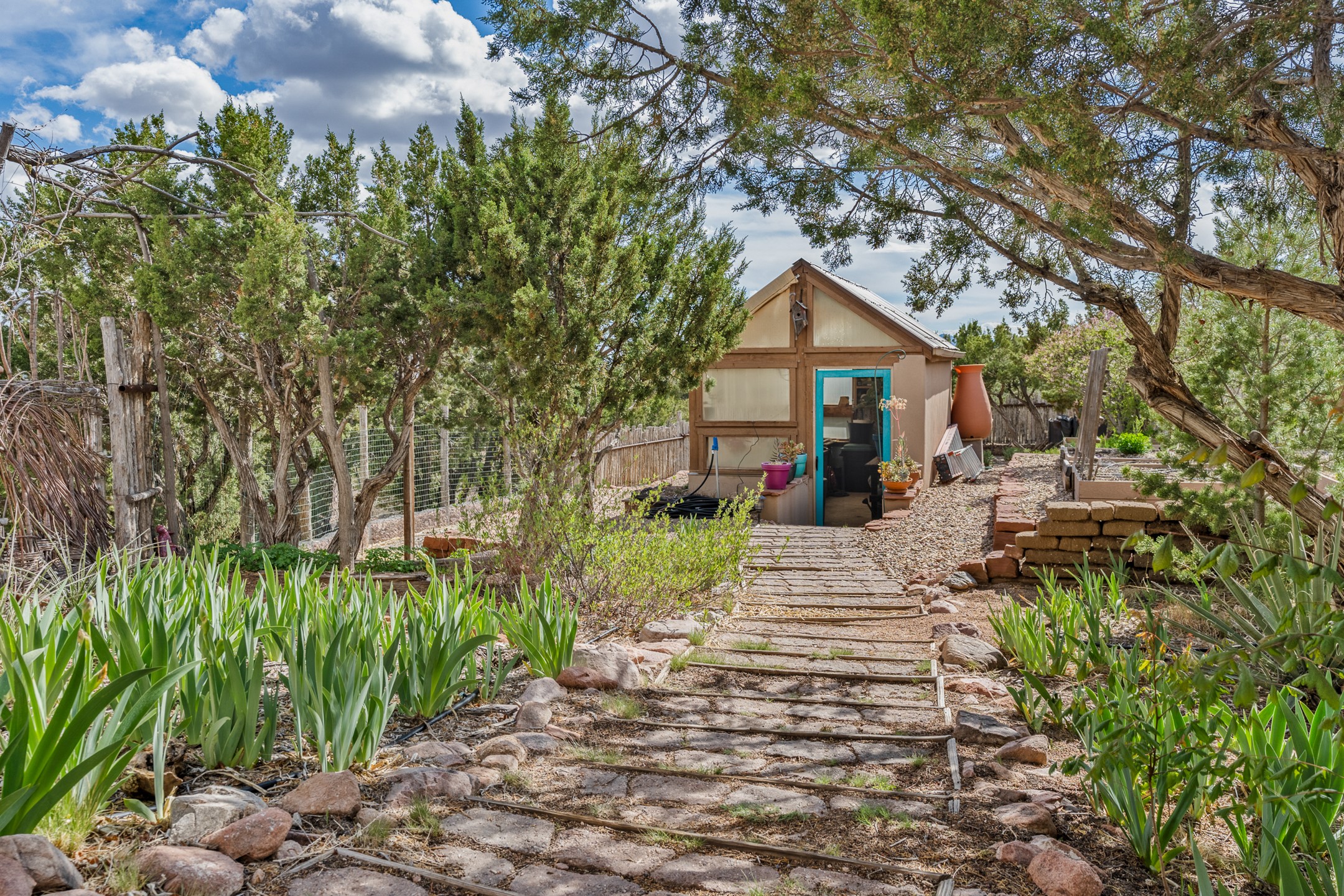 Nestled atop a quiet 3.79-acre ridge in the exclusive Spirit Wind Ranch, 45 Cerro Alto is more than a home--it's a way of life. With 3,600 square feet of beautifully crafted Santa Fe-style architecture and sweeping views of the Galisteo Basin, this private haven blends sustainability, self-sufficiency, and serene luxury in perfect harmony. From the moment you enter the aspen-lined courtyard, you're greeted by nature's quiet abundance. Mature, fruit-bearing trees--apple, jujube, and peach--offer seasonal bounty, while young apricot, pear, and plum trees promise years of harvests. For the passionate gardener, an adobe-walled greenhouse sits beside raised beds with drip irrigation, all nurtured organically for nearly a decade. A 3,000-gallon underground rainwater collection system supports irrigation, ensuring both sustainability and simplicity. This is a retreat designed for mindful living. A 10 kW ground-mounted solar array (installed in 2017) powers the home, eliminating electric bills. A Regency Hearth Heater wood stove offers cozy, efficient warmth, reducing reliance on the propane-powered radiant floor system. Enjoy filtered instant hot water throughout, thanks to a whole-house circulation and RO system. Inside, Santa Fe's timeless character shines through hand-hewn vigas, tile and hardwood floors, and three fireplaces that warm both heart and home. The main residence features three bedrooms, a sun-filled library, and a generous primary suite with its own fireplace. A detached casita offers flexibility for guests, a studio, or a private retreat. Deep portals invite you outdoors--to relax in the shade, dine al fresco, or simply lose yourself in the golden light dancing across the landscape. Every corner of this property invites reflection, creation, and connection to the land. A spacious three-car garage with an attached workshop completes this remarkable offering--ready for your tools, hobbies, or dreams, with paved access, total privacy, and unmatched natural beauty.