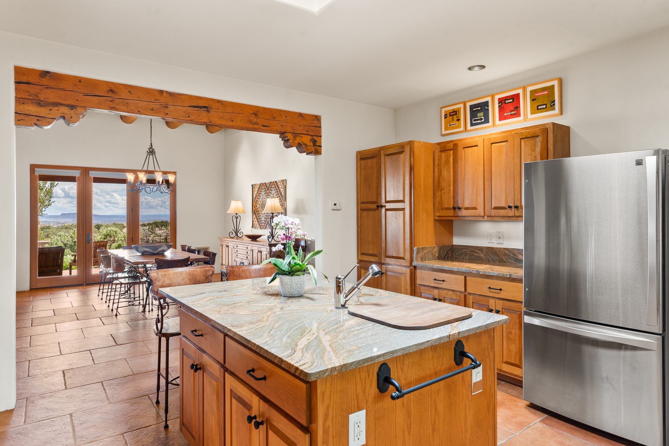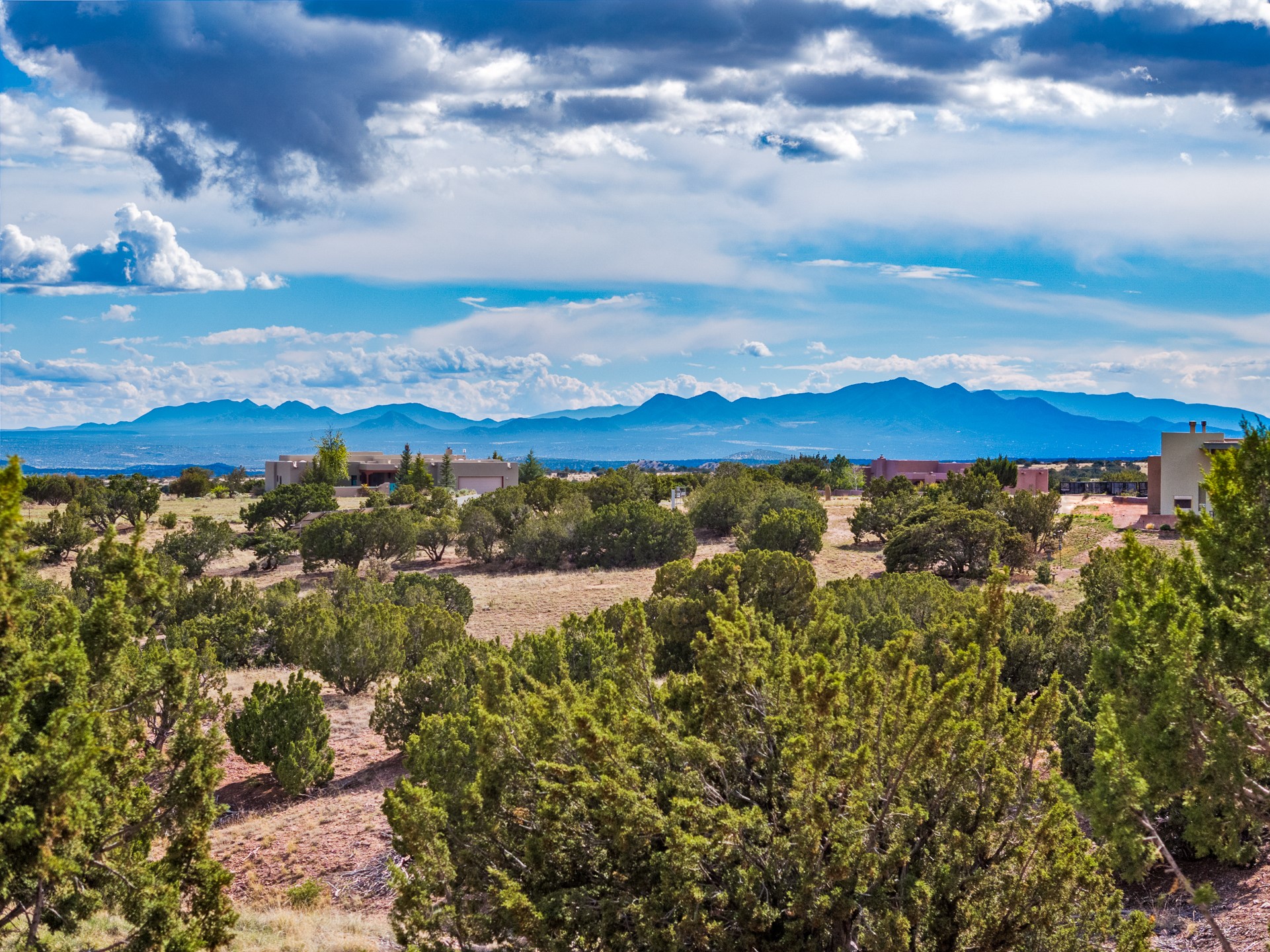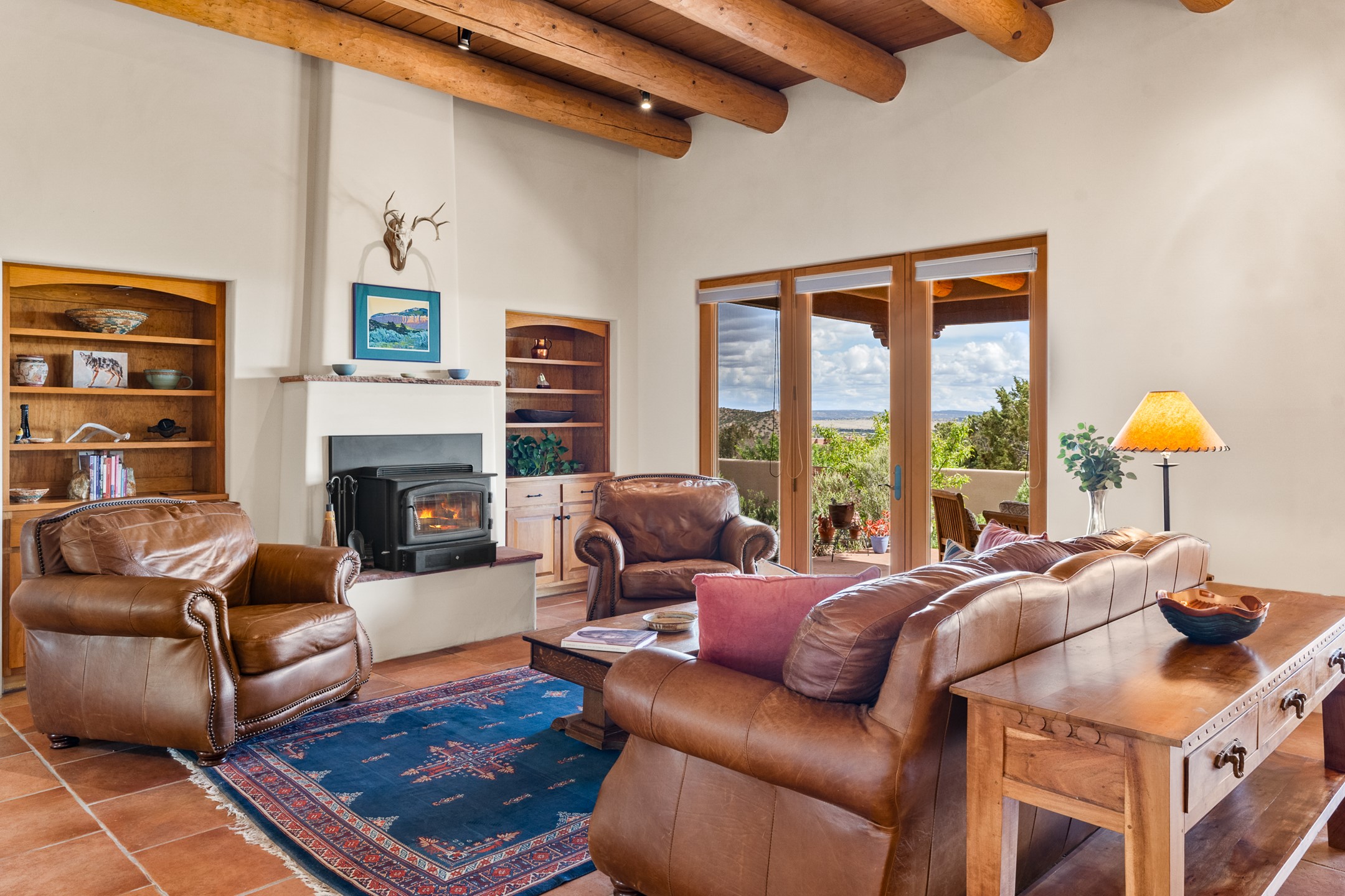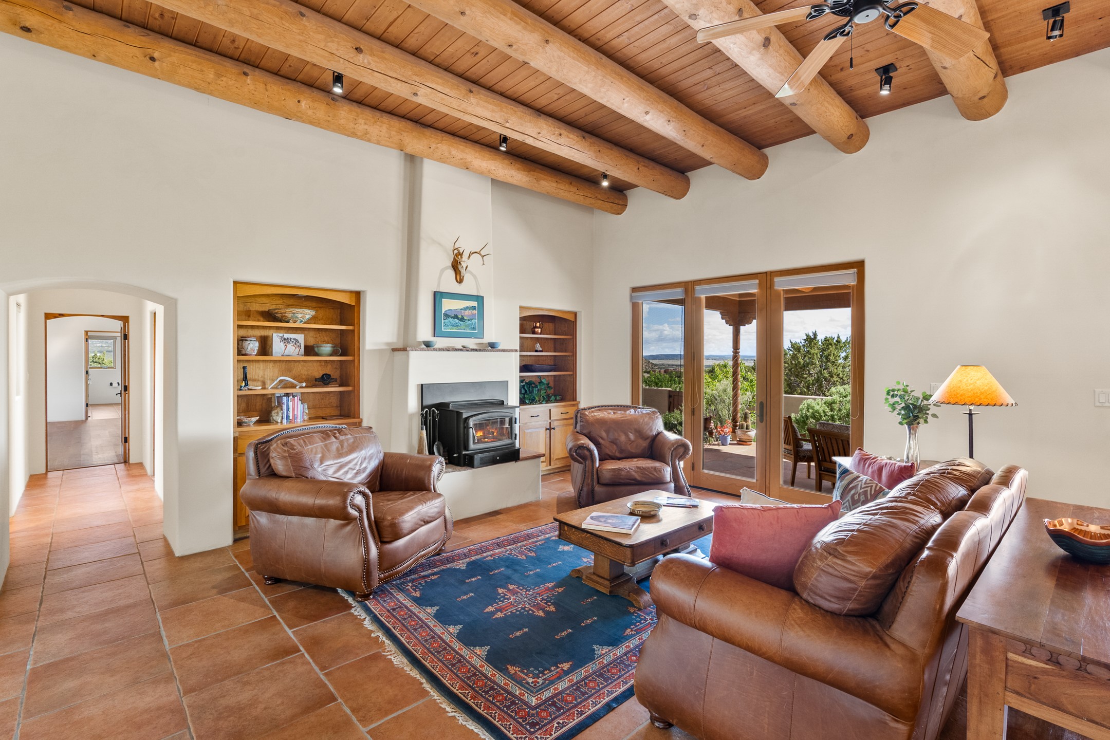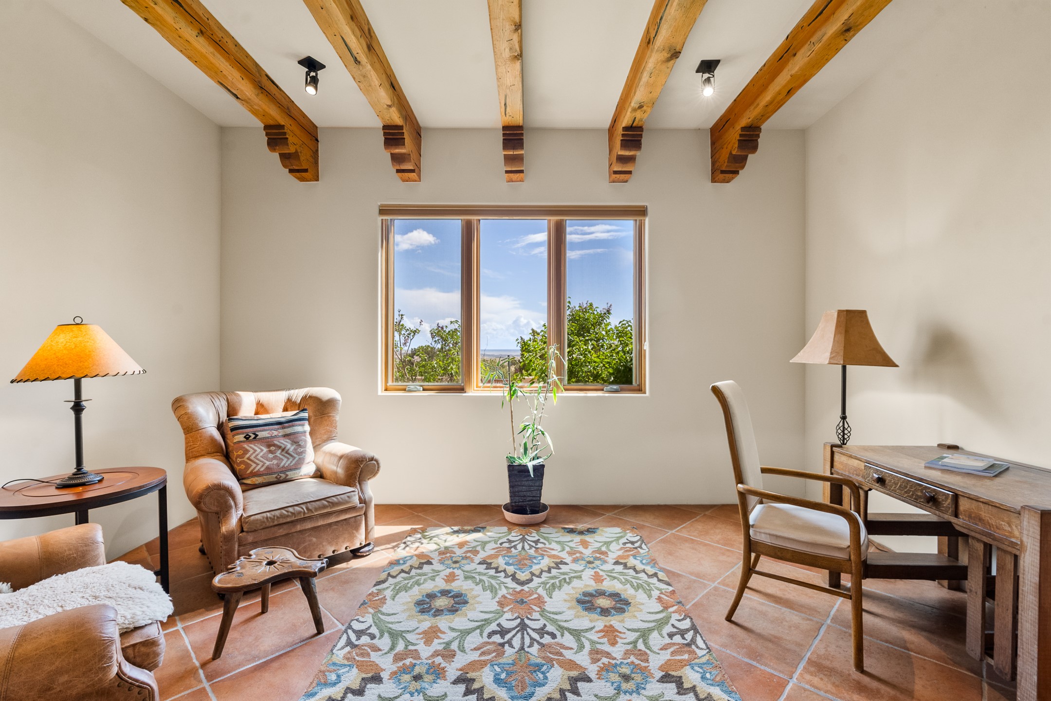 Nestled atop a quiet 3.79-acre ridge in the exclusive Spirit Wind Ranch, 45 Cerro Alto is more than a home--it's a way of life. With 3,600 square feet of beautifully crafted Santa Fe-style architecture and sweeping views of the Galisteo Basin, this private haven blends sustainability, self-sufficiency, and serene luxury in perfect harmony. From the moment you enter the aspen-lined courtyard, you're greeted by nature's quiet abundance. Mature, fruit-bearing trees--apple, jujube, and peach--offer seasonal bounty, while young apricot, pear, and plum trees promise years of harvests. For the passionate gardener, an adobe-walled greenhouse sits beside raised beds with drip irrigation, all nurtured organically for nearly a decade. A 3,000-gallon underground rainwater collection system supports irrigation, ensuring both sustainability and simplicity. This is a retreat designed for mindful living. A 10 kW ground-mounted solar array (installed in 2017) powers the home, eliminating electric bills. A Regency Hearth Heater wood stove offers cozy, efficient warmth, reducing reliance on the propane-powered radiant floor system. Enjoy filtered instant hot water throughout, thanks to a whole-house circulation and RO system. Inside, Santa Fe's timeless character shines through hand-hewn vigas, tile and hardwood floors, and three fireplaces that warm both heart and home. The main residence features three bedrooms, a sun-filled library, and a generous primary suite with its own fireplace. A detached casita offers flexibility for guests, a studio, or a private retreat. Deep portals invite you outdoors--to relax in the shade, dine al fresco, or simply lose yourself in the golden light dancing across the landscape. Every corner of this property invites reflection, creation, and connection to the land. A spacious three-car garage with an attached workshop completes this remarkable offering--ready for your tools, hobbies, or dreams, with paved access, total privacy, and unmatched natural beauty.