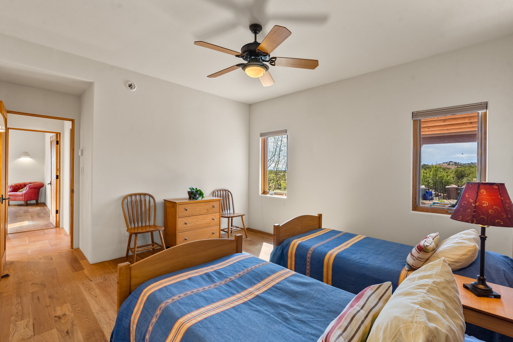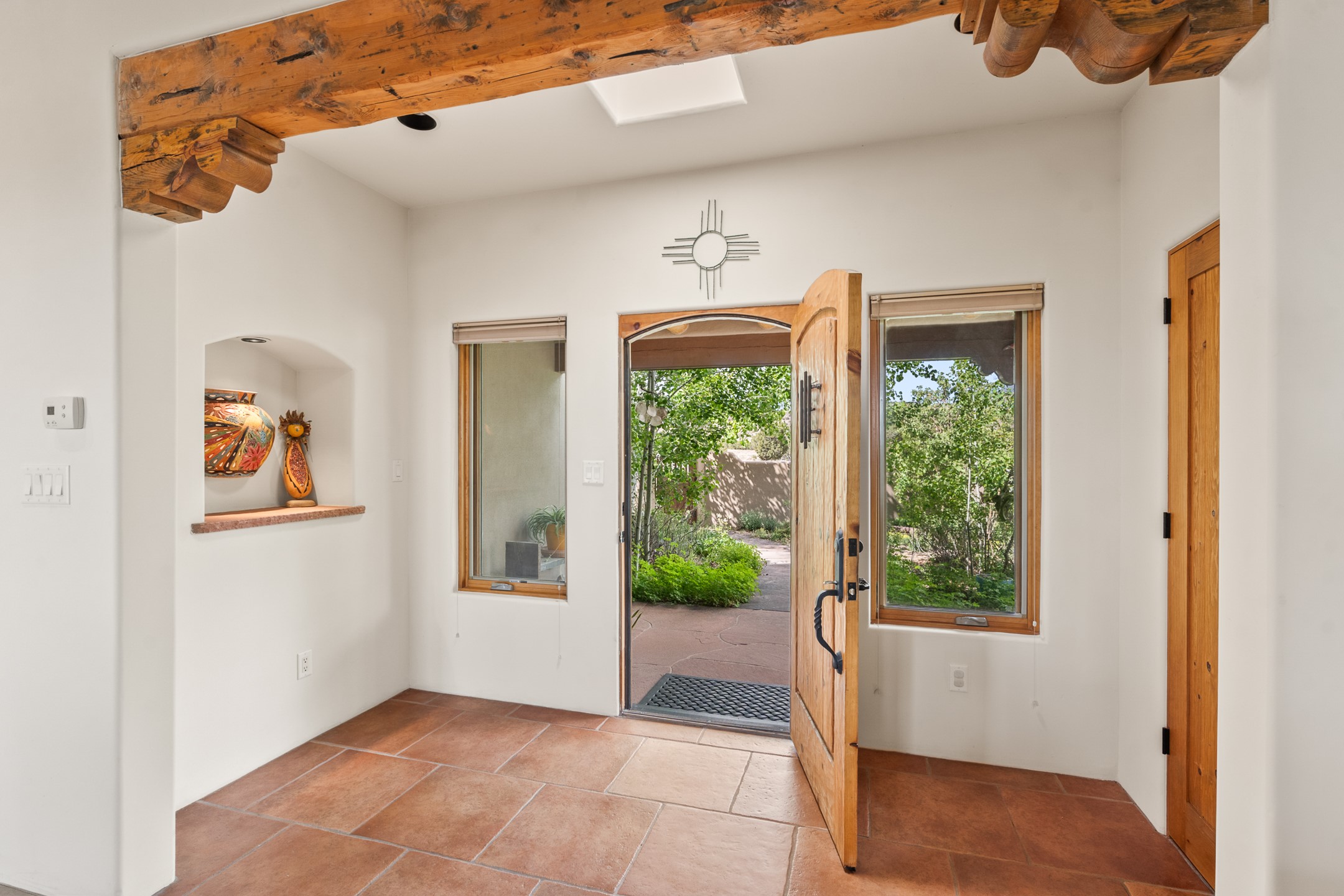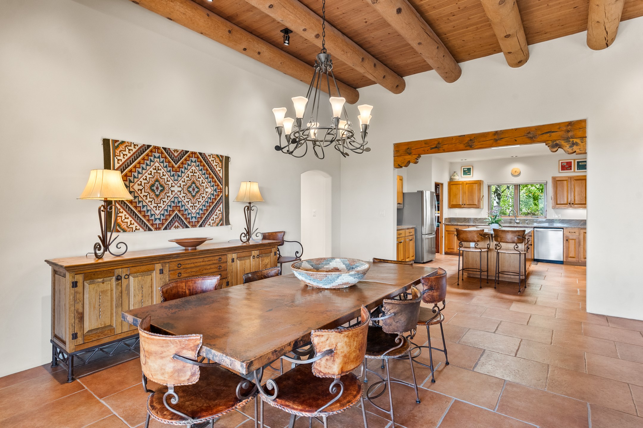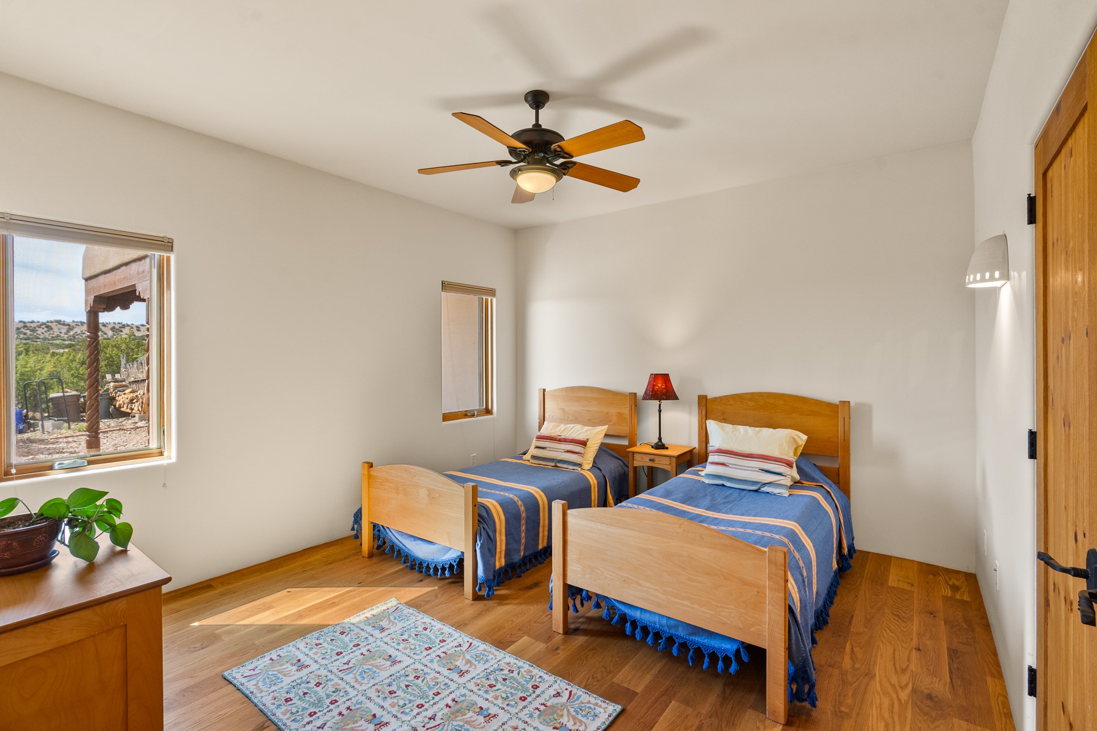 Nestled atop a quiet 3.79-acre ridge in the exclusive Spirit Wind Ranch, 45 Cerro Alto is more than a home--it's a way of life. With 3,600 square feet of beautifully crafted Santa Fe-style architecture and sweeping views of the Galisteo Basin, this private haven blends sustainability, self-sufficiency, and serene luxury in perfect harmony. From the moment you enter the aspen-lined courtyard, you're greeted by nature's quiet abundance. Mature, fruit-bearing trees--apple, jujube, and peach--offer seasonal bounty, while young apricot, pear, and plum trees promise years of harvests. For the passionate gardener, an adobe-walled greenhouse sits beside raised beds with drip irrigation, all nurtured organically for nearly a decade. A 3,000-gallon underground rainwater collection system supports irrigation, ensuring both sustainability and simplicity. This is a retreat designed for mindful living. A 10 kW ground-mounted solar array (installed in 2017) powers the home, eliminating electric bills. A Regency Hearth Heater wood stove offers cozy, efficient warmth, reducing reliance on the propane-powered radiant floor system. Enjoy filtered instant hot water throughout, thanks to a whole-house circulation and RO system. Inside, Santa Fe's timeless character shines through hand-hewn vigas, tile and hardwood floors, and three fireplaces that warm both heart and home. The main residence features three bedrooms, a sun-filled library, and a generous primary suite with its own fireplace. A detached casita offers flexibility for guests, a studio, or a private retreat. Deep portals invite you outdoors--to relax in the shade, dine al fresco, or simply lose yourself in the golden light dancing across the landscape. Every corner of this property invites reflection, creation, and connection to the land. A spacious three-car garage with an attached workshop completes this remarkable offering--ready for your tools, hobbies, or dreams, with paved access, total privacy, and unmatched natural beauty.
