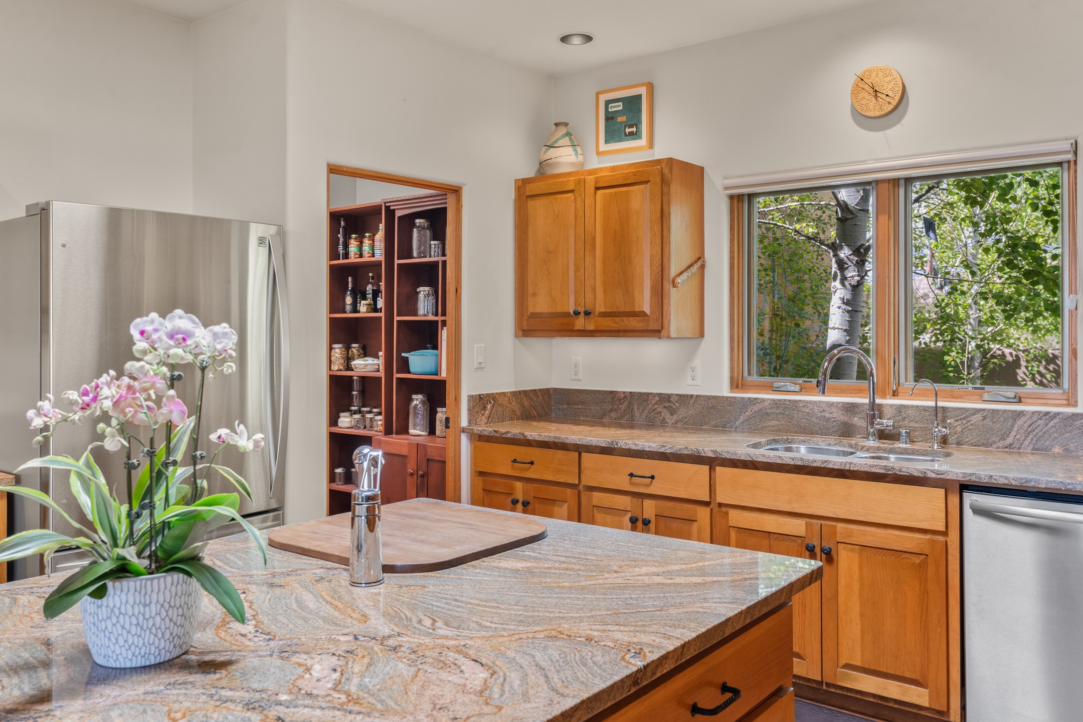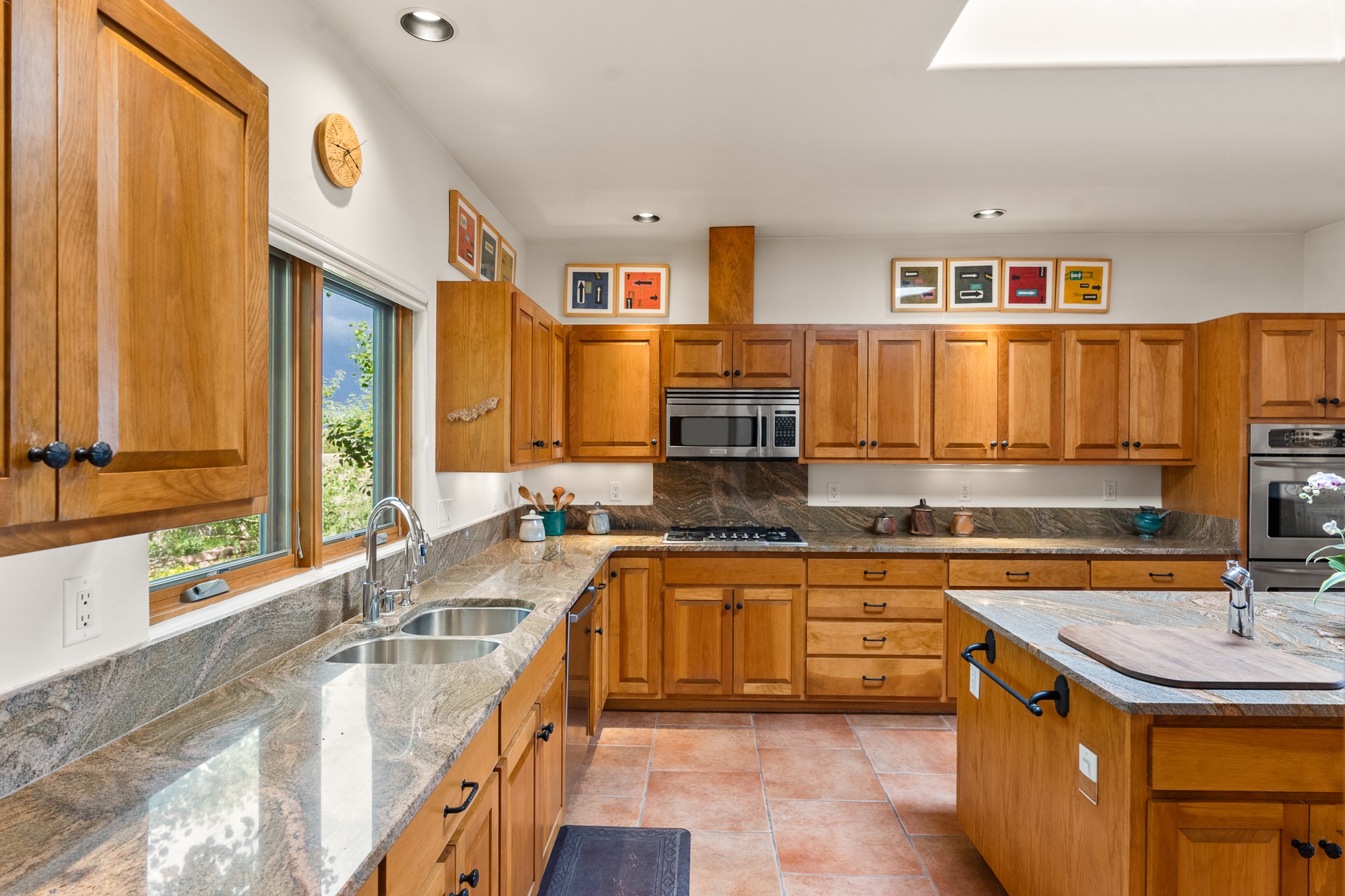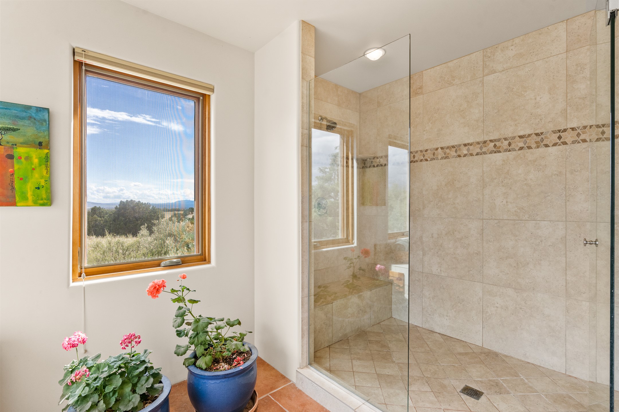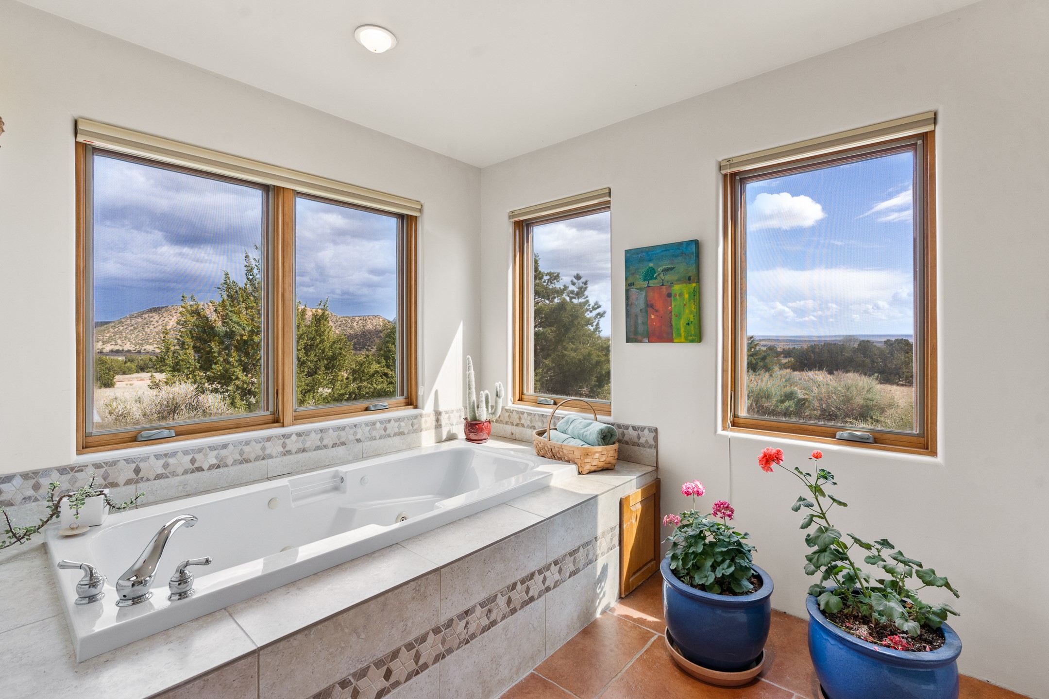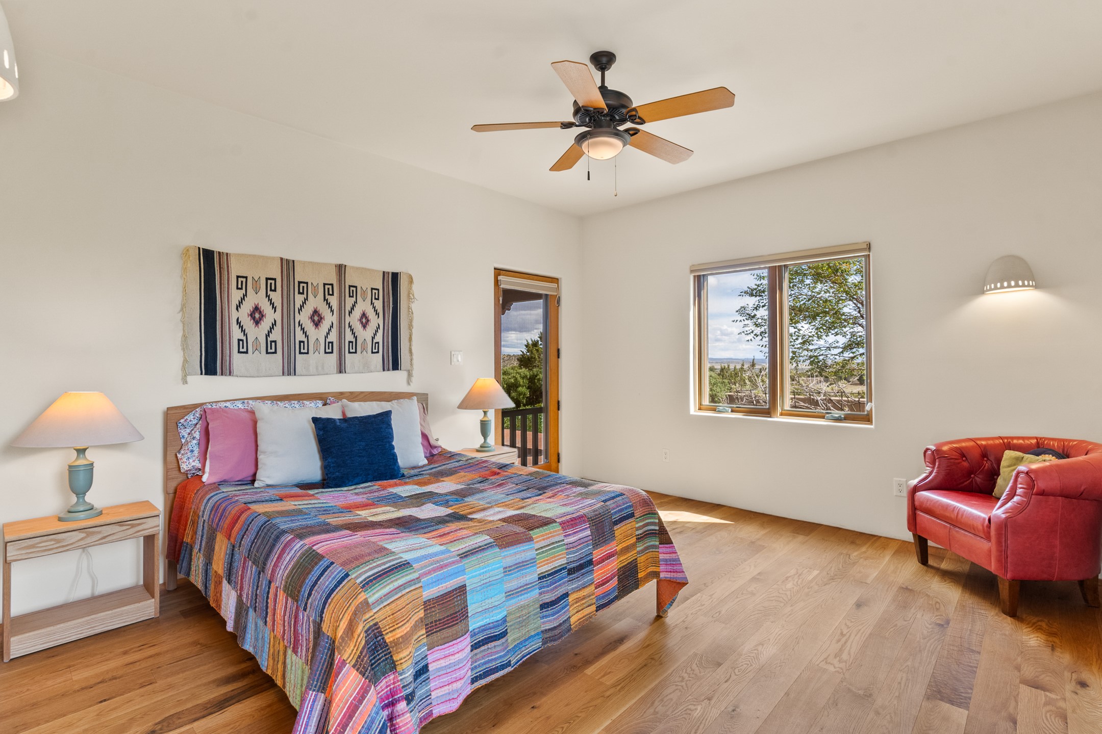 Nestled atop a quiet 3.79-acre ridge in the exclusive Spirit Wind Ranch, 45 Cerro Alto is more than a home--it's a way of life. With 3,600 square feet of beautifully crafted Santa Fe-style architecture and sweeping views of the Galisteo Basin, this private haven blends sustainability, self-sufficiency, and serene luxury in perfect harmony. From the moment you enter the aspen-lined courtyard, you're greeted by nature's quiet abundance. Mature, fruit-bearing trees--apple, jujube, and peach--offer seasonal bounty, while young apricot, pear, and plum trees promise years of harvests. For the passionate gardener, an adobe-walled greenhouse sits beside raised beds with drip irrigation, all nurtured organically for nearly a decade. A 3,000-gallon underground rainwater collection system supports irrigation, ensuring both sustainability and simplicity. This is a retreat designed for mindful living. A 10 kW ground-mounted solar array (installed in 2017) powers the home, eliminating electric bills. A Regency Hearth Heater wood stove offers cozy, efficient warmth, reducing reliance on the propane-powered radiant floor system. Enjoy filtered instant hot water throughout, thanks to a whole-house circulation and RO system. Inside, Santa Fe's timeless character shines through hand-hewn vigas, tile and hardwood floors, and three fireplaces that warm both heart and home. The main residence features three bedrooms, a sun-filled library, and a generous primary suite with its own fireplace. A detached casita offers flexibility for guests, a studio, or a private retreat. Deep portals invite you outdoors--to relax in the shade, dine al fresco, or simply lose yourself in the golden light dancing across the landscape. Every corner of this property invites reflection, creation, and connection to the land. A spacious three-car garage with an attached workshop completes this remarkable offering--ready for your tools, hobbies, or dreams, with paved access, total privacy, and unmatched natural beauty.