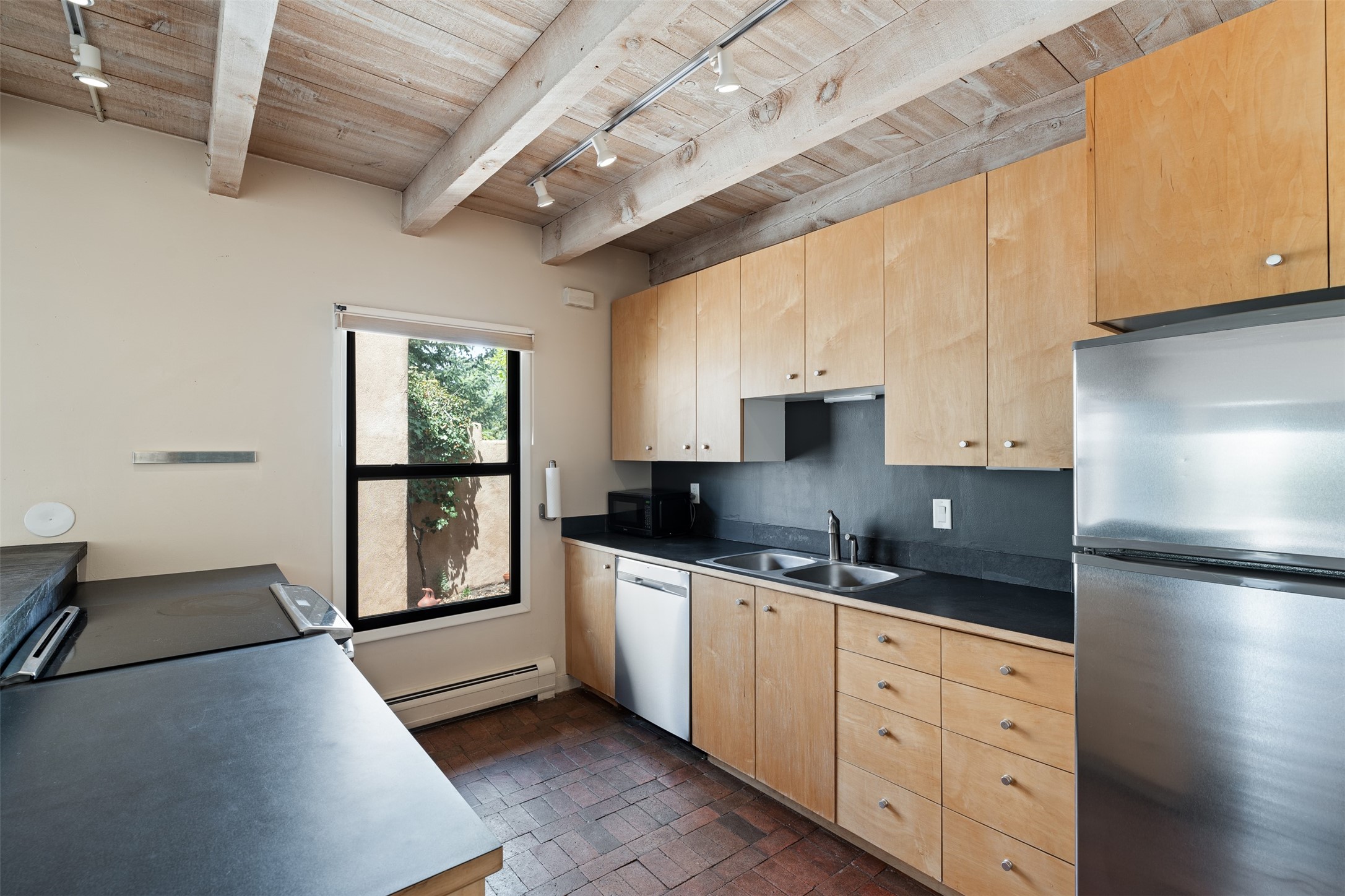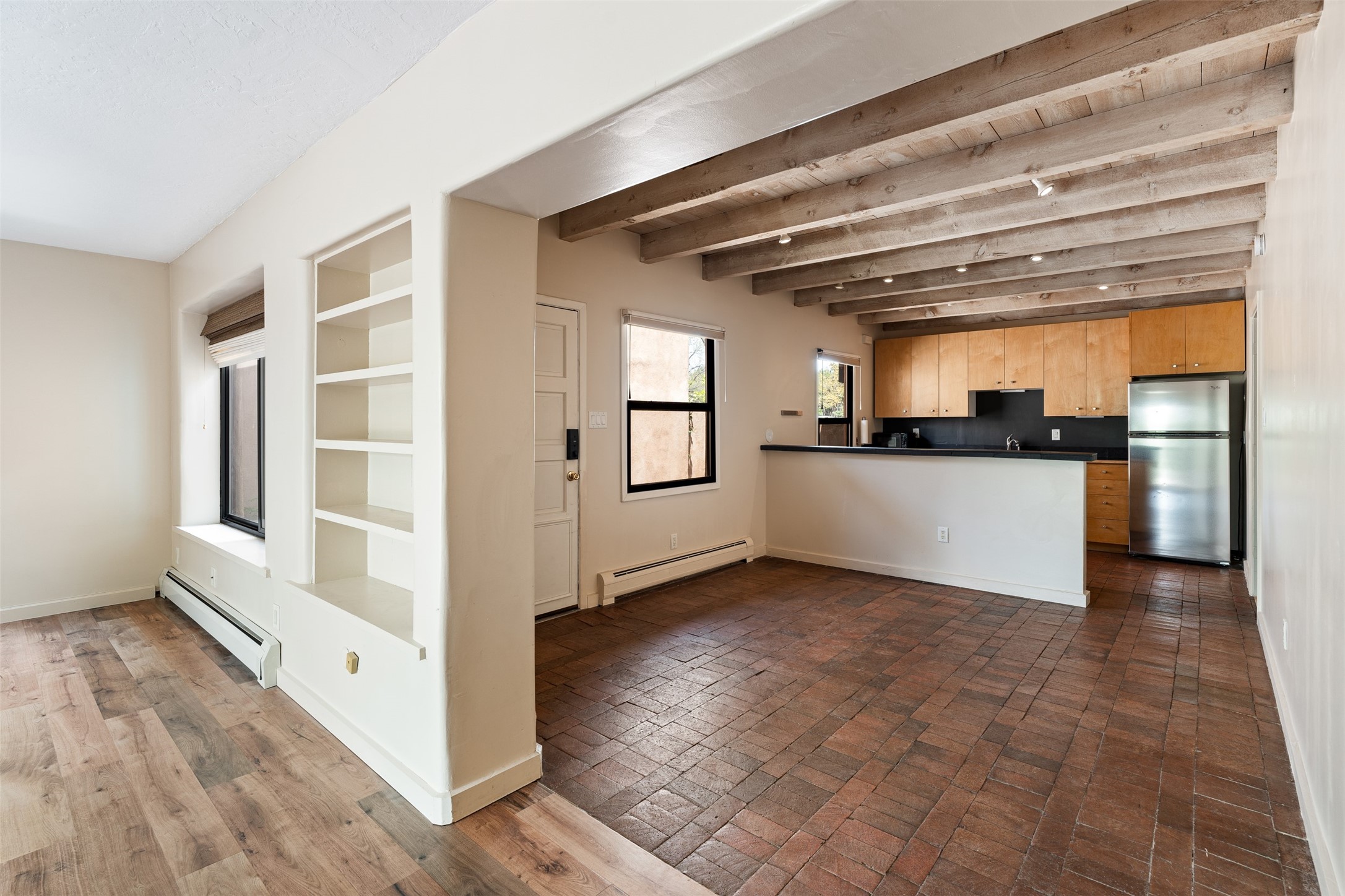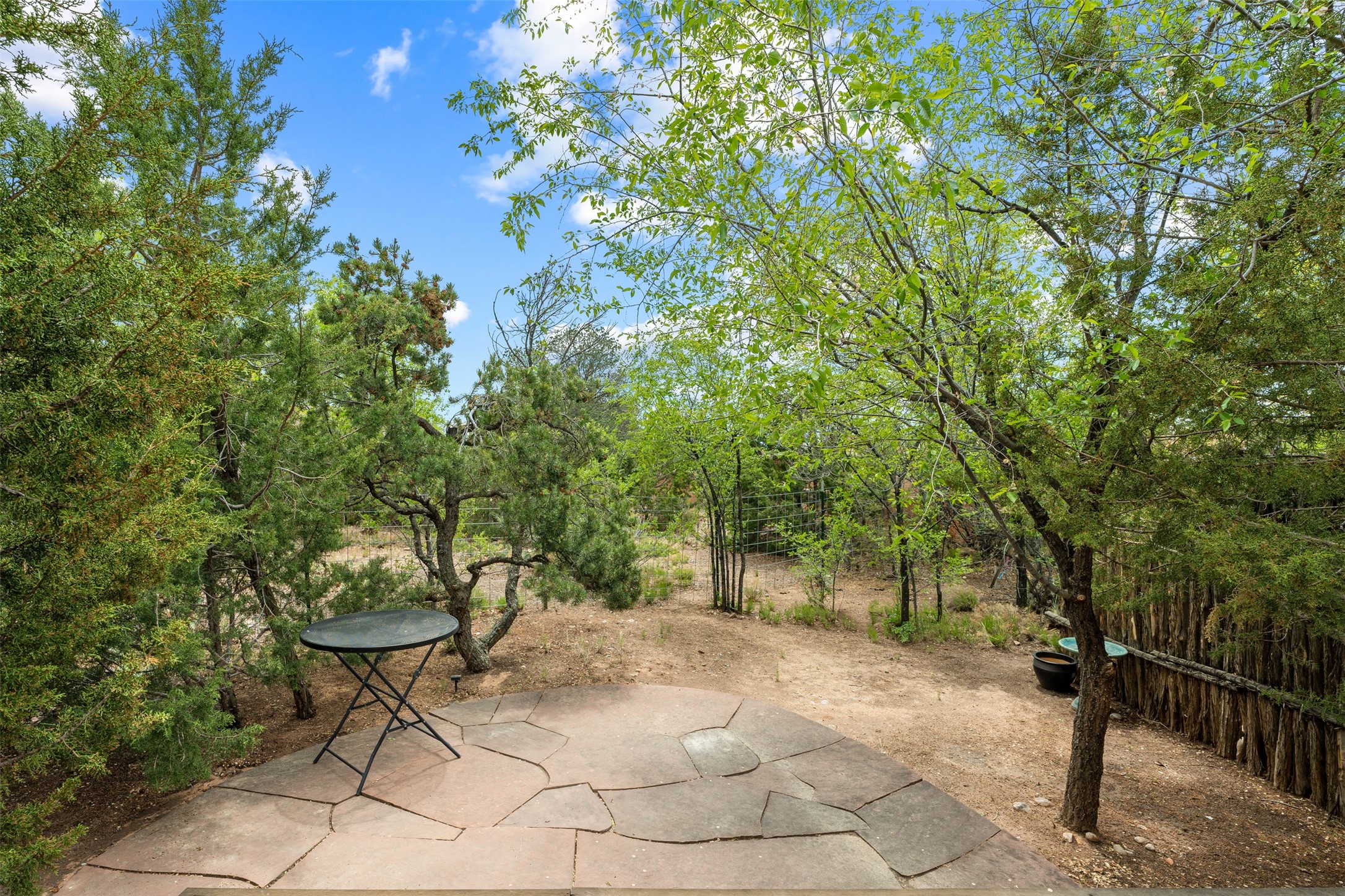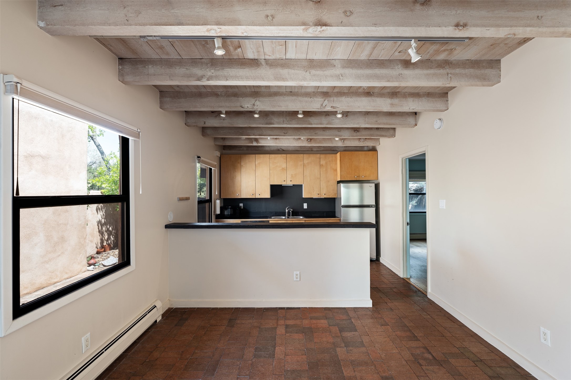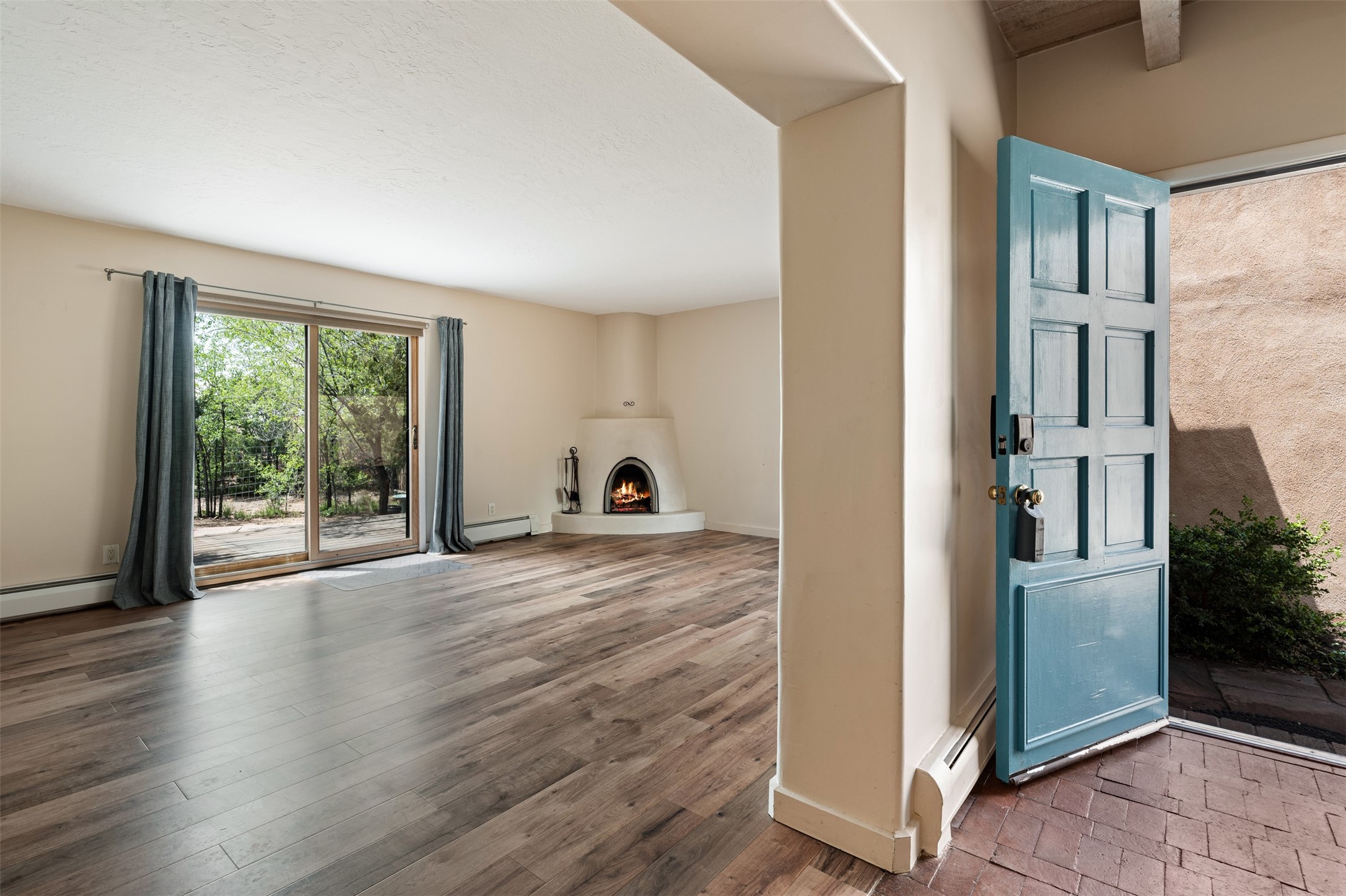 Tucked away at the top of the historic Old Taos Highway, this charming 2-bedroom, 1-bath condo offers quintessential Santa Fe living in a serene, wooded setting. With a peaceful patio nestled among the pines, this home blends natural tranquility with authentic Southwestern style.Inside, you'll find an inviting open-concept layout with a cozy kiva fireplace as the focal point. Brick and wood floors add warmth and character throughout, while radiant baseboard heating ensures year-round comfort. The kitchen and living areas flow seamlessly, ideal for both relaxed living and entertaining.A recently installed TPO roof (just 5 years old) adds peace of mind, and the location offers quick access to both downtown Santa Fe and the Sangre de Cristo foothills. Whether you're looking for a full-time residence, a weekend retreat, or a rental investment, this hidden gem is a must-see.
