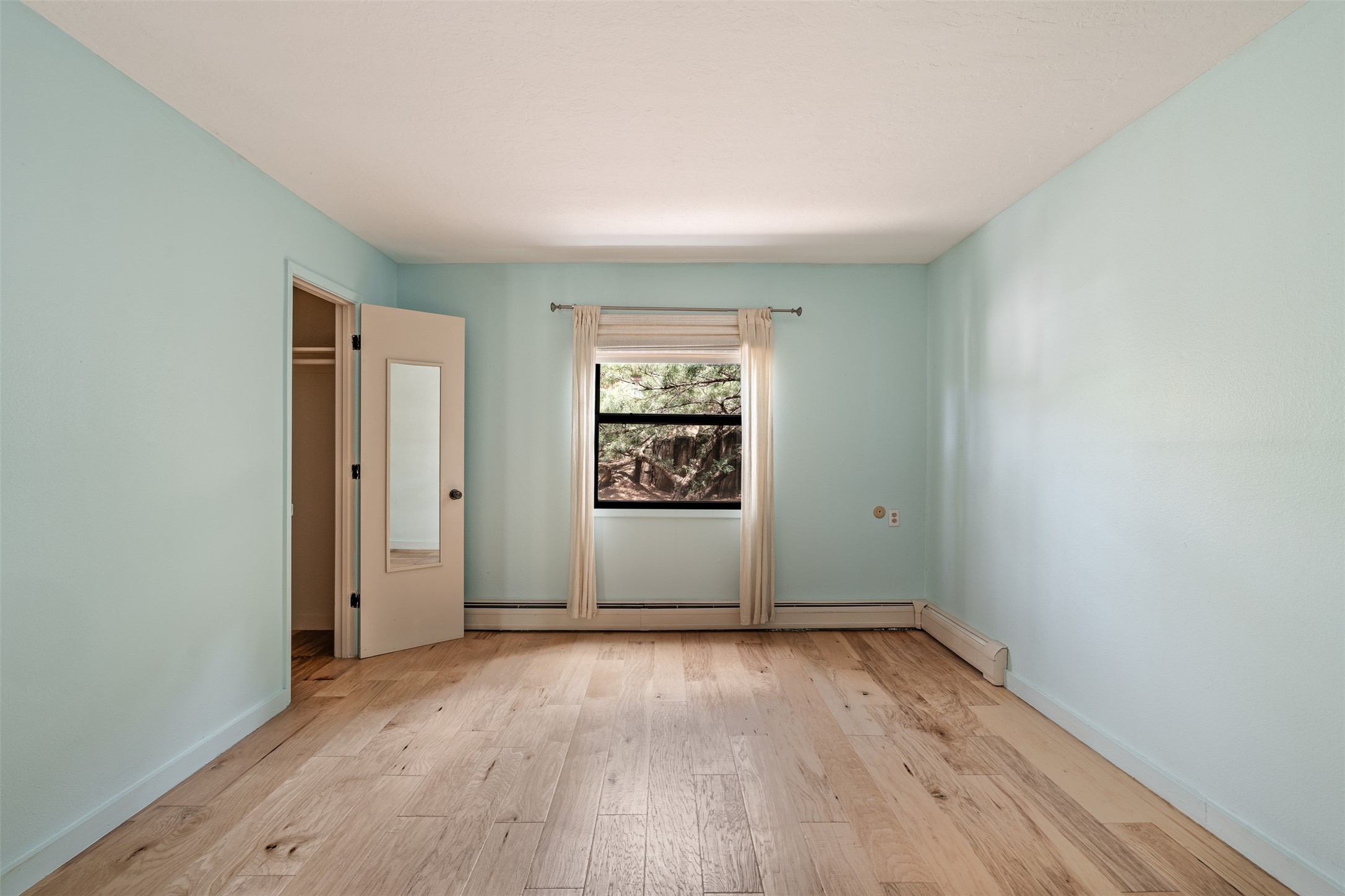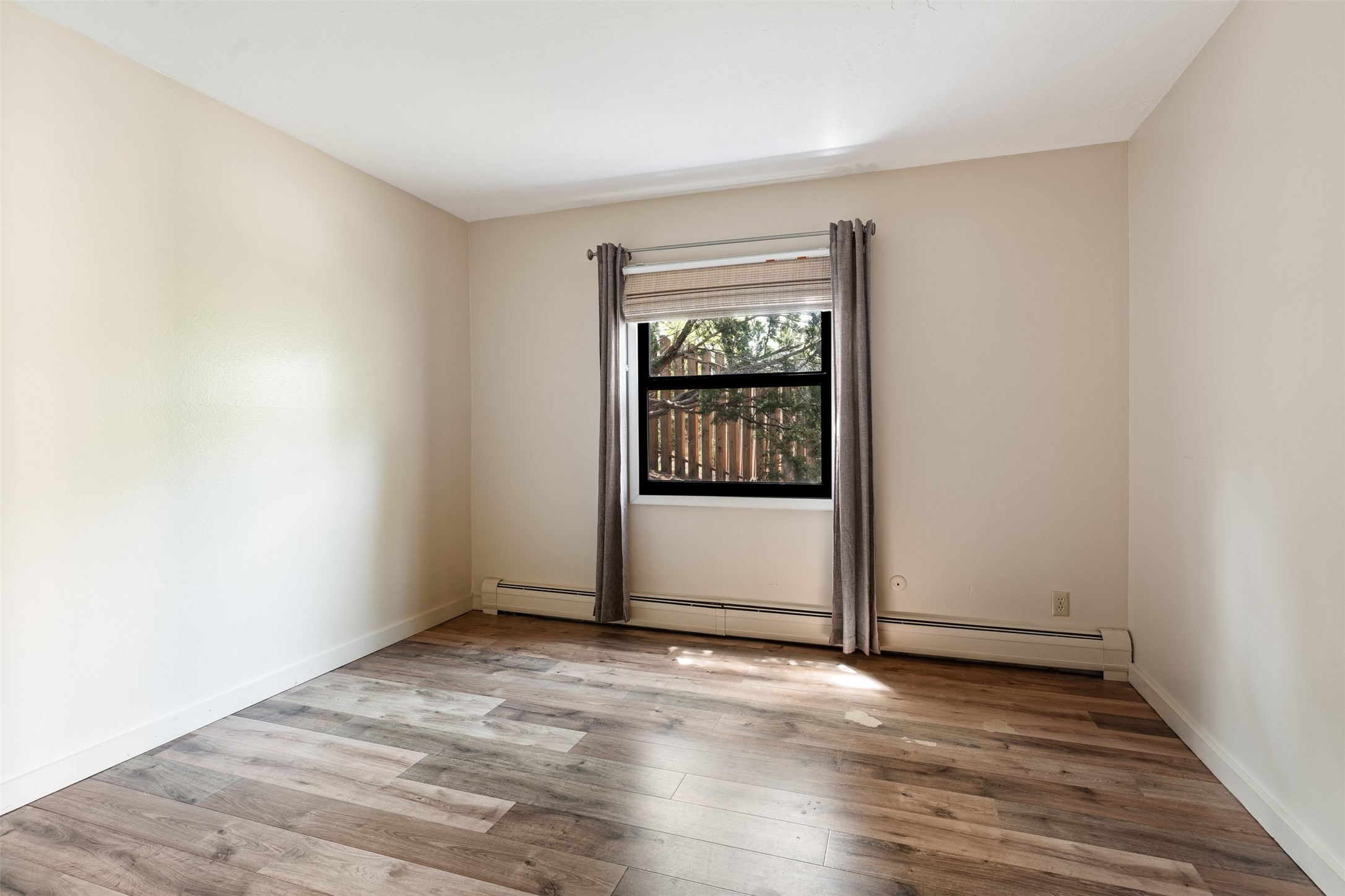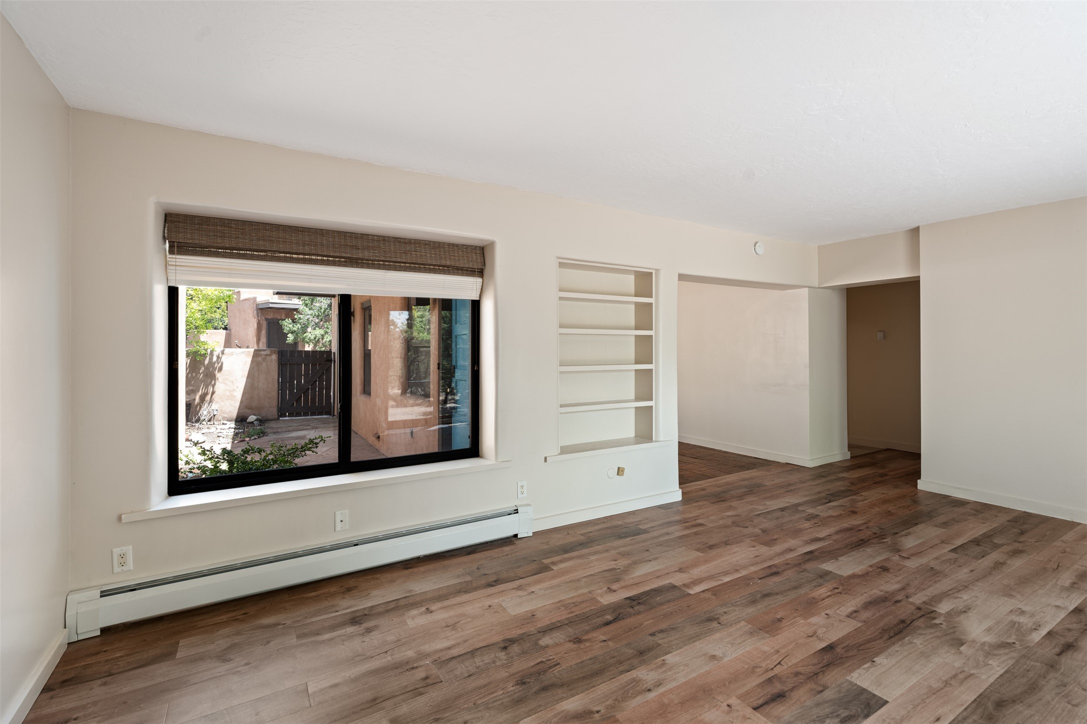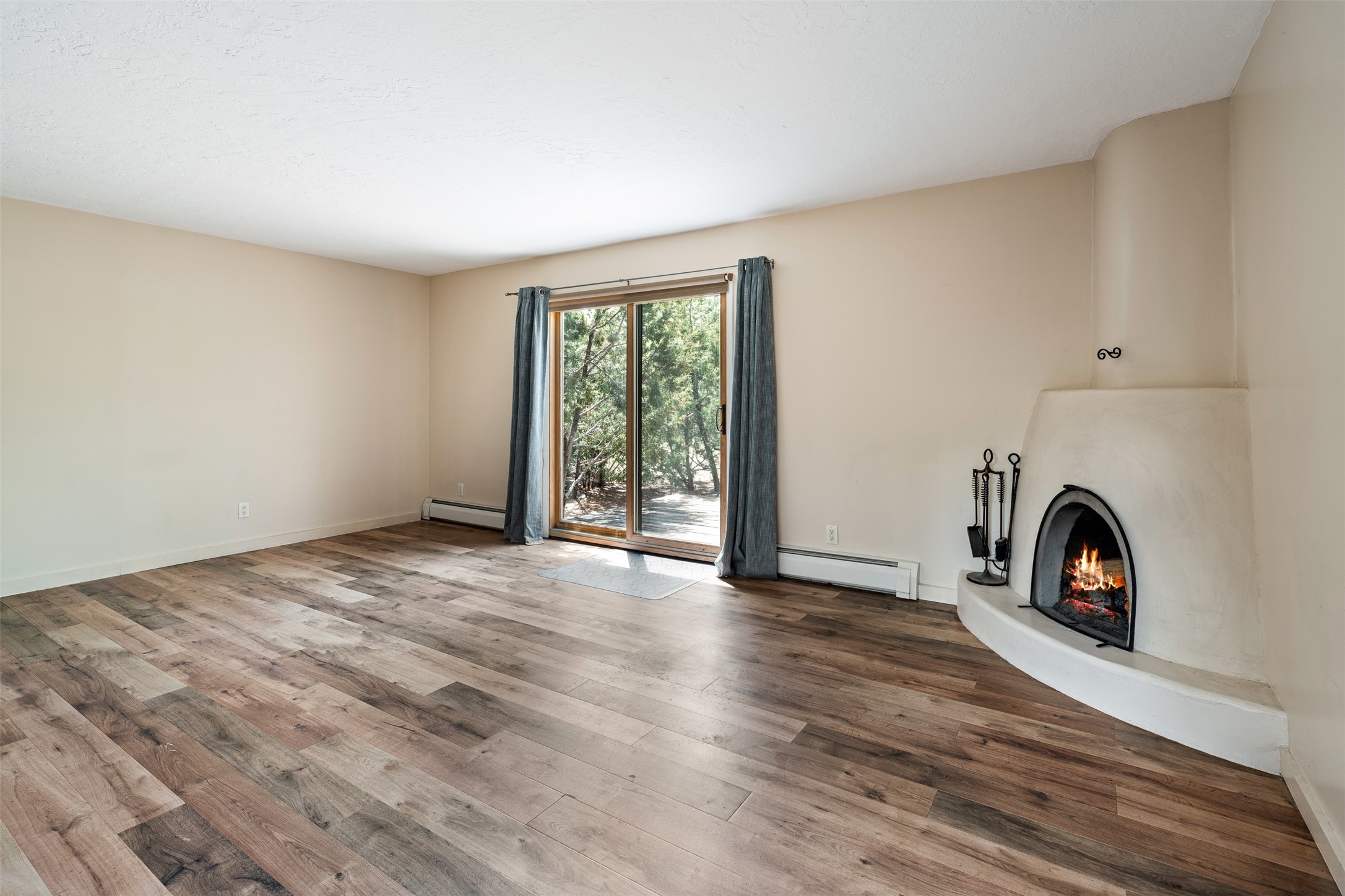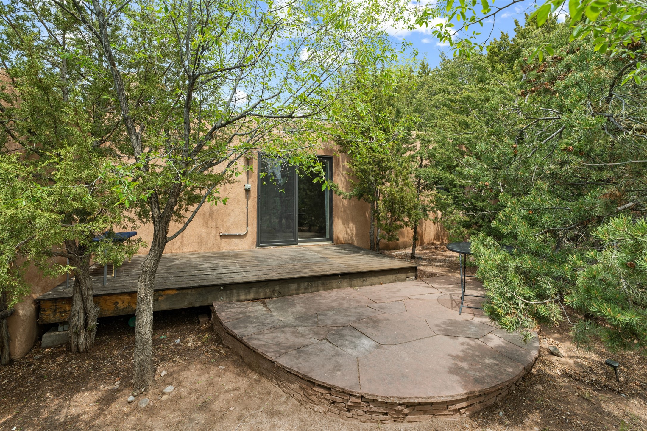 Tucked away at the top of the historic Old Taos Highway, this charming 2-bedroom, 1-bath condo offers quintessential Santa Fe living in a serene, wooded setting. With a peaceful patio nestled among the pines, this home blends natural tranquility with authentic Southwestern style.Inside, you'll find an inviting open-concept layout with a cozy kiva fireplace as the focal point. Brick and wood floors add warmth and character throughout, while radiant baseboard heating ensures year-round comfort. The kitchen and living areas flow seamlessly, ideal for both relaxed living and entertaining.A recently installed TPO roof (just 5 years old) adds peace of mind, and the location offers quick access to both downtown Santa Fe and the Sangre de Cristo foothills. Whether you're looking for a full-time residence, a weekend retreat, or a rental investment, this hidden gem is a must-see.