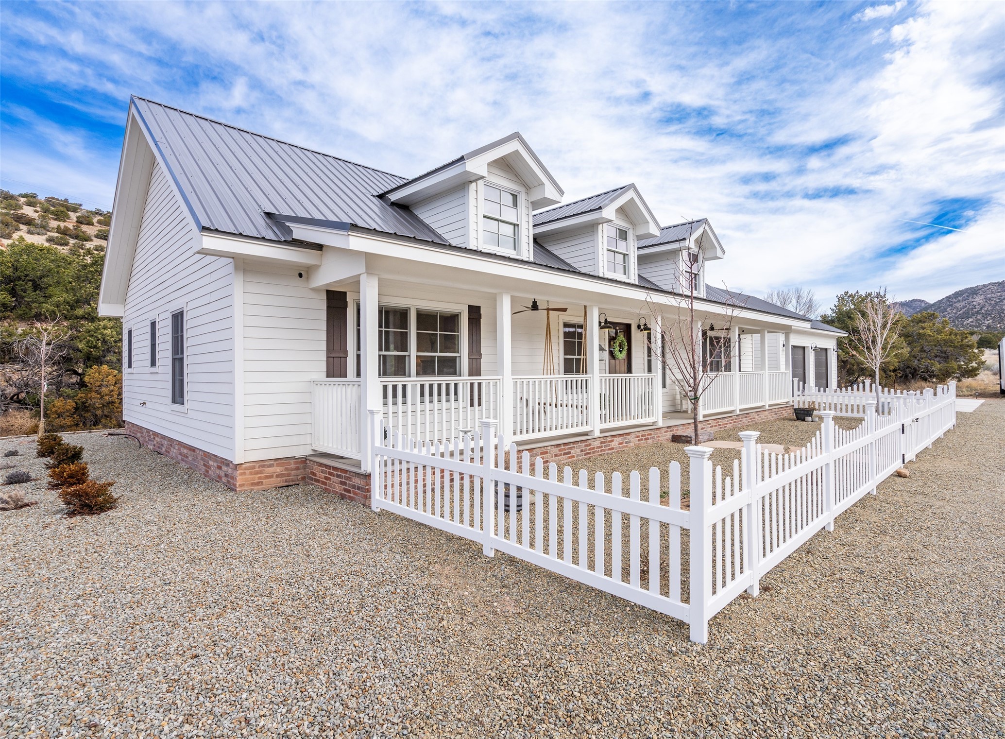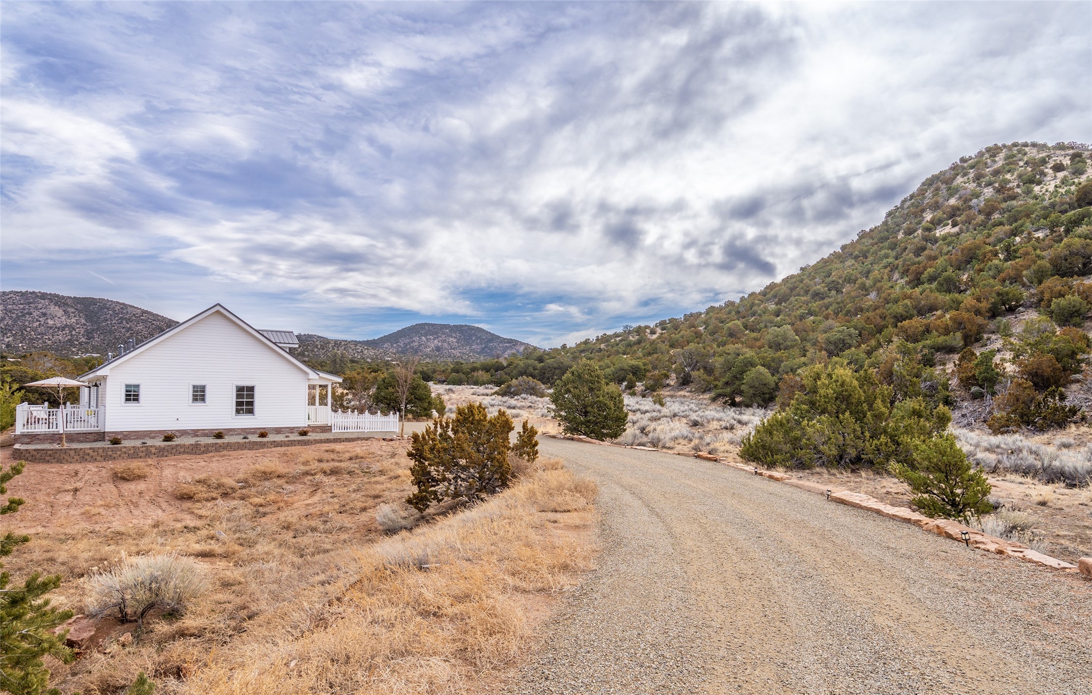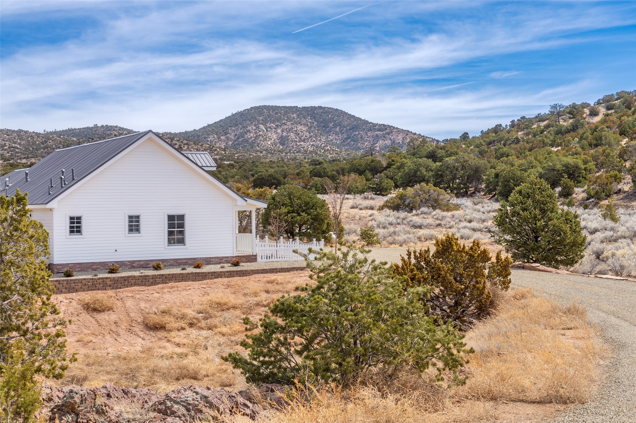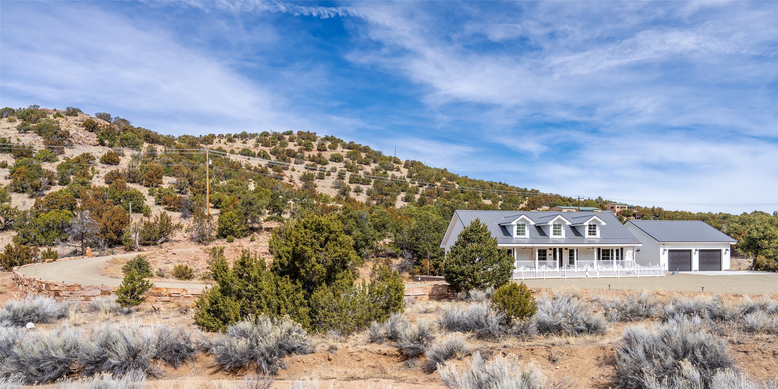 PRICED TO SELL!!!!!!!! (UNDER APPRAISED VALUE) This NEWLY CUSTOM BUILT Northern New Mexico farmhouse, offering 2,213 sq. ft. of beautifully designed living space. Nestled on a serene 5.06-acre private lot, this newly constructed home features 3 bedrooms, 2 baths on the main level, and a spacious upstairs loft--ideal for an artist's studio, yoga retreat, or home office. High-end finishes are found throughout, including stainless steel appliances, a farmhouse sink, a classic clawfoot tub, and quartz and marble countertops. The open-concept living space is warm and inviting, with ample natural light streaming in. The charming front porch is designed for relaxation. A place where you can savor your morning coffee as deer wander by or take in breathtaking sunset views. The spacious back patio, surrounded by pion trees, offers a tranquil retreat where you can soak up the sun, enjoy a sunset barbeque, or stargaze. The heated 1238 sq. ft. garage includes a private entrance, making it perfect for a workshop, guest suite, or home business. Additional features include RV parking and a private driveway that enhances the secluded feel. For peace of mind, a security system with strategically placed cameras and motion-sensing lights illuminate pathways, while a smart monitoring system ensures the property remains secure. The beautifully landscaped yard features lush trees, vibrant flowers, and neatly trimmed shrubs, connected by a charming flagstone pathway that surrounds the property. A drip irrigation system keeps the landscaping effortlessly maintained. With custom craftsmanship and attention to detail throughout, this home is a true masterpiece--just 8 miles from the historic Santa Fe Plaza. Don't miss your chance to own this exceptional modern farmhouse. Neither the listing broker/seller guarantees the square footage of property. Buyers should independently verify all information, including but not limited to square footage and building materials.Owner/Broker Property