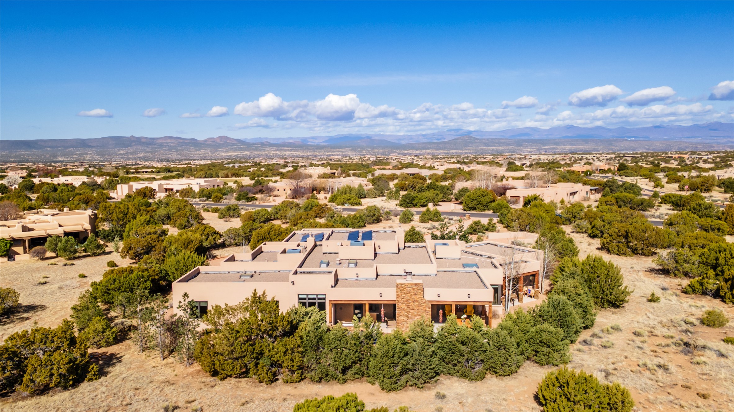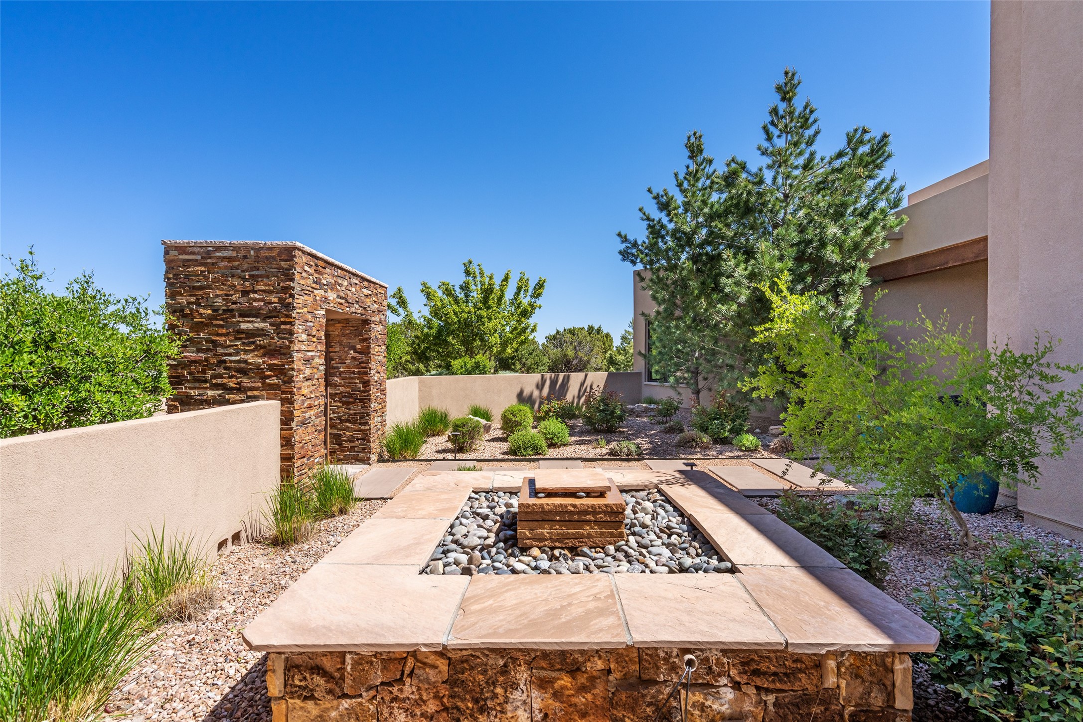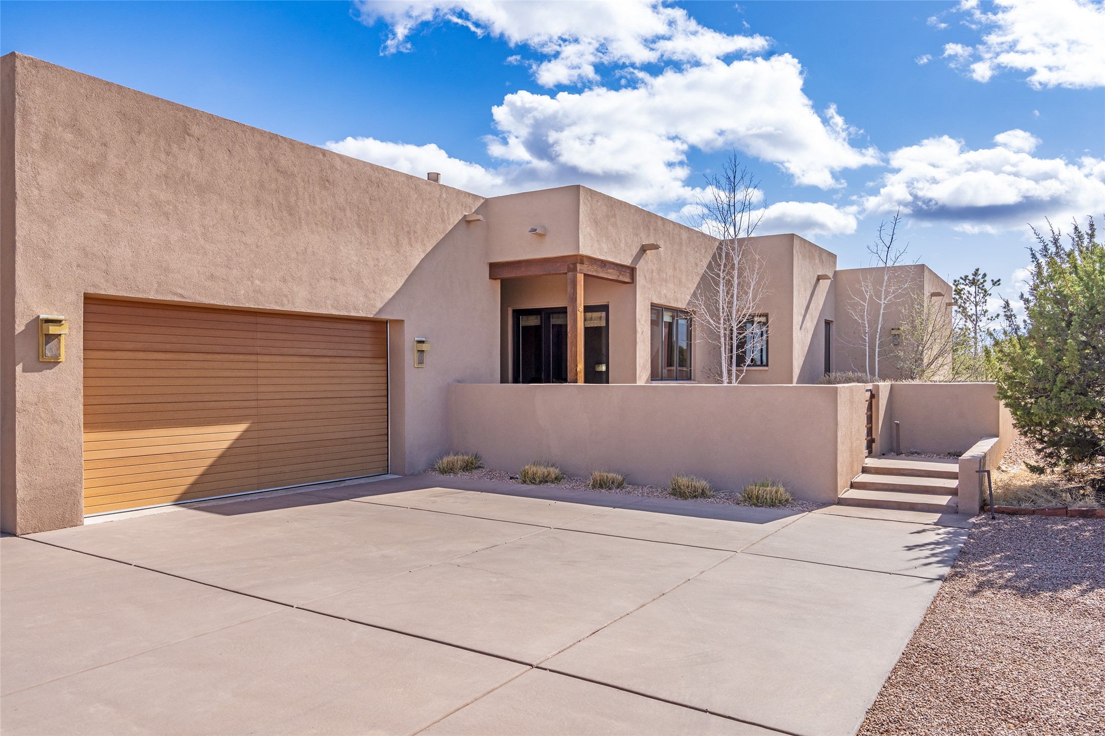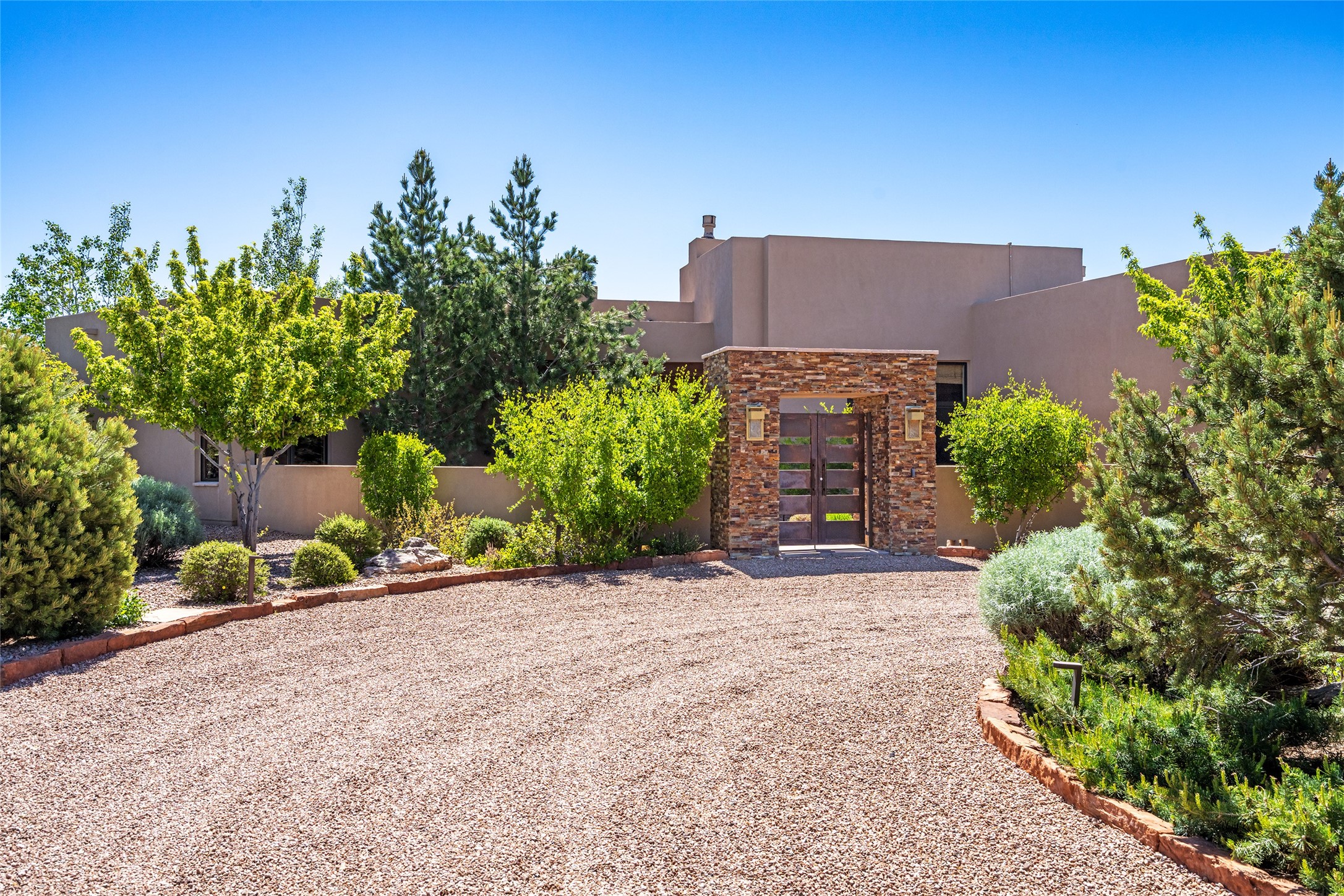 Embrace the beauty of contemporary Pueblo-style architecture in this exquisite 3-bedroom, 3.5-bath home, thoughtfully designed with sophisticated finishes throughout. Nestled on 1.8 acres, this stunning residence is perfectly positioned for privacy and tranquility, offering elegant indoor and outdoor living spaces with Jemez Mountain views.A private entry courtyard with a serene stone water feature sets the tone for the refined interiors. At the heart of the home, the grand chef's kitchen boasts top-tier appliances, custom cabinetry, and an inviting layout ideal for entertaining. The generous primary suite is a true retreat, featuring a cozy gas fireplace, two walk-in closets, office space, a spa-inspired bath, and private portal. The guest wing contains two spacious guest rooms, each with an ensuite bath, providing exceptional comfort and privacy. A large office/den with a separate entrance and its own portal offers the perfect space for work or creative pursuitsOutdoor living is just as inviting, with a spacious rear portal with a large fireplace, built-in gas grill, a second water feature, and plenty of space for dining al fresco while taking in the tranquil surroundings. A three-car direct-entry garage adds to the exceptional features of this property. This home seamlessly blends timeless Southwestern charm with modern sophistication -- an unparalleled sanctuary just waiting to be enjoyed.