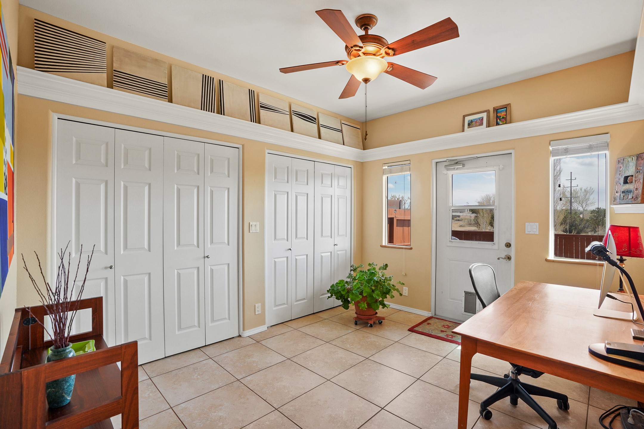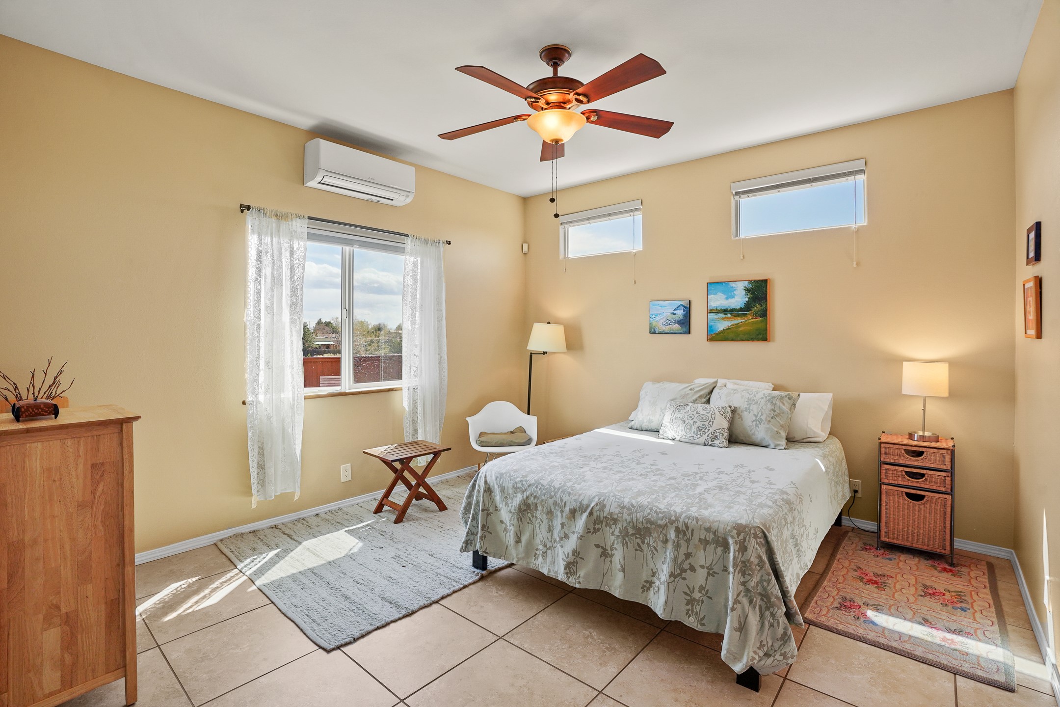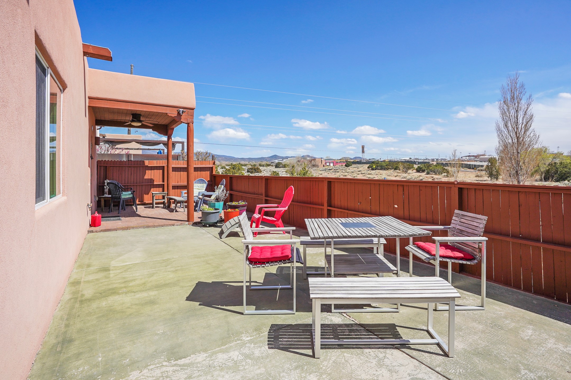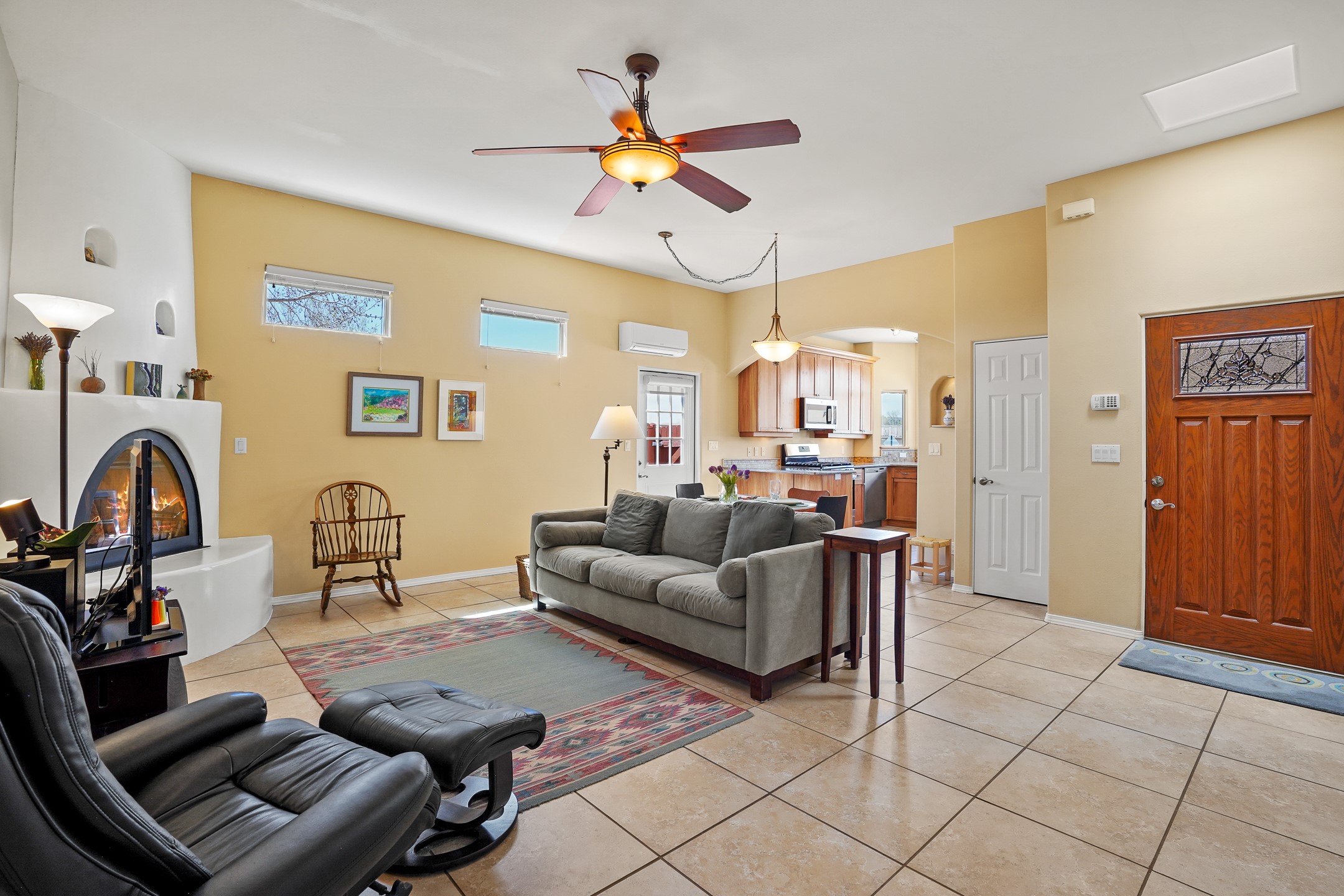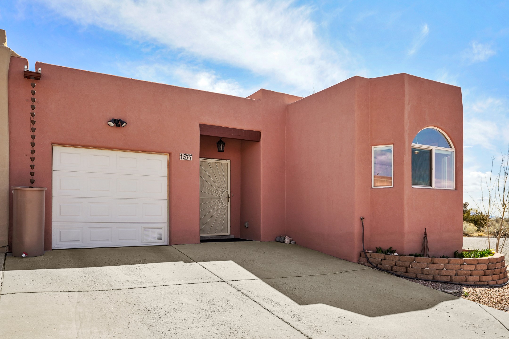 This charming home offers an abundance of natural light, with five skylights thoughtfully placed throughout the space--two in the hallway, one in each bathroom, and another in the direct entry garage. The former owner, a passionate artist, used the garage as a painting studio, which benefits from this incredible light. Enjoy stunning views of the expansive Arroyo de los Chamisos, perfect for soaking in breathtaking sunsets.For energy efficiency, solar panels keep your electric costs low. The home has been lovingly maintained, with both the roof and stucco remaining under a transferrable warranty for added peace of mind. Plus, there's wiring already in place for a hot tub on the patio, just waiting for your relaxation!You'll also appreciate the friendly neighborhood community, with dog walkers and hikers often seen enjoying the scenic arroyo trails. The current owner has also cultivated a beautiful stretch of NM sunflowers, which are set to bloom along the arroyo retaining wall. Simply use the drip/sprinkler hose in place, and you can continue this lovely annual tradition!This home truly offers the perfect blend of comfort, beauty, and efficiency, all in a peaceful, welcoming environment.