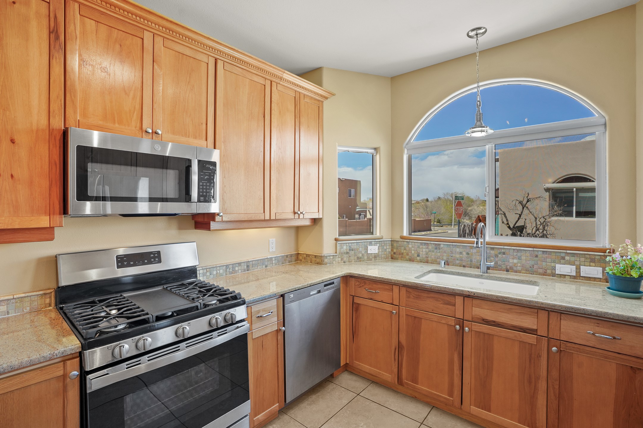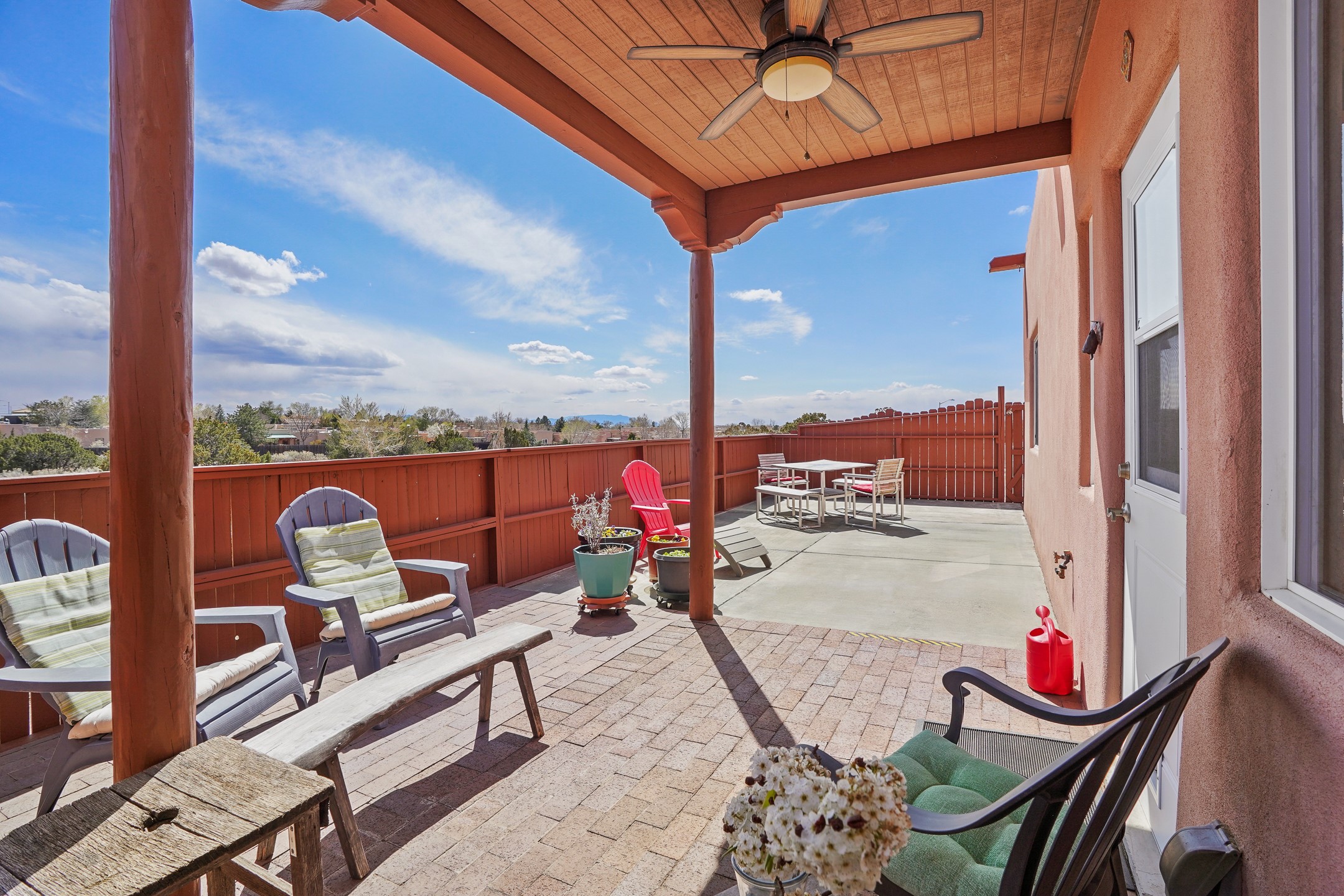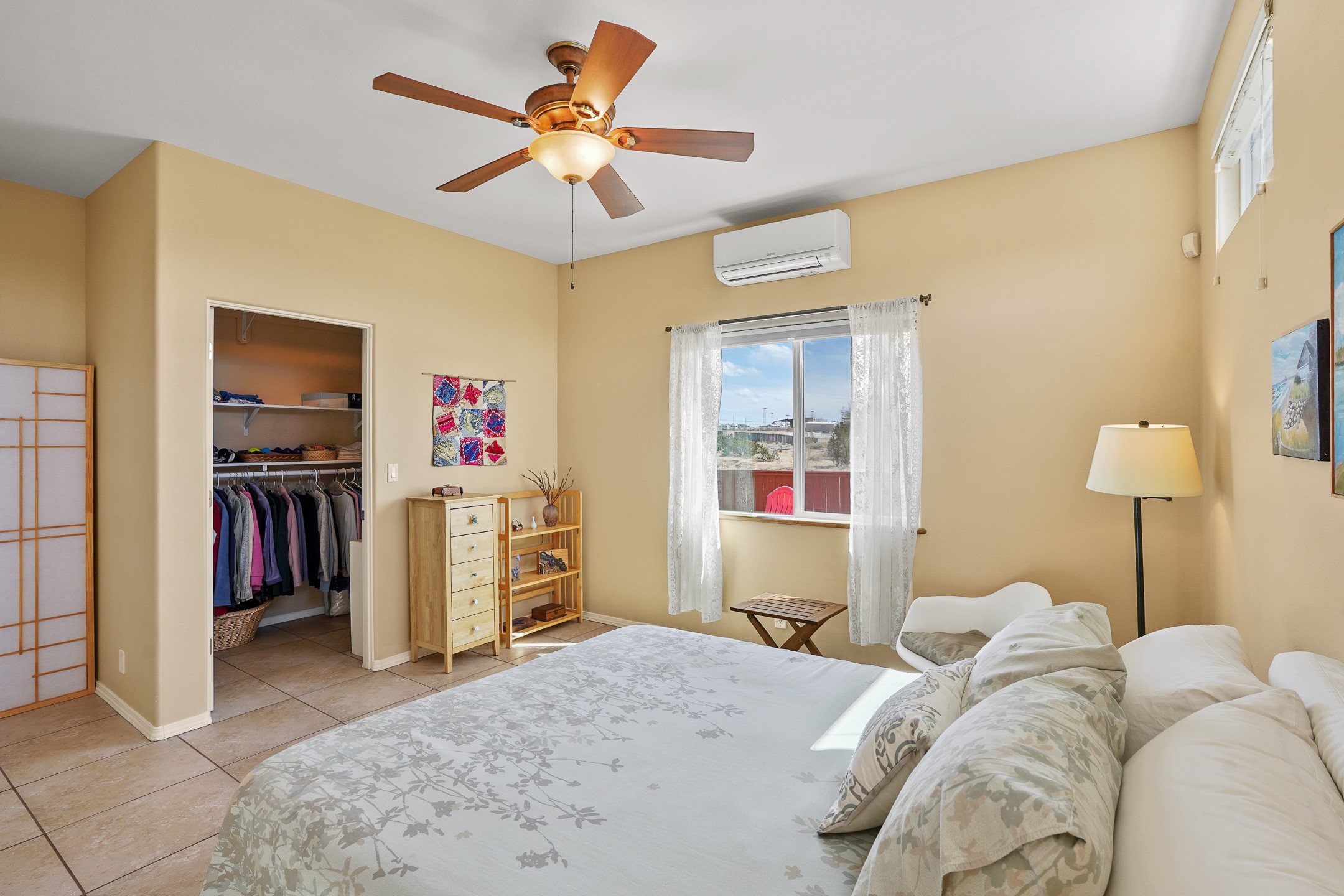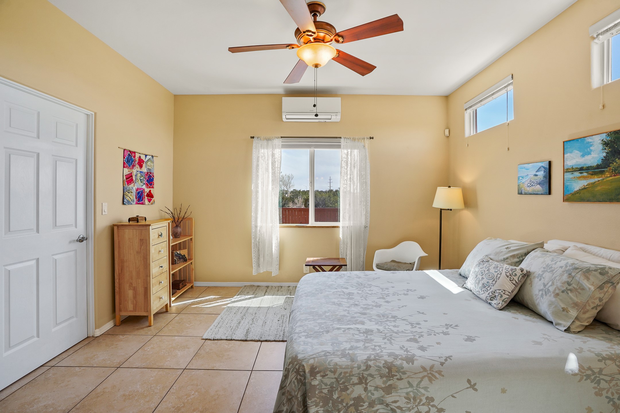 This charming home offers an abundance of natural light, with five skylights thoughtfully placed throughout the space--two in the hallway, one in each bathroom, and another in the direct entry garage. The former owner, a passionate artist, used the garage as a painting studio, which benefits from this incredible light. Enjoy stunning views of the expansive Arroyo de los Chamisos, perfect for soaking in breathtaking sunsets.For energy efficiency, solar panels keep your electric costs low. The home has been lovingly maintained, with both the roof and stucco remaining under a transferrable warranty for added peace of mind. Plus, there's wiring already in place for a hot tub on the patio, just waiting for your relaxation!You'll also appreciate the friendly neighborhood community, with dog walkers and hikers often seen enjoying the scenic arroyo trails. The current owner has also cultivated a beautiful stretch of NM sunflowers, which are set to bloom along the arroyo retaining wall. Simply use the drip/sprinkler hose in place, and you can continue this lovely annual tradition!This home truly offers the perfect blend of comfort, beauty, and efficiency, all in a peaceful, welcoming environment.