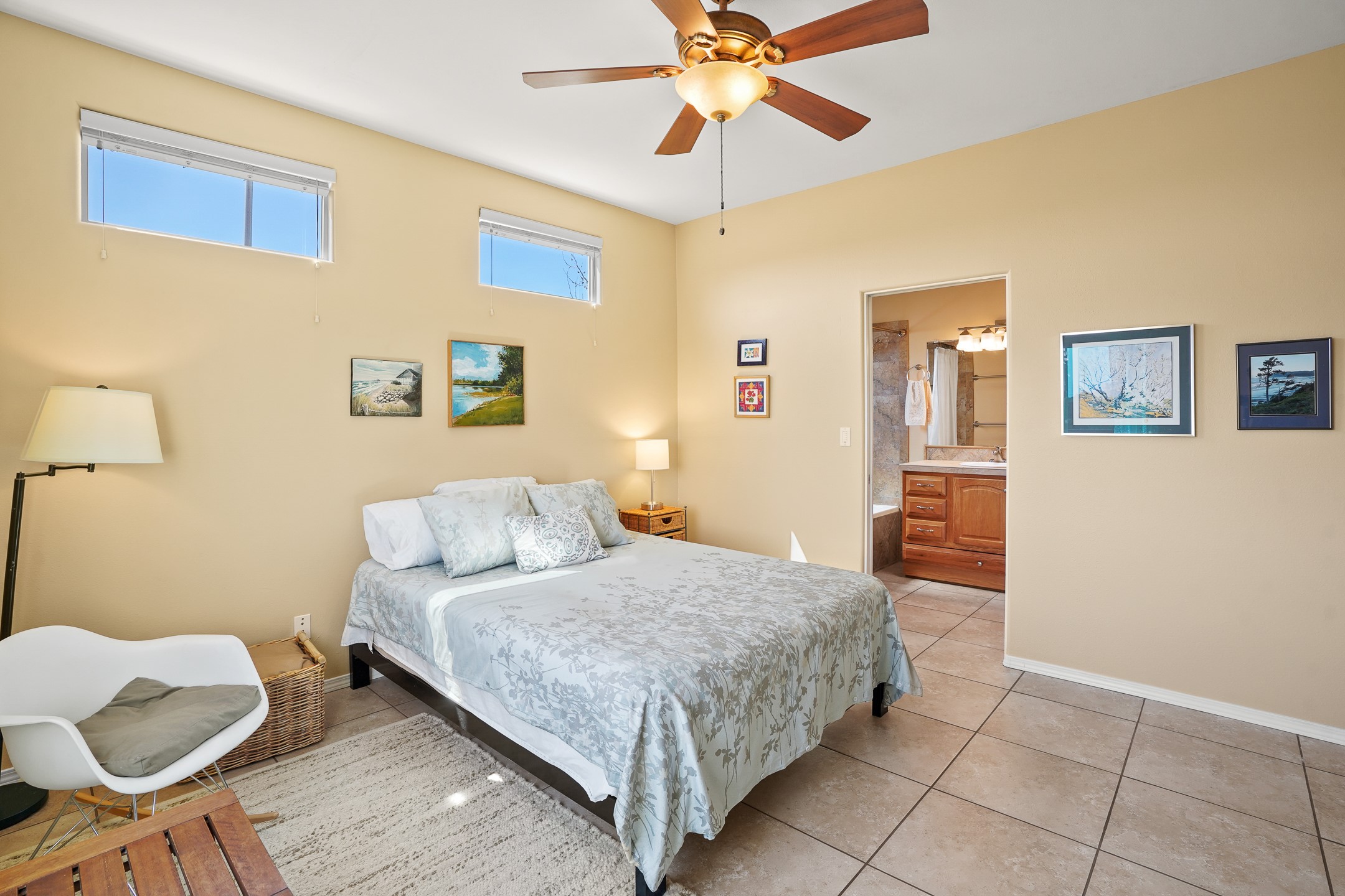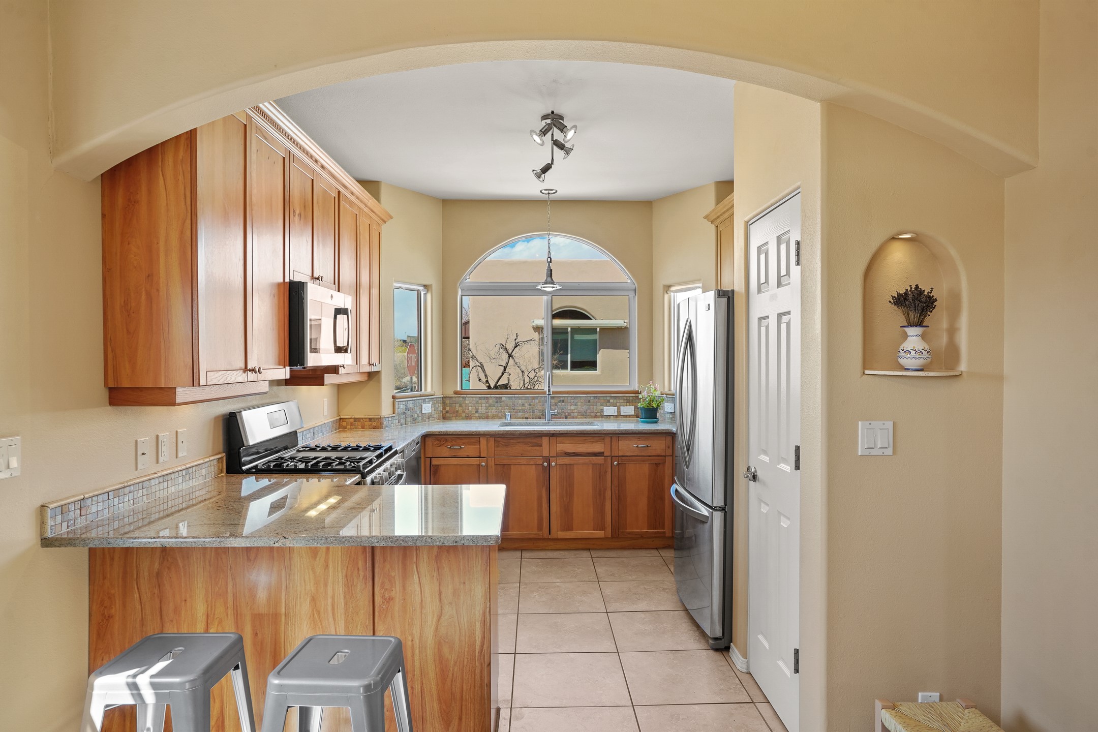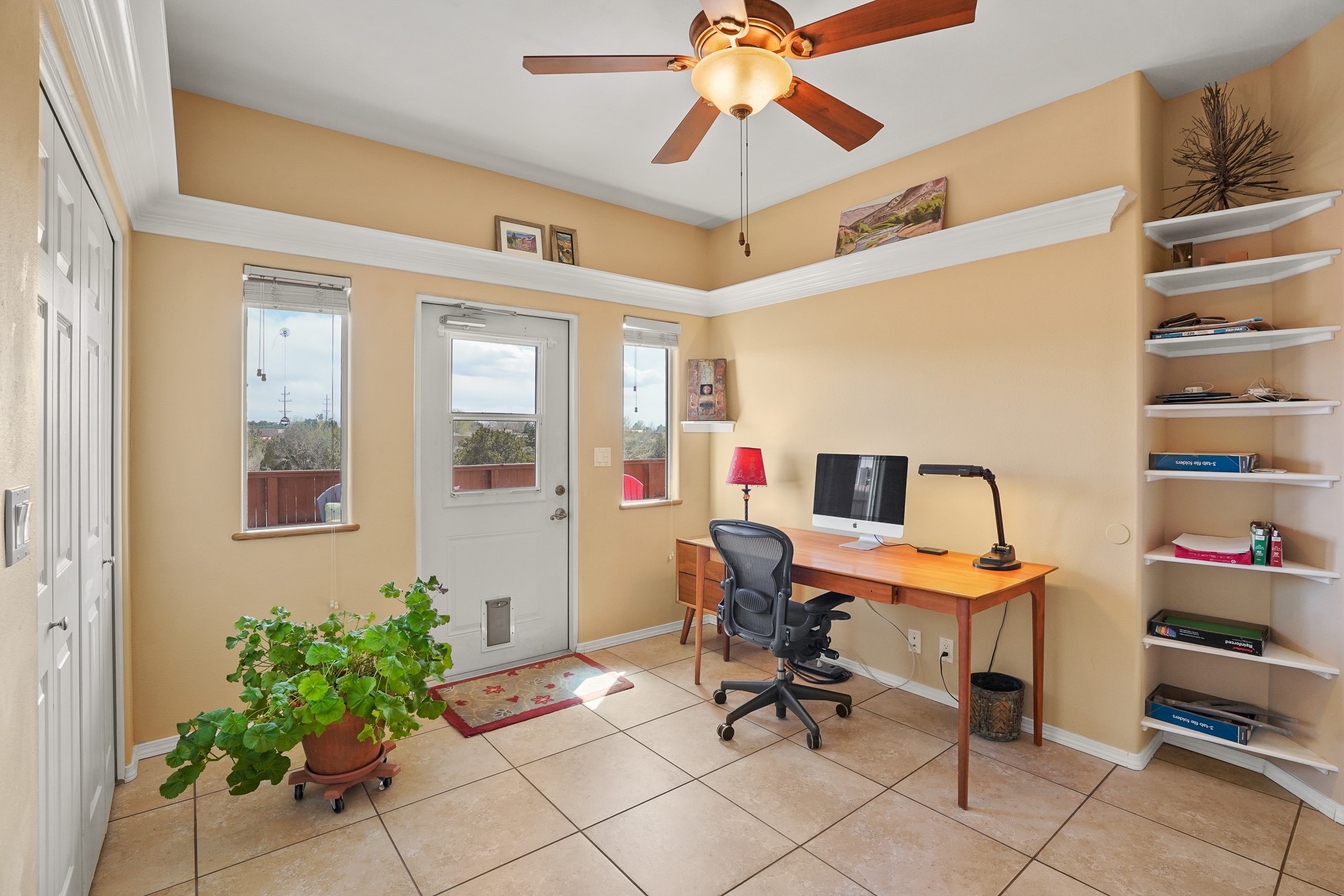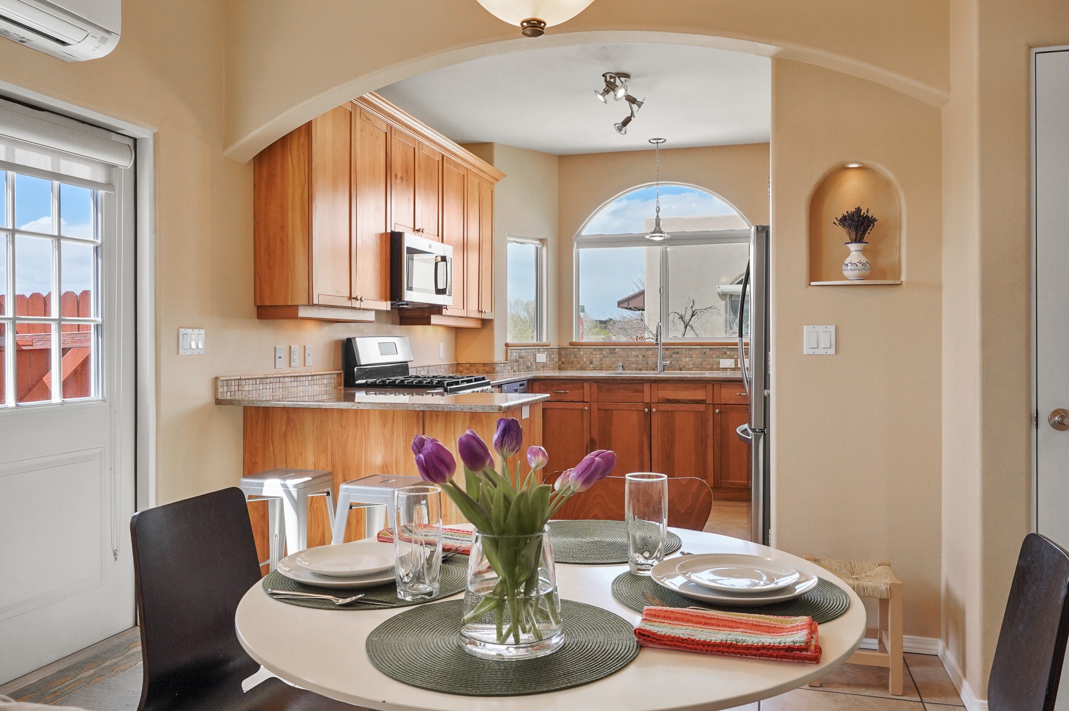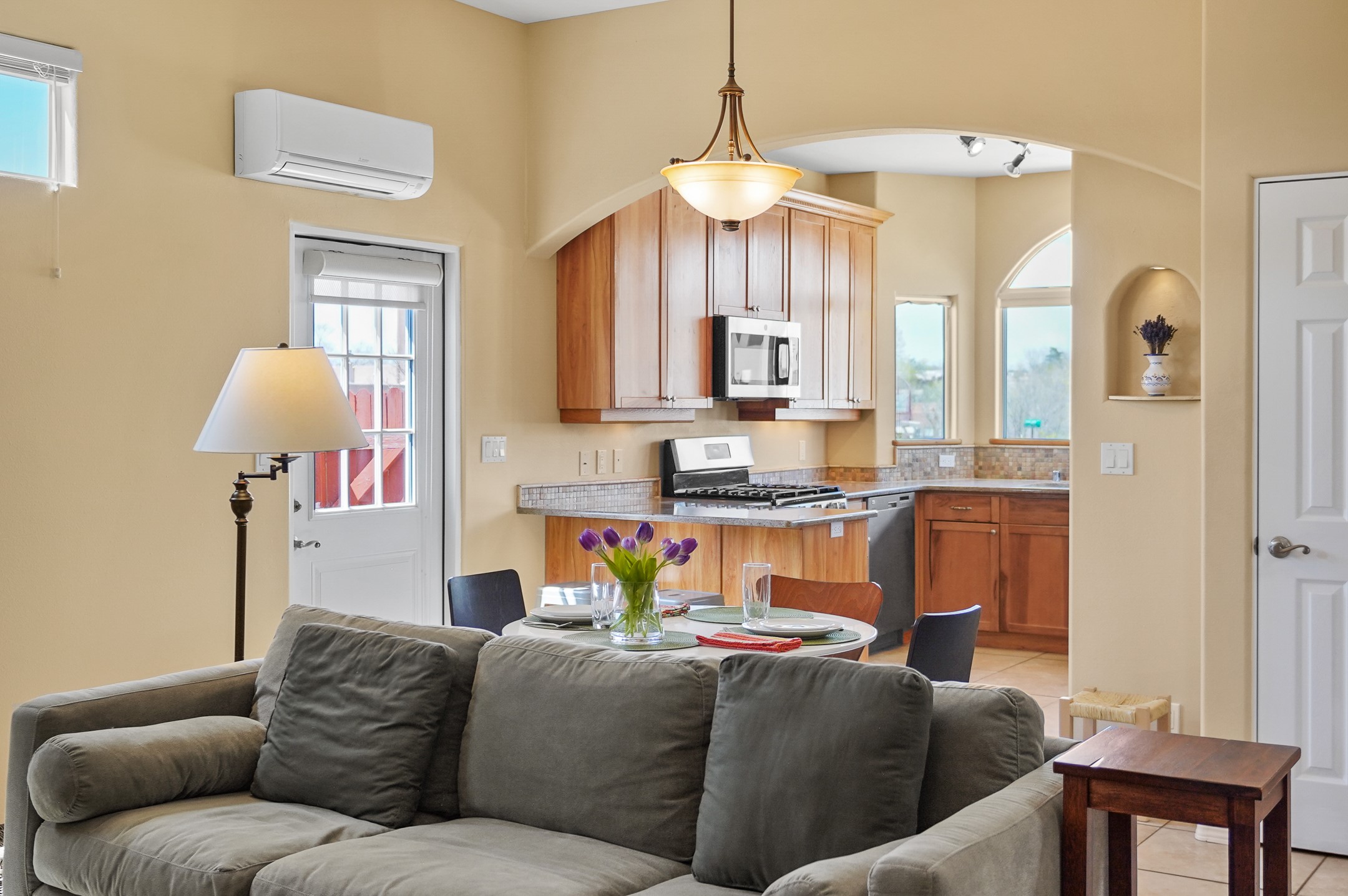 This charming home offers an abundance of natural light, with five skylights thoughtfully placed throughout the space--two in the hallway, one in each bathroom, and another in the direct entry garage. The former owner, a passionate artist, used the garage as a painting studio, which benefits from this incredible light. Enjoy stunning views of the expansive Arroyo de los Chamisos, perfect for soaking in breathtaking sunsets.For energy efficiency, solar panels keep your electric costs low. The home has been lovingly maintained, with both the roof and stucco remaining under a transferrable warranty for added peace of mind. Plus, there's wiring already in place for a hot tub on the patio, just waiting for your relaxation!You'll also appreciate the friendly neighborhood community, with dog walkers and hikers often seen enjoying the scenic arroyo trails. The current owner has also cultivated a beautiful stretch of NM sunflowers, which are set to bloom along the arroyo retaining wall. Simply use the drip/sprinkler hose in place, and you can continue this lovely annual tradition!This home truly offers the perfect blend of comfort, beauty, and efficiency, all in a peaceful, welcoming environment.
