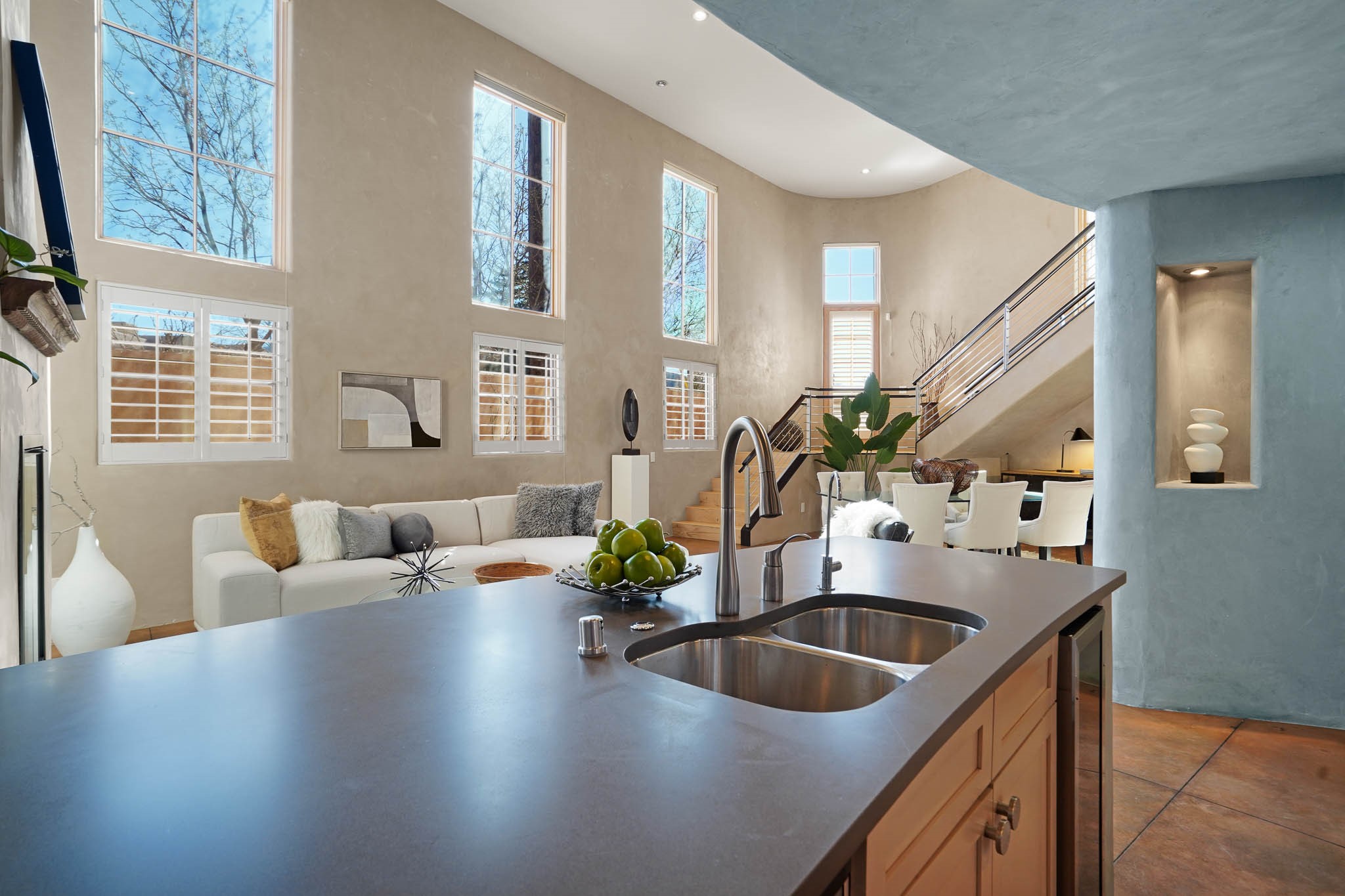 Stylish and thoughtfully designed, this light-filled condo is just steps from Kaune's neighborhood market and within walking distance of many of Santa Fe's most beloved destinations. Blending modern comfort with timeless Southwest charm, this home is ideal for those seeking convenience, elegance, and versatility. A private, gated front courtyard shaded by graceful Aspen trees welcomes you home--offering a peaceful spot to savor your morning coffee or unwind in the evening. Inside, the open-concept main level features soaring ceilings, expansive windows, and American clay walls that beautifully reflect the natural light. A gas log fireplace adds warmth and ambiance, while the chef's kitchen showcases high-end appliances and a spacious island, perfect for gathering with friends or family.The first floor also includes a comfortable guest bedroom and full bathroom, providing privacy and ease for visitors. Upstairs, a sunlit landing offers a serene space for a home office or cozy reading nook. The primary suite serves as a tranquil retreat, complete with a sleek ensuite bathroom and picturesque views. A dedicated laundry space in the primary closet adds everyday convenience. Designed for low-maintenance living, this home is an ideal lock-and-leave option. Enjoy year-round comfort with radiant heat, central air conditioning, and a two-car garage. Zoned RAC for multi-purpose use, the property also offers unique flexibility in one of Santa Fe's most sought-after locations. Schedule your showing today and discover the very best of Santa Fe living.