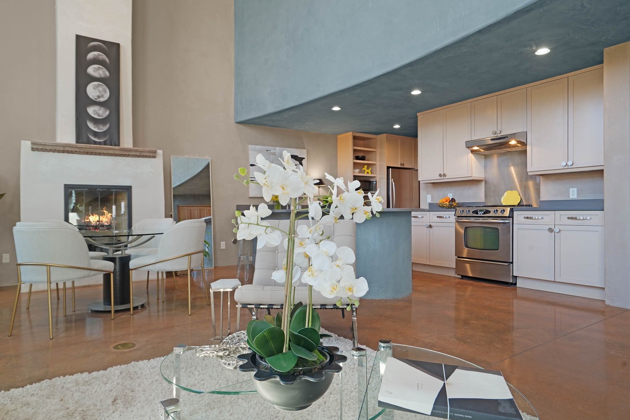 Stylish and thoughtfully designed, this light-filled condo is just steps from Kaune's neighborhood market and within walking distance of many of Santa Fe's most popular destinations. Offering a blend of modern comfort and Southwest charm, this home is perfect for those seeking convenience, elegance, and versatility. A private, gated front courtyard, shaded by beautiful Aspen trees, creates a peaceful entry and a perfect, quiet spot to enjoy morning coffee or evening relaxation. Inside, the main level features an open-concept living space with soaring ceilings, large windows, and American clay walls that enhance the natural light. A gas log fireplace adds warmth and ambiance, while the chef's kitchen boasts high-end appliances, a spacious island ideal for entertaining, and a generous pantry. A separate laundry room provides additional convenience. Also on the first floor, a guest bedroom and full bathroom offer privacy for visitors, and a stylish powder room sits off the entry for added convenience. A graceful staircase leads to the upper level, where a bright and airy landing serves as the perfect spot for a home office or cozy reading nook. The primary suite is a private retreat, featuring dual closets, a sleek ensuite bathroom, and stunning views. Designed for easy living and low maintenance, this home is an ideal lock-and-leave property. It also features radiant heat, central air conditioning, and a two-car garage--ensuring year-round comfort.Zoned RAC for multi-purpose use, this condo offers exceptional flexibility in a prime location. Schedule your showing today and experience the best of Santa Fe living!