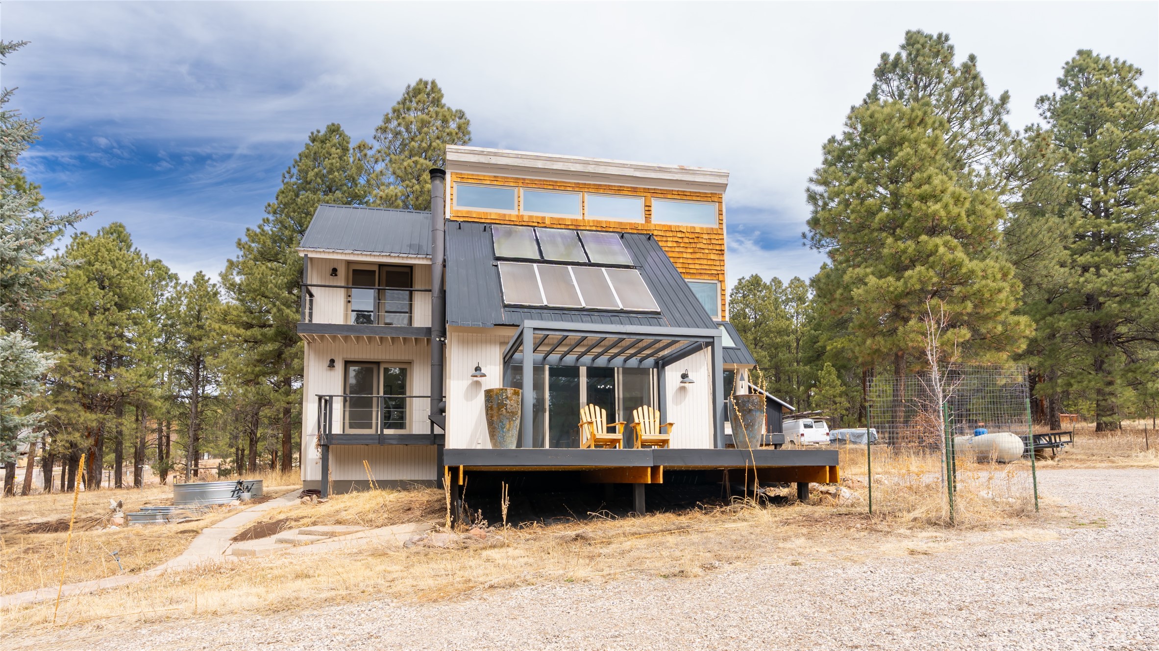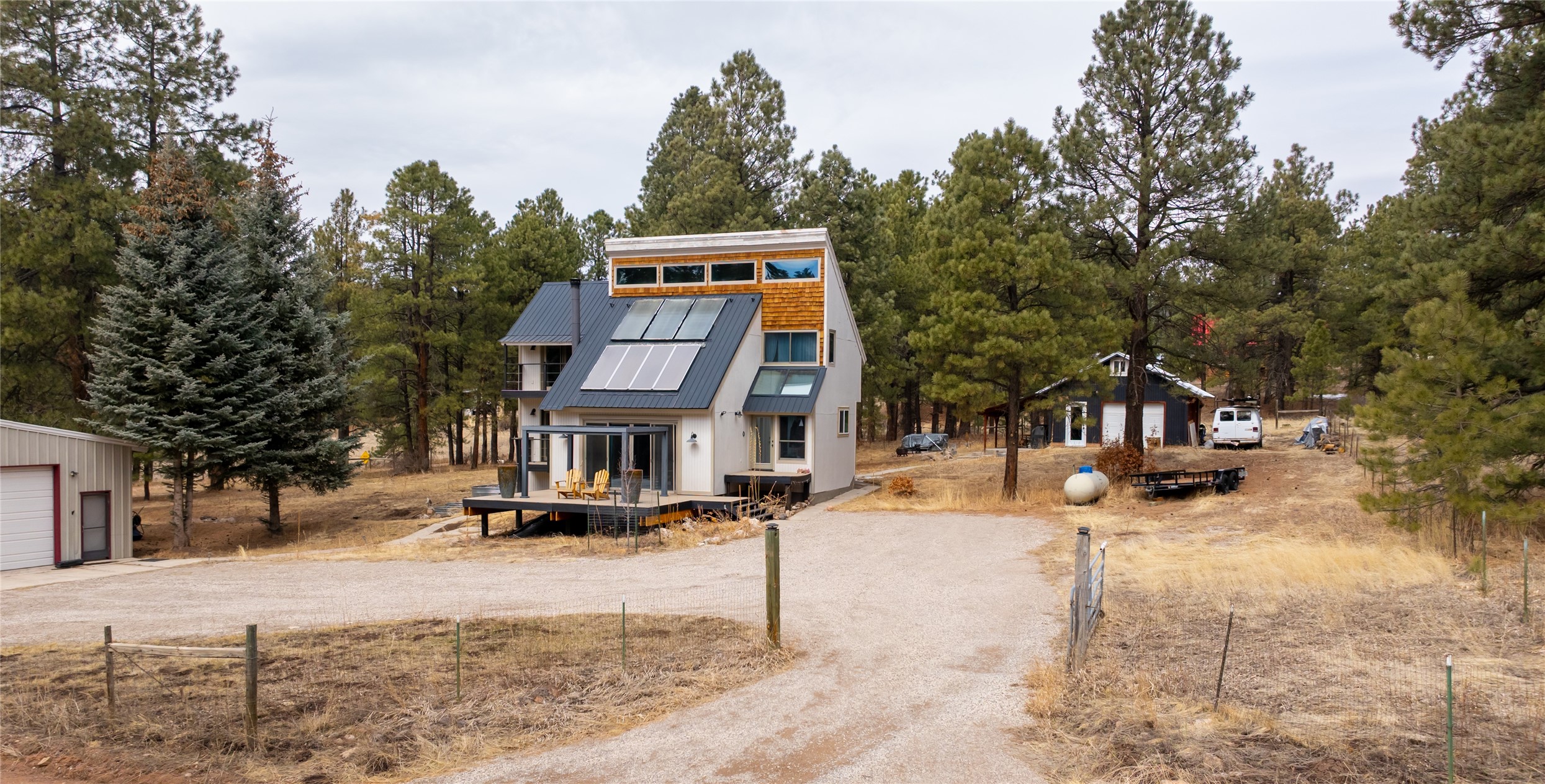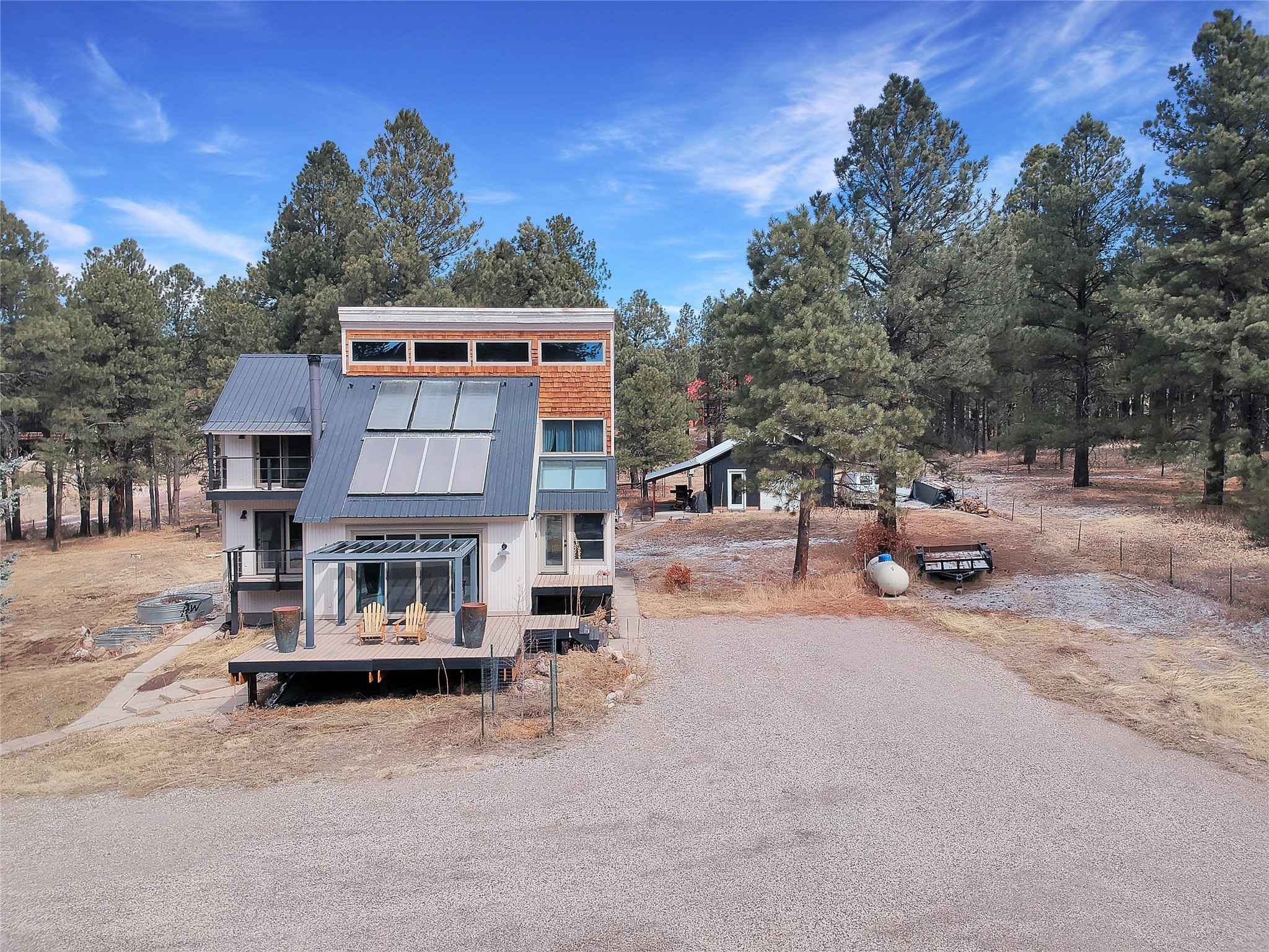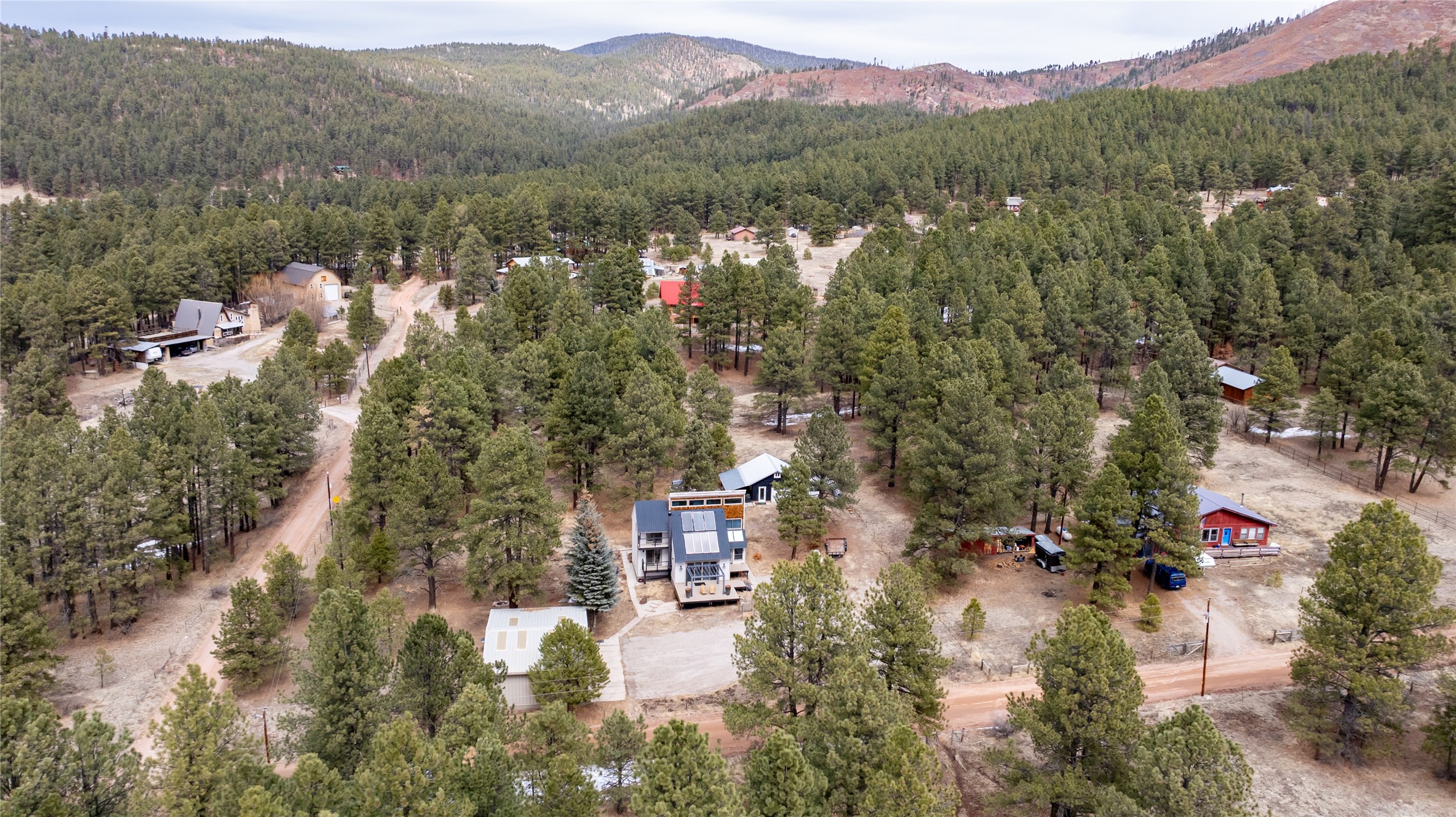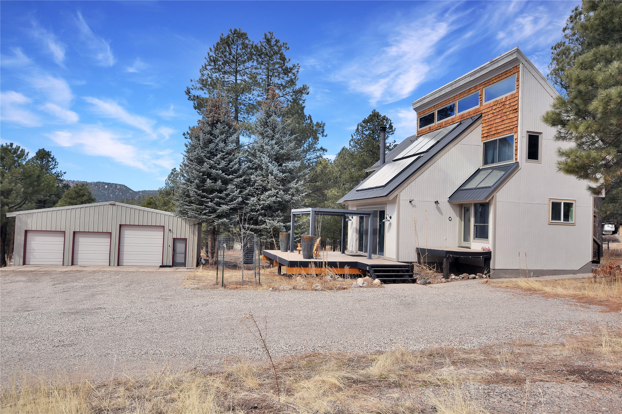 Bright, Beautiful and IMMACULATE! This one has most everything on your list! 1750 sq. ft. of pure, blissful, homey, and modern living space! Passive solar home with an open flow living space that includes 3 bedrooms and 2 baths, a lovely living area with woodstove and sweet modern kitchen with updated appliances and cabinetry. Anderson windows and doors, updated lighting, reverse osmosis water filtration, water softener, solar hot water heater, roomy basement that includes a space for crafting with ample storage...the list just goes on and on!! Front and back decks with balconies off two bedrooms for enjoying the outdoors every-which-way!1200 sq. ft. spacious 3 bay shop with an RV bay perfect for working on all your projects and storing all your toys and cars! A separate 500 square foot garage with work shop area that could easily be turned into a she-shed! Step out the front yard into the Santa Fe National Forest! A few steps further, you're on the western edge of the Valles Caldera National Preserve. Tucked in a nice neighborhood on a 1-acre lot off a county-maintained road. Reasonable year-round commute to Los Alamos. You're gonna wanna see this one SOON!