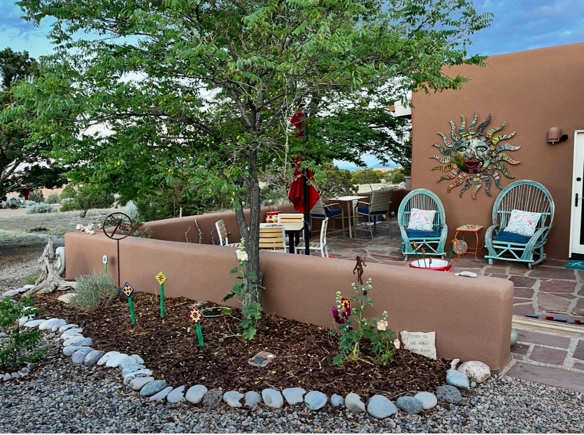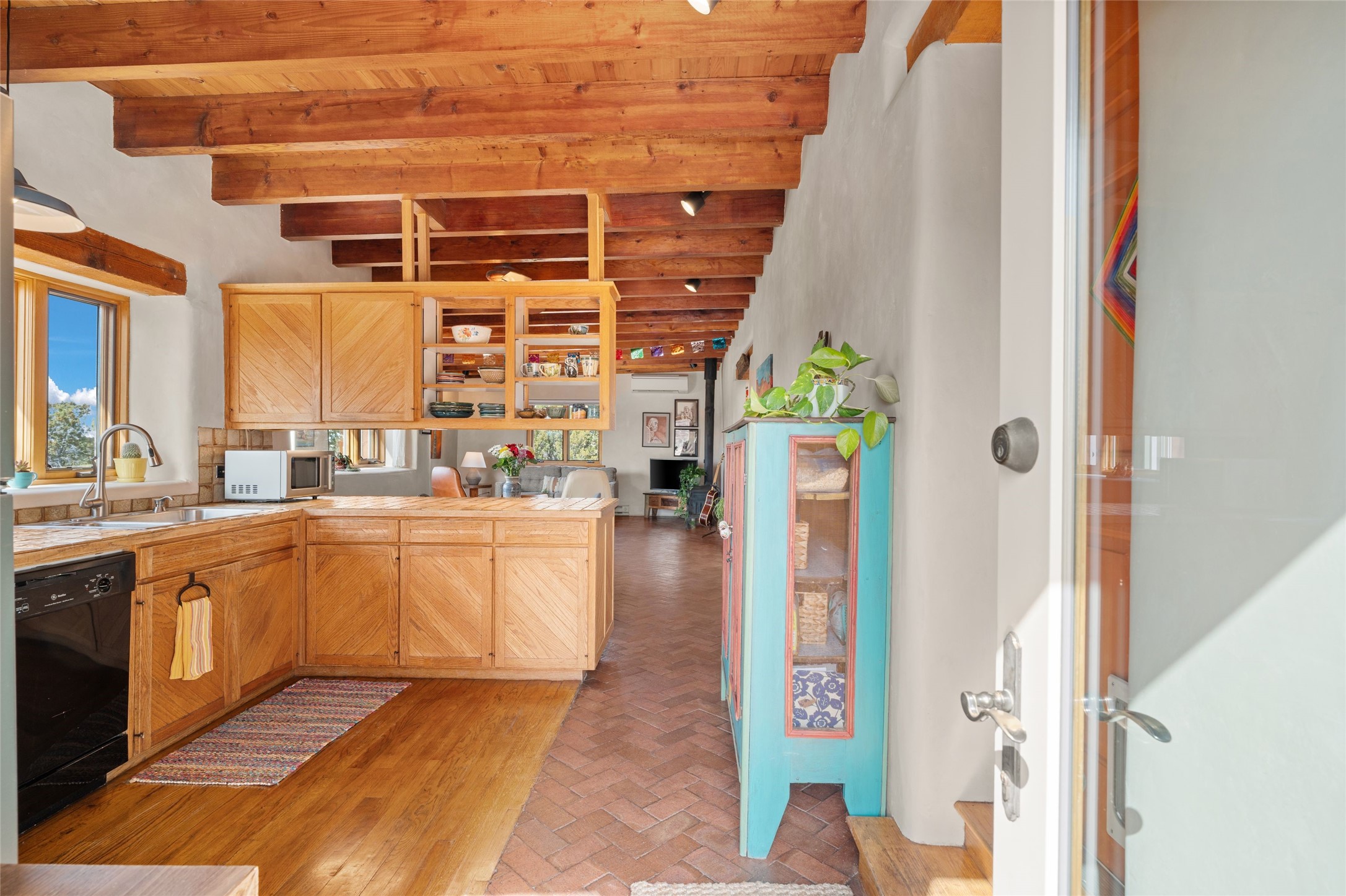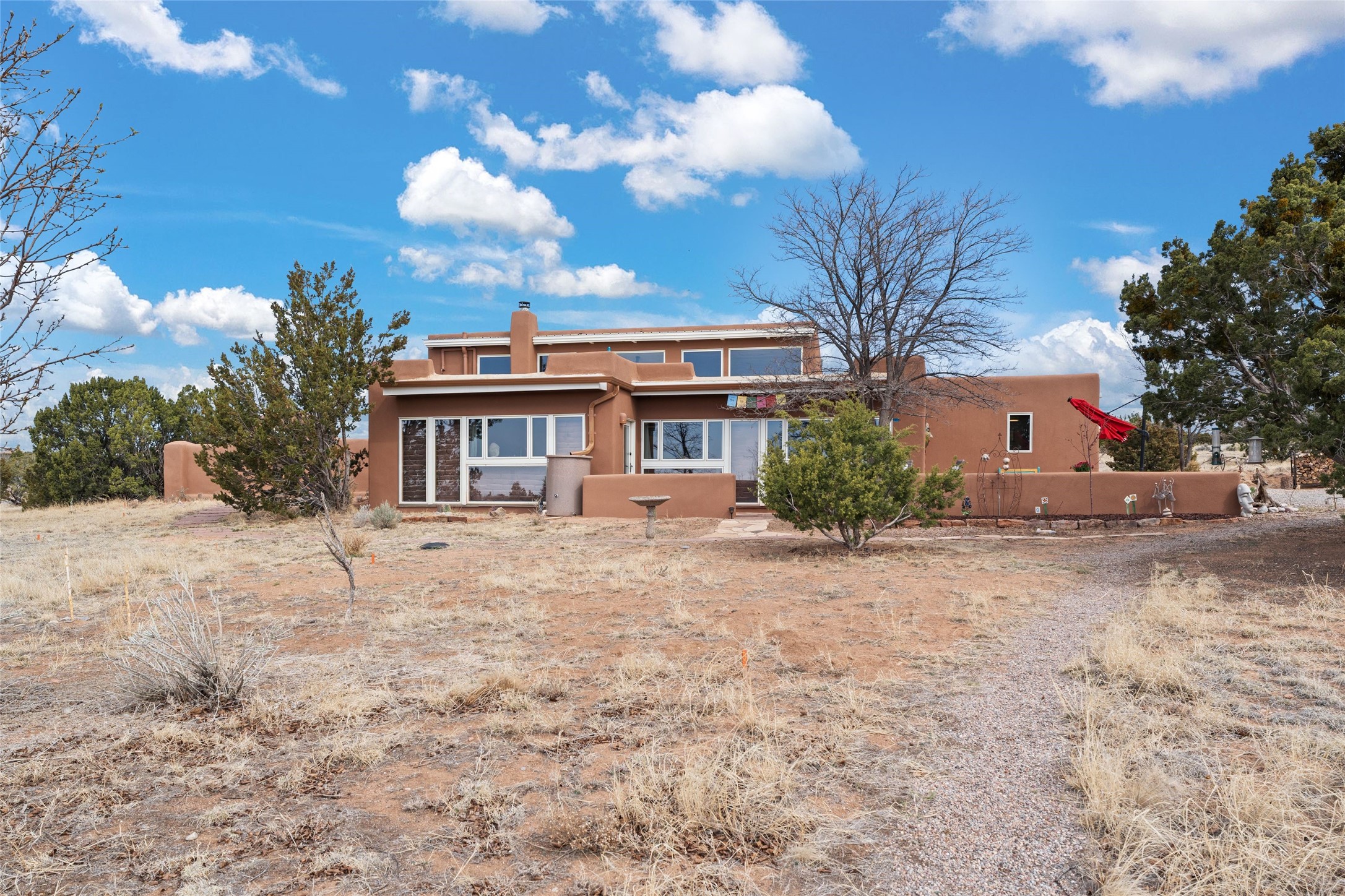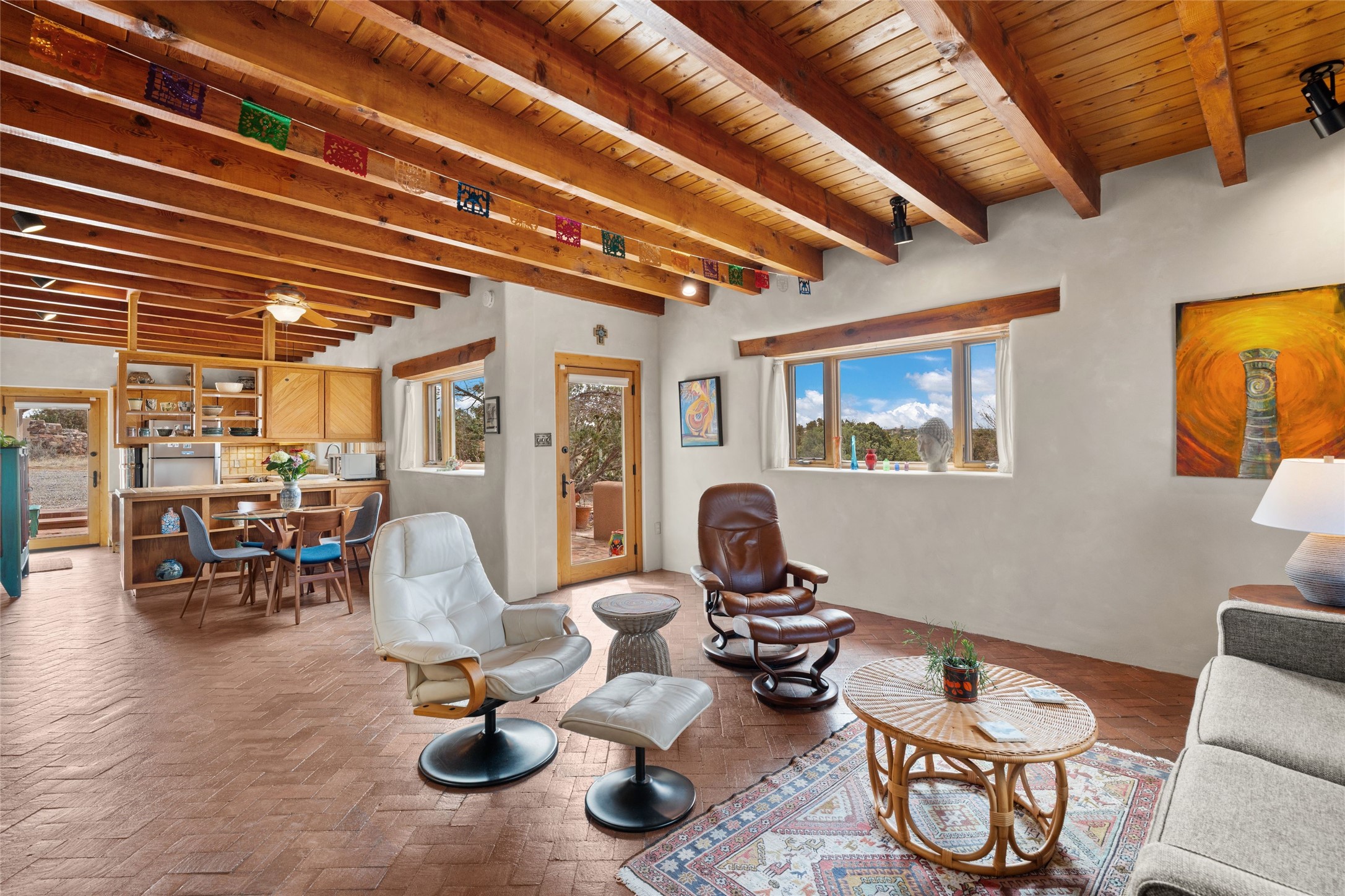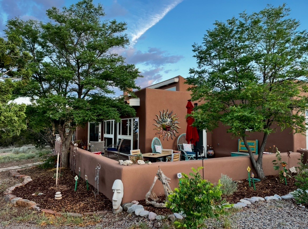 Happy, light and bright adobe designed by award-winning architect Beverley Spears and built by Rational Alternatives. This darling traditional passive solar home has trombe walls, deep window sills and charm galore! Bedrooms have vaulted, planked ceilings with clerestory windows. Mostly brick floors with some hardwood. Oversized heated one-car garage has studio/workshop space and a generous closet for storage. Three splits provide heating and air conditioning. Sited high on a cul-de-sac to maximize the wonderful mountain views. Two steps up to bedrooms. Walled front courtyard and generous and fully fenced backyard. NO CARPET. Radon mitigation in place. Super sweet and ready to go!