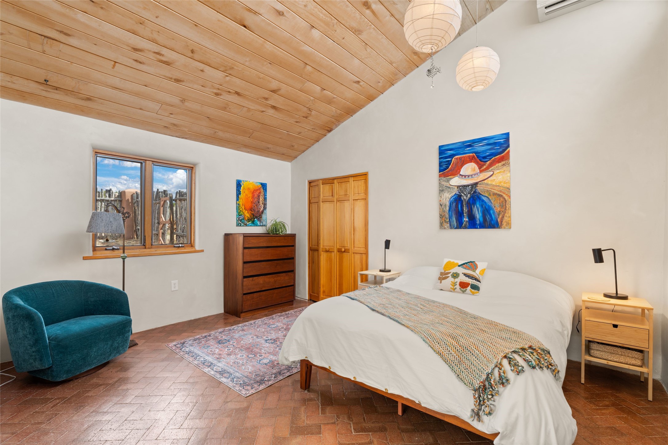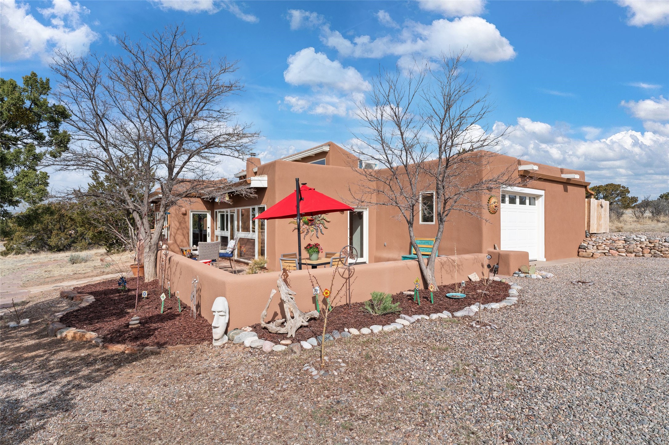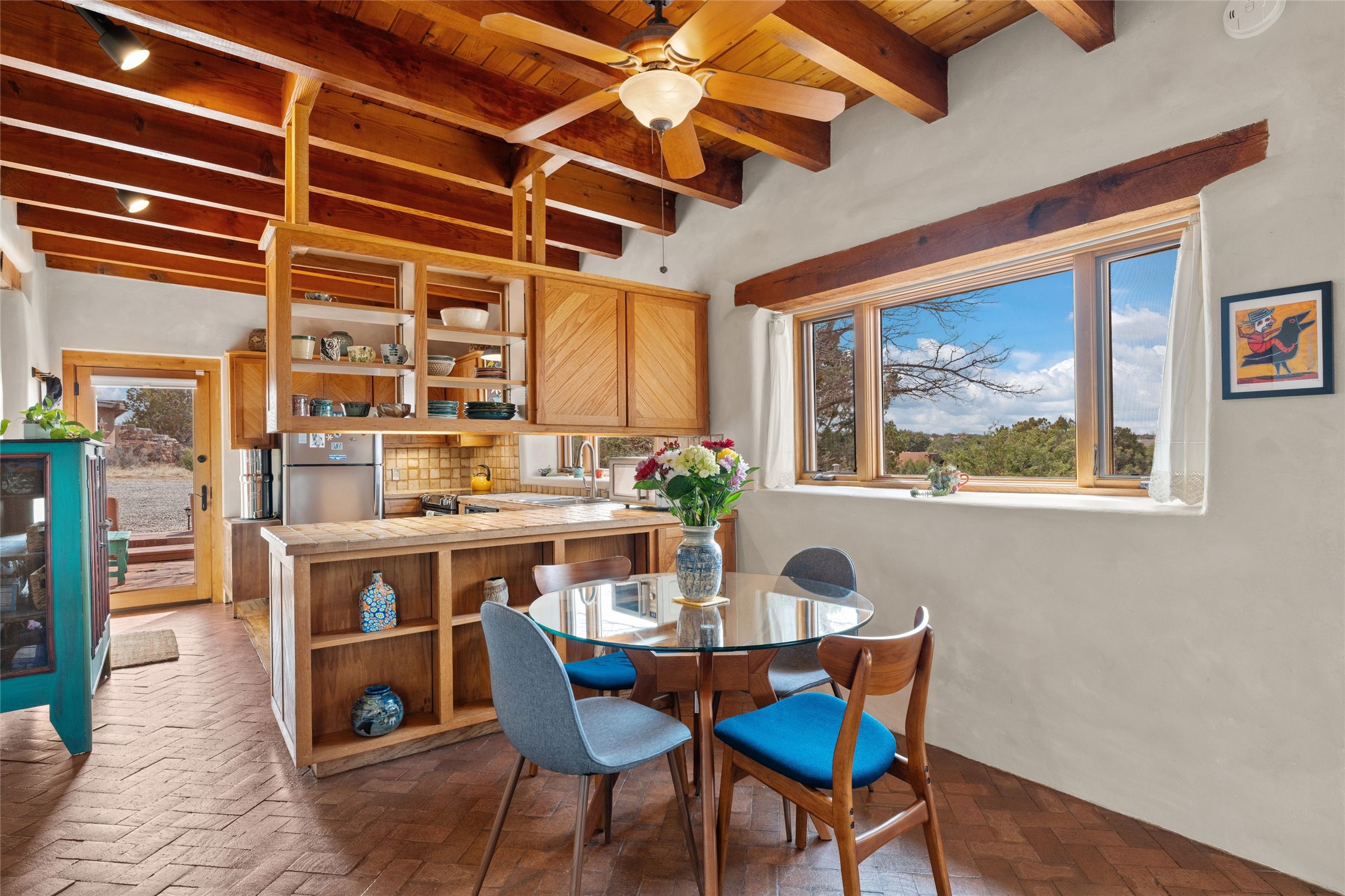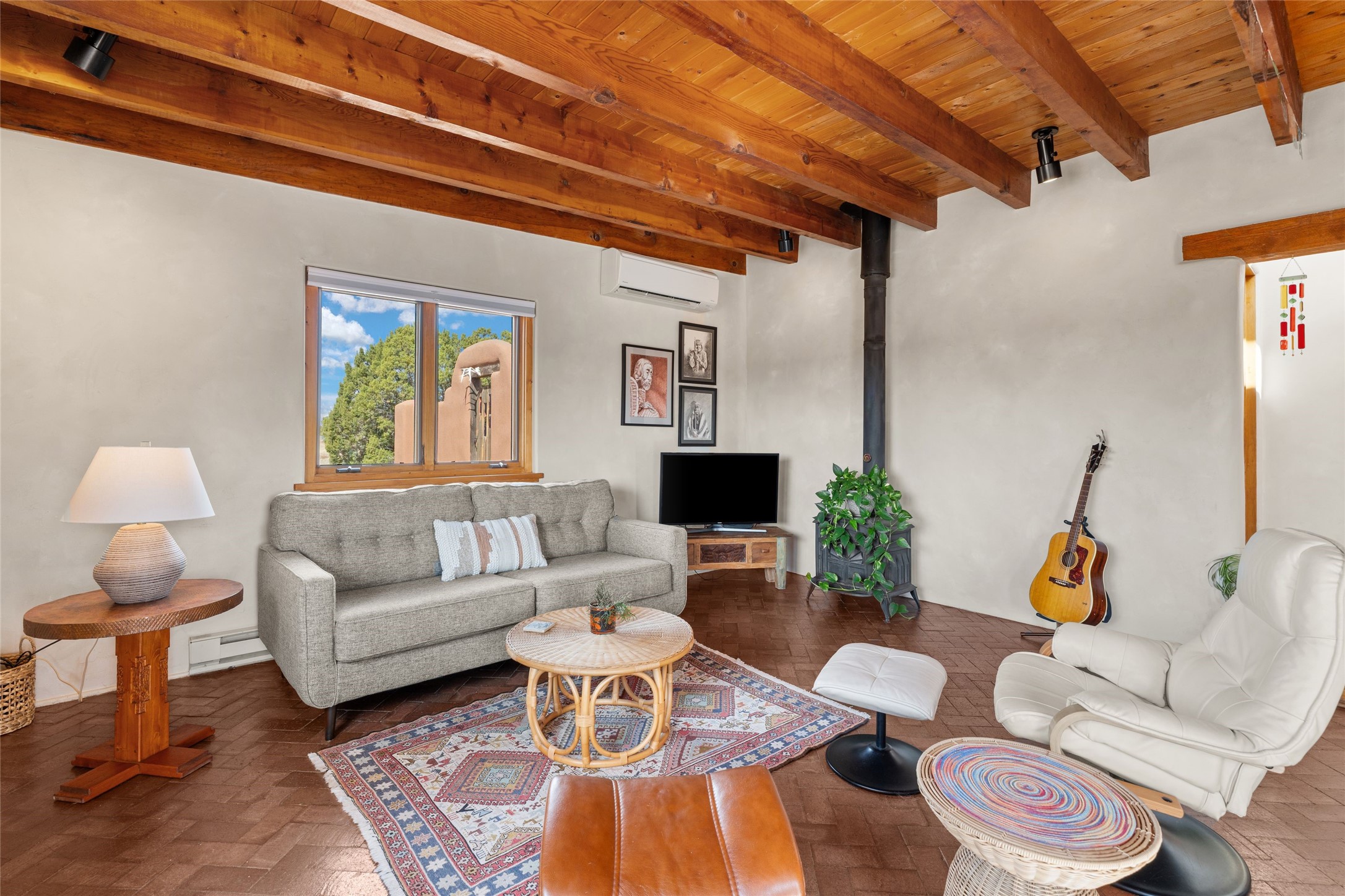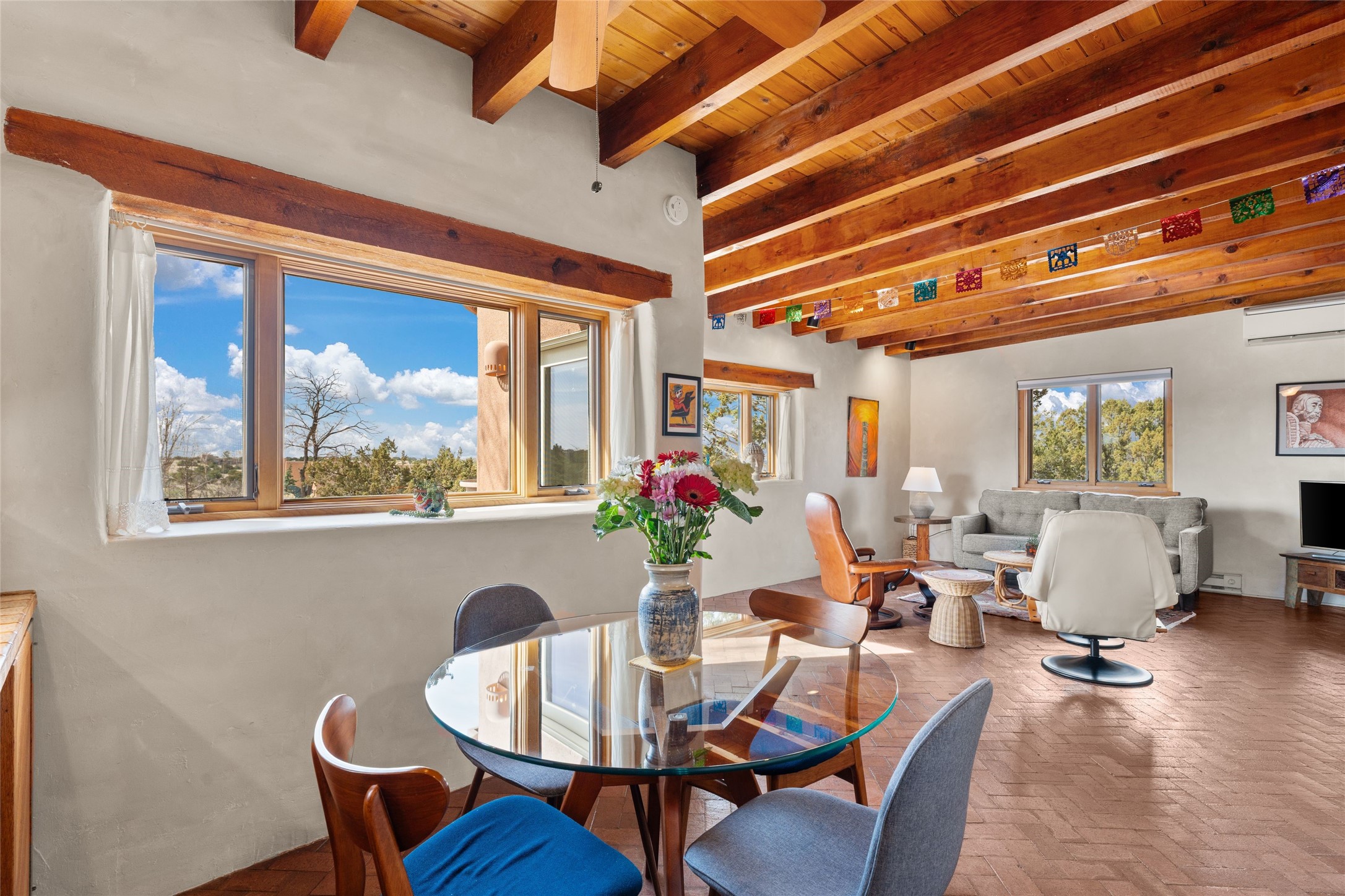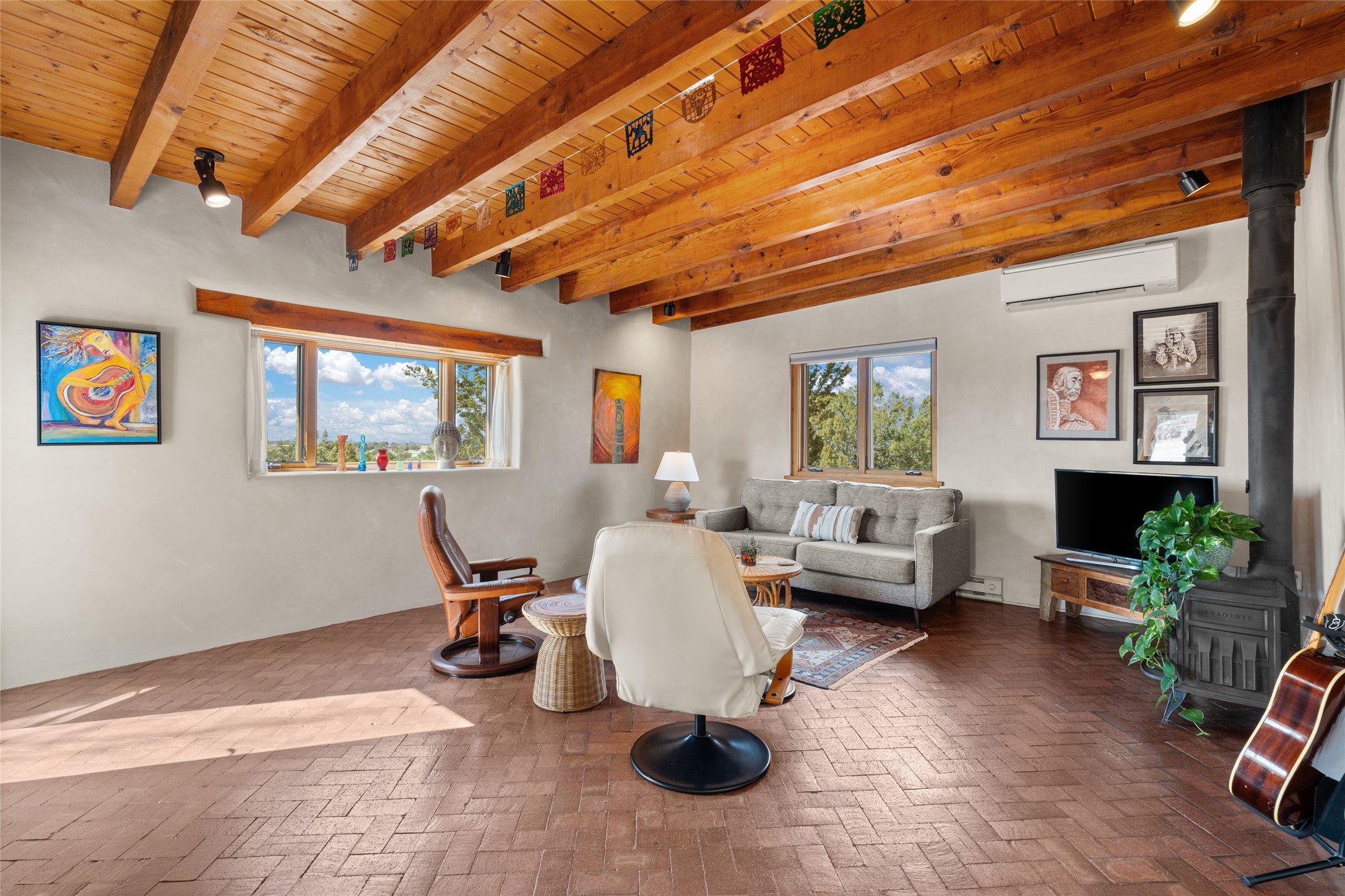 Happy, light and bright adobe designed by award-winning architect Beverley Spears and built by Rational Alternatives. This darling traditional passive solar home has trombe walls, deep window sills and charm galore! Bedrooms have vaulted, planked ceilings with clerestory windows. Mostly brick floors with some hardwood. Oversized heated one-car garage has studio/workshop space and a generous closet for storage. Three splits provide heating and air conditioning. Sited high on a cul-de-sac to maximize the wonderful mountain views. Two steps up to bedrooms. Walled front courtyard and generous and fully fenced backyard. NO CARPET. Radon mitigation in place. Super sweet and ready to go!
