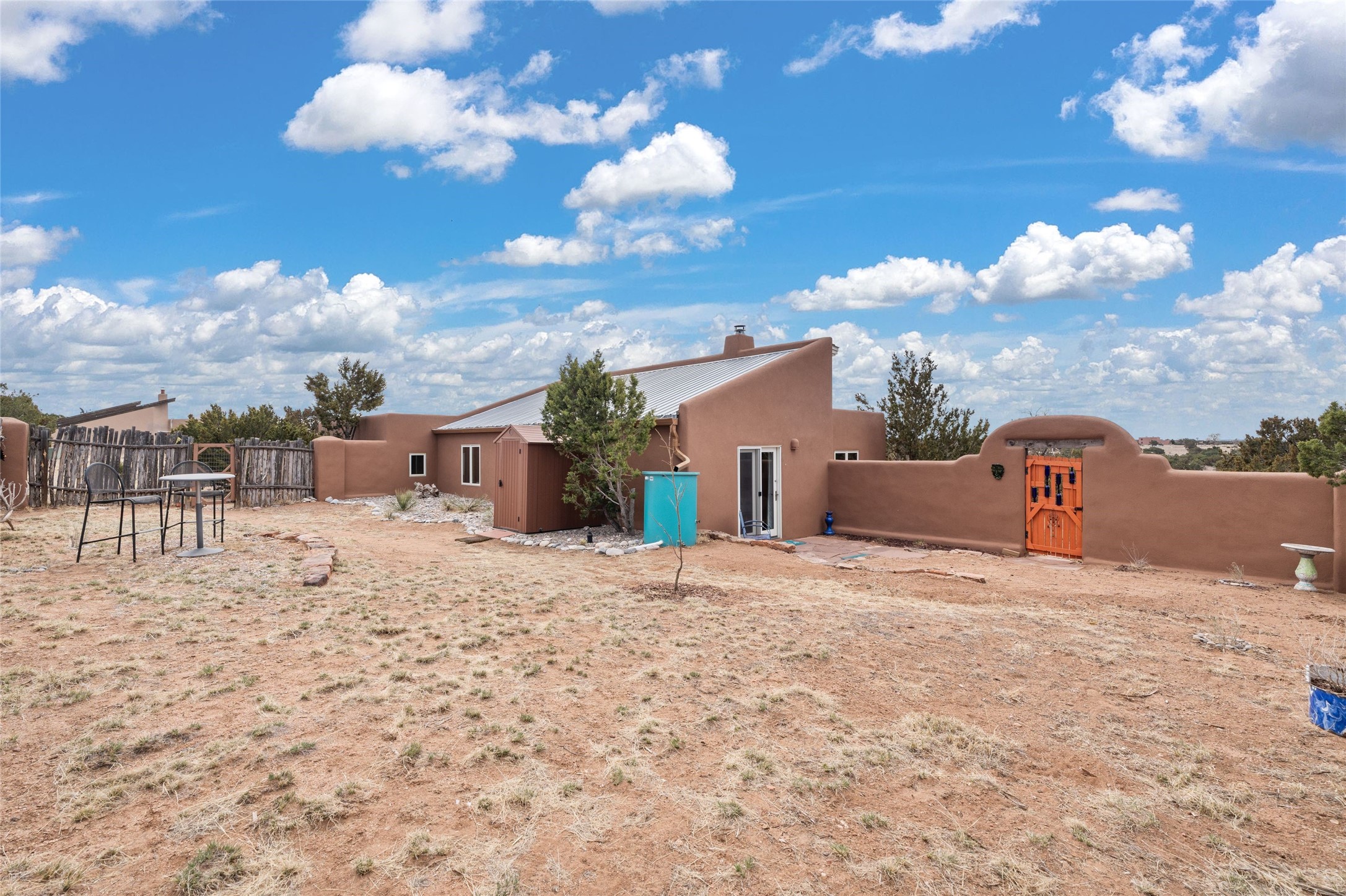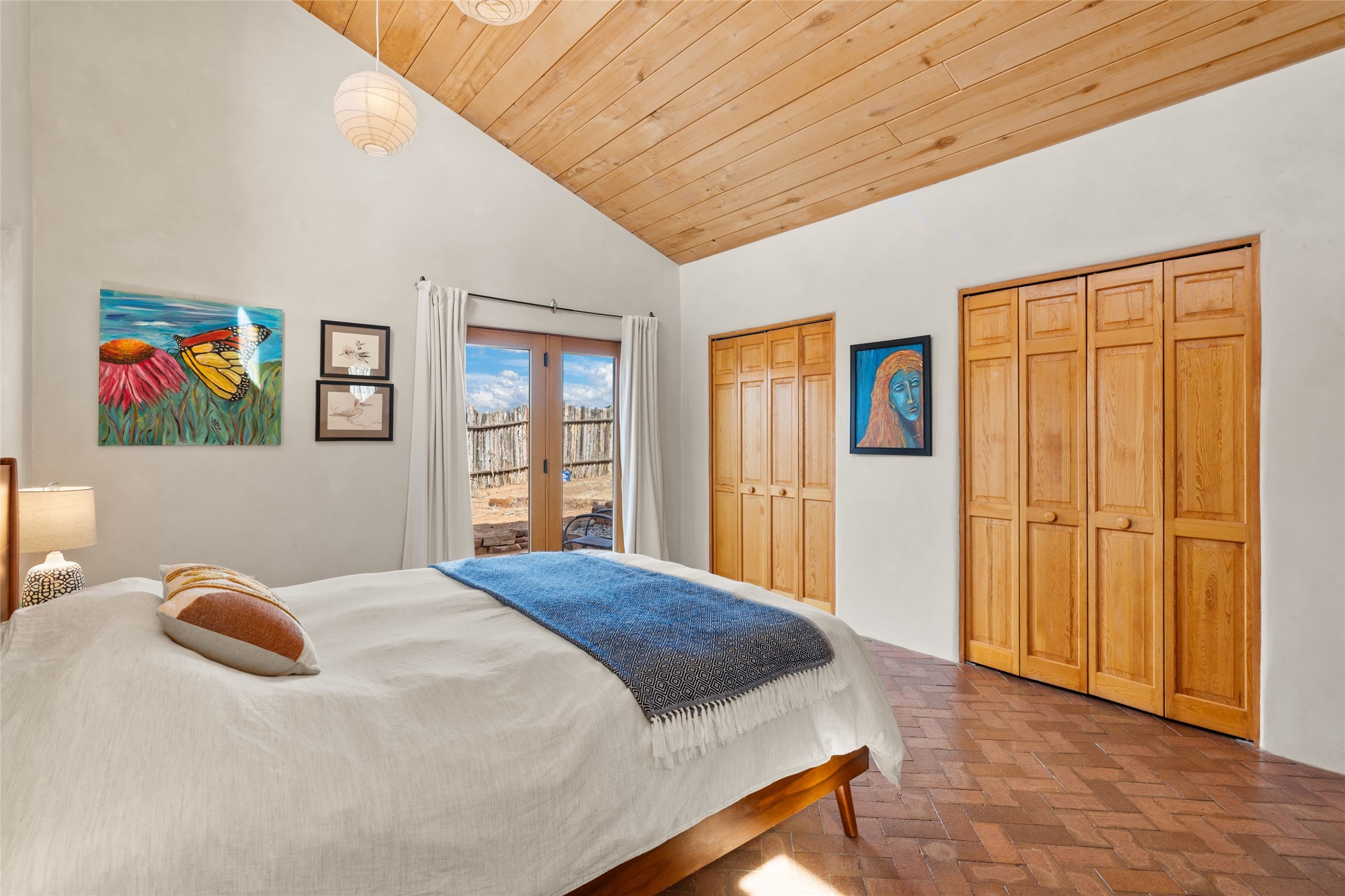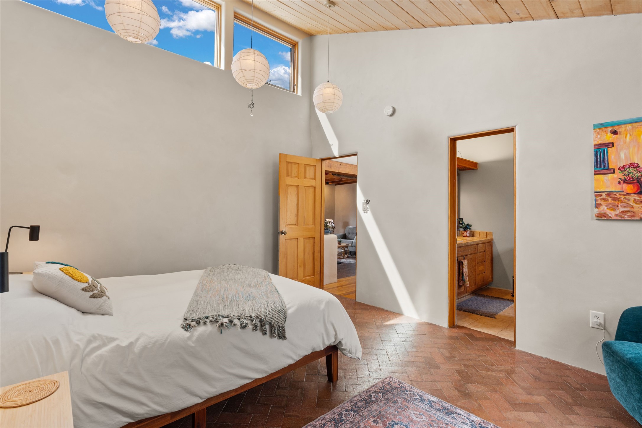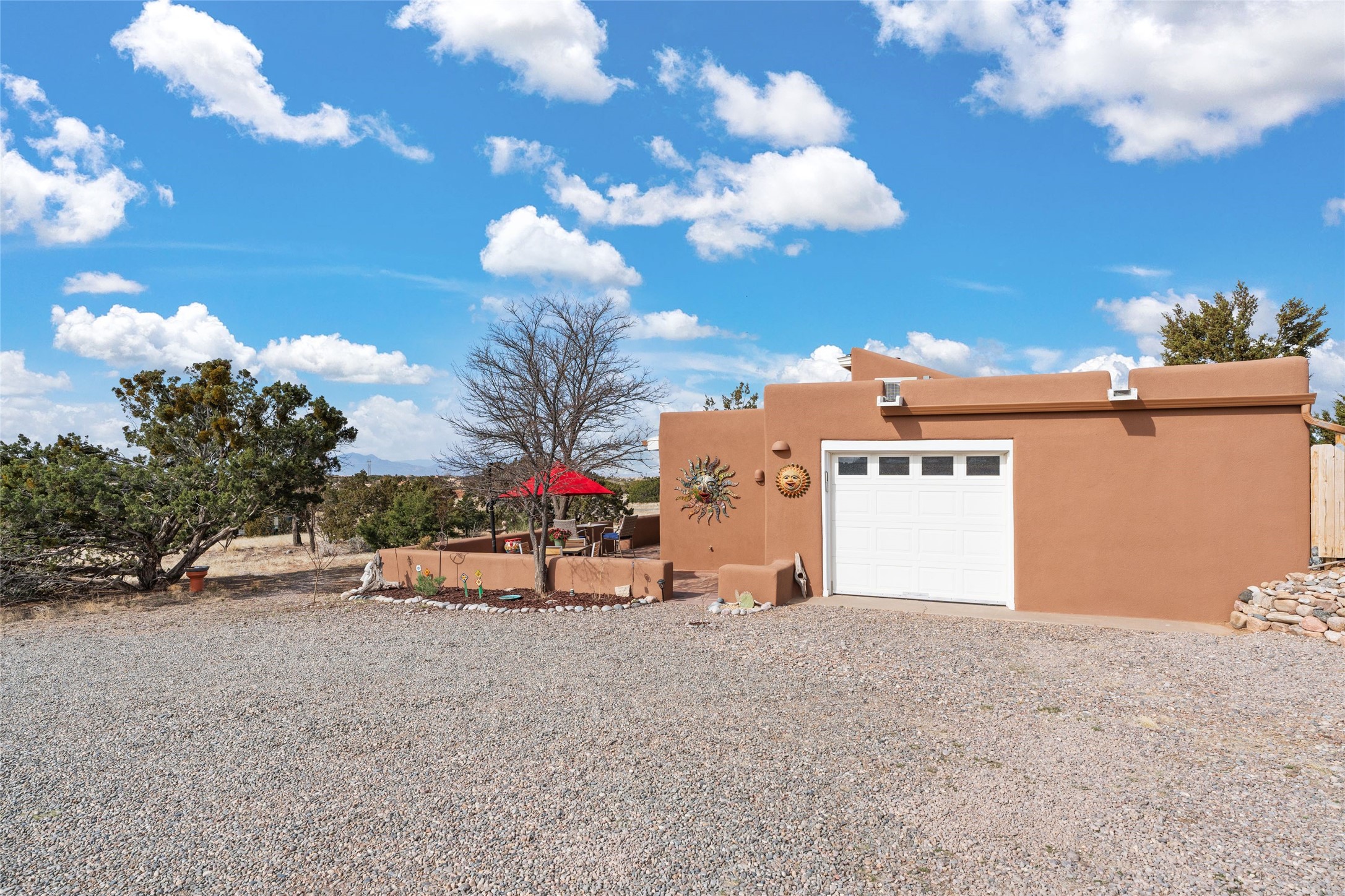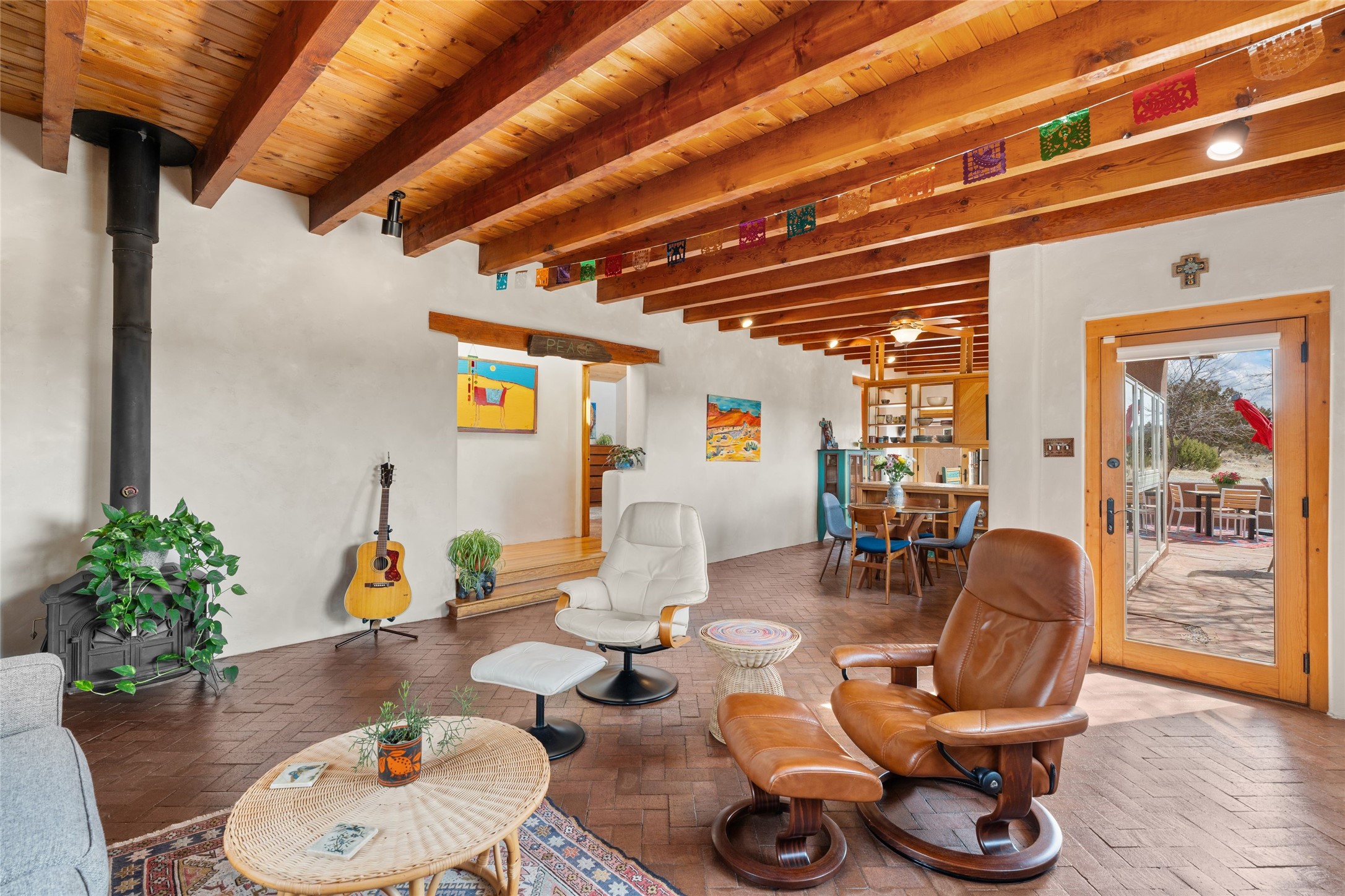 Happy, light and bright adobe designed by award-winning architect Beverley Spears and built by Rational Alternatives. This darling traditional passive solar home has trombe walls, deep window sills and charm galore! Bedrooms have vaulted, planked ceilings with clerestory windows. Mostly brick floors with some hardwood. Oversized heated one-car garage has studio/workshop space and a generous closet for storage. Three splits provide heating and air conditioning. Sited high on a cul-de-sac to maximize the wonderful mountain views. Two steps up to bedrooms. Walled front courtyard and generous and fully fenced backyard. NO CARPET. Radon mitigation in place. Super sweet and ready to go!