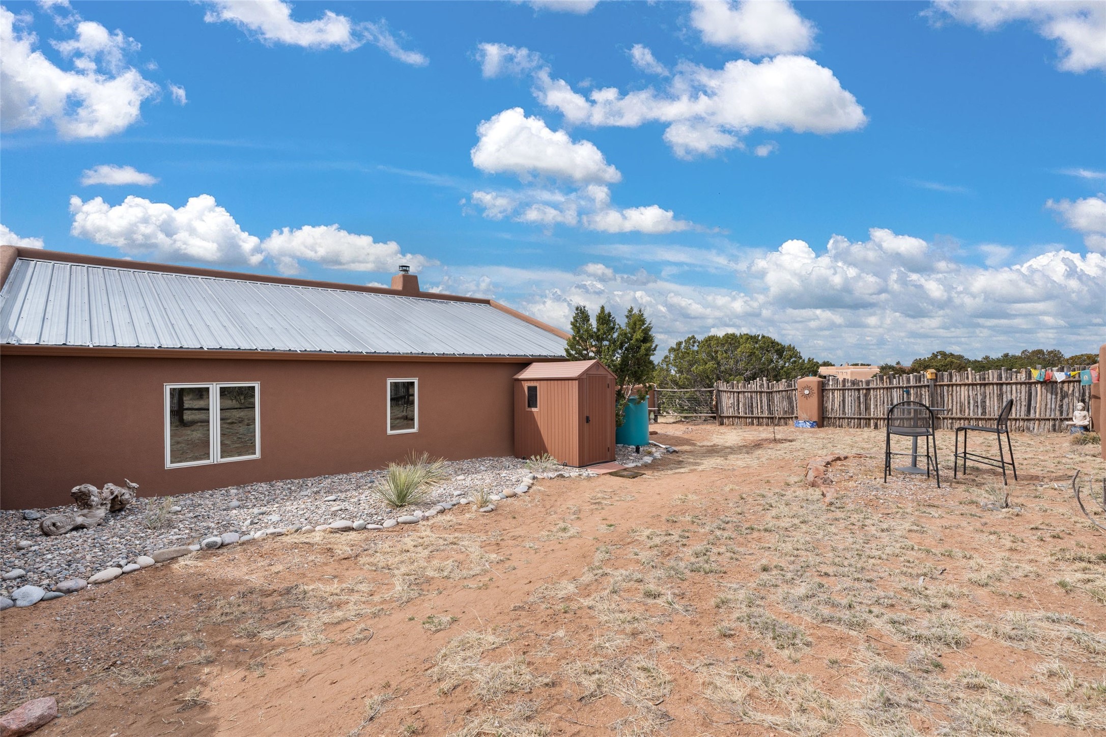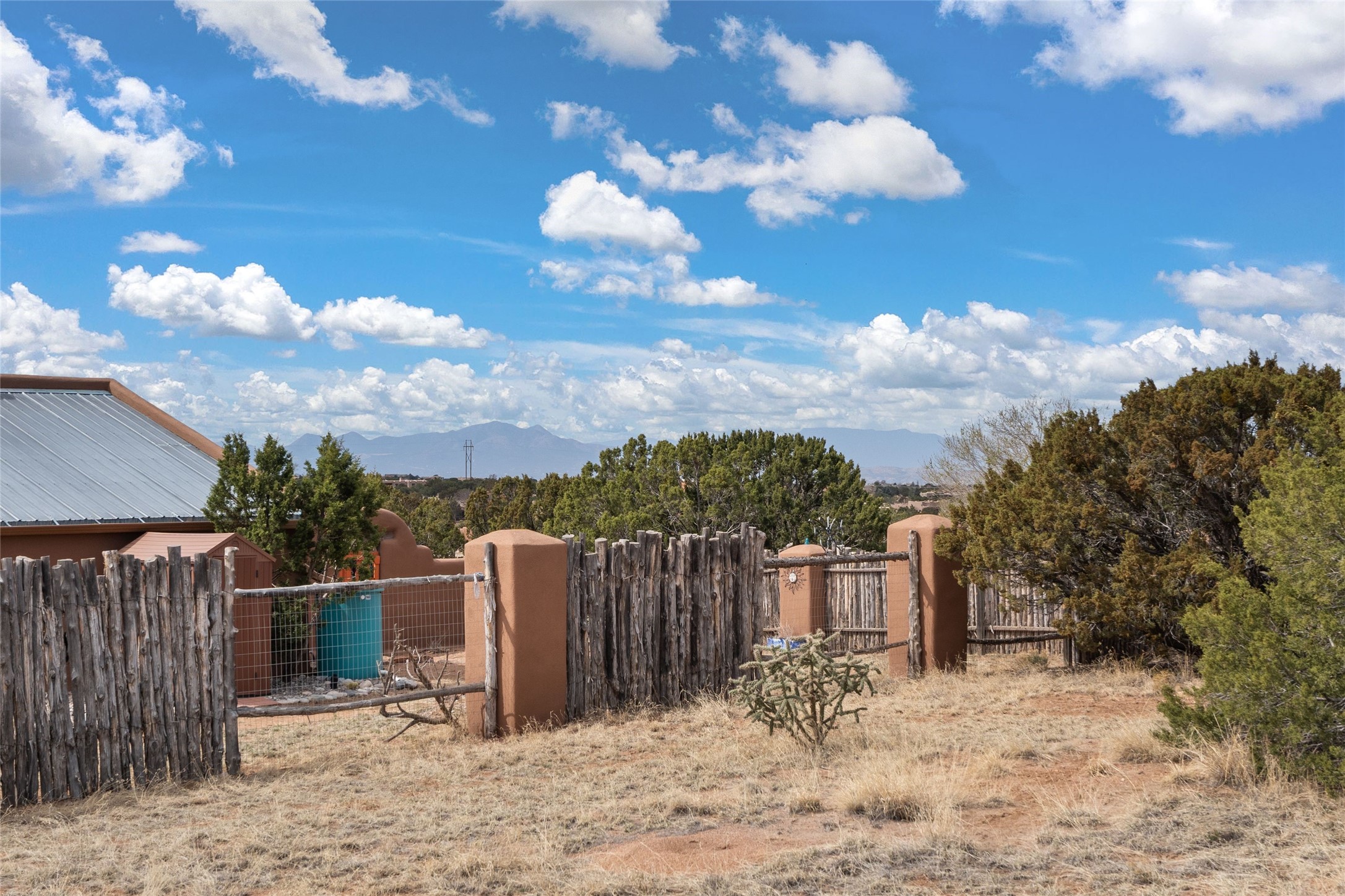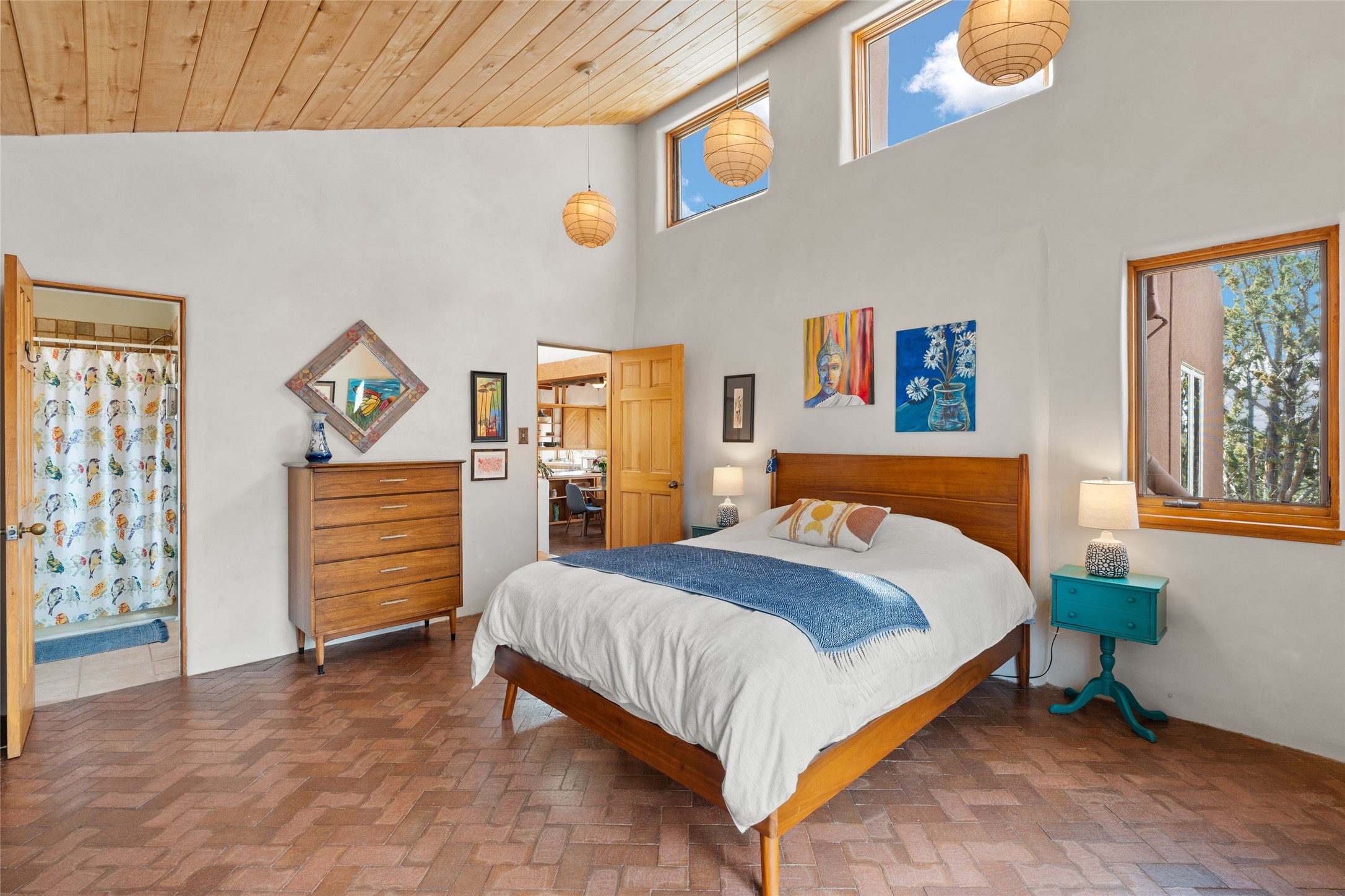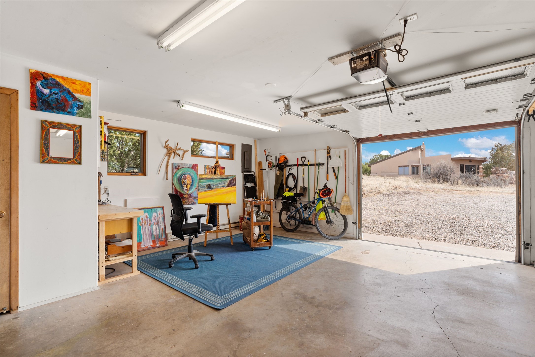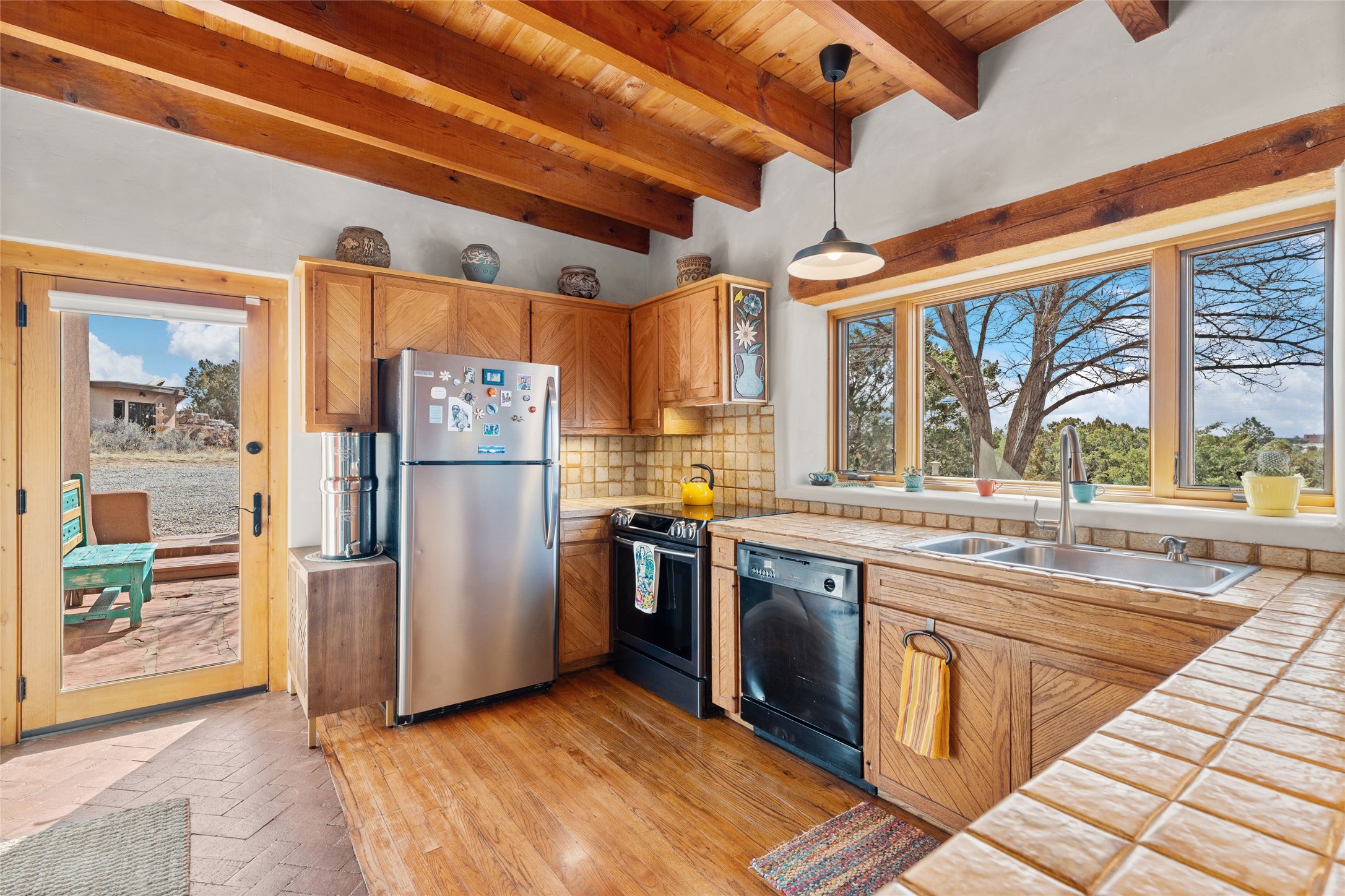 Happy, light and bright adobe designed by award-winning architect Beverley Spears and built by Rational Alternatives. This darling traditional passive solar home has trombe walls, deep window sills and charm galore! Bedrooms have vaulted, planked ceilings with clerestory windows. Mostly brick floors with some hardwood. Oversized heated one-car garage has studio/workshop space and a generous closet for storage. Three splits provide heating and air conditioning. Sited high on a cul-de-sac to maximize the wonderful mountain views. Two steps up to bedrooms. Walled front courtyard and generous and fully fenced backyard. NO CARPET. Radon mitigation in place. Super sweet and ready to go!