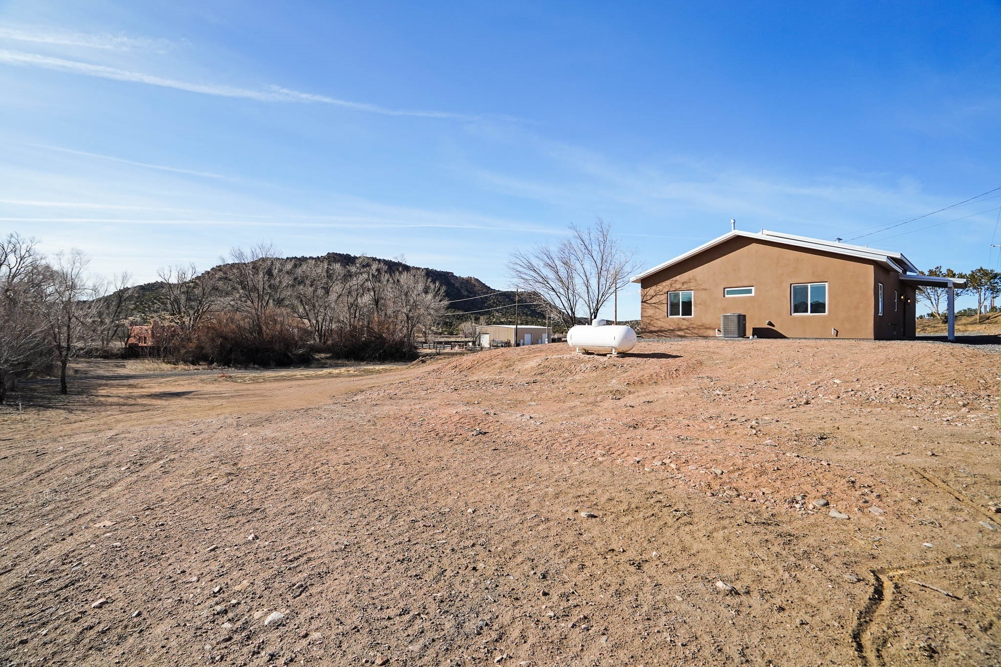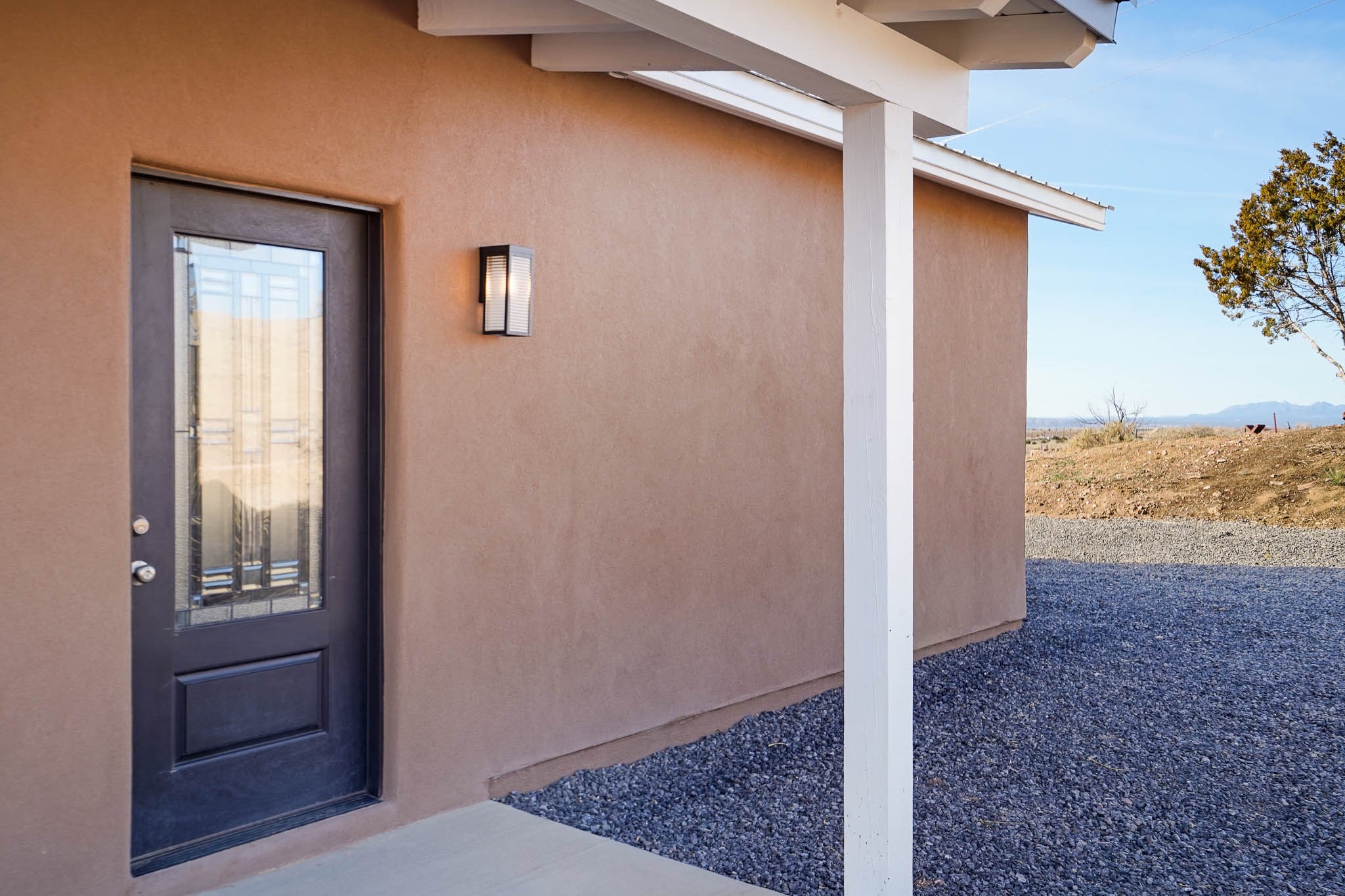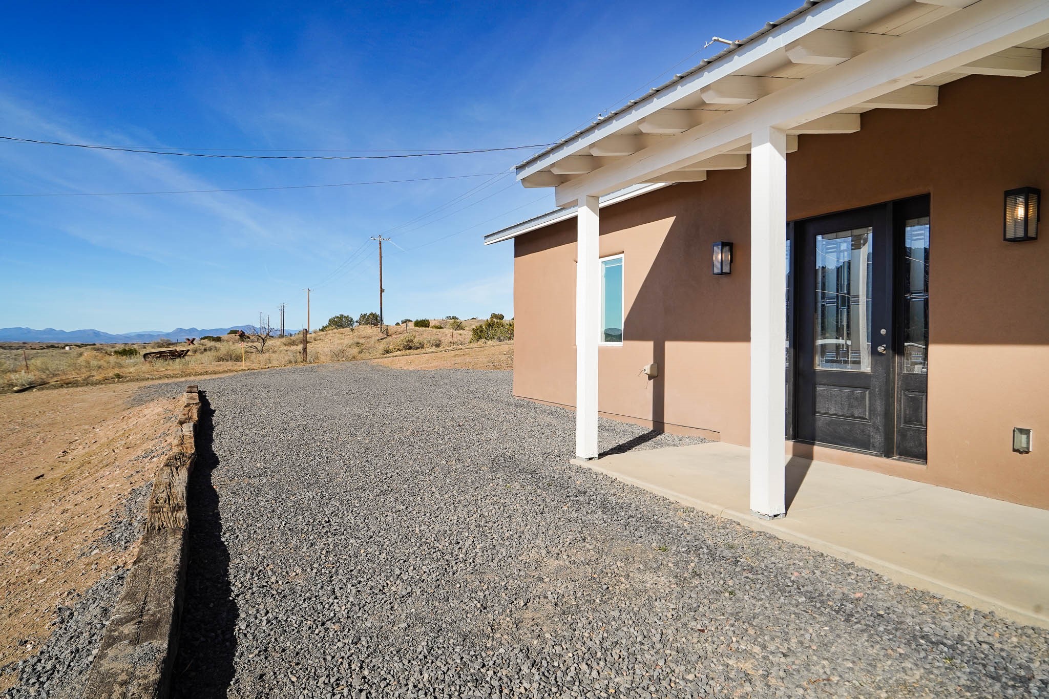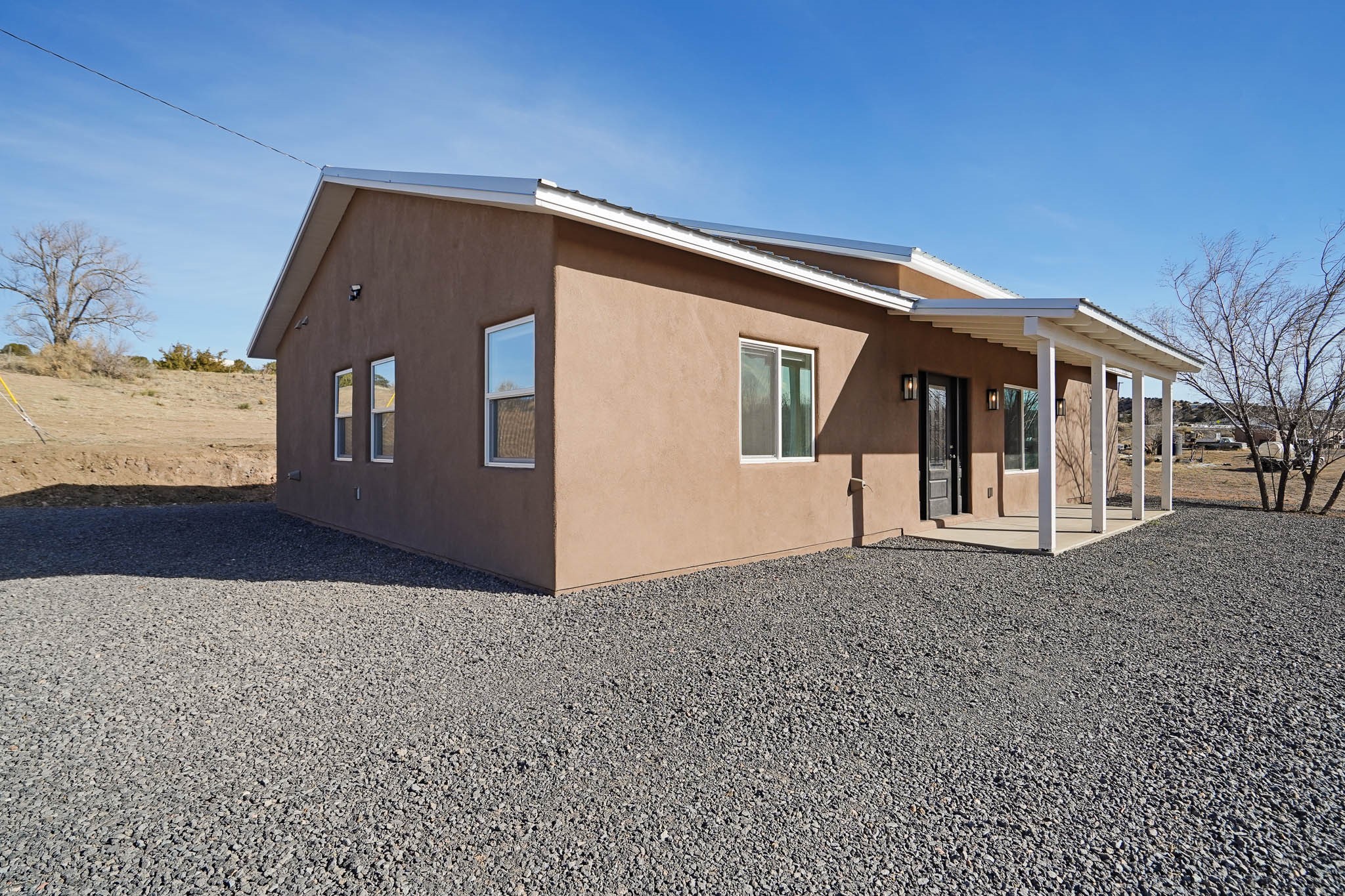 Come see this house, NOW BELOW APPRAISAL! Charming new construction home in Lamy, NM, set on 1.3 acres with 3 bedrooms and 2 bathrooms. This thoughtfully designed home boasts granite countertops tile floors throughout (no steps or carpet), and a pitched Propanel roof. The stained-glass front door with matching sidelights adds a beautiful touch of character. The property is horse-friendly, offering ample space for outdoor activities, gardening, or simply enjoying the serene surroundings. You also have the option of building a garage, horse facilities or studio on the property. With modern finishes and a peaceful setting, this home is the perfect retreat!