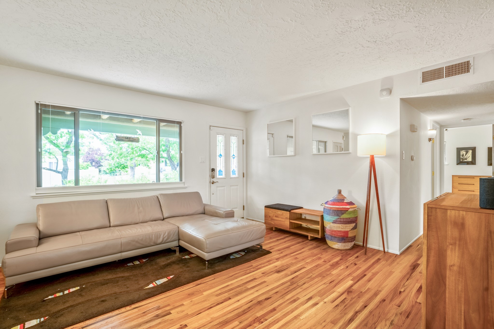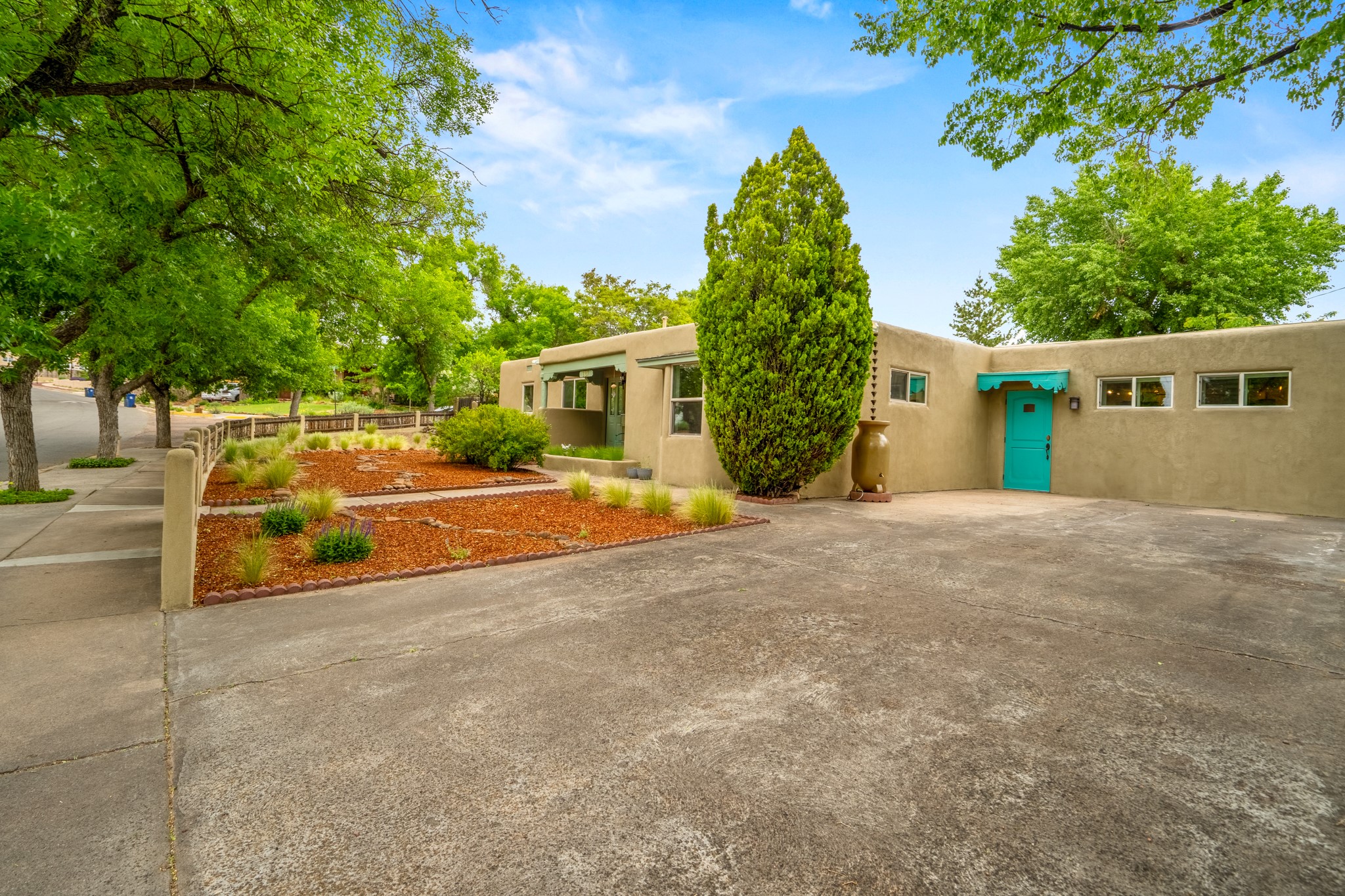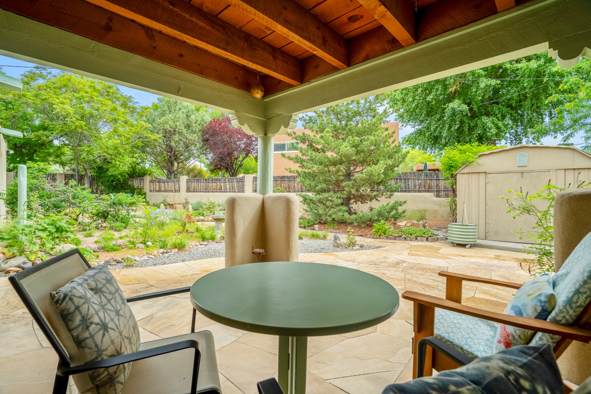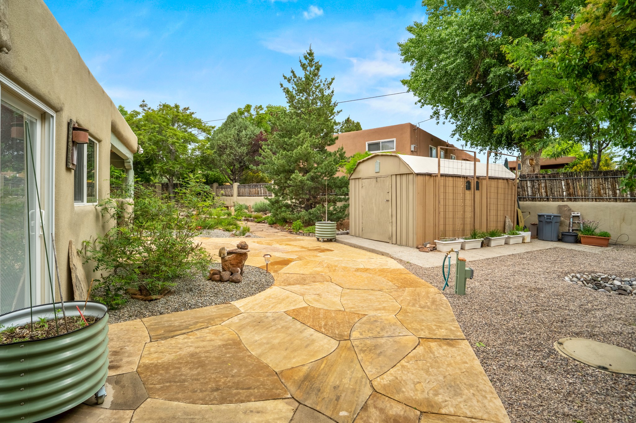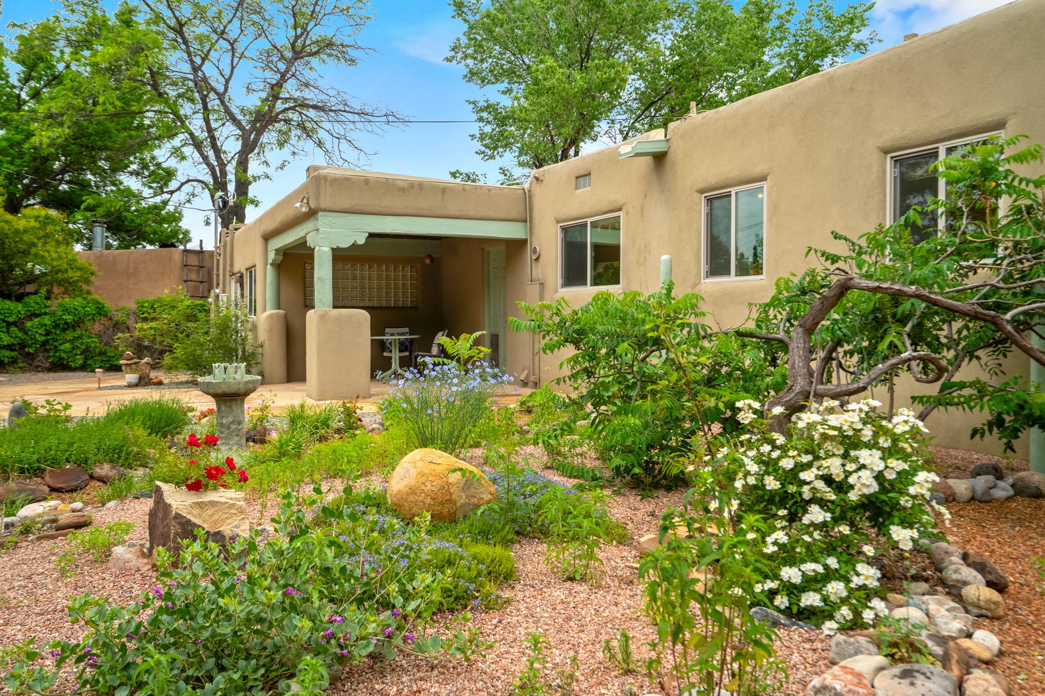 This charming Stamm home in Casa Solana offers a blend of classic character and modern updates, and is mere minutes from the Santa Fe Plaza. Beautifully cared for oak floors flow through thoughtfully updated interiors. There is also a brand-new TPO roof topped with owned and completely paid for solar panels. The bright living room features a cozy Kiva fireplace, and extends into a second living space with a beautiful bay window, creating a welcoming gathering space. The cheery kitchen features stainless steel appliances and a sunny dining nook for informal dining. The primary suite, tucked at the end of the hall, boasts a private bath, while a second bedroom and full bath are thoughtfully placed nearby. There is a soundproof music studio on the other end of the home with it's own private entrance that can easily transform into a third bedroom or office. Situated on an oversized corner lot with lush landscaping watered by an underground rainwater tank, this home is move-in ready, full of warmth and perfectly balanced for comfort and style.