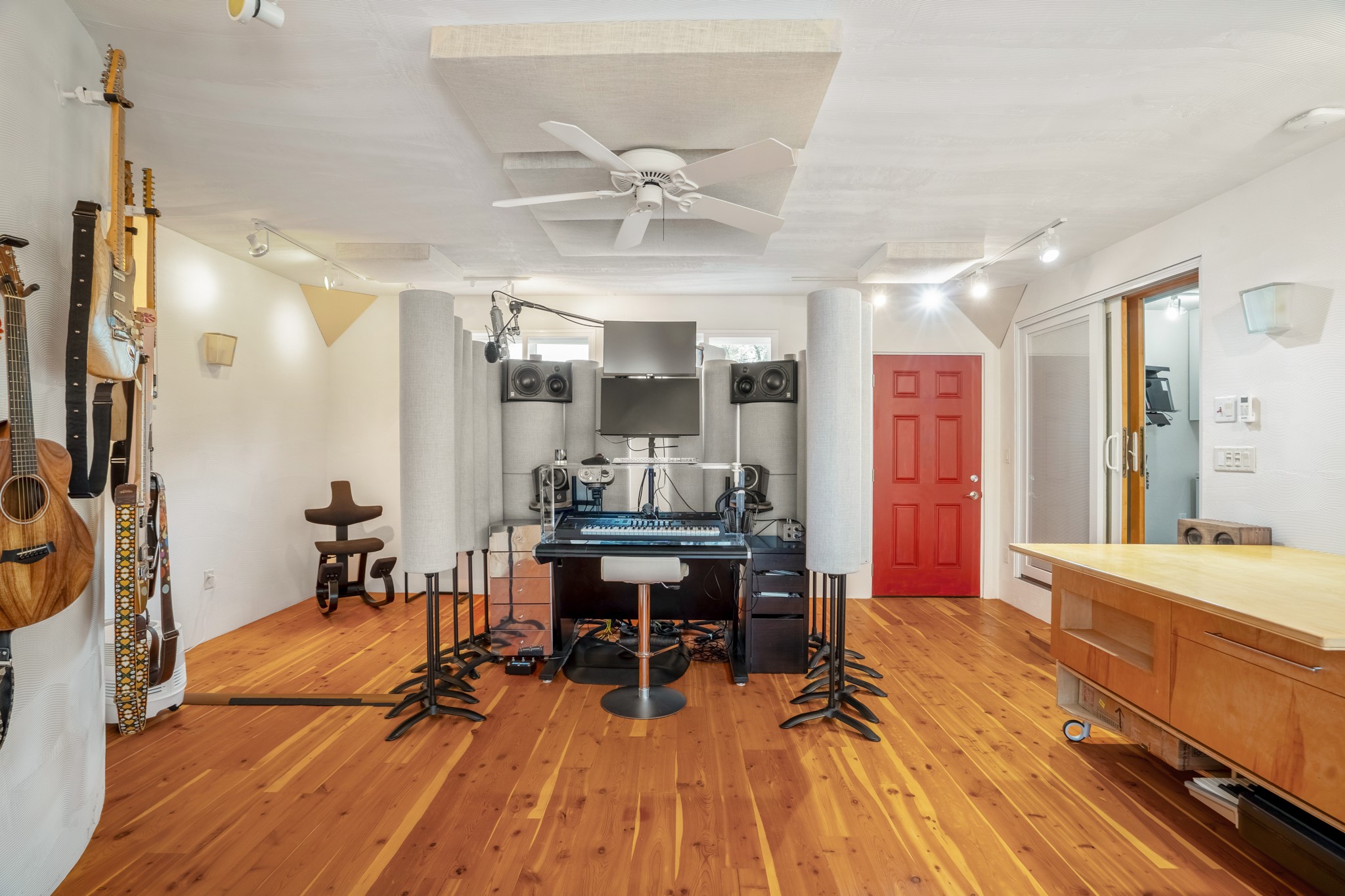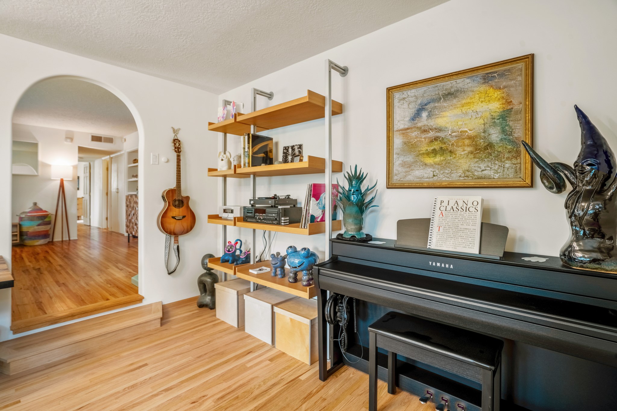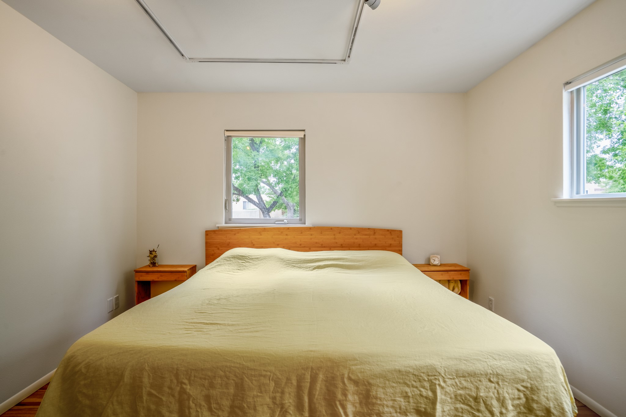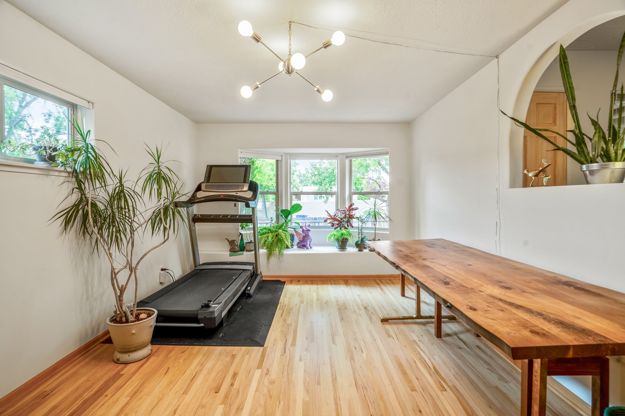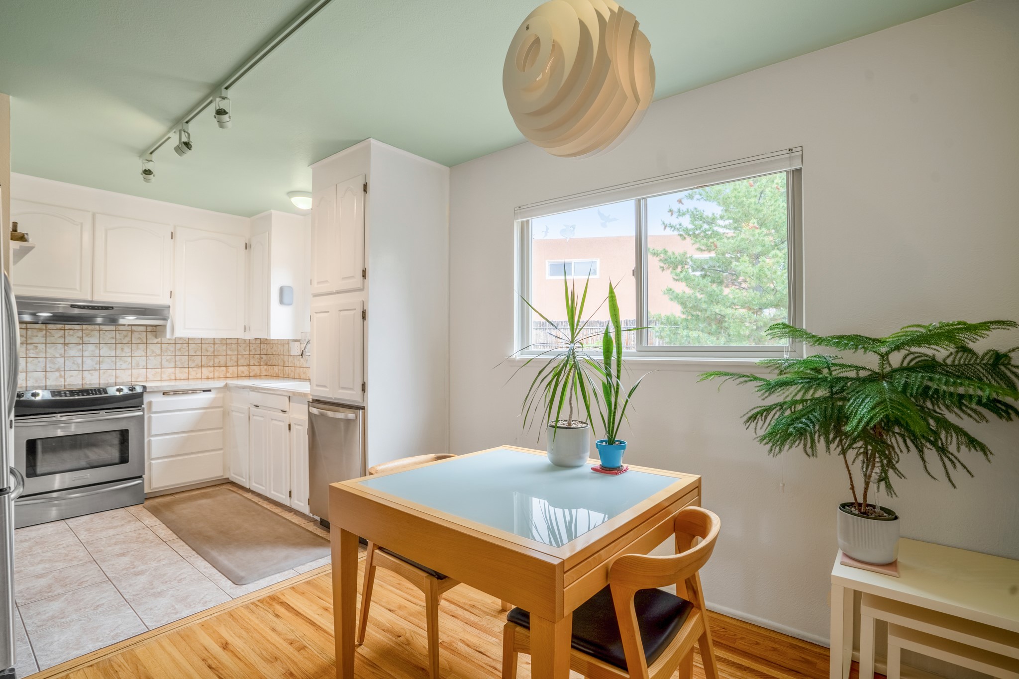 This charming Stamm home in Casa Solana offers a blend of classic character and modern updates, and is mere minutes from the Santa Fe Plaza. Beautifully cared for oak floors flow through thoughtfully updated interiors. There is also a brand-new TPO roof topped with owned and completely paid for solar panels. The bright living room features a cozy Kiva fireplace, and extends into a second living space with a beautiful bay window, creating a welcoming gathering space. The cheery kitchen features stainless steel appliances and a sunny dining nook for informal dining. The primary suite, tucked at the end of the hall, boasts a private bath, while a second bedroom and full bath are thoughtfully placed nearby. There is a soundproof music studio on the other end of the home with it's own private entrance that can easily transform into a third bedroom or office. Situated on an oversized corner lot with lush landscaping watered by an underground rainwater tank, this home is move-in ready, full of warmth and perfectly balanced for comfort and style.