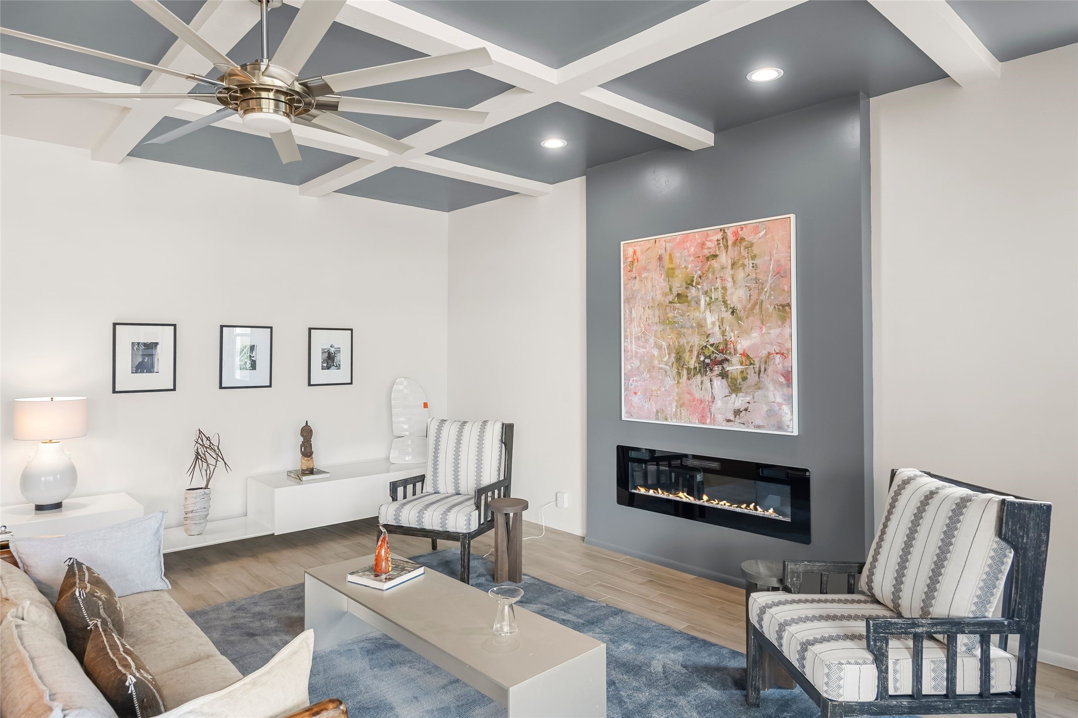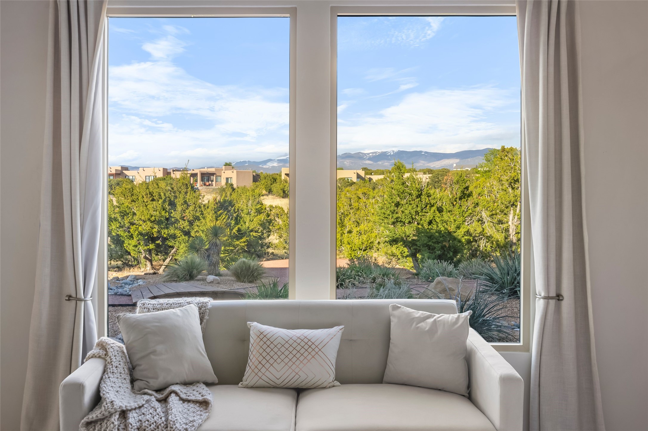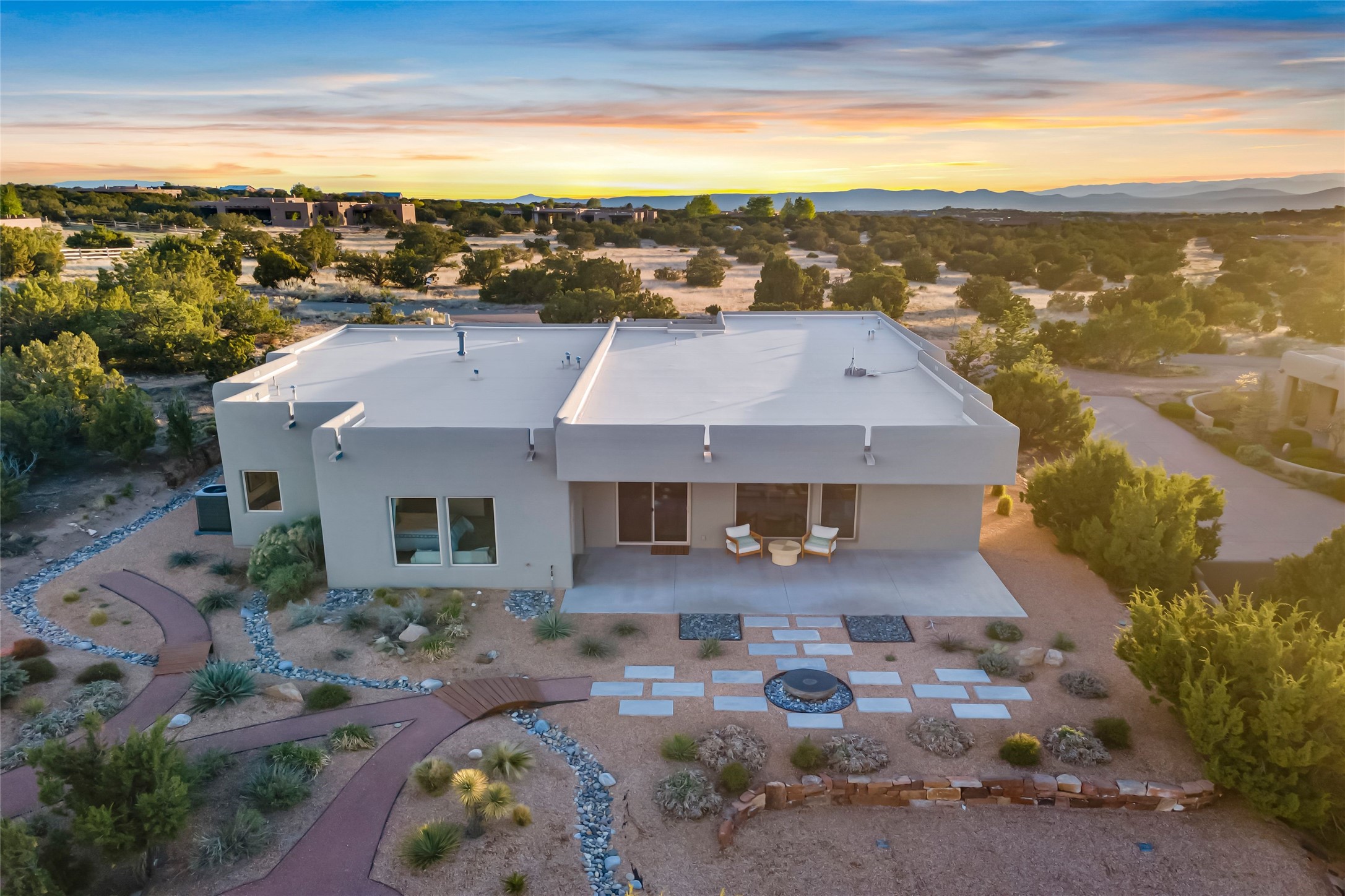 Welcome to 14 Plano Arbolito--where sleek contemporary design meets the serene beauty of Santa Fe's natural landscape. Perched on a half acre in the desirable Tano West neighborhood, this recently built, single-level home offers the perfect balance of luxury, comfort, and breathtaking views. This three-bedroom, three-bathroom residence boasts an open-concept floorplan designed for effortless living and entertaining. The expansive great room features soaring ceilings, a modern electric ambiance fireplace, and floor-to-ceiling windows that frame spectacular views of the Sangre de Cristo Mountains. The adjacent chef's kitchen is equipped with premium stainless-steel appliances, a generous island with counter seating, a walk-in pantry, and elegant finishes that blend form and function. Retreat to a tranquil owner's suite complete with outdoor access, a spa-like bathroom with a soaking tub, dual vanities, a spacious shower, and two oversized walk-in closets--one currently used as an office or yoga space. A separate guest wing includes two private bedrooms, one with its own entrance and en suite bath, perfect for visitors or extended stays. Step outside to a deep-covered portal with gas fireplace hookups and a custom fountain, ideal for enjoying Santa Fe's vivid sunsets and star-filled nights. The fully landscaped, xeriscape backyard opens to panoramic vistas and unmatched privacy. Additional highlights include an oversized three-car garage, a flexible bonus room off the entry, and many thoughtful upgrades--from whole-house air purification to premium lighting and smart home features. Only 20 minutes from the Plaza and nestled within a community known for its protected open space, 14 Plano Arbolito offers peace, luxury, and a front-row seat to Santa Fe's majestic beauty.