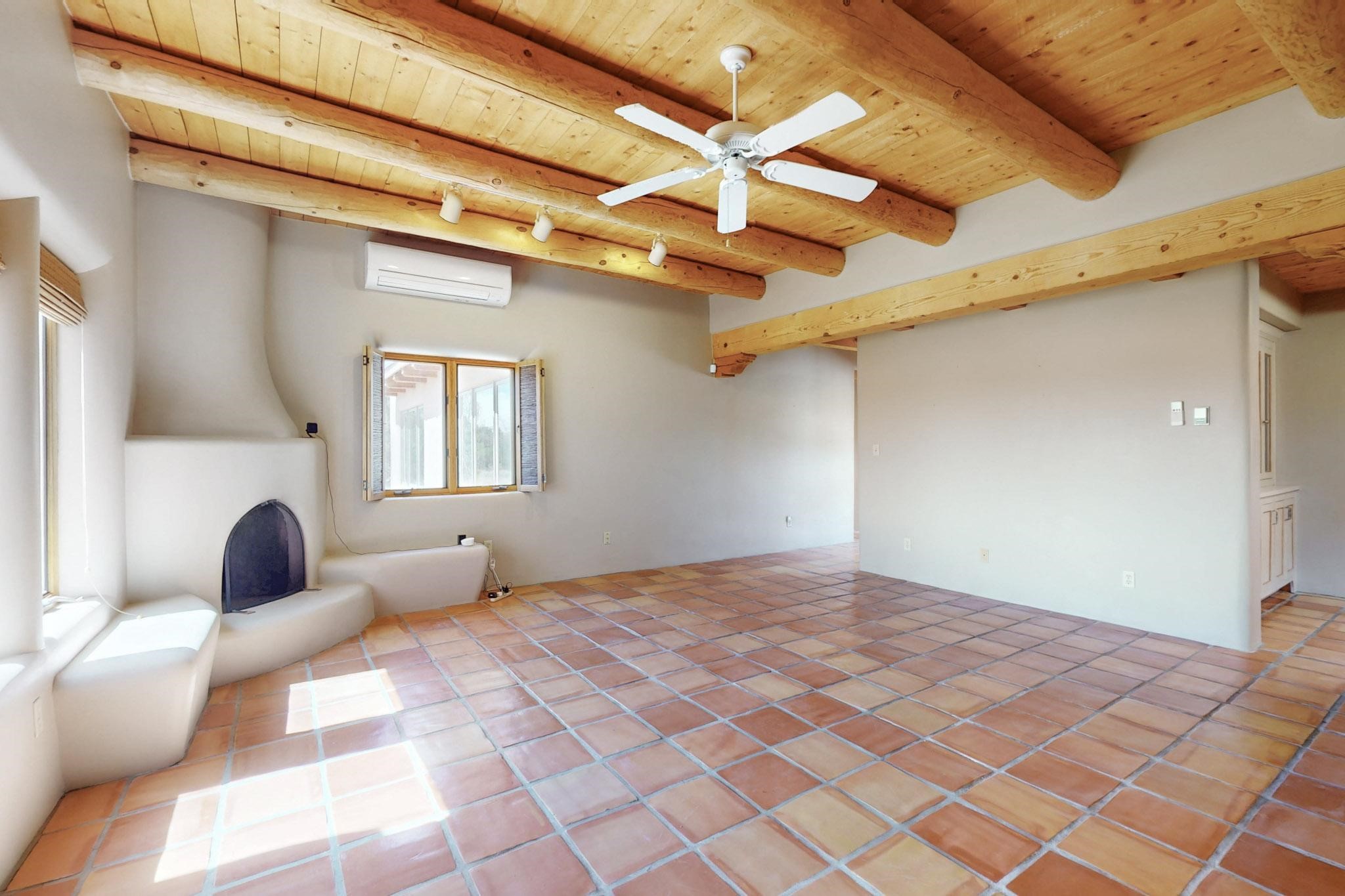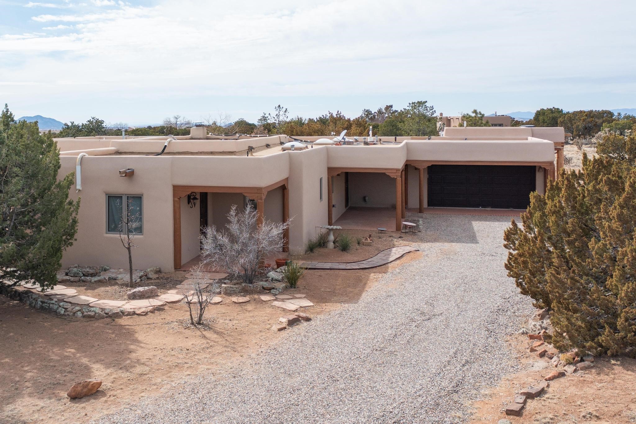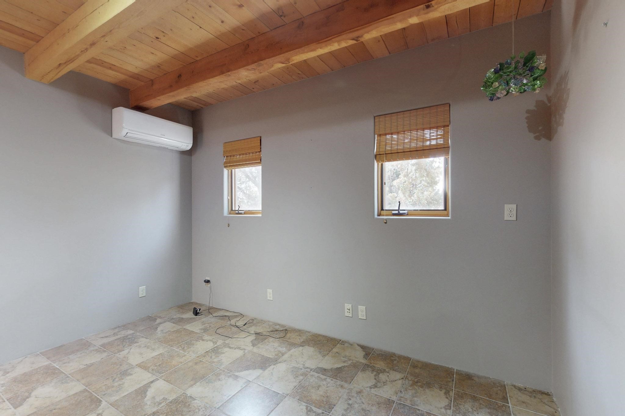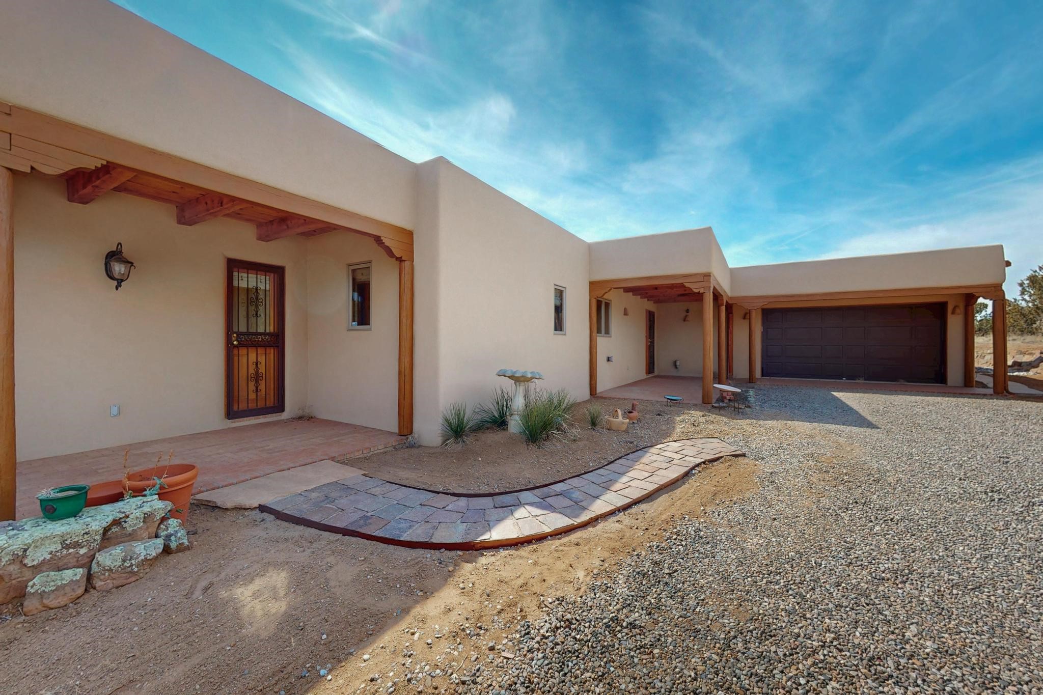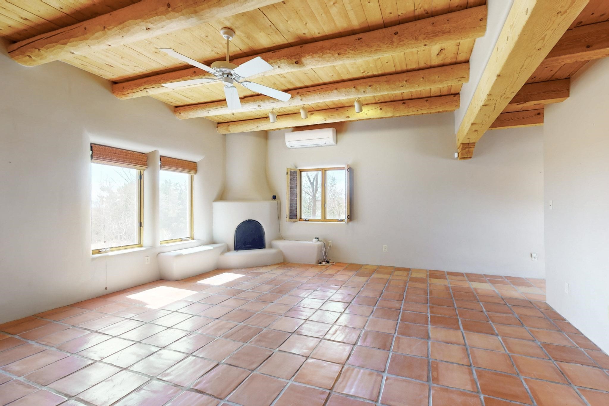 Set back from the road for privacy, this beautifully built adobe home by Shaylube Construction offers multiple access points and versatile outdoor spaces. Designed with thoughtful detail, it begins with a welcoming entrance room ideal for drinking morning coffee or greeting guests, flowing seamlessly into a charming living area with a traditional kiva fireplace. The dining room is conveniently located between the entrance and living room, creating an easy flow for entertaining. The kitchen boasts exceptional storage with multiple lazy-susan cupboards and a built-in China cabinet. The spacious primary bedroom features its own kiva fireplace, creating a warm, inviting retreat. Two additional bedrooms offer flexibility, along with a possible third bedroom or office with a secure, locking storage closet--perfect for valuables or private archives. At the rear of the home, accessed via an exterior walkway, a private office with custom built bookshelves and rich wood flooring provides a peaceful workspace. This well-maintained home comes with significant recent upgrades: Completely re-roofed in 2018 with warranty through 2028; New furnace and tankless water heater 2015; Updated mini-split systems 2024; New refrigerator 2023. Includes mountain views, multiple patios and garden spaces, and a flexible floor plan that allows for independence and coexistence under one roof.