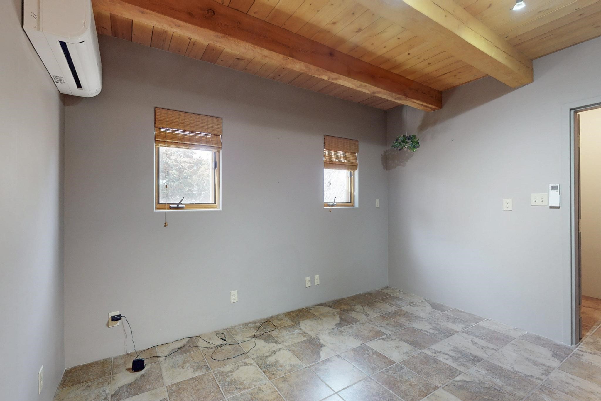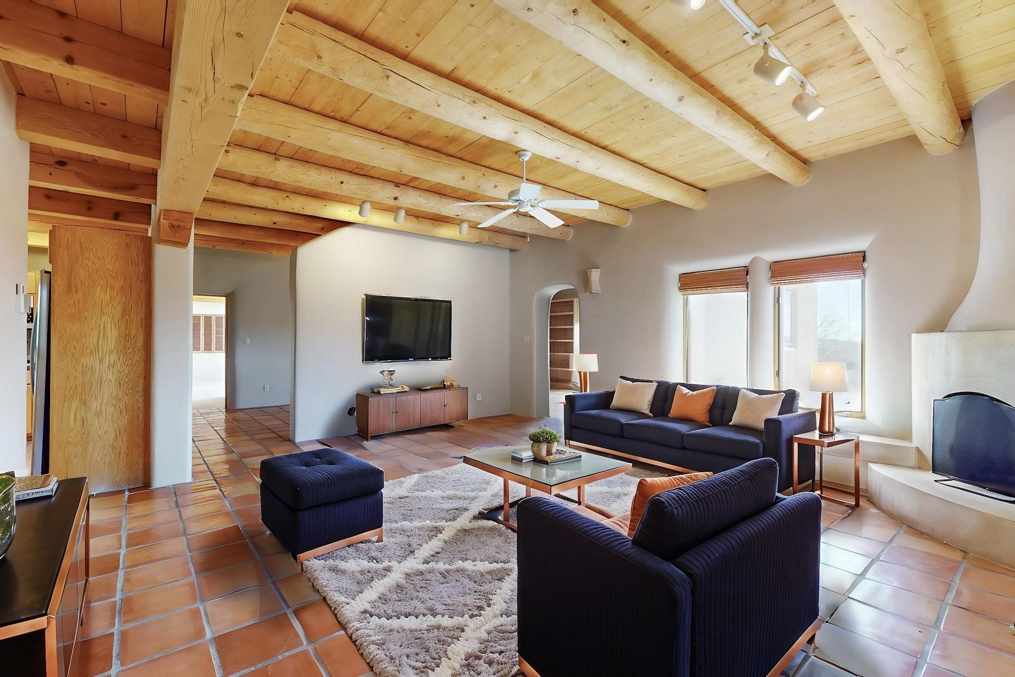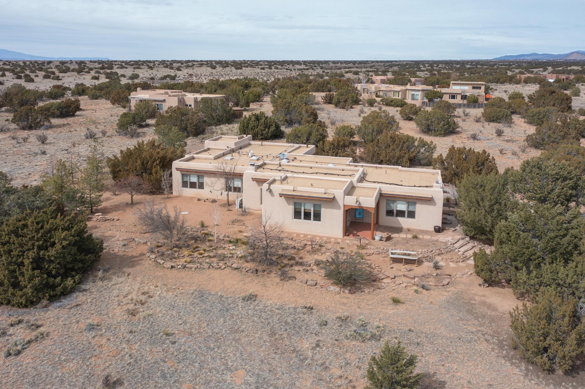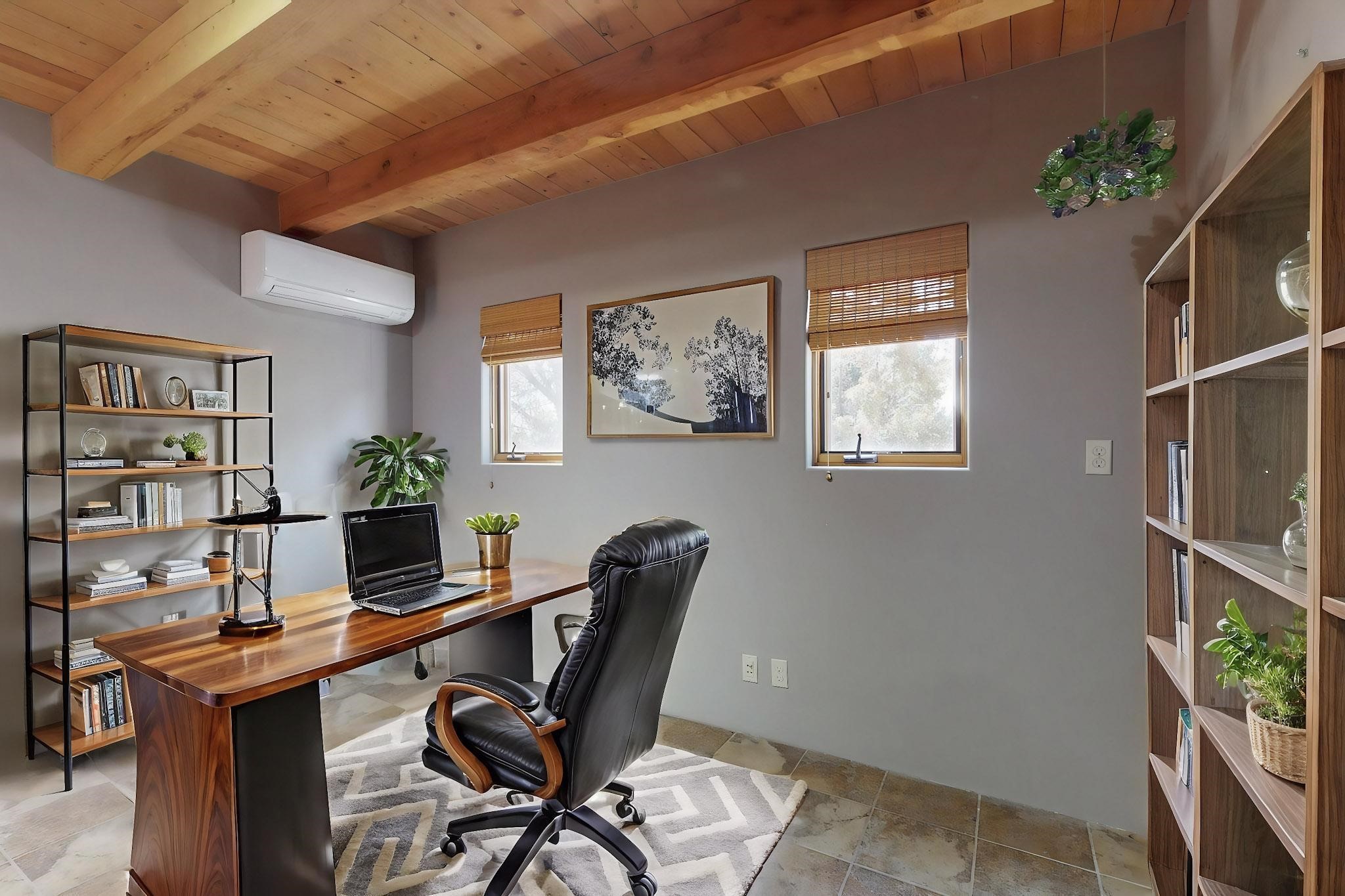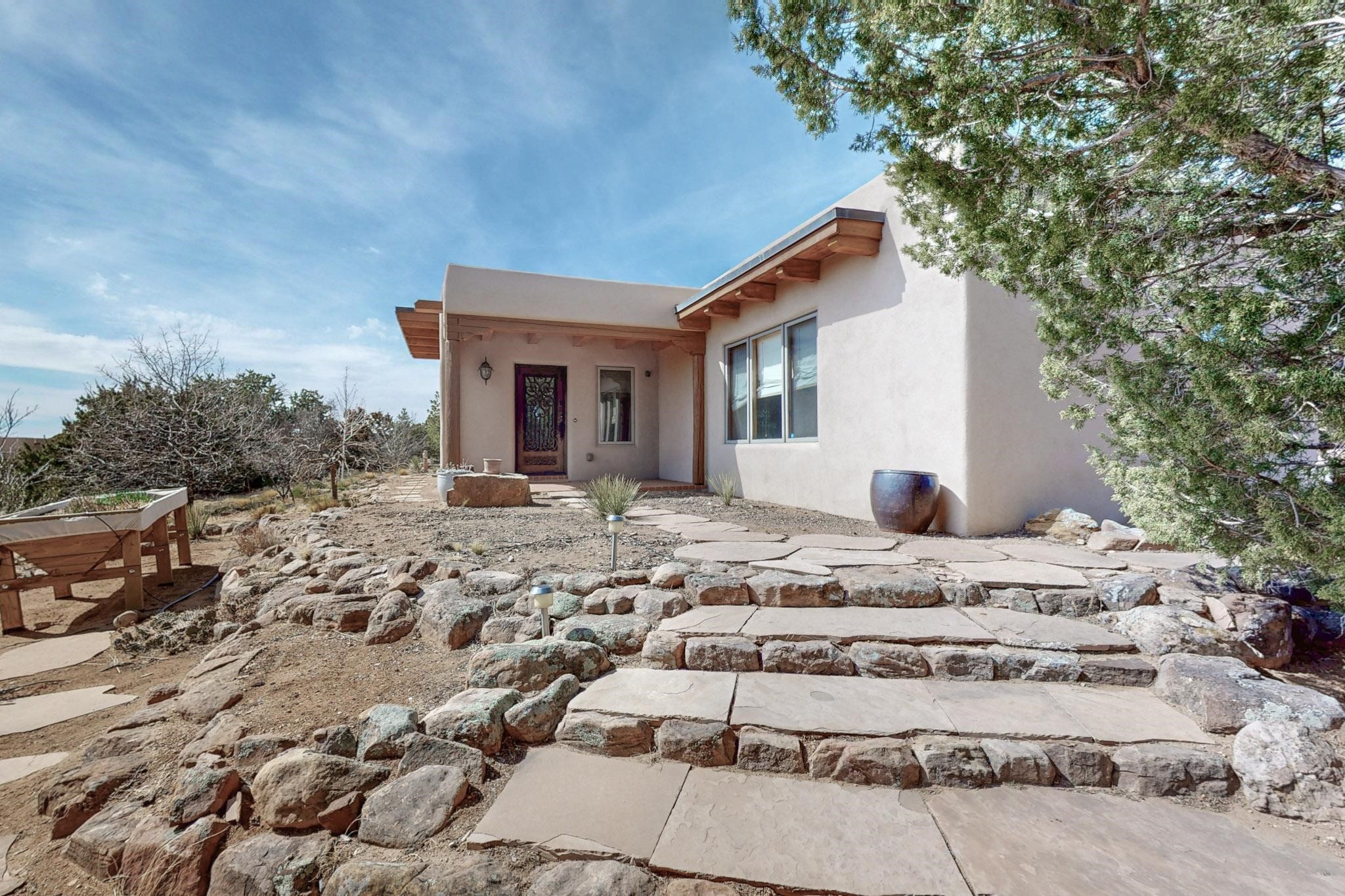 Set back from the road for privacy, this beautifully built adobe home by Shaylube Construction offers multiple access points and versatile outdoor spaces. Designed with thoughtful detail, it begins with a welcoming entrance room ideal for drinking morning coffee or greeting guests, flowing seamlessly into a charming living area with a traditional kiva fireplace. The dining room is conveniently located between the entrance and living room, creating an easy flow for entertaining. The kitchen boasts exceptional storage with multiple lazy-susan cupboards and a built-in China cabinet. The spacious primary bedroom features its own kiva fireplace, creating a warm, inviting retreat. Two additional bedrooms offer flexibility, along with a possible third bedroom or office with a secure, locking storage closet--perfect for valuables or private archives. At the rear of the home, accessed via an exterior walkway, a private office with custom built bookshelves and rich wood flooring provides a peaceful workspace. This well-maintained home comes with significant recent upgrades: Completely re-roofed in 2018 with warranty through 2028; New furnace and tankless water heater 2015; Updated mini-split systems 2024; New refrigerator 2023. Includes mountain views, multiple patios and garden spaces, and a flexible floor plan that allows for independence and coexistence under one roof.