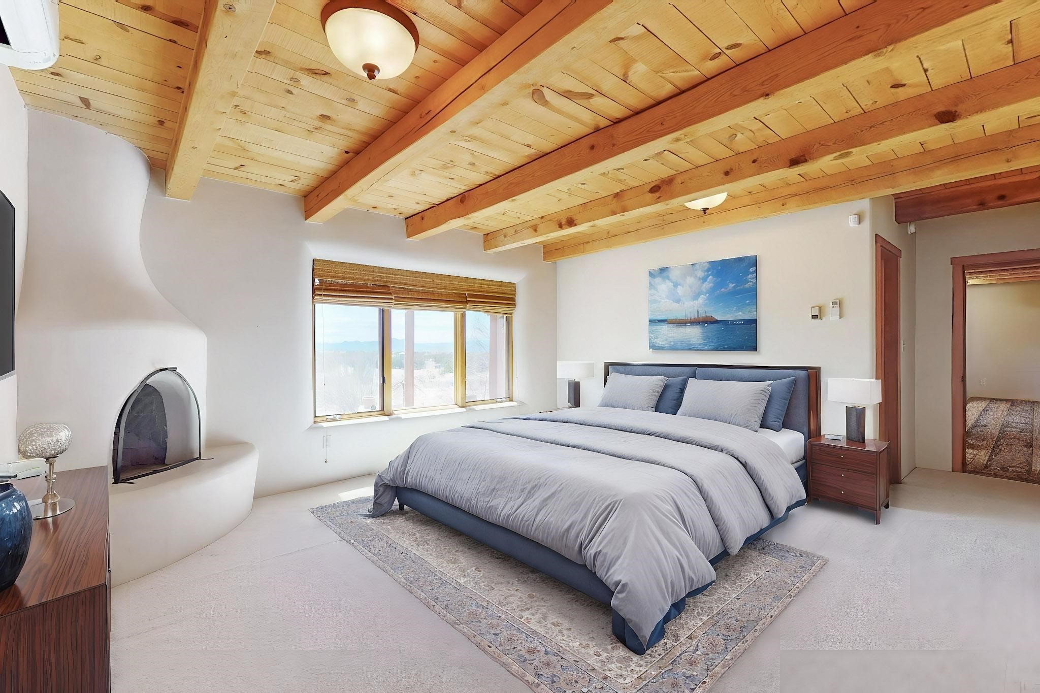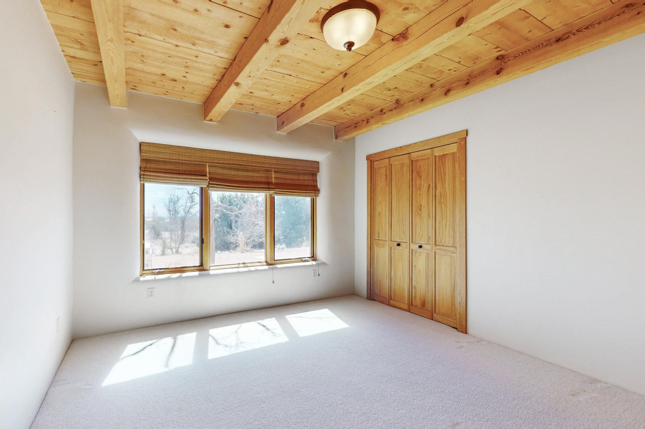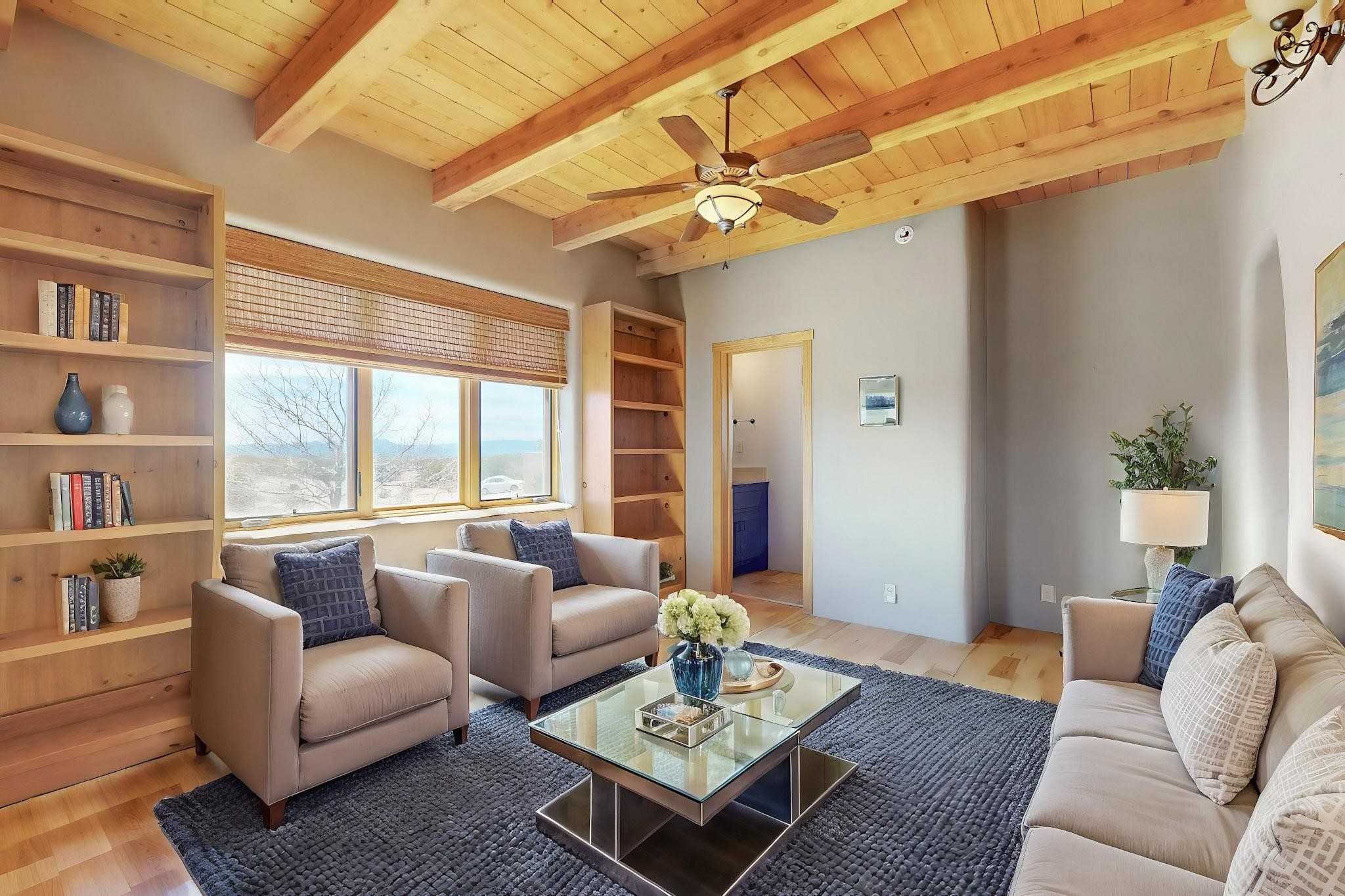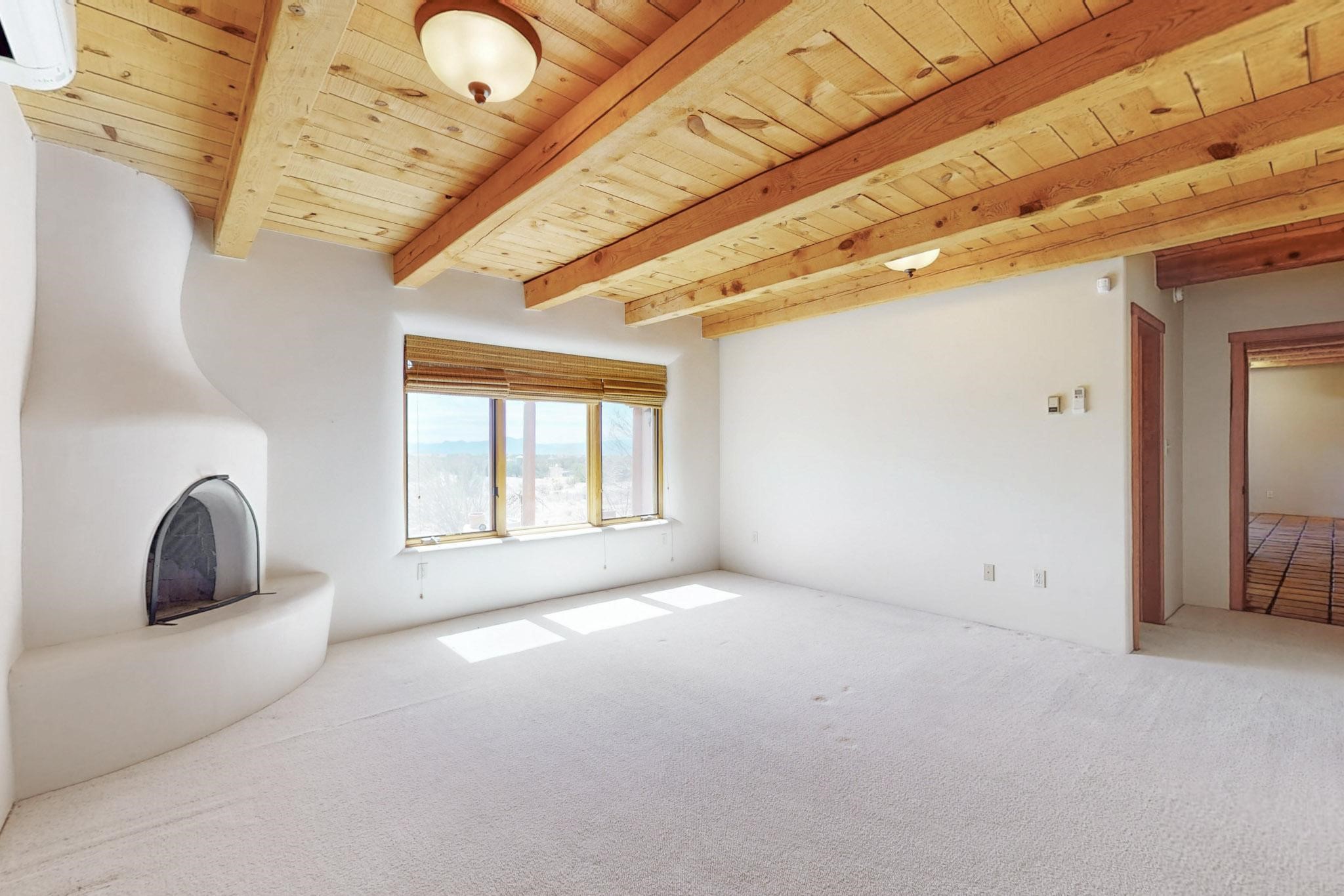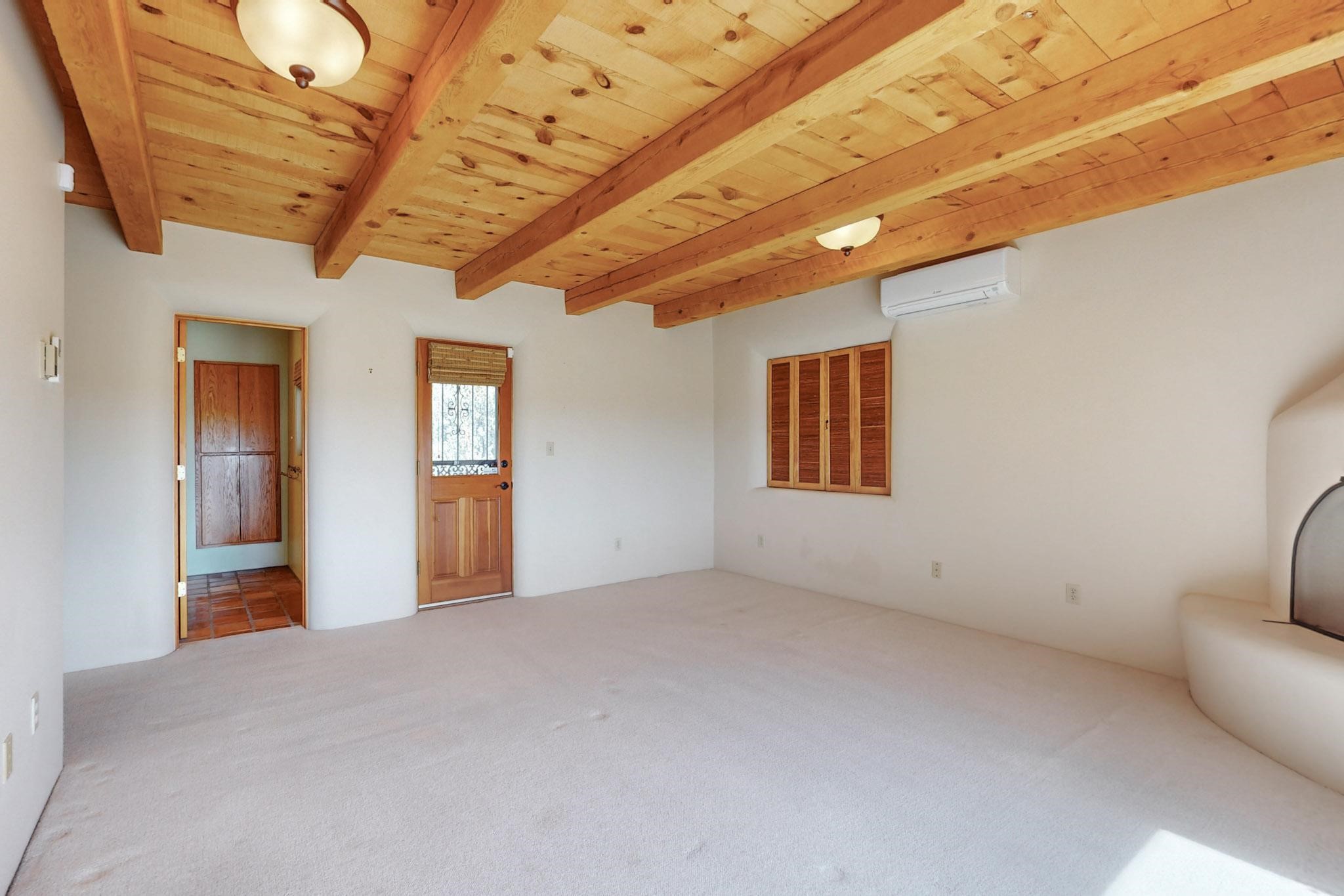 Set back from the road for privacy, this beautifully built adobe home by Shaylube Construction offers multiple access points and versatile outdoor spaces. Designed with thoughtful detail, it begins with a welcoming entrance room ideal for drinking morning coffee or greeting guests, flowing seamlessly into a charming living area with a traditional kiva fireplace. The dining room is conveniently located between the entrance and living room, creating an easy flow for entertaining. The kitchen boasts exceptional storage with multiple lazy-susan cupboards and a built-in China cabinet. The spacious primary bedroom features its own kiva fireplace, creating a warm, inviting retreat. Two additional bedrooms offer flexibility, along with a possible third bedroom or office with a secure, locking storage closet--perfect for valuables or private archives. At the rear of the home, accessed via an exterior walkway, a private office with custom built bookshelves and rich wood flooring provides a peaceful workspace. This well-maintained home comes with significant recent upgrades: Completely re-roofed in 2018 with warranty through 2028; New furnace and tankless water heater 2015; Updated mini-split systems 2024; New refrigerator 2023. Includes mountain views, multiple patios and garden spaces, and a flexible floor plan that allows for independence and coexistence under one roof.