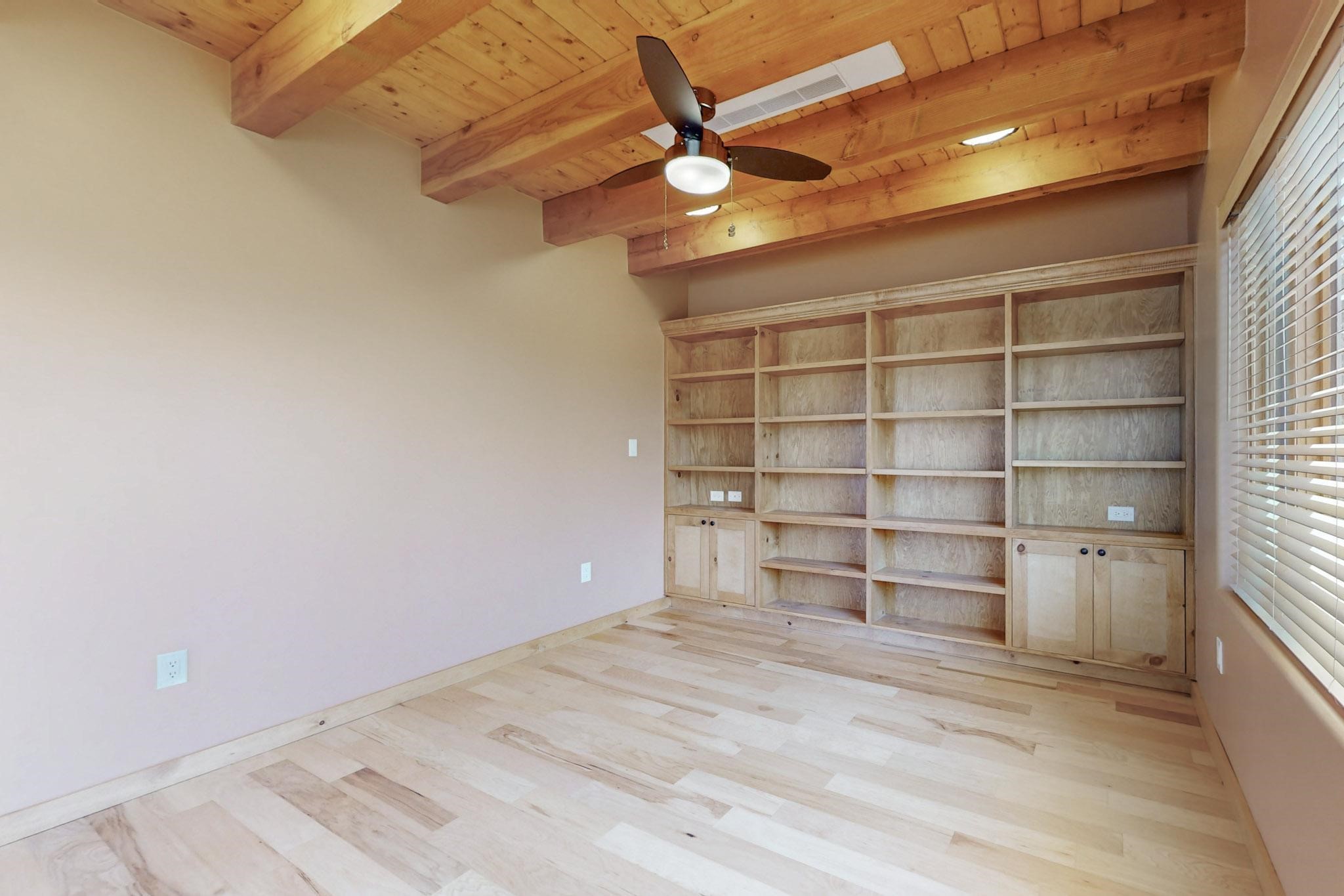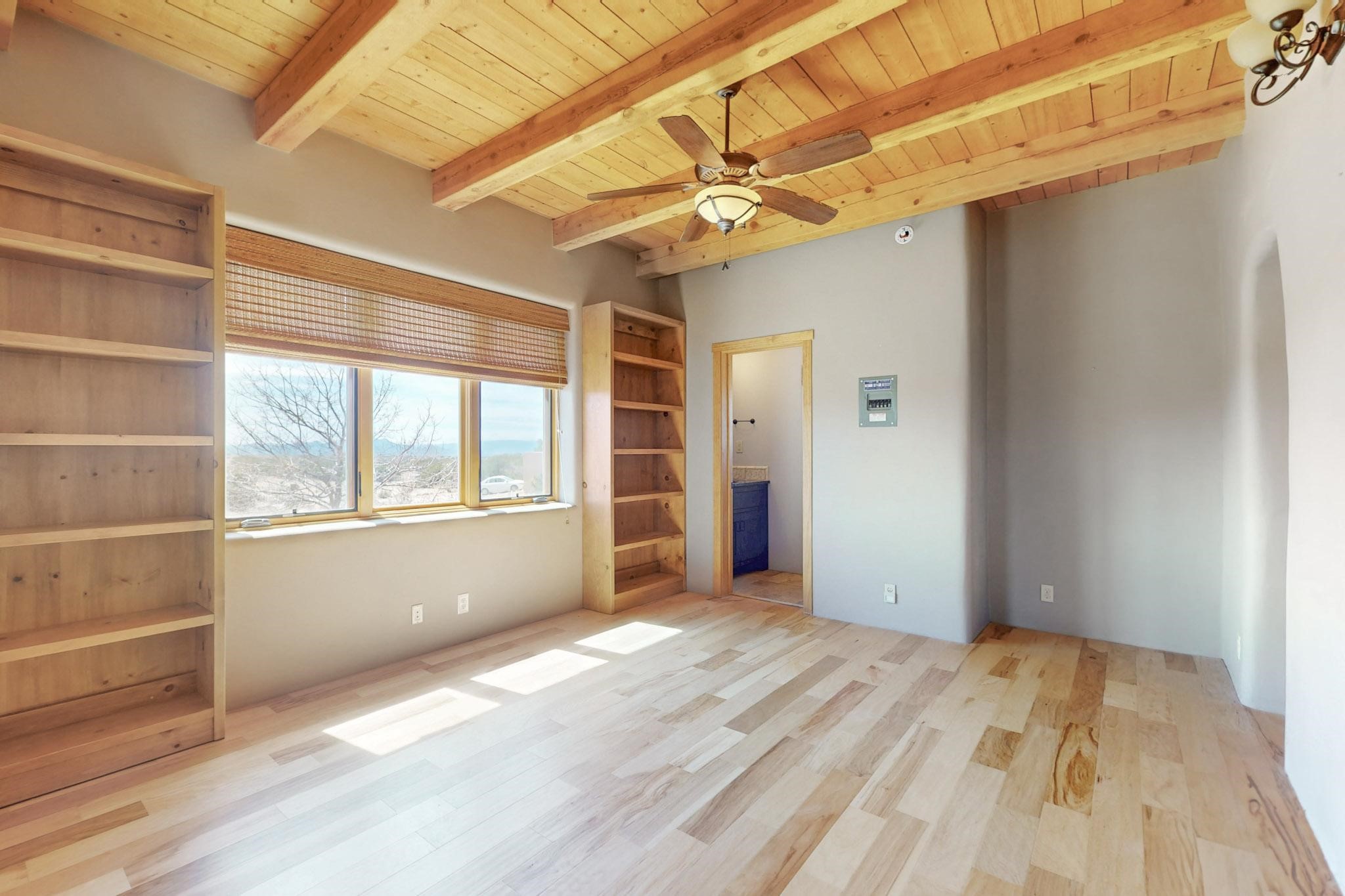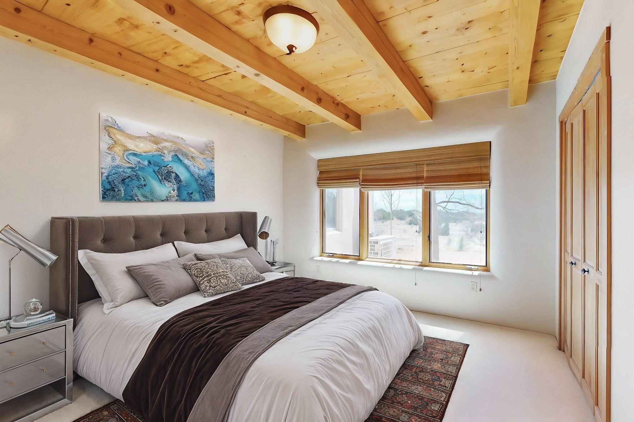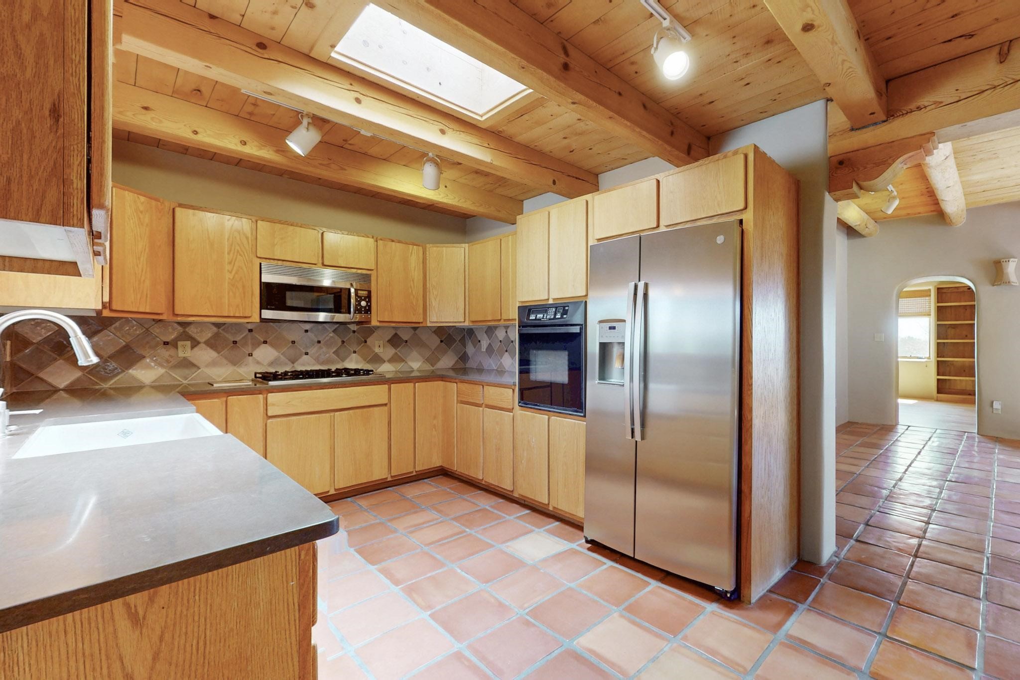 Set back from the road for privacy, this beautifully built adobe home by Shaylube Construction offers multiple access points and versatile outdoor spaces. Designed with thoughtful detail, it begins with a welcoming entrance room ideal for drinking morning coffee or greeting guests, flowing seamlessly into a charming living area with a traditional kiva fireplace. The dining room is conveniently located between the entrance and living room, creating an easy flow for entertaining. The kitchen boasts exceptional storage with multiple lazy-susan cupboards and a built-in China cabinet. The spacious primary bedroom features its own kiva fireplace, creating a warm, inviting retreat. Two additional bedrooms offer flexibility, along with a possible third bedroom or office with a secure, locking storage closet--perfect for valuables or private archives. At the rear of the home, accessed via an exterior walkway, a private office with custom built bookshelves and rich wood flooring provides a peaceful workspace. This well-maintained home comes with significant recent upgrades: Completely re-roofed in 2018 with warranty through 2028; New furnace and tankless water heater 2015; Updated mini-split systems 2024; New refrigerator 2023. Includes mountain views, multiple patios and garden spaces, and a flexible floor plan that allows for independence and coexistence under one roof.