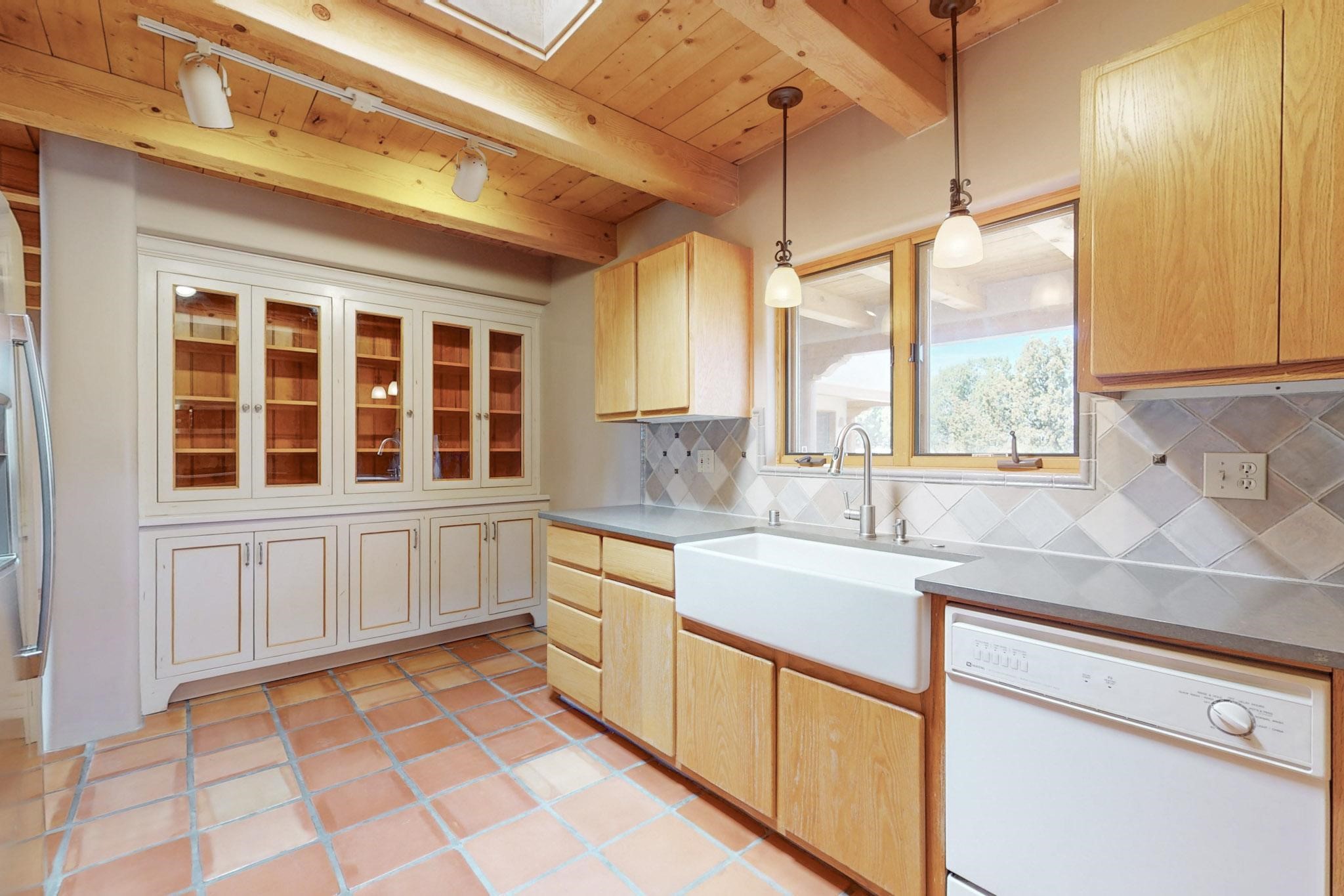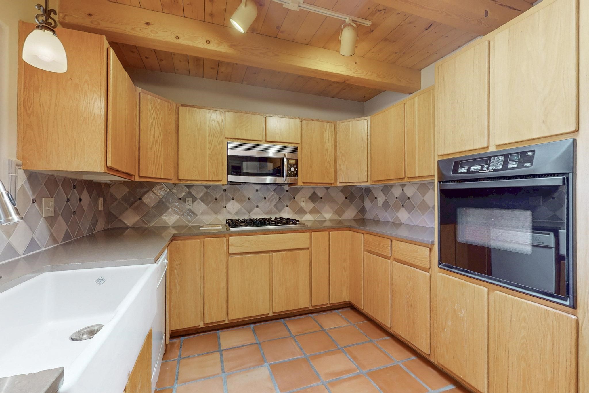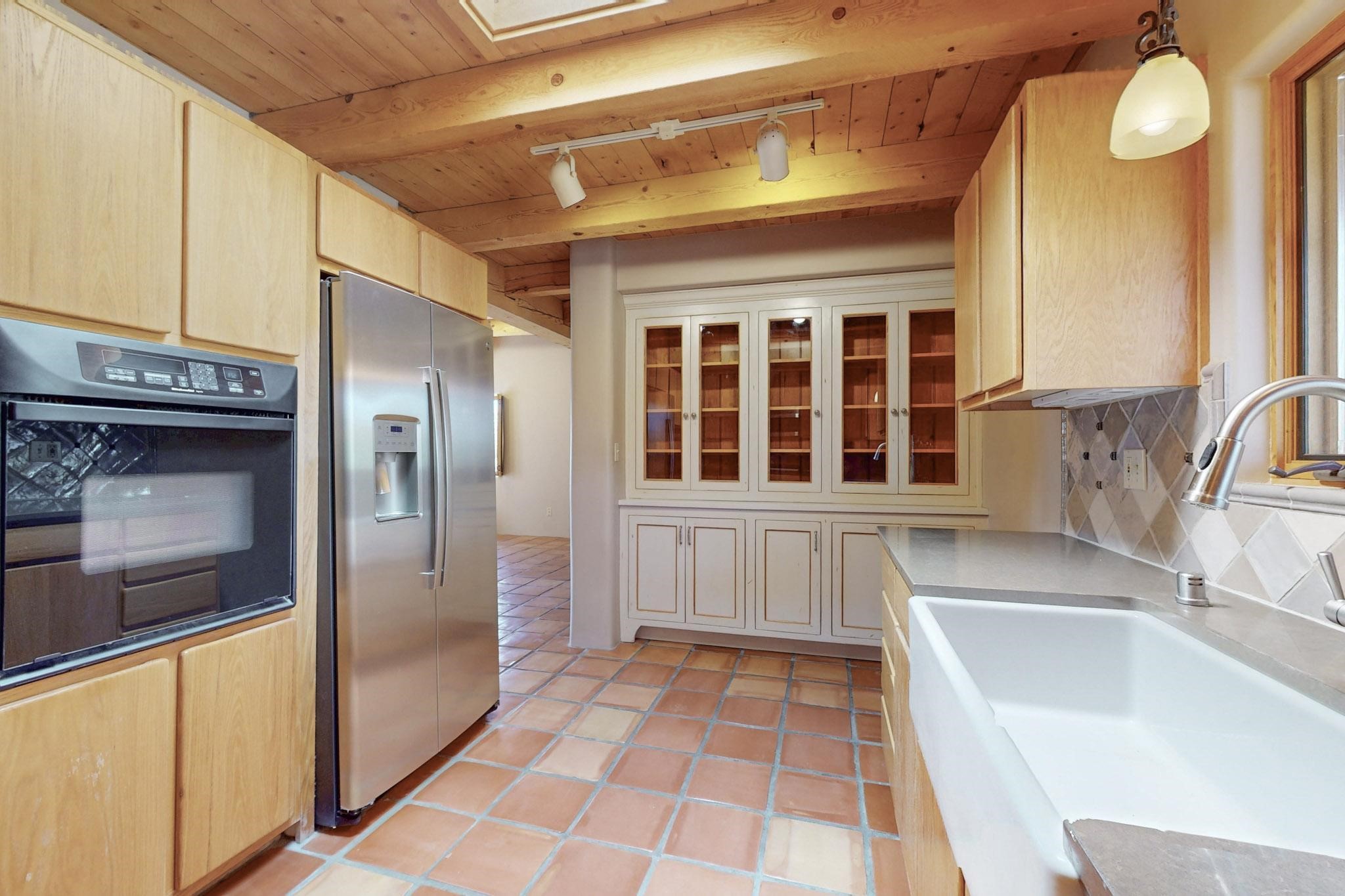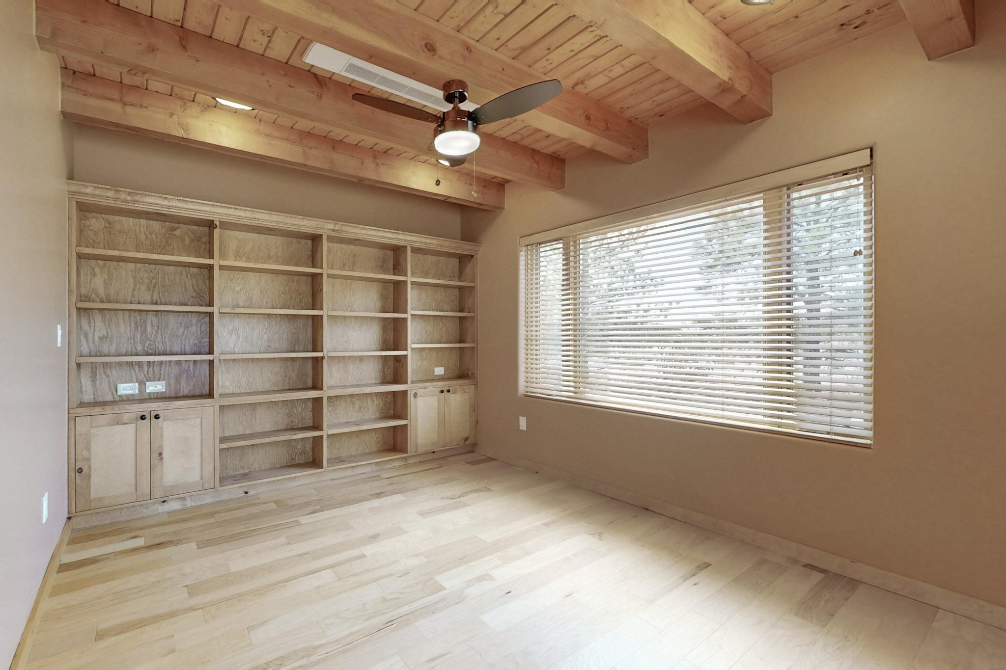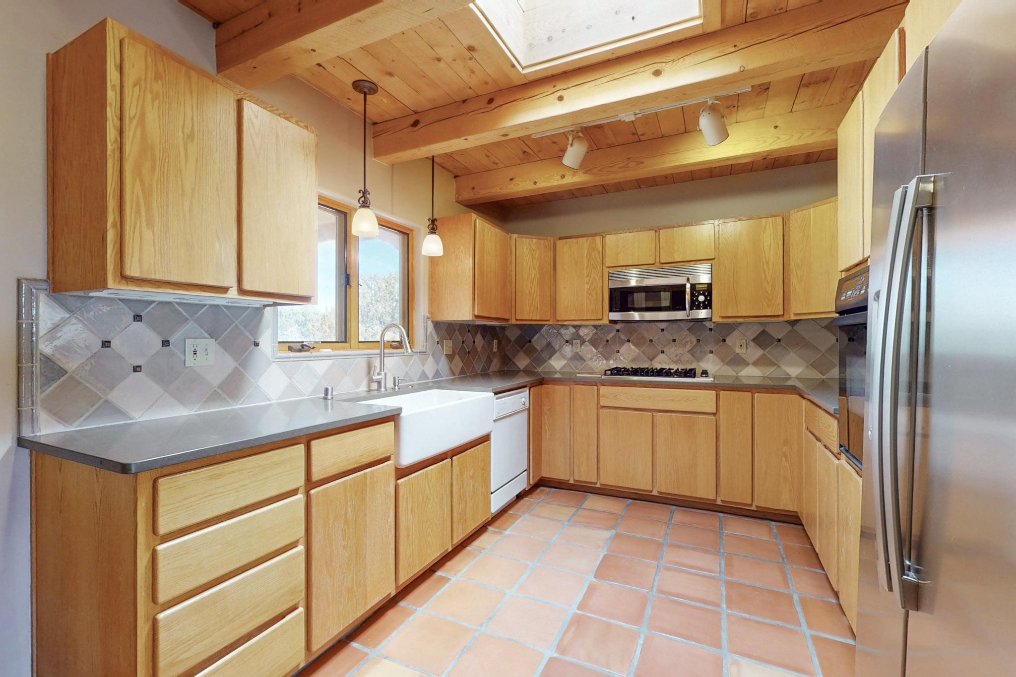 Set back from the road for privacy, this beautifully built adobe home by Shaylube Construction offers multiple access points and versatile outdoor spaces. Designed with thoughtful detail, it begins with a welcoming entrance room ideal for drinking morning coffee or greeting guests, flowing seamlessly into a charming living area with a traditional kiva fireplace. The dining room is conveniently located between the entrance and living room, creating an easy flow for entertaining. The kitchen boasts exceptional storage with multiple lazy-susan cupboards and a built-in China cabinet. The spacious primary bedroom features its own kiva fireplace, creating a warm, inviting retreat. Two additional bedrooms offer flexibility, along with a possible third bedroom or office with a secure, locking storage closet--perfect for valuables or private archives. At the rear of the home, accessed via an exterior walkway, a private office with custom built bookshelves and rich wood flooring provides a peaceful workspace. This well-maintained home comes with significant recent upgrades: Completely re-roofed in 2018 with warranty through 2028; New furnace and tankless water heater 2015; Updated mini-split systems 2024; New refrigerator 2023. Includes mountain views, multiple patios and garden spaces, and a flexible floor plan that allows for independence and coexistence under one roof.