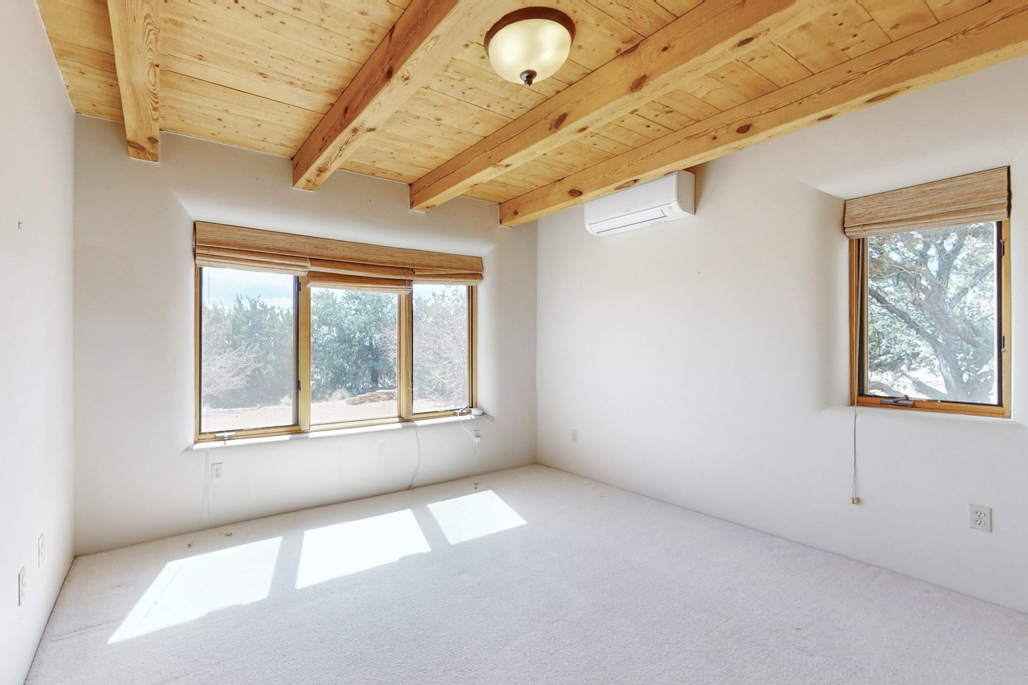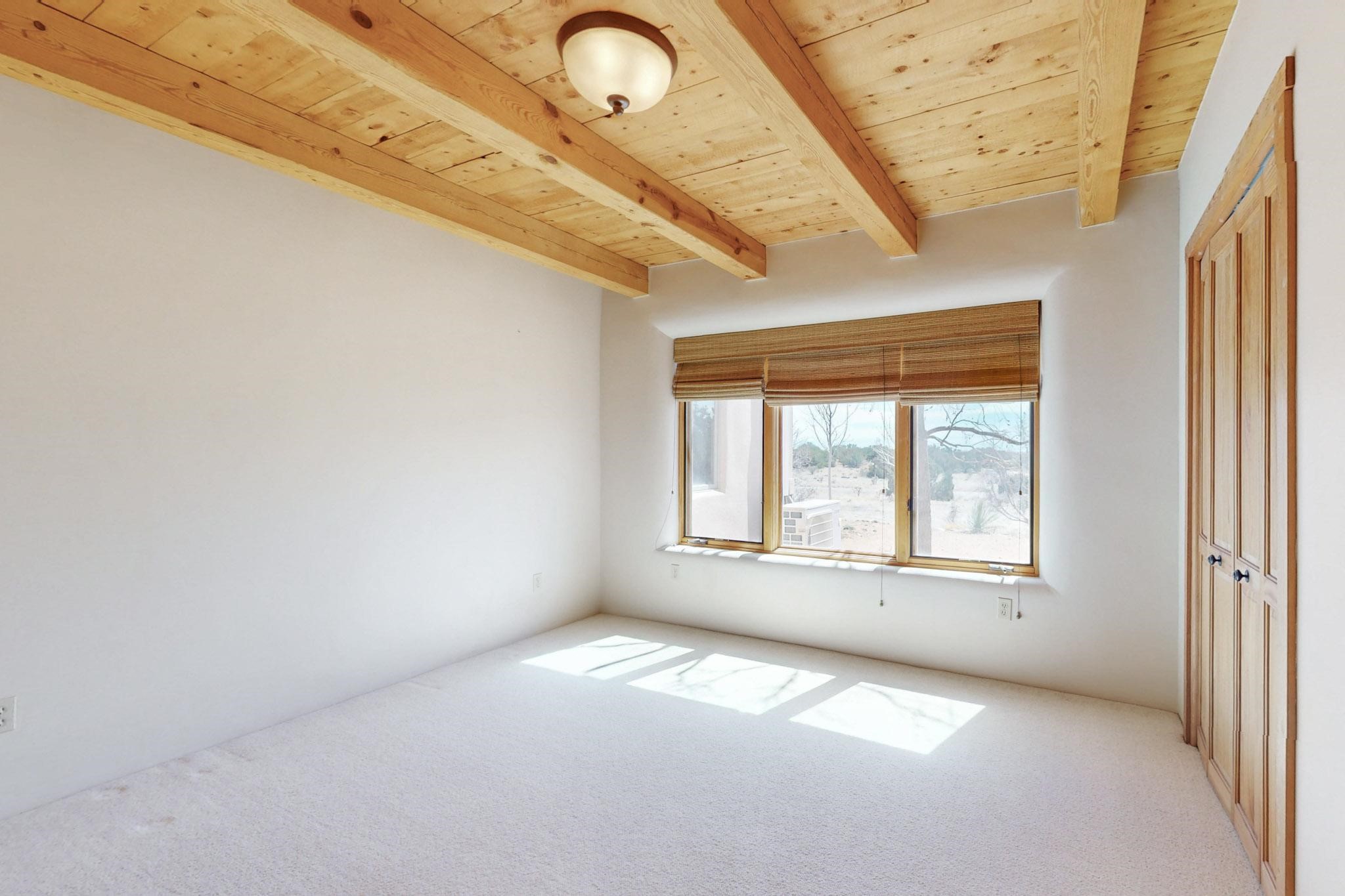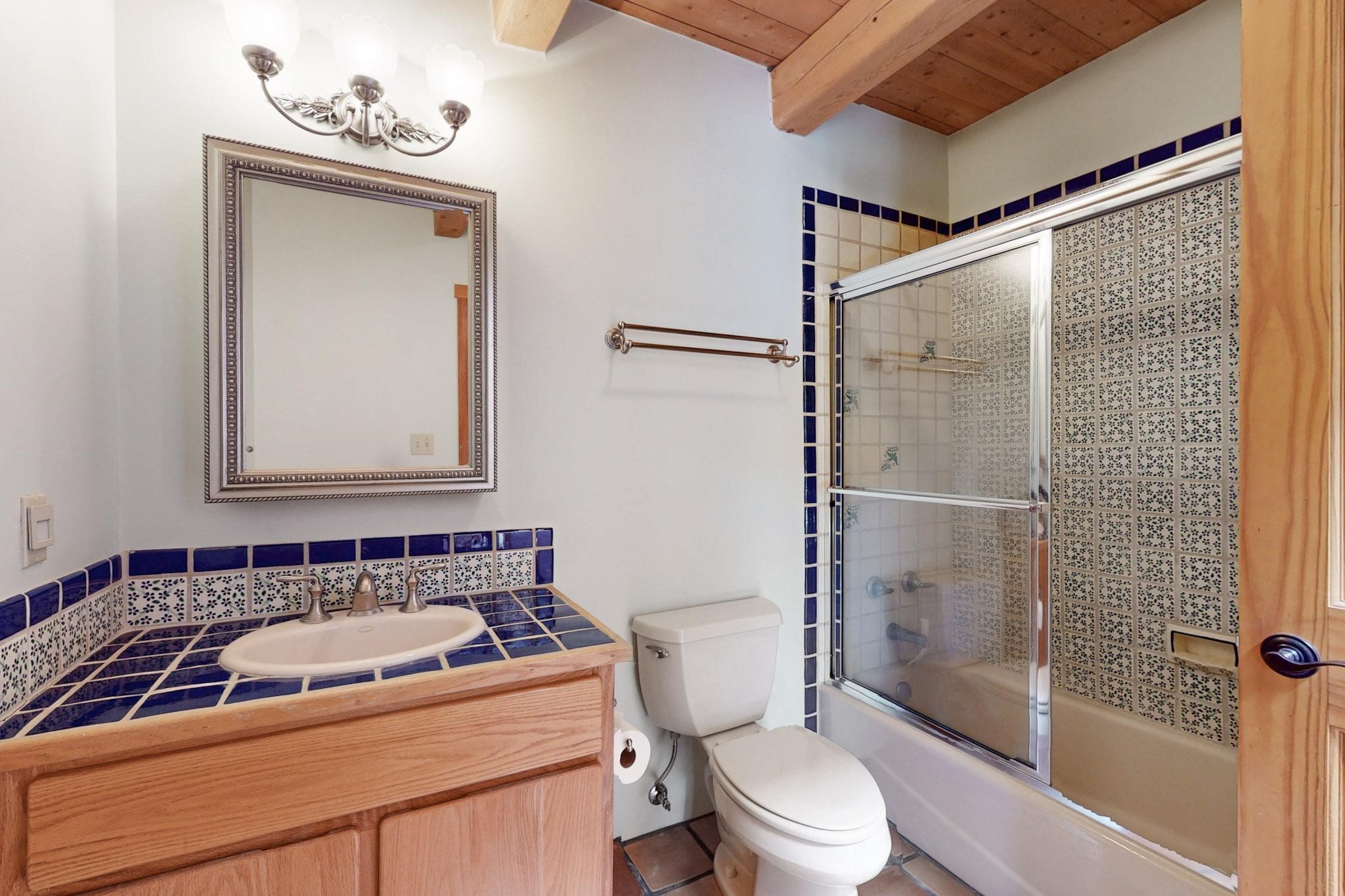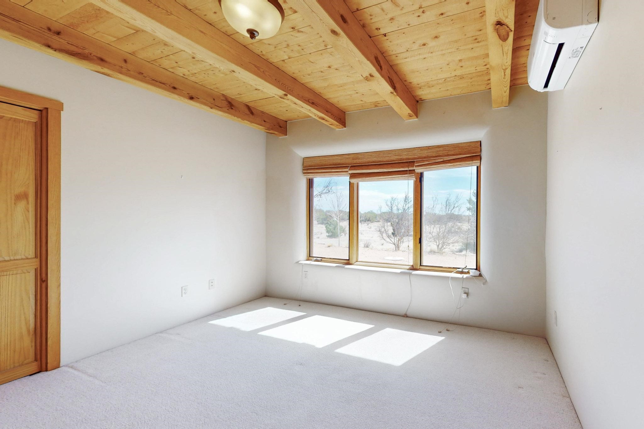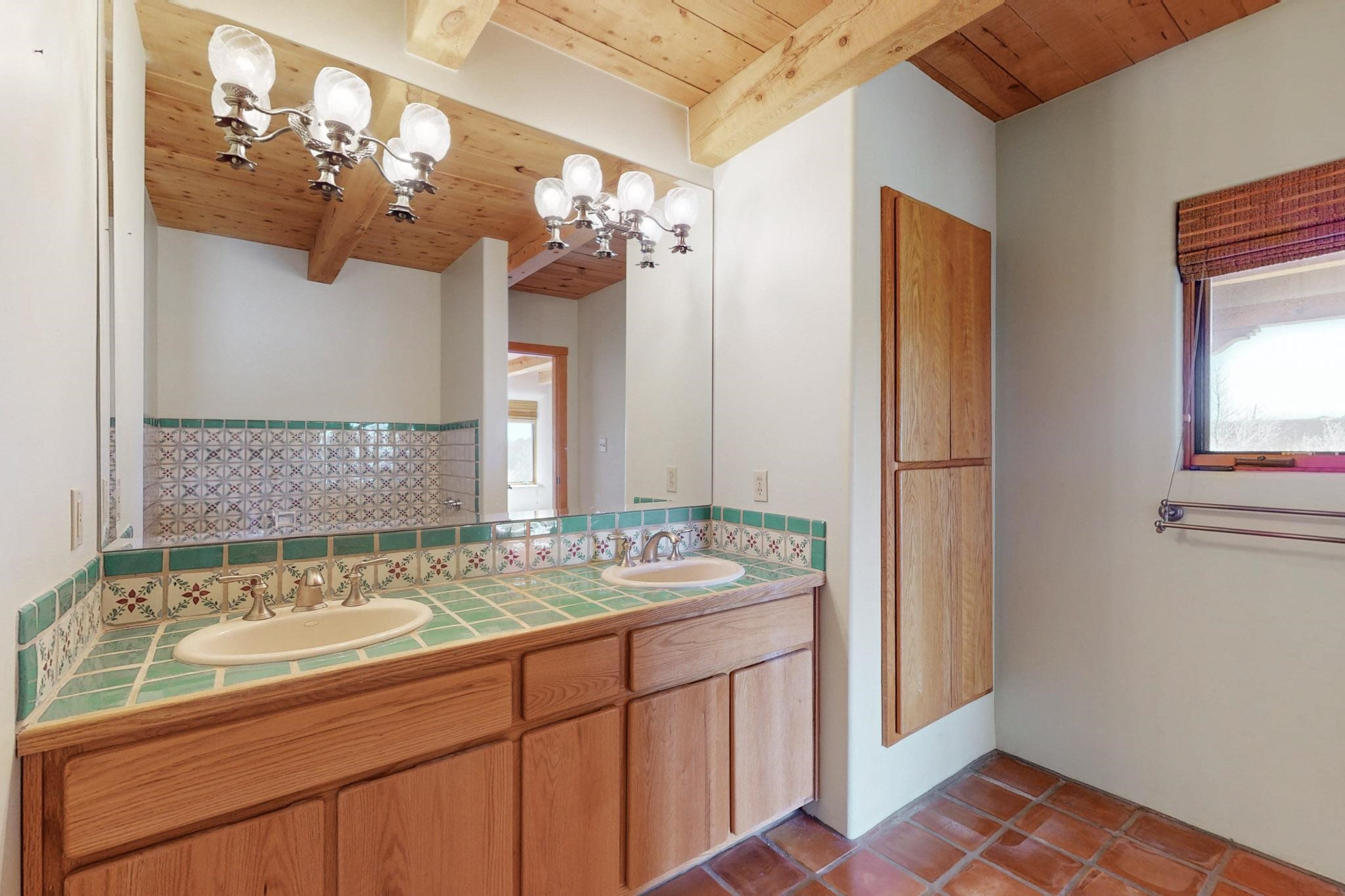 Set back from the road for privacy, this beautifully built adobe home by Shaylube Construction offers multiple access points and versatile outdoor spaces. Designed with thoughtful detail, it begins with a welcoming entrance room ideal for drinking morning coffee or greeting guests, flowing seamlessly into a charming living area with a traditional kiva fireplace. The dining room is conveniently located between the entrance and living room, creating an easy flow for entertaining. The kitchen boasts exceptional storage with multiple lazy-susan cupboards and a built-in China cabinet. The spacious primary bedroom features its own kiva fireplace, creating a warm, inviting retreat. Two additional bedrooms offer flexibility, along with a possible third bedroom or office with a secure, locking storage closet--perfect for valuables or private archives. At the rear of the home, accessed via an exterior walkway, a private office with custom built bookshelves and rich wood flooring provides a peaceful workspace. This well-maintained home comes with significant recent upgrades: Completely re-roofed in 2018 with warranty through 2028; New furnace and tankless water heater 2015; Updated mini-split systems 2024; New refrigerator 2023. Includes mountain views, multiple patios and garden spaces, and a flexible floor plan that allows for independence and coexistence under one roof.
