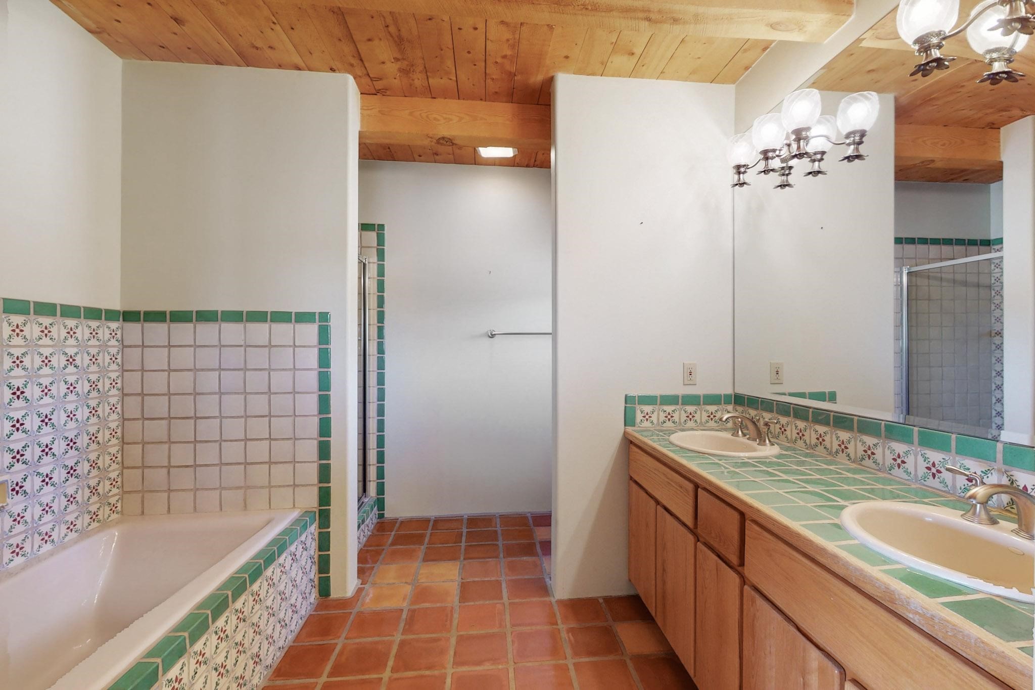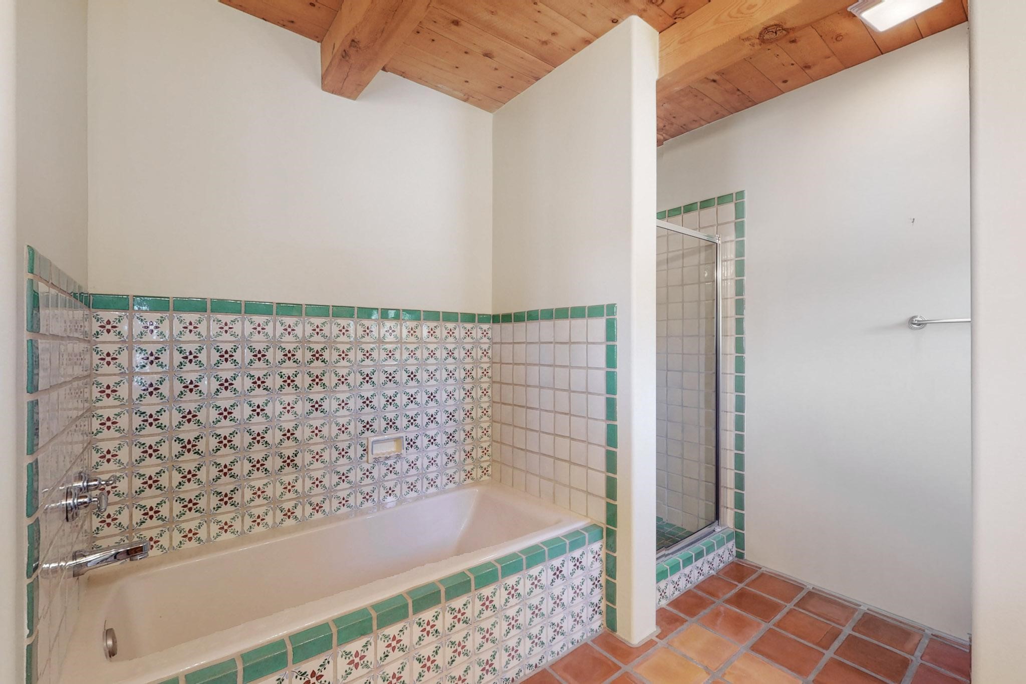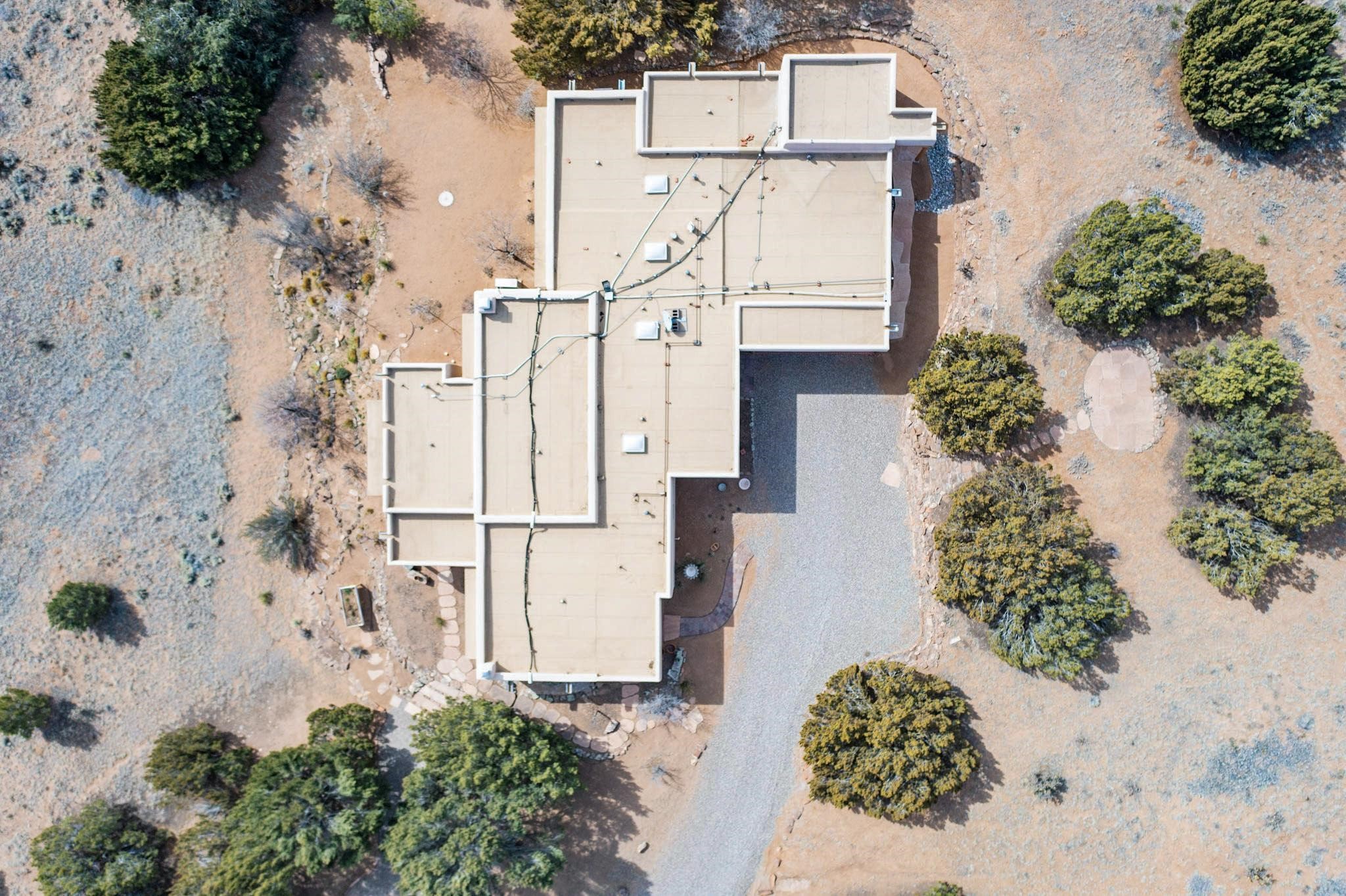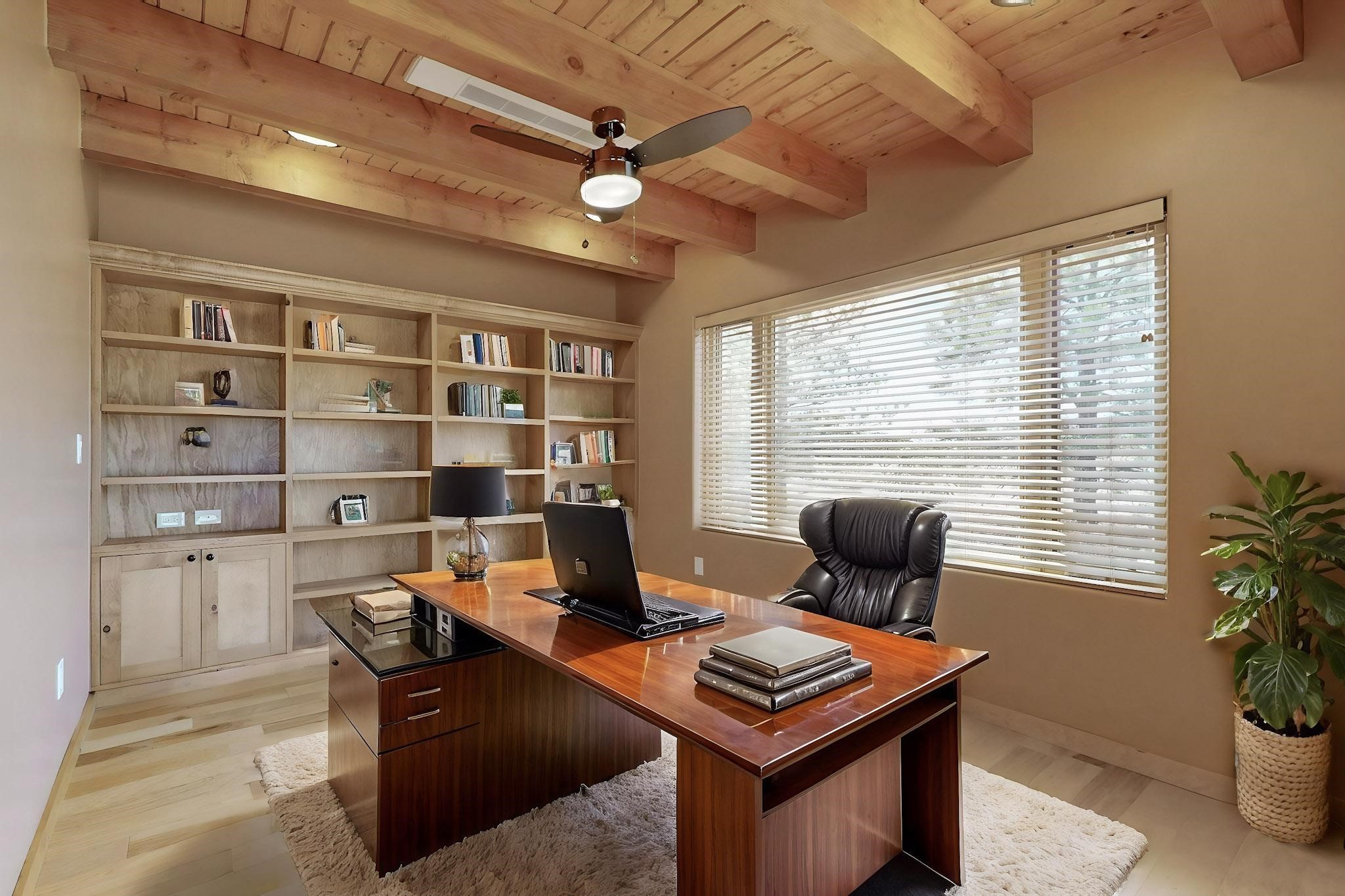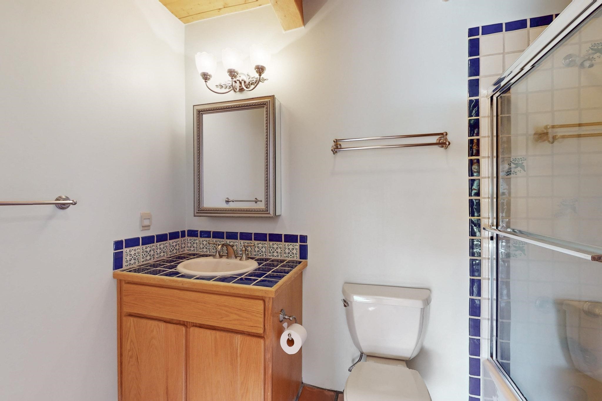 Set back from the road for privacy, this beautifully built adobe home by Shaylube Construction offers multiple access points and versatile outdoor spaces. Designed with thoughtful detail, it begins with a welcoming entrance room ideal for drinking morning coffee or greeting guests, flowing seamlessly into a charming living area with a traditional kiva fireplace. The dining room is conveniently located between the entrance and living room, creating an easy flow for entertaining. The kitchen boasts exceptional storage with multiple lazy-susan cupboards and a built-in China cabinet. The spacious primary bedroom features its own kiva fireplace, creating a warm, inviting retreat. Two additional bedrooms offer flexibility, along with a possible third bedroom or office with a secure, locking storage closet--perfect for valuables or private archives. At the rear of the home, accessed via an exterior walkway, a private office with custom built bookshelves and rich wood flooring provides a peaceful workspace. This well-maintained home comes with significant recent upgrades: Completely re-roofed in 2018 with warranty through 2028; New furnace and tankless water heater 2015; Updated mini-split systems 2024; New refrigerator 2023. Includes mountain views, multiple patios and garden spaces, and a flexible floor plan that allows for independence and coexistence under one roof.