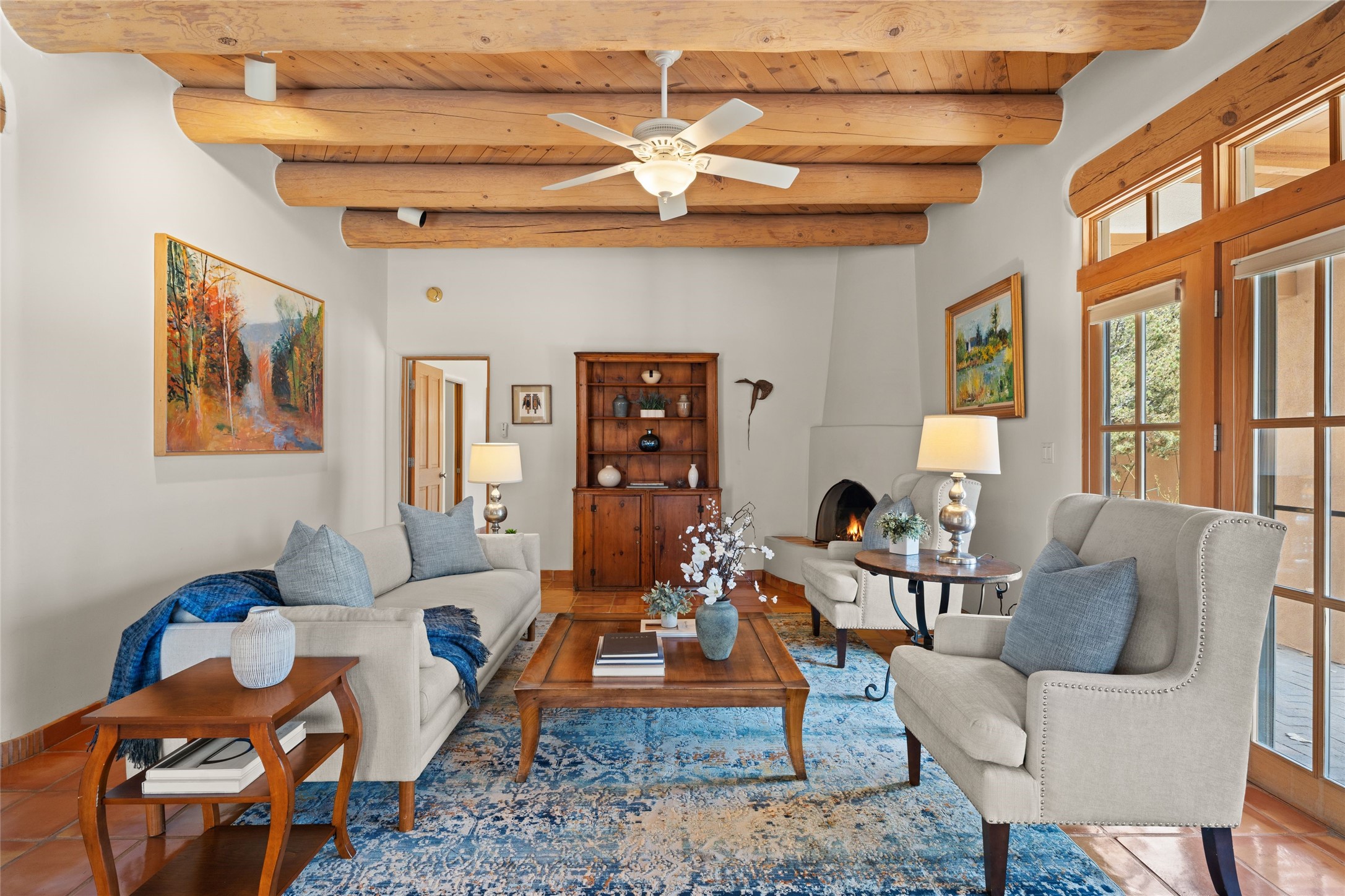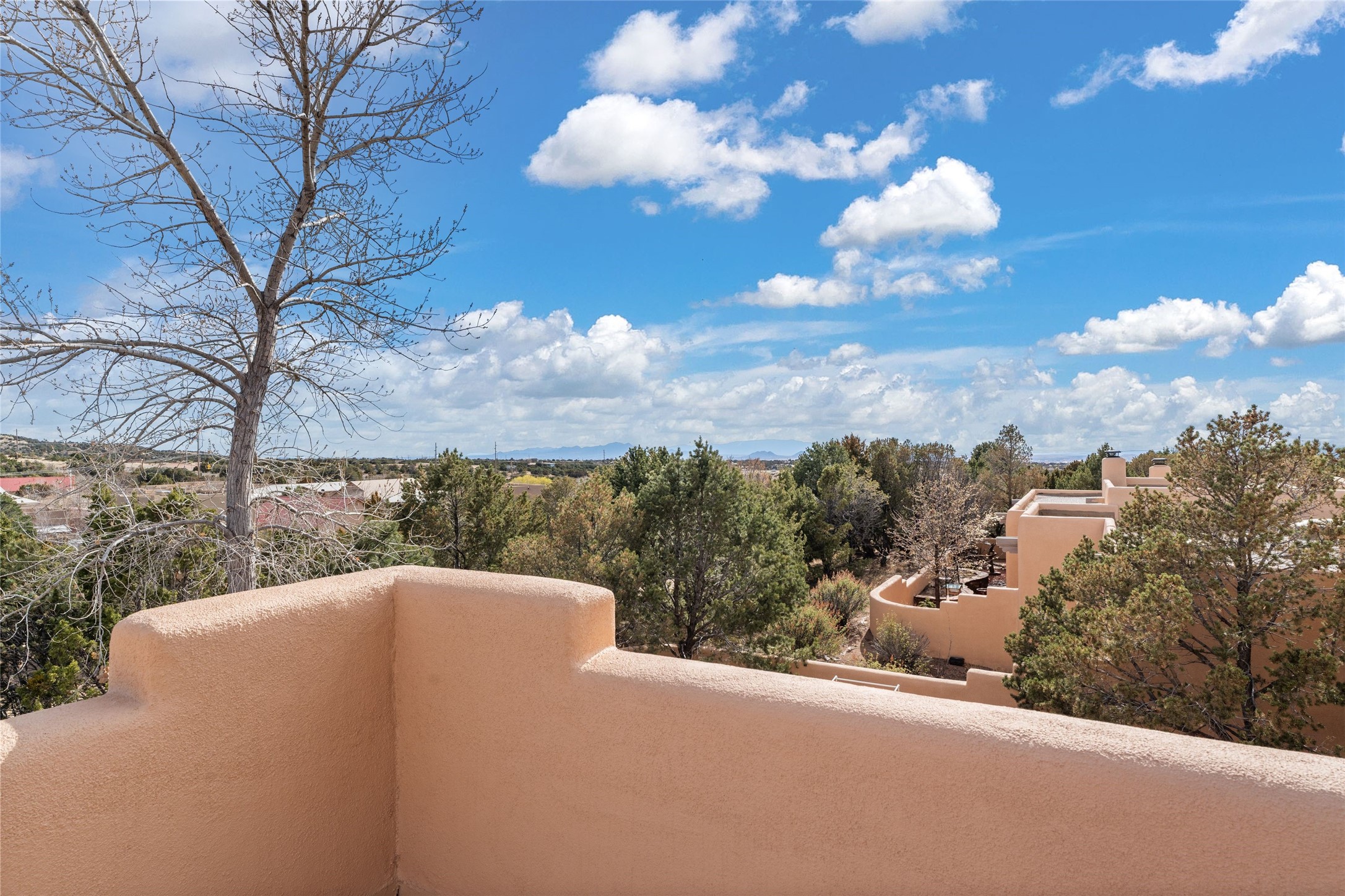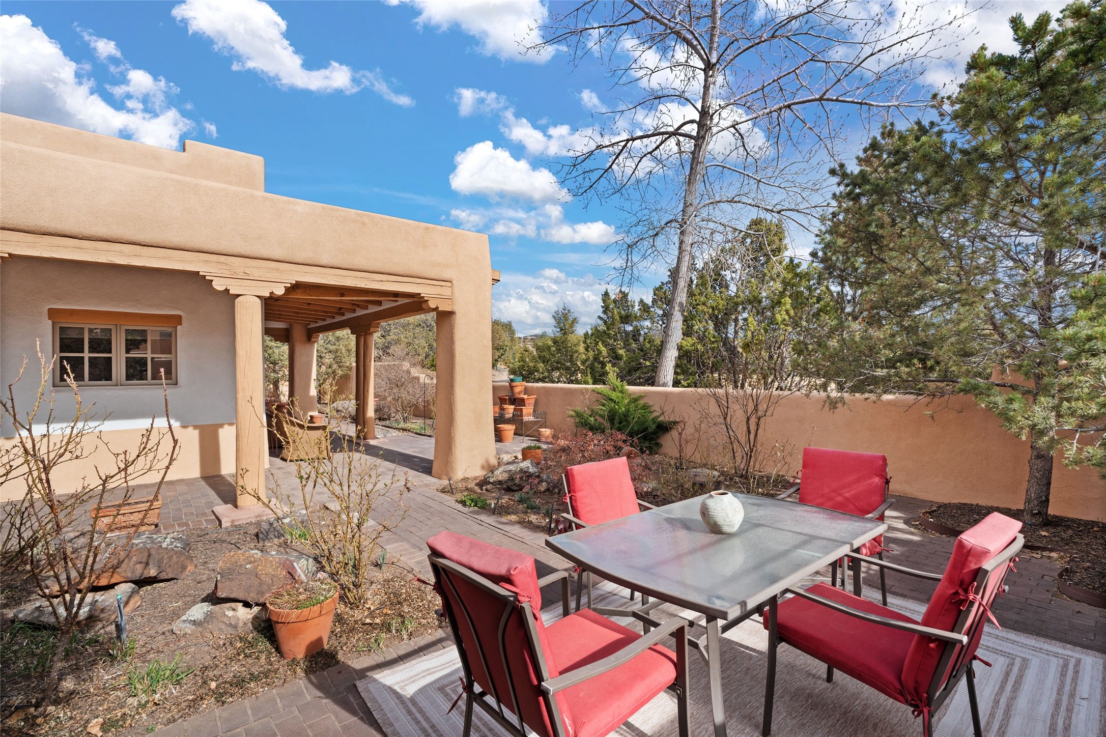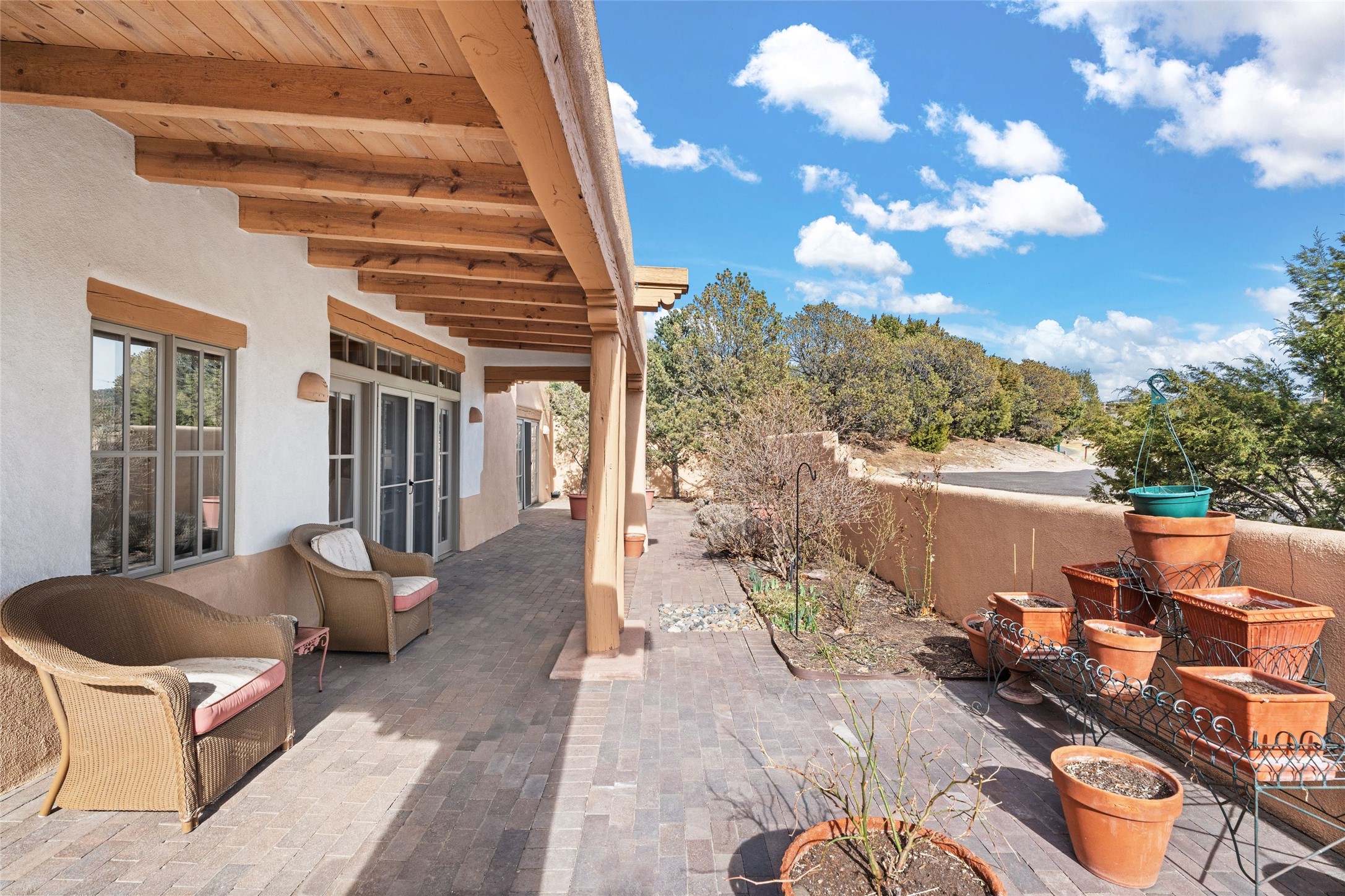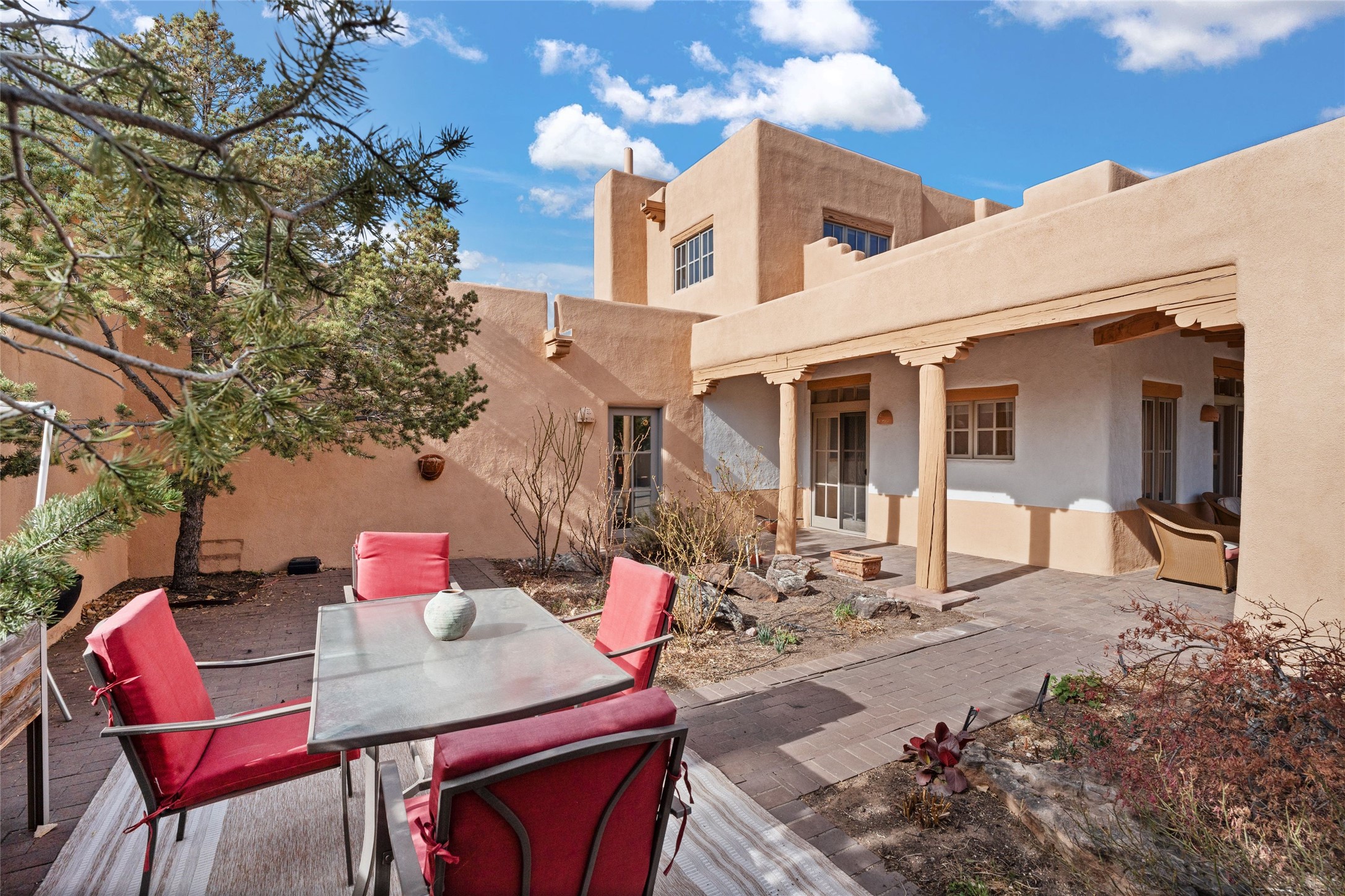 Classic Quail Run Pinon D floorplan featuring Santa Fe Style, great separation of bedrooms and timeless craftsmanship with ample sized rooms, a large kitchen and bright open living room. A serene and flowing space that allows for comfortable indoor living while showcasing spacious terraces that will beckon you outdoors. Tall portal with vigas offers views of the golf course, mountains and those famous Santa Fe skies. The gardens feature 30 specimen roses. This oversized outdoor space is ideal for entertaining. Upstairs there is a large sun flooded room that can be used as a bedroom or study. It includes an adjoining bathroom and outdoor deck with expansive scenery. Quintessential style that embodies Santa Fe beauty on the inside and out. If you are looking for a fabulous community with 24 hour hosted security and countless amenities as well as social clubs and gatherings, this is your next home! Ownership includes access to a state of the art gym, pool/spa, tennis/pickleball courts, golf, fitness classes and much more; come and see!