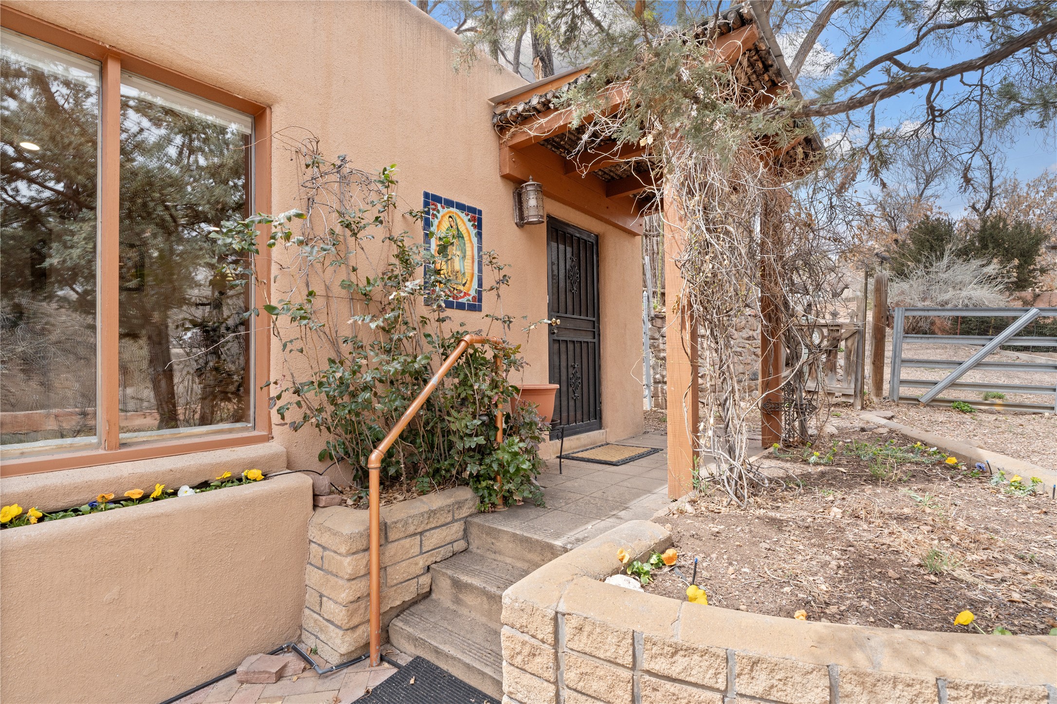 SHADE - TREES - WATER - all supreme attributes in this highly desirable location, as this historic Eastside pied-a-terre awaits at the east end of The Alameda with unlimited opportunities to enjoy the numerous old-growth large trees prevalent in the immediate area, water in the adjacent Acequia de la Muralla, and the popular and nurturing Santa Fe River walk along Camino Pequeno with its nature preserves and bird sanctuaries, and nearby Patrick Smith Park, the Water Park, and Canyon Road - all within a block or two and minutes from your new sanctuary. Hardwood floors, vigas and latillas, a living room fireplace, a ceiling fan, a private patio, an additional storage room (outside access), new kitchen appliances and upgrades, a new roof (2020) are some of the amenities and features of this home. As for the property's history, the original deed was conveyed to Salvador Gonzales in 1742 as the Canada Ancha Grant or Salvador Gonzales Grant consisting of approximately 200 acres of land from Gonzales Road to the hills of Cerro Gordo, from the Rio Santa Fe to Hyde Park Road. Lourdes Padilla Abeyta, a member of the Gonzales family and clan inherited the adobe casita in the 1940s from her parents, and her husband, a builder and mason, remodeled the original two rooms (today's bedrooms) and added all the other rooms and fireplace in the early 1950s. Opportunity knocks - rewards beckon - who will answer the call?