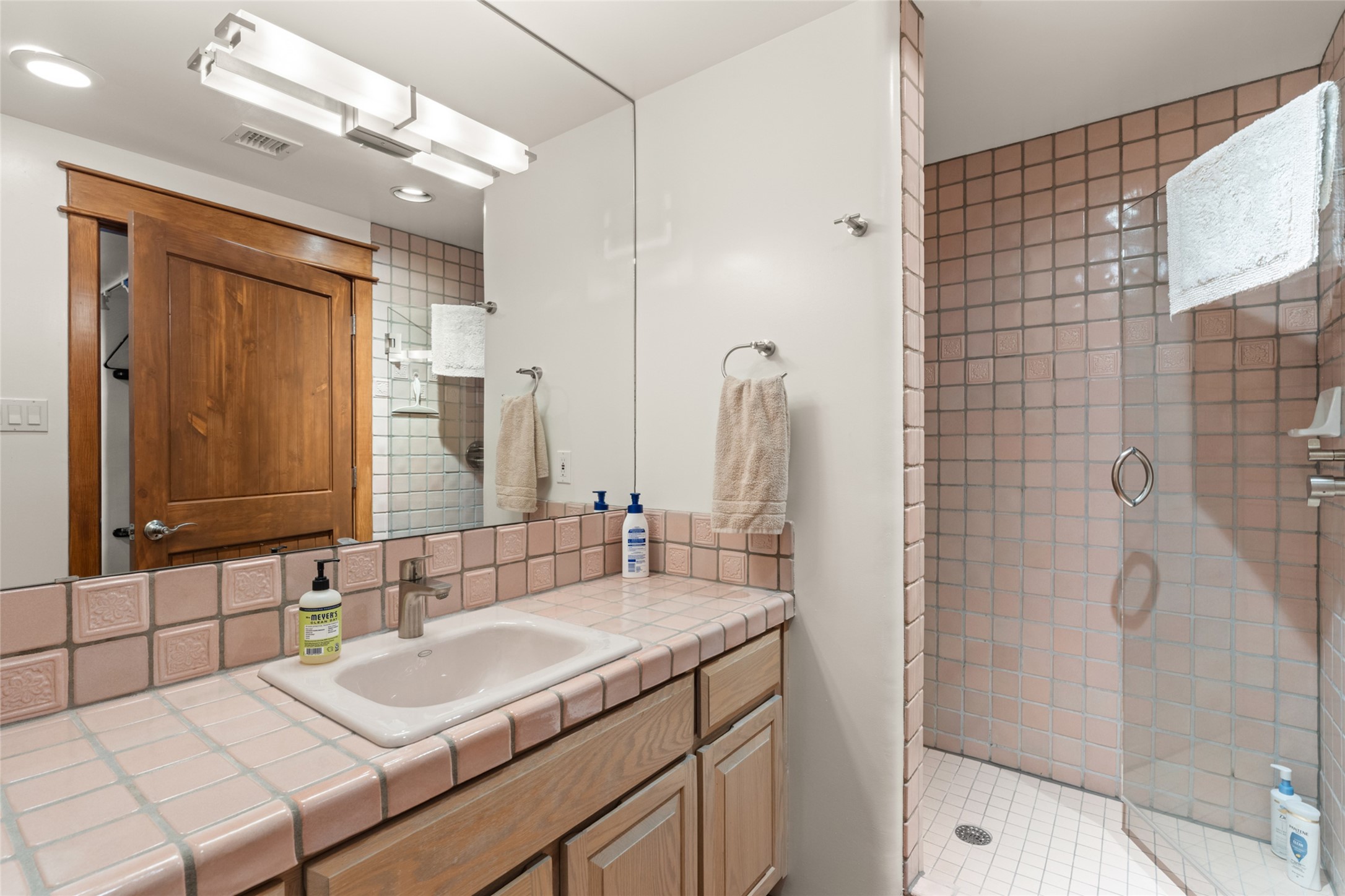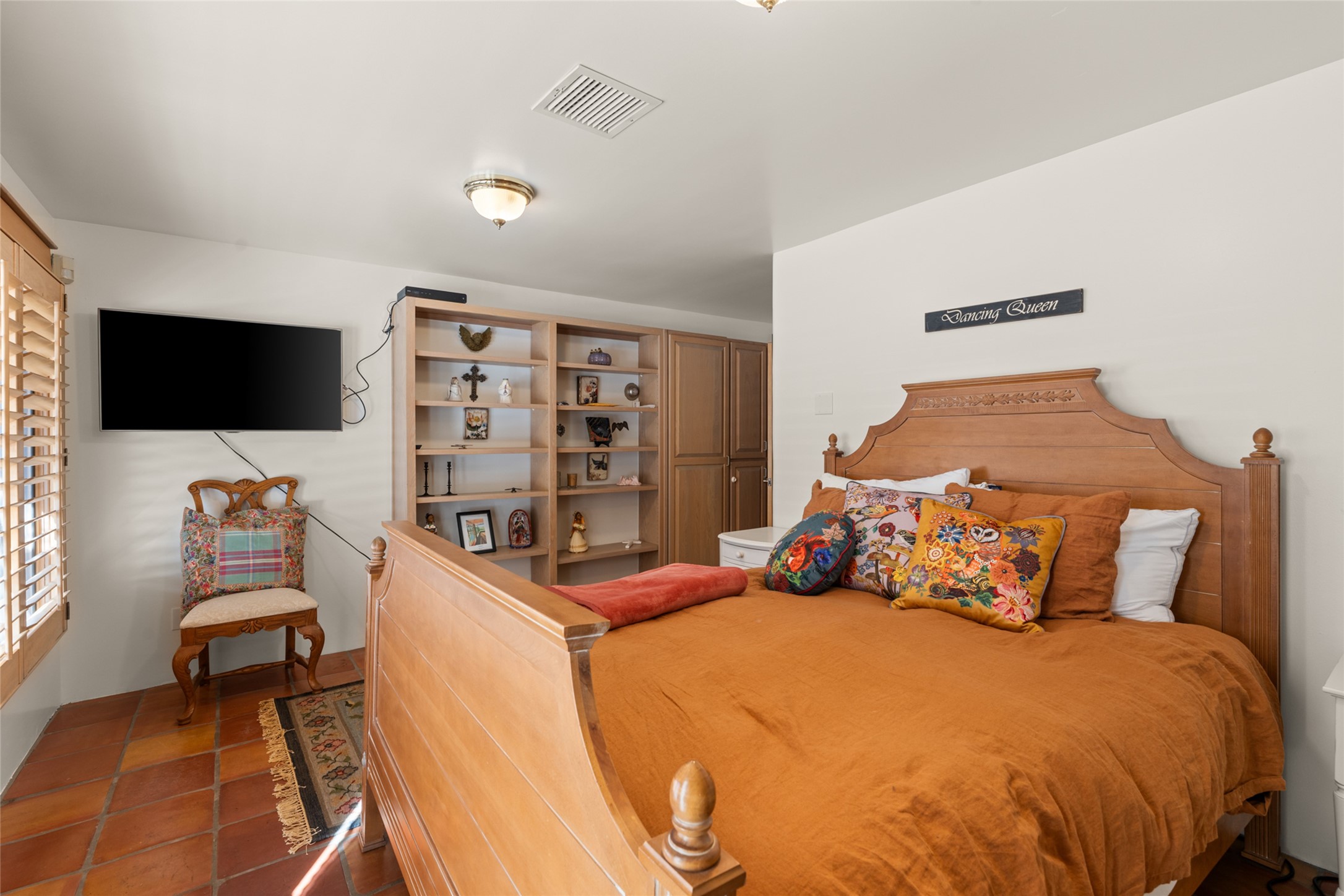 Situated on a large, secluded, and serene 2 acre north-side estate, an exquisite transformation has taken place. The two levels of the main house have been opened and expanded, resulting in a thoughtful home filled with natural light. Walls of windows look upon treetops, fabulous Jemez Mountain and sunset views, and abundant foliage and wildlife. The upper level incorporates the primary suite and two other large bedrooms, a large open concept kitchen and dining area, with Saltillo tiles and vigas flowing into the living area, capped by a dramatic kiva fireplace. For the newly imagined lower level, 1,843 sq ft were added to the original 5,307 sq ft house to create a second lower wing in the main house. The result - 7,150 sq feet with total of 6 bedrooms, remodeled upstairs kitchen, a new 2nd living room with an enclosed patio, 2 new bedrooms, a den with a kitchenette and fireplace, office space, a new laundry room, and too many other new and remodeled features to mention here. The flexibility of these spaces is abundant. Additionally, the property boasts a 1020 sq ft RV garage, recently converted into a heated and cooled artist's studio. There is also a one bedroom casita and 2 two car garages. The guest house, art studio, and one 2 car garage have a separate address and a 2nd gated entrance and the property now totals an extraordinary 8,545 sq ft of heated space on 2 landscaped acres. An amazing value.