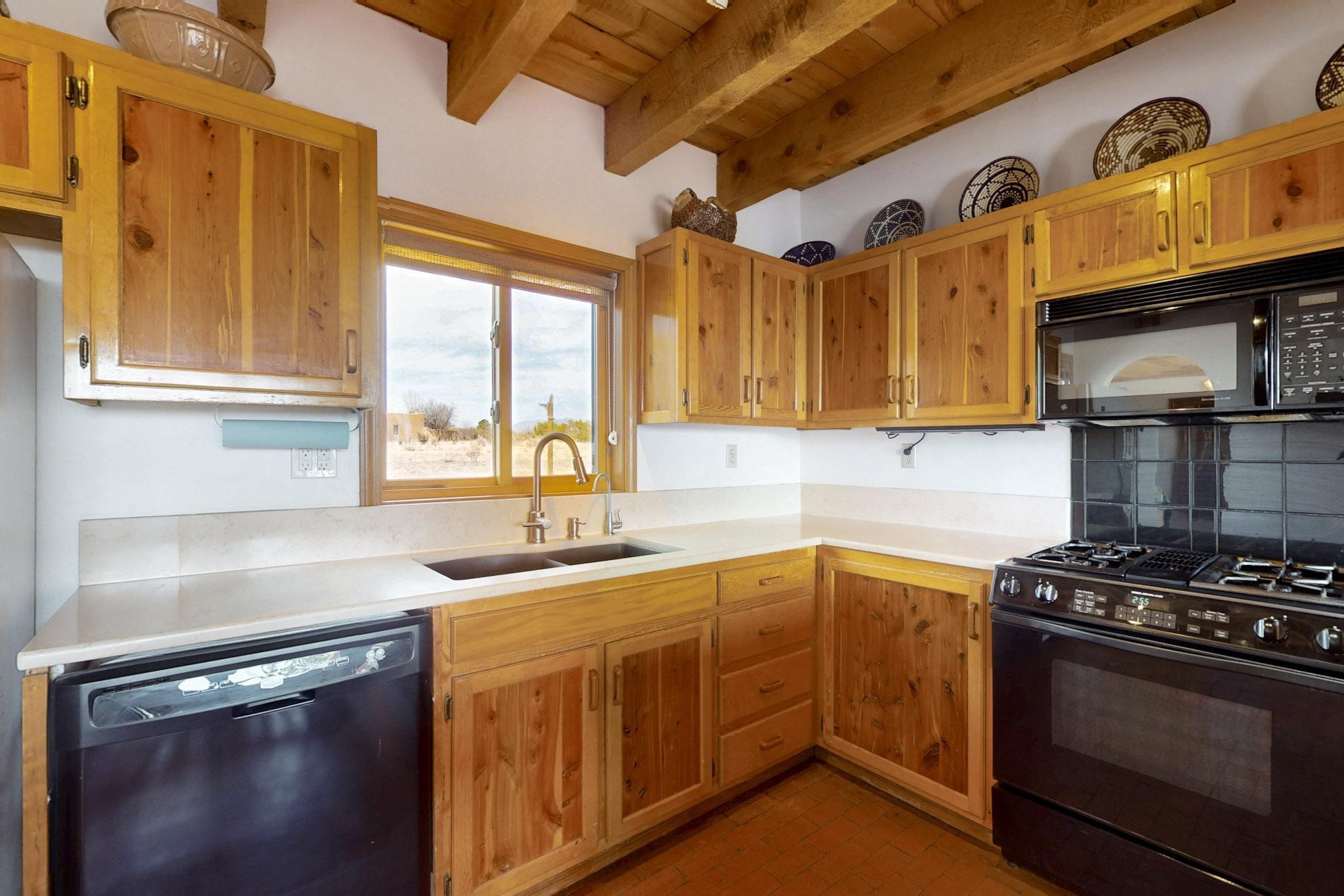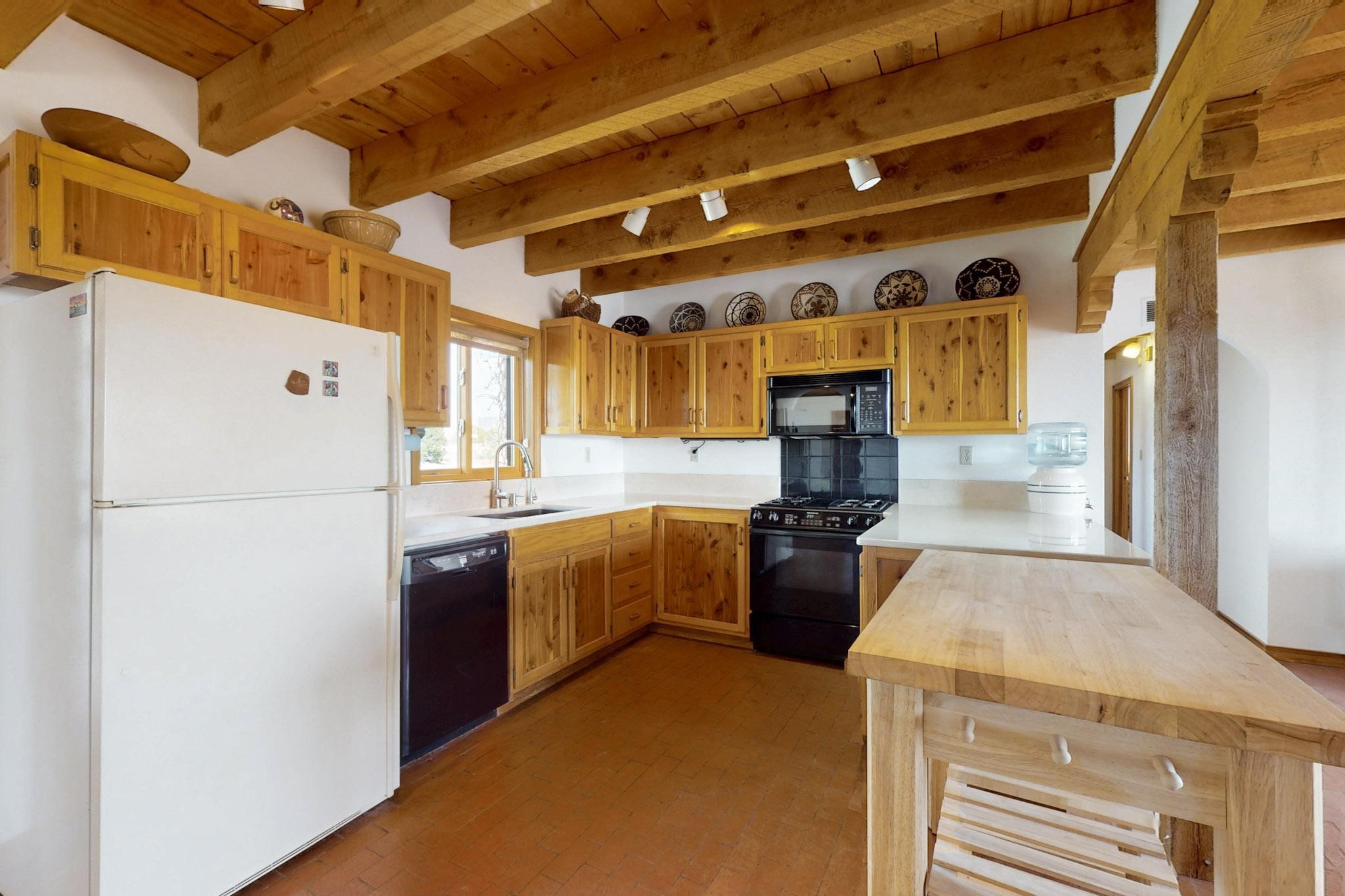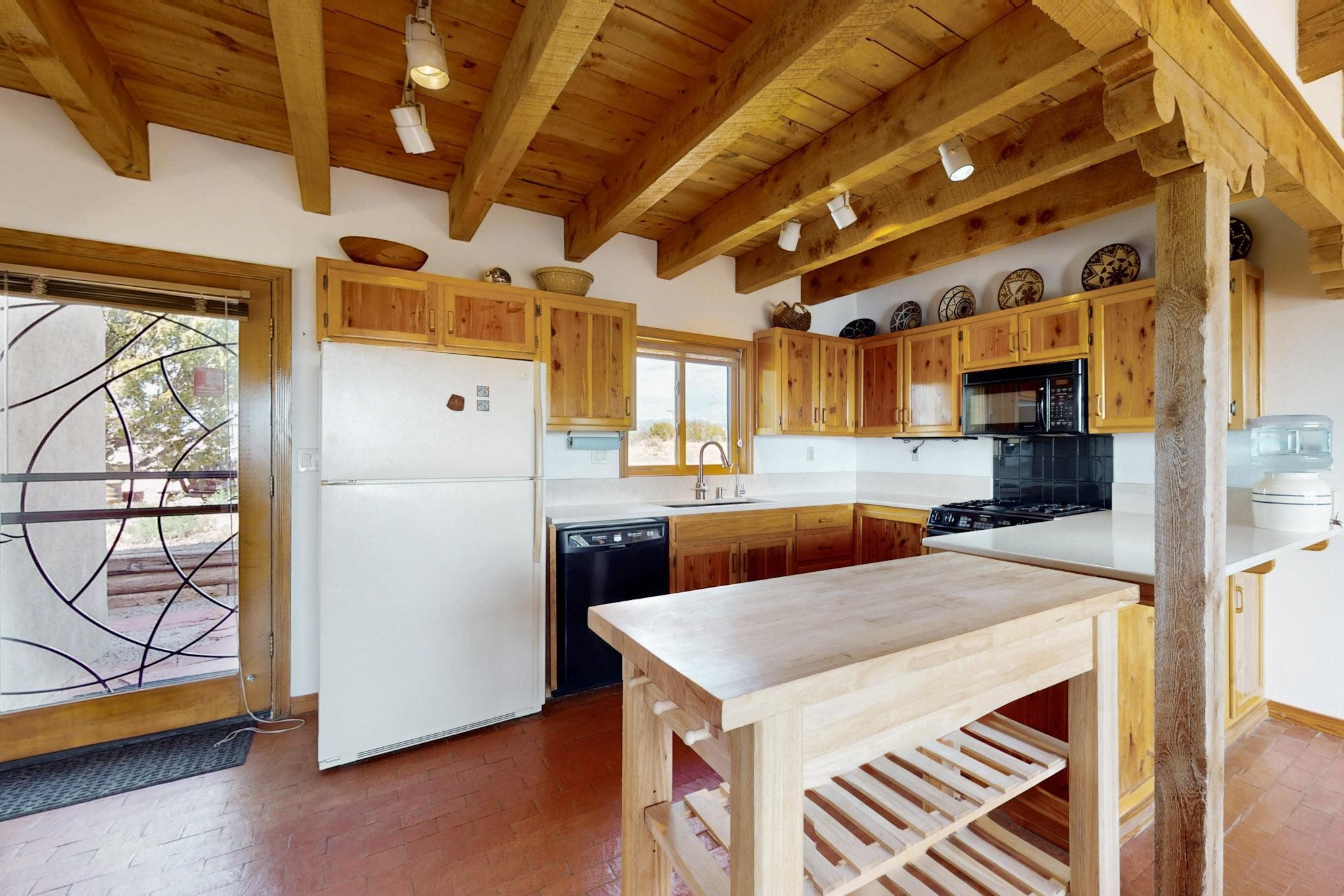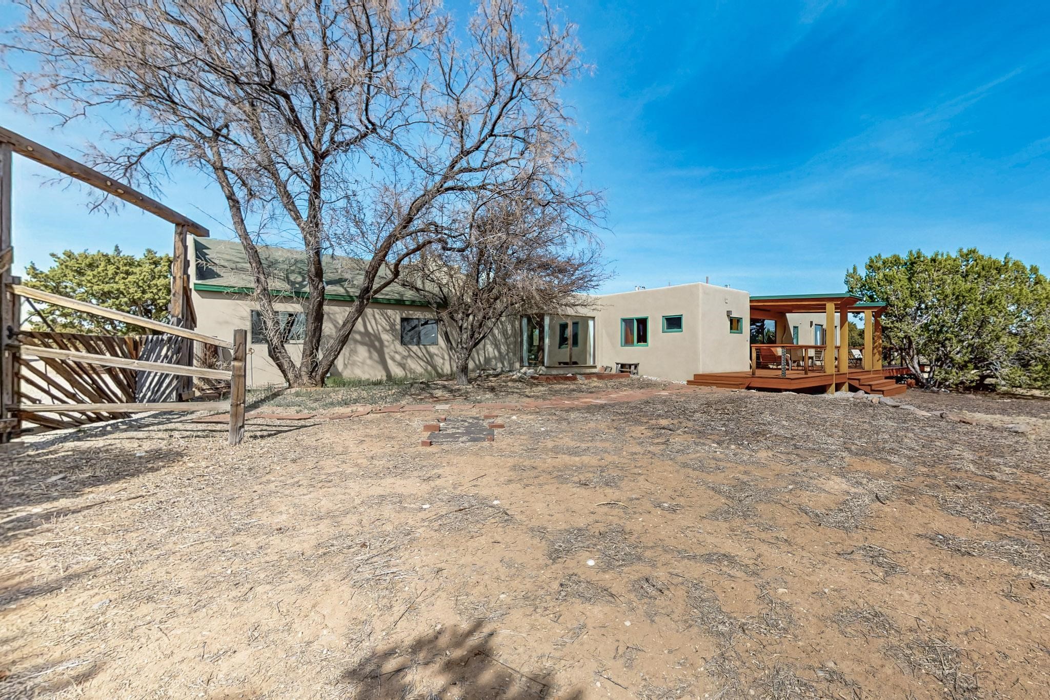 Newly priced lovely remodeled pueblo farmhouse with gleaming Saltillo tile and brick floors, beam ceilings throughout and long south facing windows for passive solar winter gain. The kitchen was remodeled, also both bathrooms were remodeled in 2021. The main bedroom bathroom has a spa like finish and includes a remodeled laundry area with a new Navien hot water heater in 2021, washer and dryer installed in 2022. Extremely flexible floor plan with two master suites, plus another guest bedroom center by the main living open plan areas. There are two mini splits to cool in the summer and 2 gas Regency stoves installed in 2015 add a cosy winter heat, serviced in 2024. A large deck was installed in 2020 for outside enjoyment, and the 2 car garage which was once used as a workshop has an old woodstove. The roof has been maintained, the private well pump was replaced in 2010, and a Nuvo water filter installed in 2021. There is a large fenced private back yard and plenty of parking space for guests. This home accesses all of Eldorado amenities, close to local shopping, the pub, schools, parks, trails, library and senior center and is only minutes into Santa Fe.
