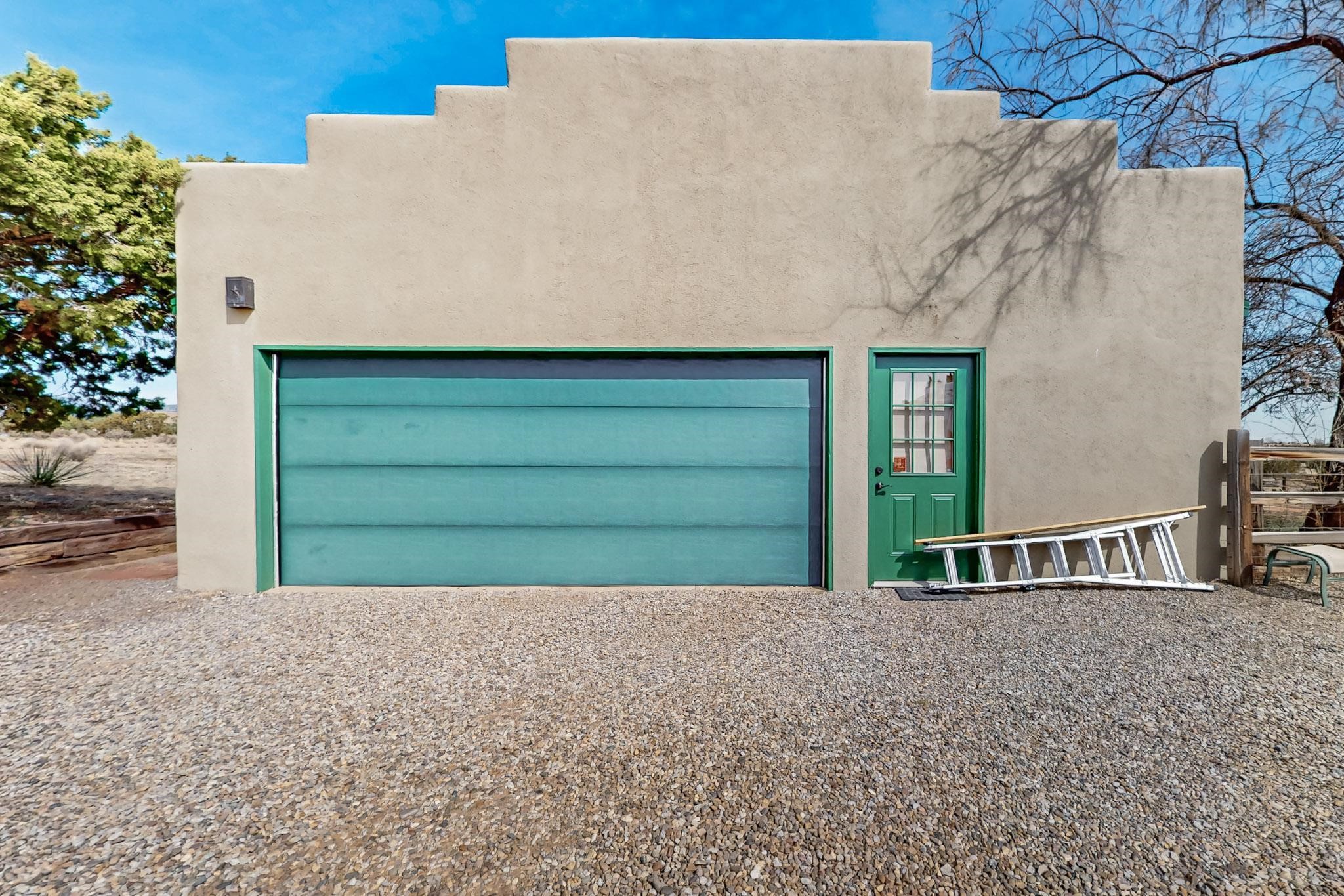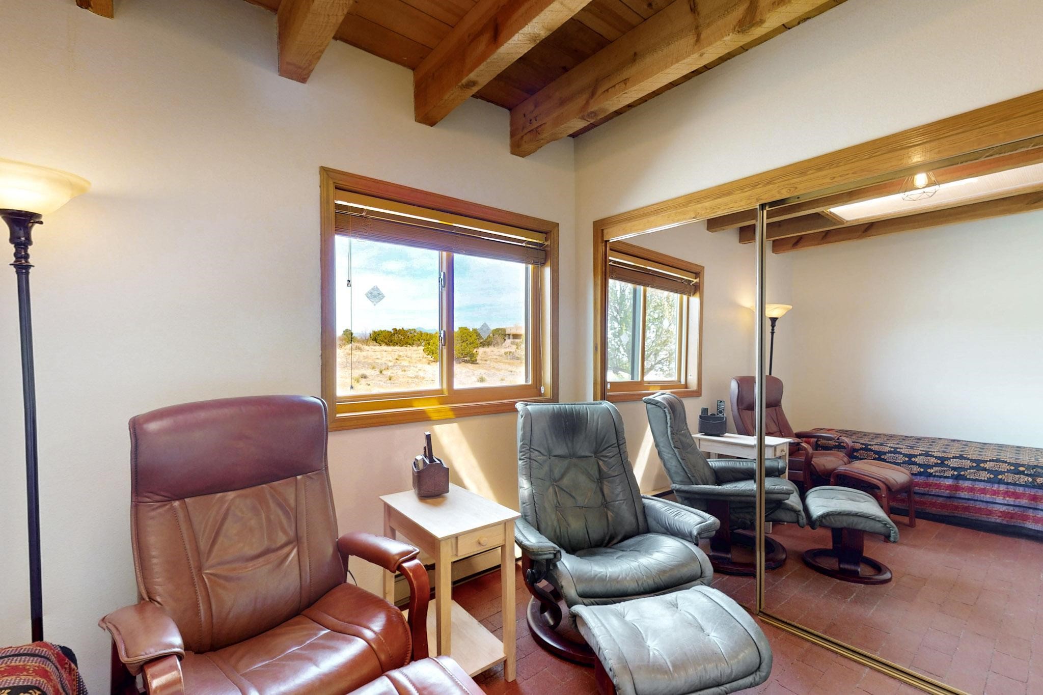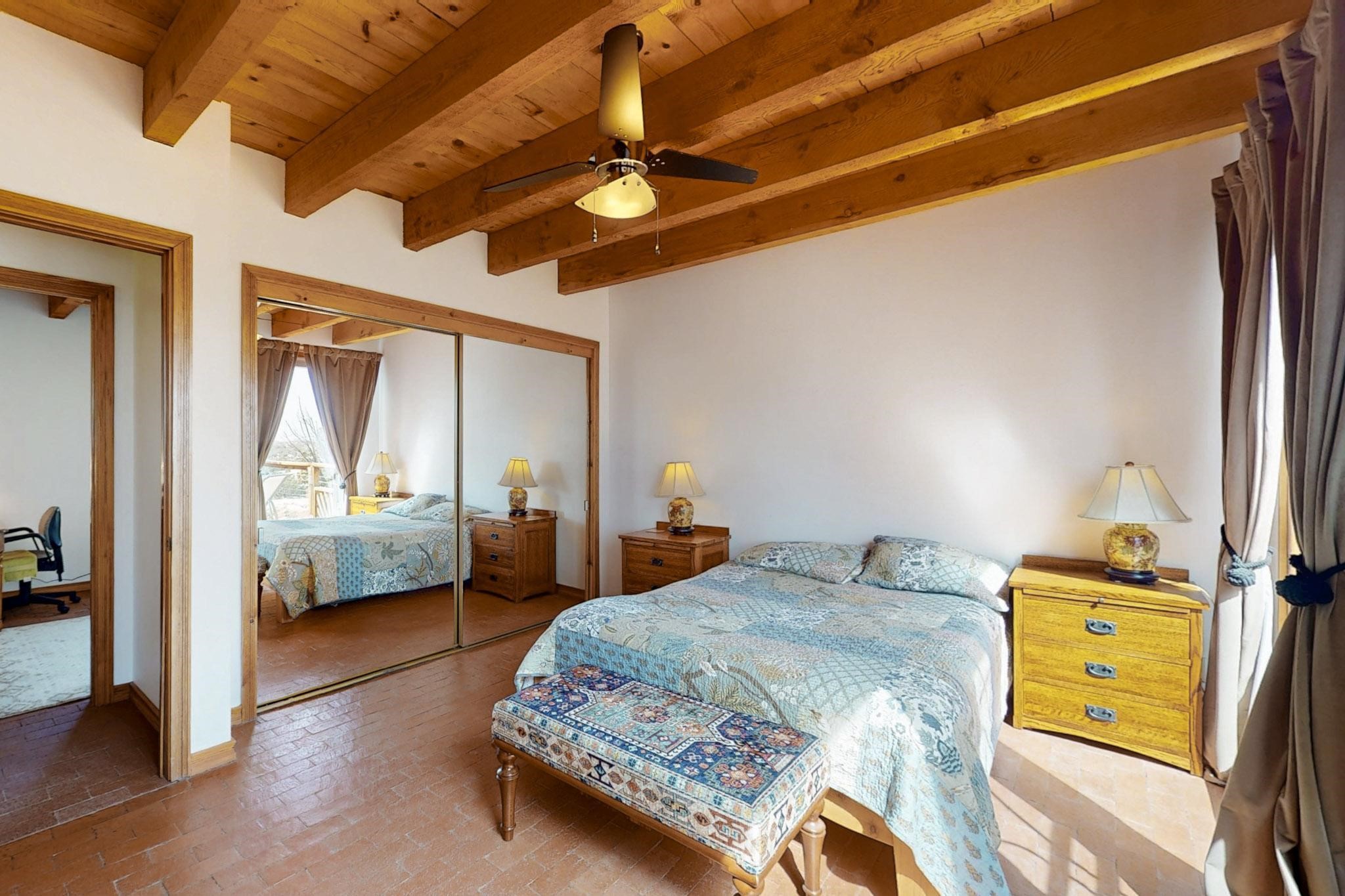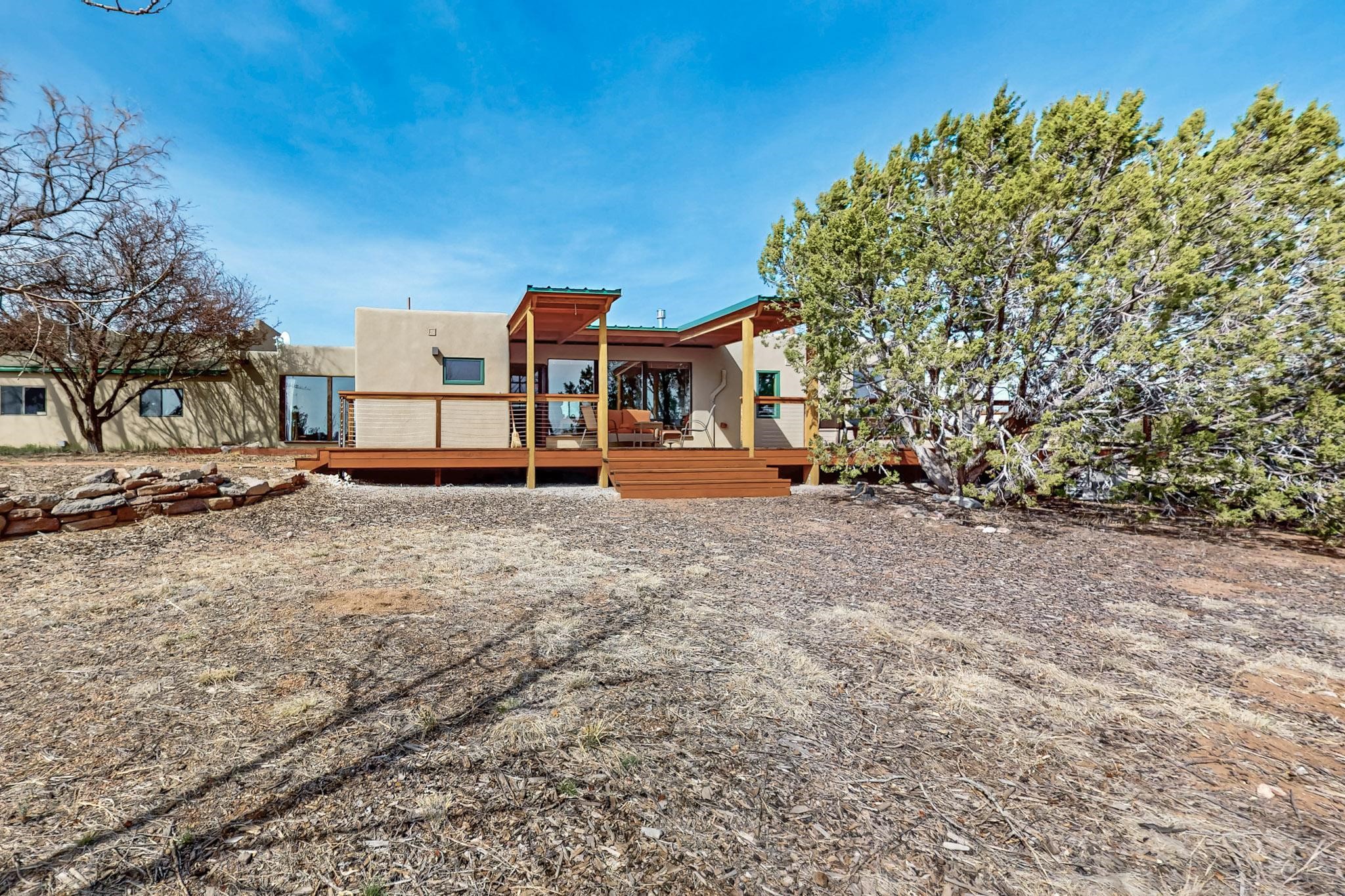 Newly priced lovely remodeled pueblo farmhouse with gleaming Saltillo tile and brick floors, beam ceilings throughout and long south facing windows for passive solar winter gain. The kitchen was remodeled, also both bathrooms were remodeled in 2021. The main bedroom bathroom has a spa like finish and includes a remodeled laundry area with a new Navien hot water heater in 2021, washer and dryer installed in 2022. Extremely flexible floor plan with two master suites, plus another guest bedroom center by the main living open plan areas. There are two mini splits to cool in the summer and 2 gas Regency stoves installed in 2015 add a cosy winter heat, serviced in 2024. A large deck was installed in 2020 for outside enjoyment, and the 2 car garage which was once used as a workshop has an old woodstove. The roof has been maintained, the private well pump was replaced in 2010, and a Nuvo water filter installed in 2021. There is a large fenced private back yard and plenty of parking space for guests. This home accesses all of Eldorado amenities, close to local shopping, the pub, schools, parks, trails, library and senior center and is only minutes into Santa Fe.