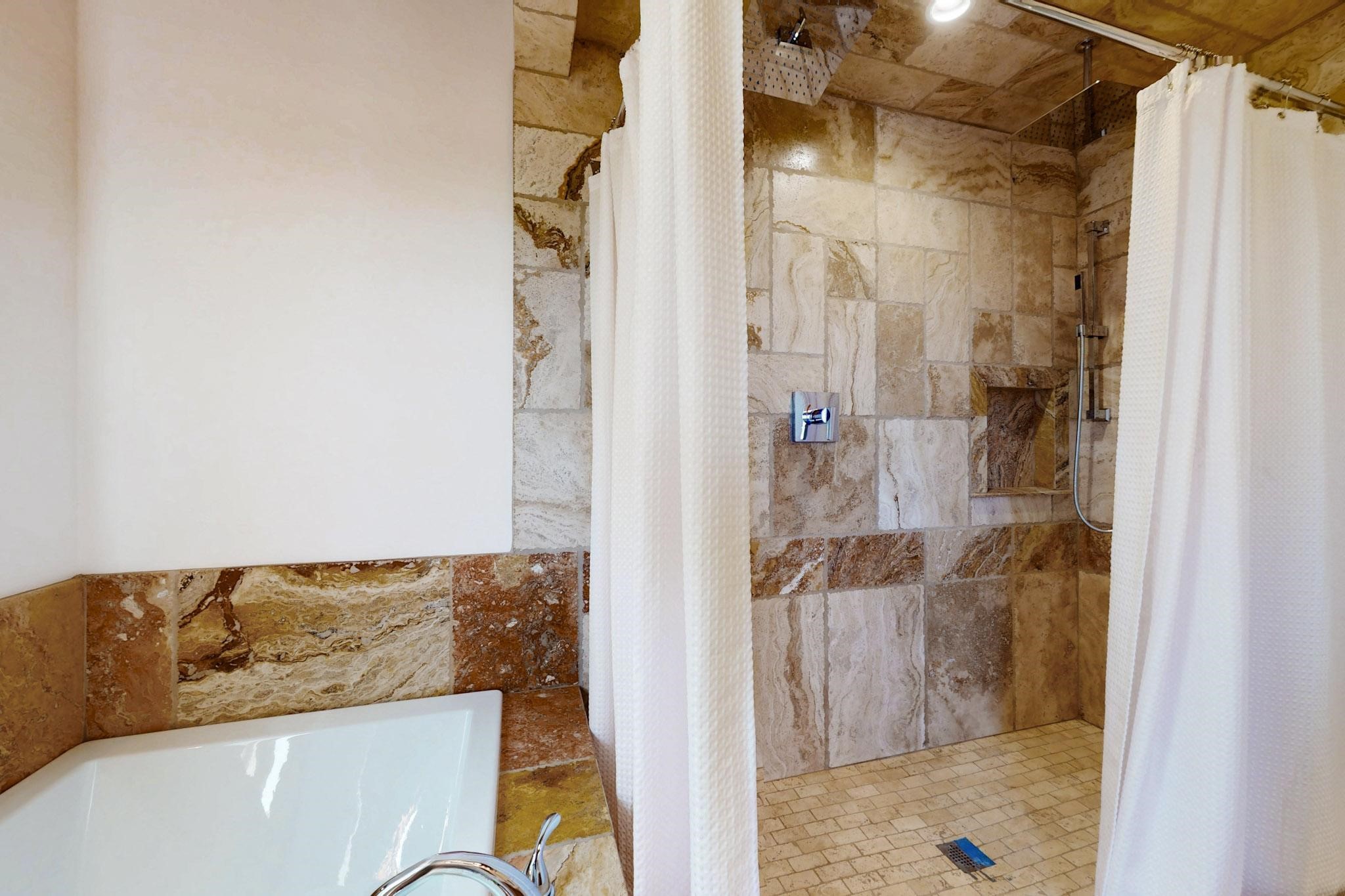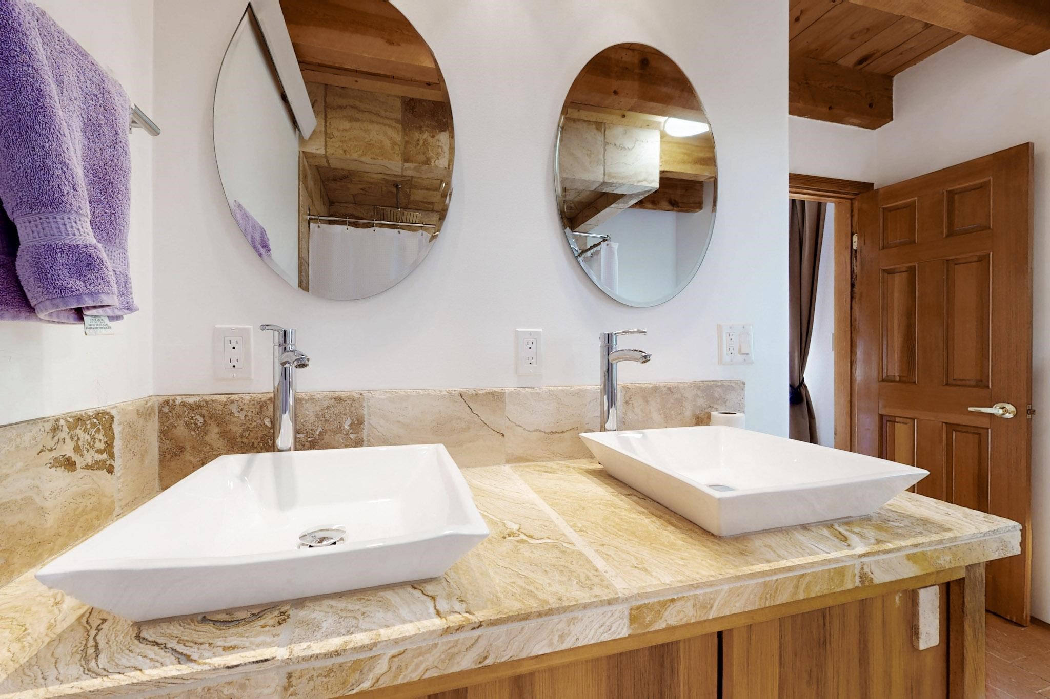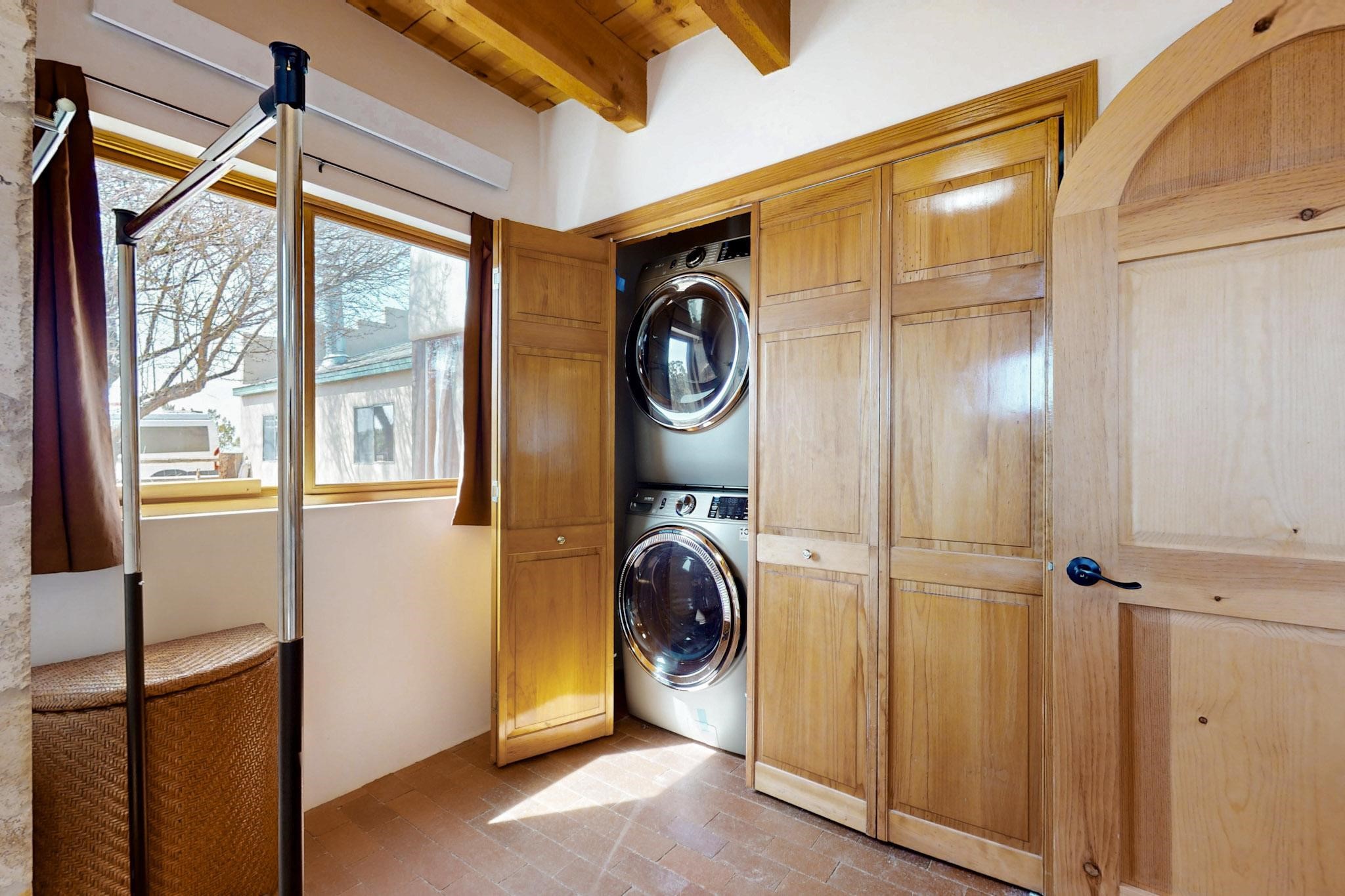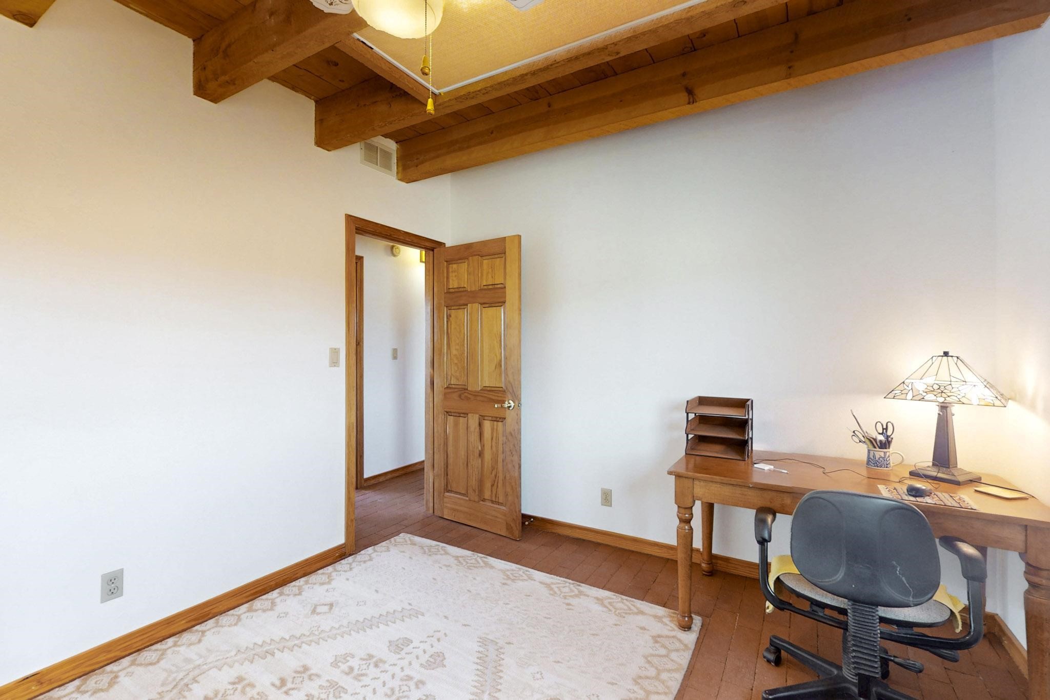 Newly priced lovely remodeled pueblo farmhouse with gleaming Saltillo tile and brick floors, beam ceilings throughout and long south facing windows for passive solar winter gain. The kitchen was remodeled, also both bathrooms were remodeled in 2021. The main bedroom bathroom has a spa like finish and includes a remodeled laundry area with a new Navien hot water heater in 2021, washer and dryer installed in 2022. Extremely flexible floor plan with two master suites, plus another guest bedroom center by the main living open plan areas. There are two mini splits to cool in the summer and 2 gas Regency stoves installed in 2015 add a cosy winter heat, serviced in 2024. A large deck was installed in 2020 for outside enjoyment, and the 2 car garage which was once used as a workshop has an old woodstove. The roof has been maintained, the private well pump was replaced in 2010, and a Nuvo water filter installed in 2021. There is a large fenced private back yard and plenty of parking space for guests. This home accesses all of Eldorado amenities, close to local shopping, the pub, schools, parks, trails, library and senior center and is only minutes into Santa Fe.