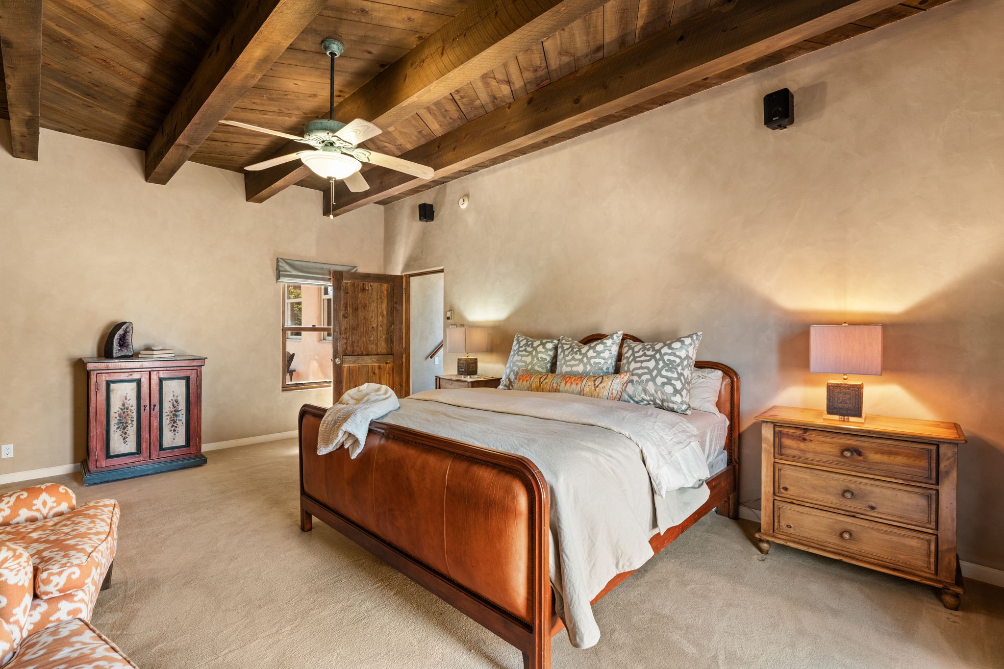 Experience timeless Southwest style in this exceptional La Mariposa home. Natural light highlights beamed ceilings, Saltillo tile, custom wood doors and hand-plastered walls. The spacious living room with a wood-burning fireplace flows seamlessly to multiple outdoor patios--perfect for entertaining or relaxing. The kitchen offers generous storage and a large walk-in pantry. A luxurious primary suite features a spa-like bath with dual sinks, soaking tub, and glass shower. A guest suite with en suite bath, plus an office with fireplace offers flexible living. Just 15 minutes to downtown Santa Fe's shopping, dining, and cultural attractions.