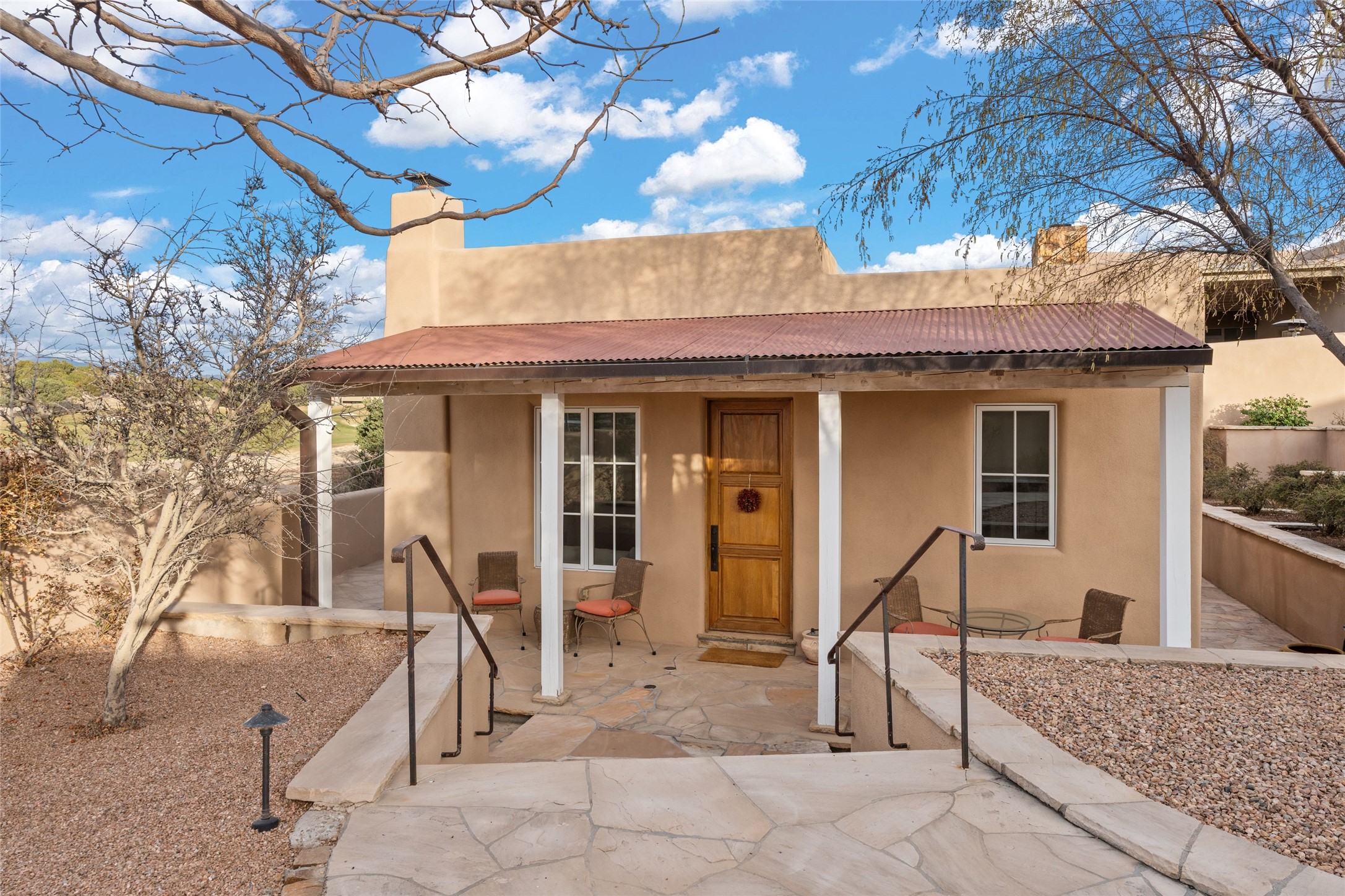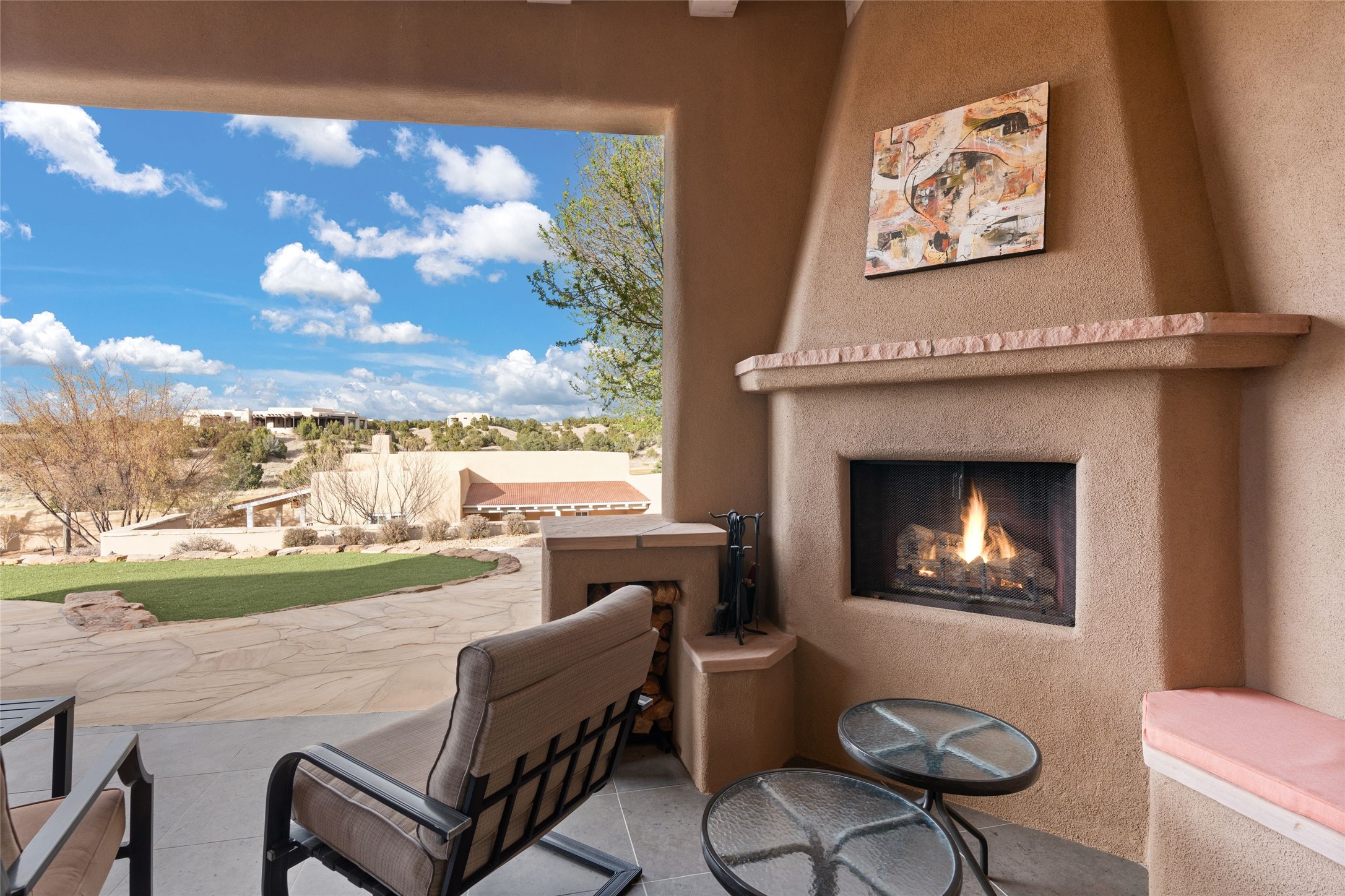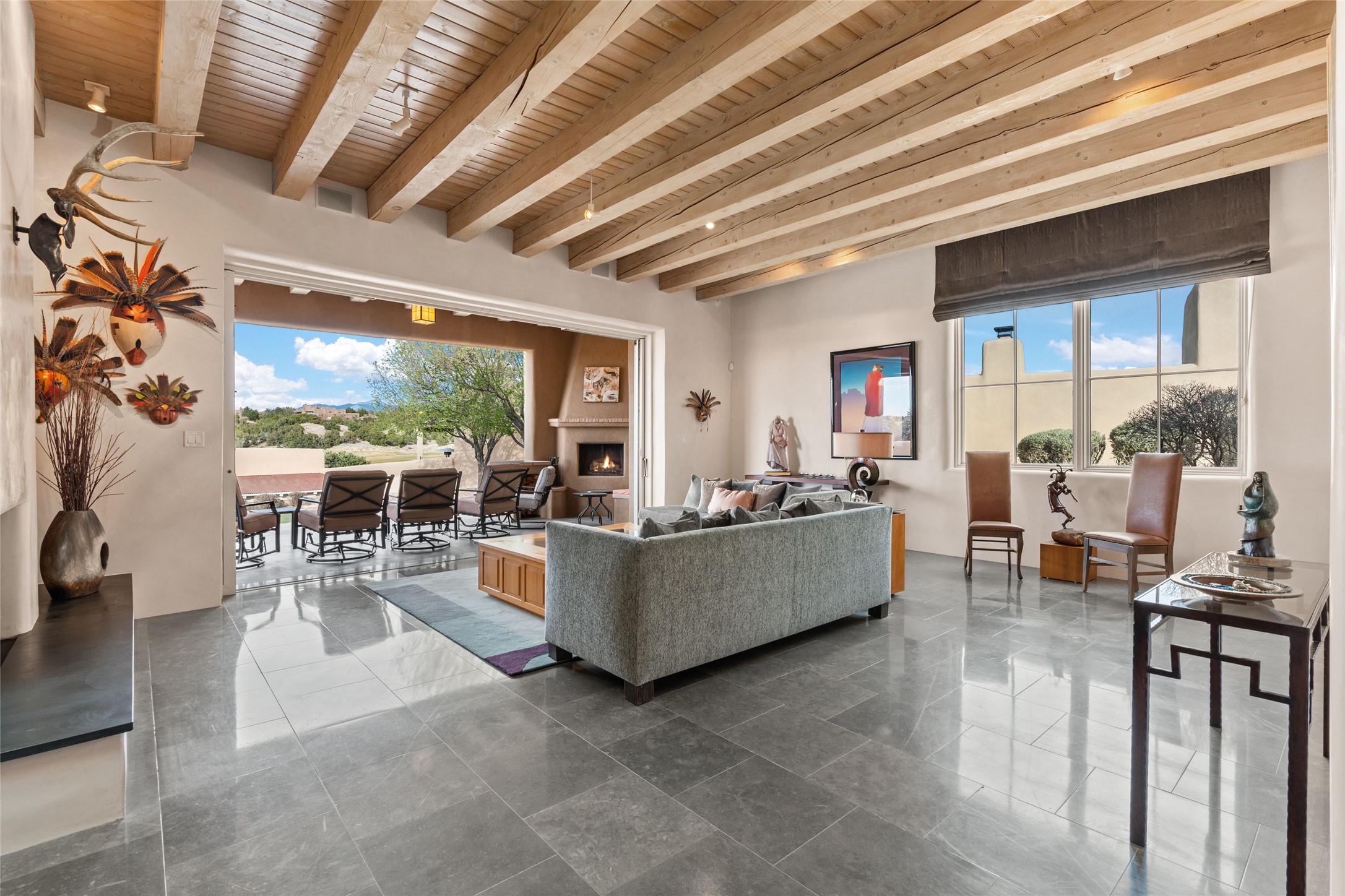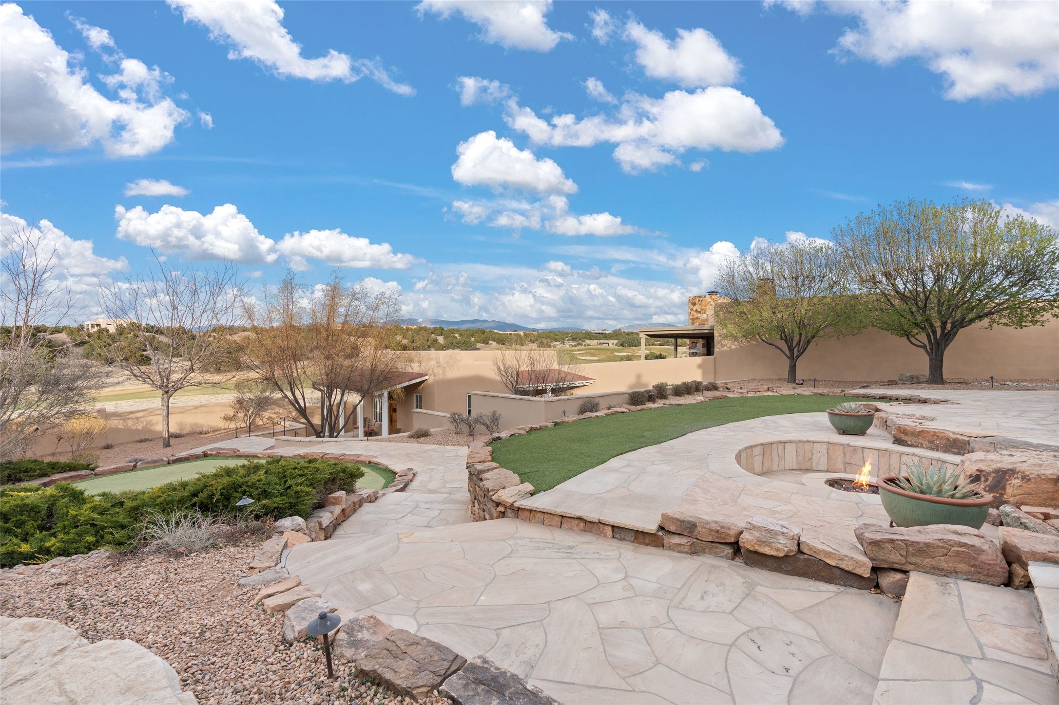Panoramic Golf Course & Sangre de Cristo Mountain views are yours at this Soft Contemporary Masterpiece in Gated Las Campanas w 3 Bedrooms + Office + Media + 3-1/2 Baths, including a Guest House & 3-Car Garage & 6 Fireplaces. Spacious Living Room features a distinctive fireplace, wet bar & access to the back portal thru 4 glass doors that vanish into the wall, creating a 16-foot opening to the view. The Dining Room has space for 8 & a Chandelier of 6 stunning glass sculptures. The impressive Media Room has 11.2 sound system, refrigerator & reclining sectional couch. Gourmet Kitchen is designed for effortless meal preparation, w Wolf gas range/oven, Vent-a-Hood, Sub-Zero Refrigerator, double dishwasher + 4' x 9' island w prep sink & Insta-Hot water. The cozy Kitchen Nook has a wood-burning fireplace, room for casual dining + 2 lounge chairs.. The Main Bedroom Suite has a wood-burning fireplace, walk-in shower, 16-foot closet & & jetted tub w golf course view. Bedroom 2 is in a separate wing, located near the Den/Office. The free-standing Guest House offers the ultimate in privacy, w a Kitchen, Living area, Bedroom & washer/dryer. This Exquisite Residence has it All - 3 Bedrooms, Office, Media, 3-car garage, free-standing Guest House & recent major Stucco maintenance & GACO Roof Coating..The Outdoor Amenities make it a self-contained resort - Synthetic Putting Green, Fire Pit, Portal for the BBQ plus Golf & Mountain Views - Live the Resort Lifestyle in Las Campanas!