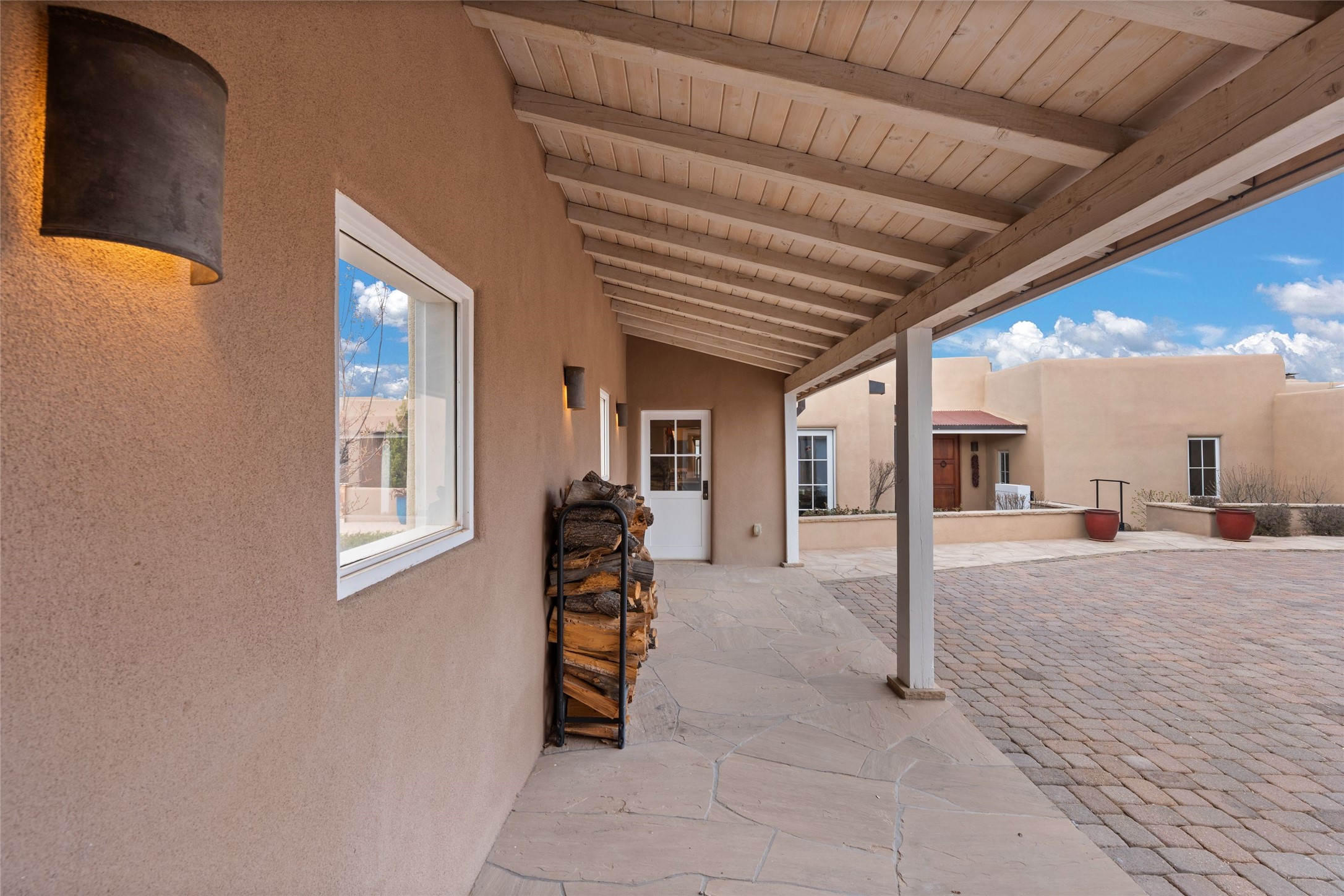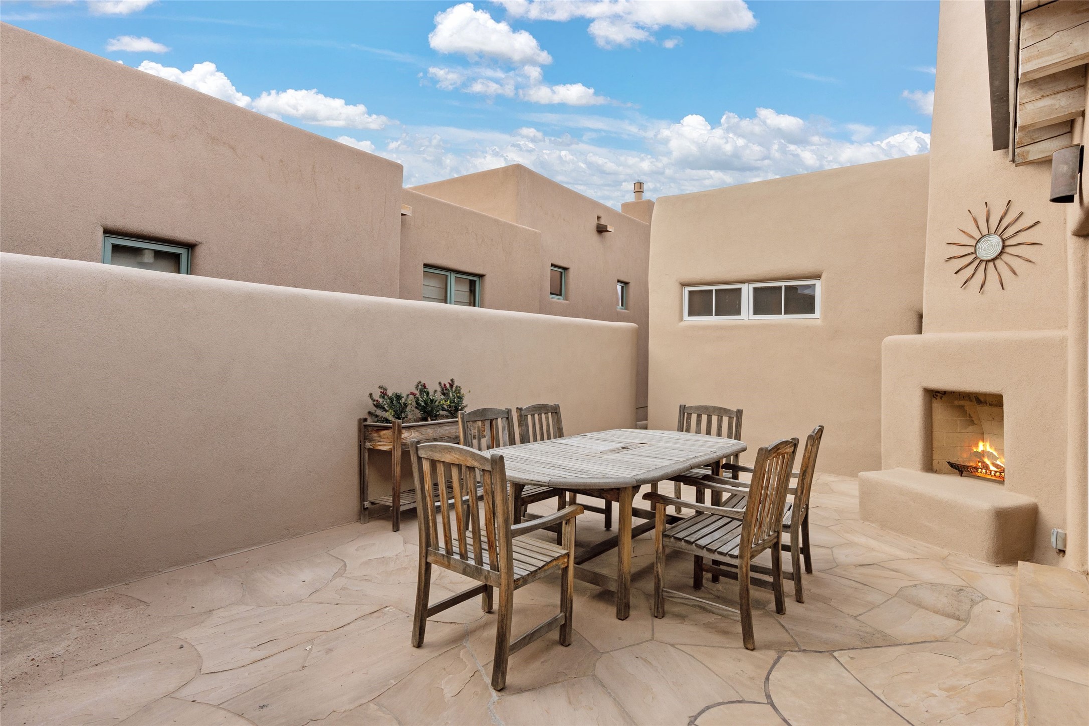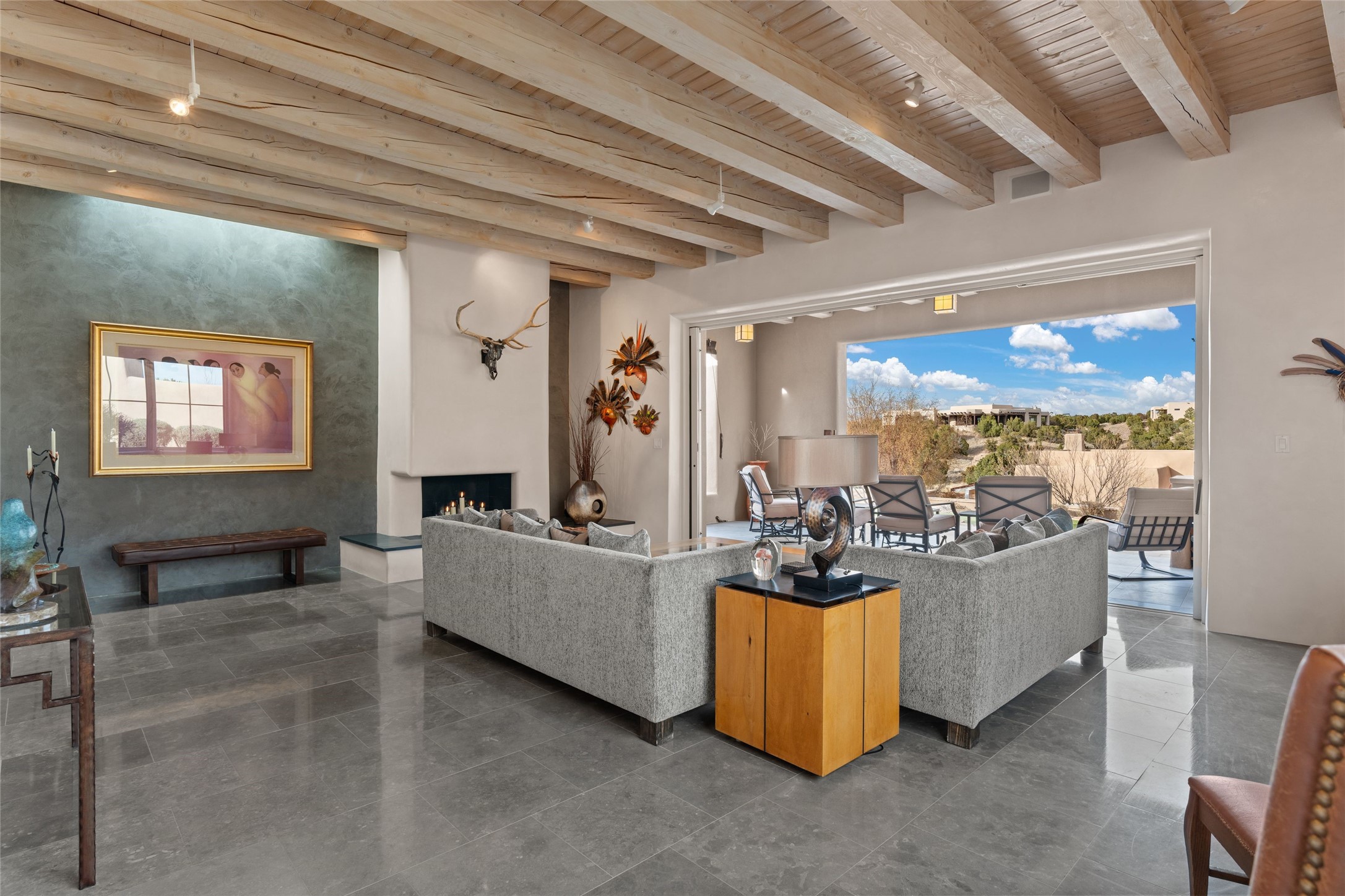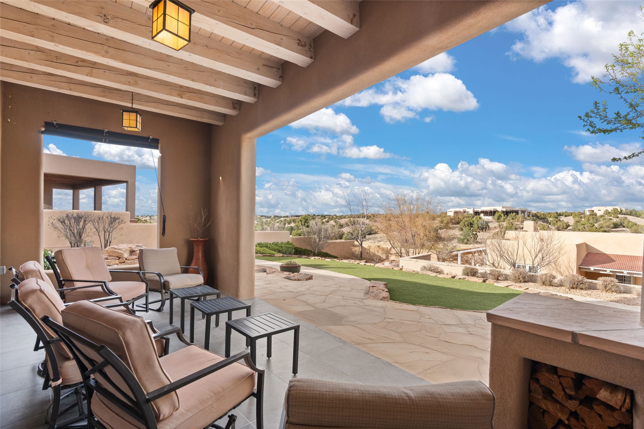 Panoramic Golf Course & Sangre de Cristo Mountain views are yours at this Soft Contemporary Masterpiece in Gated Las Campanas w 3 Bedrooms + Office + Media + 3-1/2 Baths, including a Guest House & 3-Car Garage & 6 Fireplaces. Spacious Living Room features a distinctive fireplace, wet bar & access to the back portal thru 4 glass doors that vanish into the wall, creating a 16-foot opening to the view. The Dining Room has space for 8 & a Chandelier of 6 stunning glass sculptures. The impressive Media Room has 11.2 sound system, refrigerator & reclining sectional couch. Gourmet Kitchen is designed for effortless meal preparation, w Wolf gas range/oven, Vent-a-Hood, Sub-Zero Refrigerator, double dishwasher + 4' x 9' island w prep sink & Insta-Hot water. The cozy Kitchen Nook has a wood-burning fireplace, room for casual dining + 2 lounge chairs.. The Main Bedroom Suite has a wood-burning fireplace, walk-in shower, 16-foot closet & & jetted tub w golf course view. Bedroom 2 is in a separate wing, located near the Den/Office. The free-standing Guest House offers the ultimate in privacy, w a Kitchen, Living area, Bedroom & washer/dryer. This Exquisite Residence has it All - 3 Bedrooms, Office, Media, 3-car garage, free-standing Guest House & recent major Stucco maintenance & GACO Roof Coating..The Outdoor Amenities make it a self-contained resort - Synthetic Putting Green, Fire Pit, Portal for the BBQ plus Golf & Mountain Views - Live the Resort Lifestyle in Las Campanas!