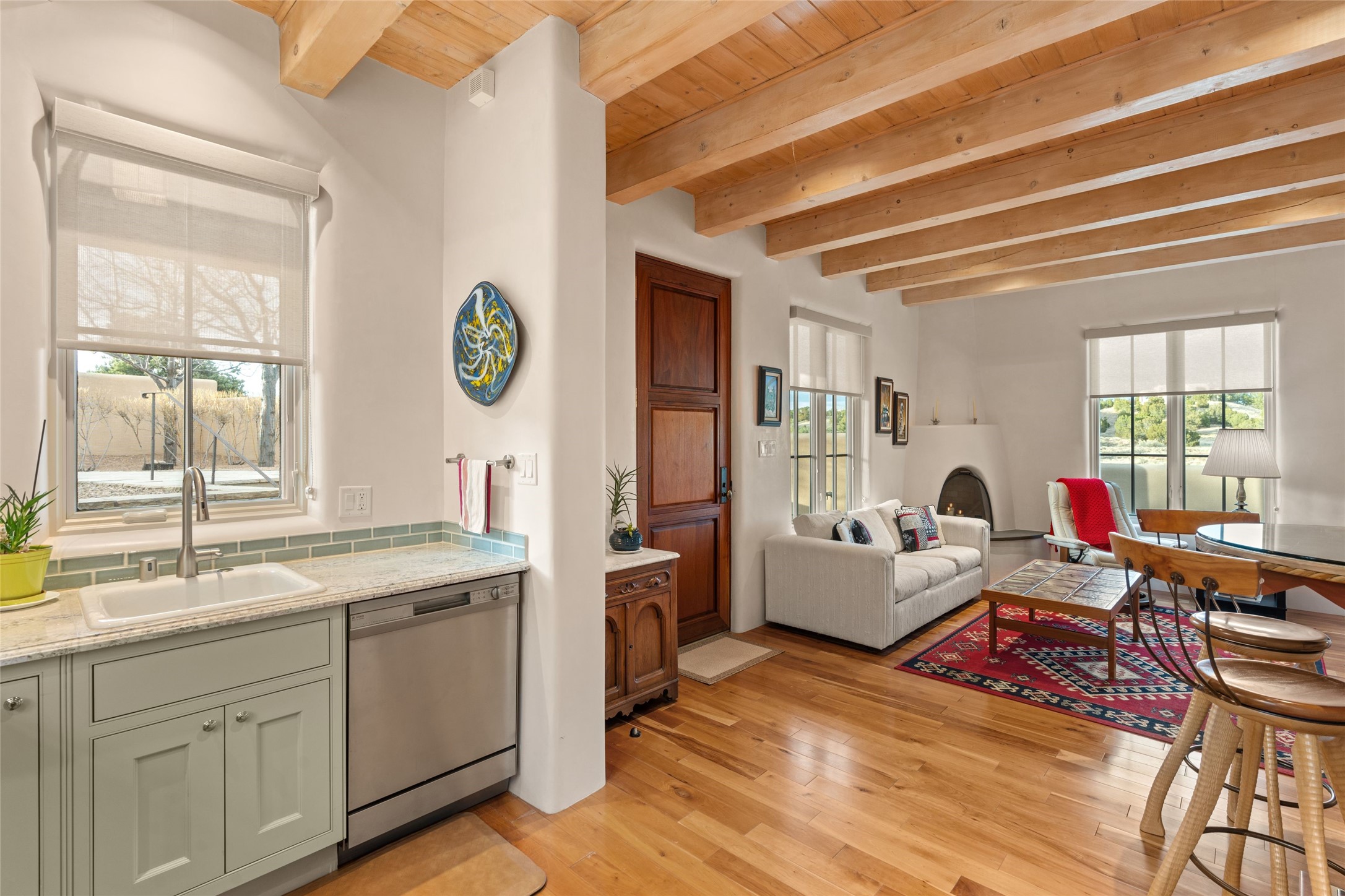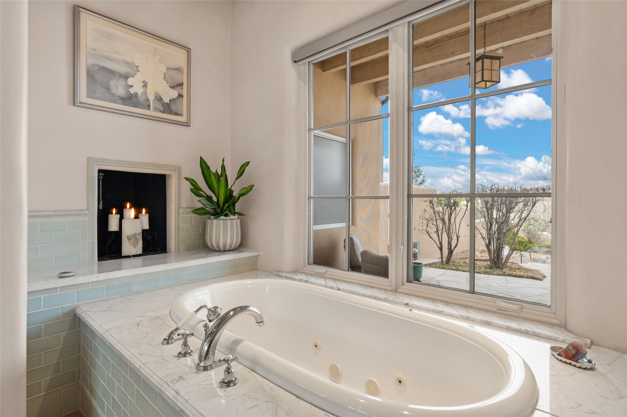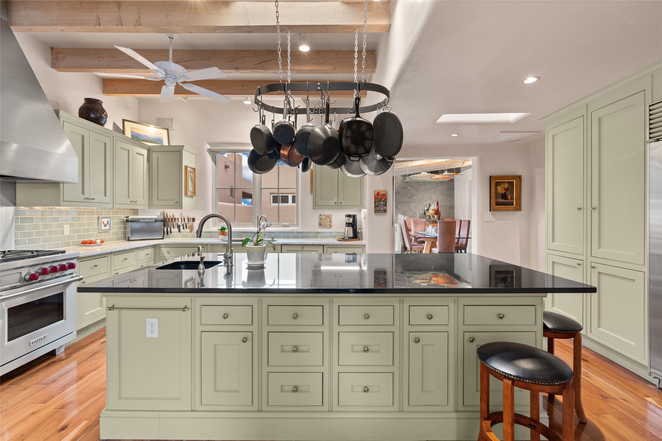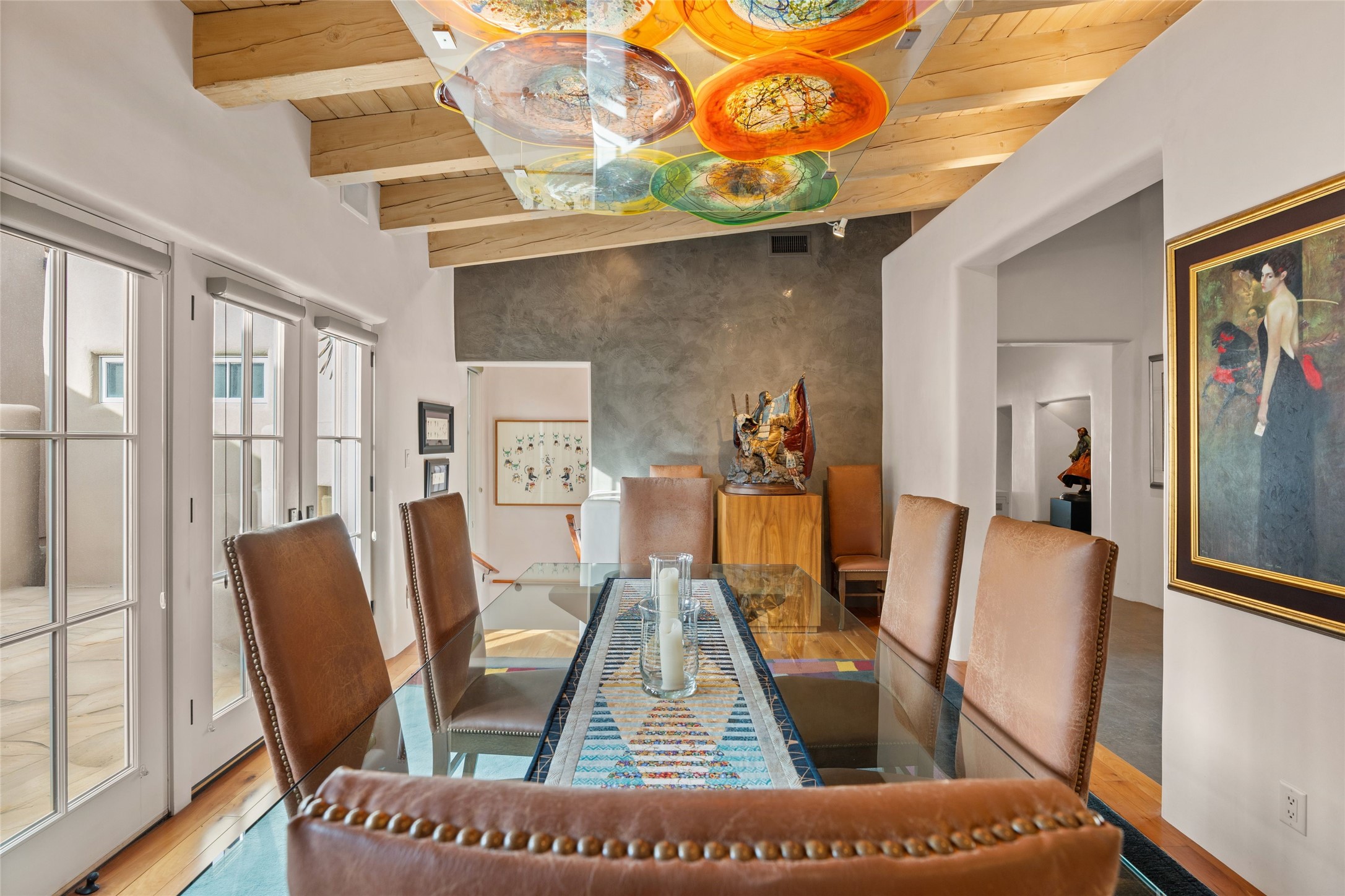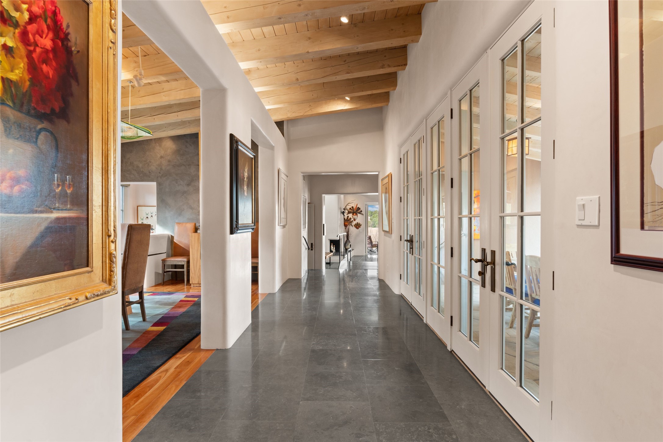 Panoramic Golf Course & Sangre de Cristo Mountain views are yours at this Soft Contemporary Masterpiece in Gated Las Campanas w 3 Bedrooms + Office + Media + 3-1/2 Baths, including a Guest House & 3-Car Garage & 6 Fireplaces. Spacious Living Room features a distinctive fireplace, wet bar & access to the back portal thru 4 glass doors that vanish into the wall, creating a 16-foot opening to the view. The Dining Room has space for 8 & a Chandelier of 6 stunning glass sculptures. The impressive Media Room has 11.2 sound system, refrigerator & reclining sectional couch. Gourmet Kitchen is designed for effortless meal preparation, w Wolf gas range/oven, Vent-a-Hood, Sub-Zero Refrigerator, double dishwasher + 4' x 9' island w prep sink & Insta-Hot water. The cozy Kitchen Nook has a wood-burning fireplace, room for casual dining + 2 lounge chairs.. The Main Bedroom Suite has a wood-burning fireplace, walk-in shower, 16-foot closet & & jetted tub w golf course view. Bedroom 2 is in a separate wing, located near the Den/Office. The free-standing Guest House offers the ultimate in privacy, w a Kitchen, Living area, Bedroom & washer/dryer. This Exquisite Residence has it All - 3 Bedrooms, Office, Media, 3-car garage, free-standing Guest House & recent major Stucco maintenance & GACO Roof Coating..The Outdoor Amenities make it a self-contained resort - Synthetic Putting Green, Fire Pit, Portal for the BBQ plus Golf & Mountain Views - Live the Resort Lifestyle in Las Campanas!