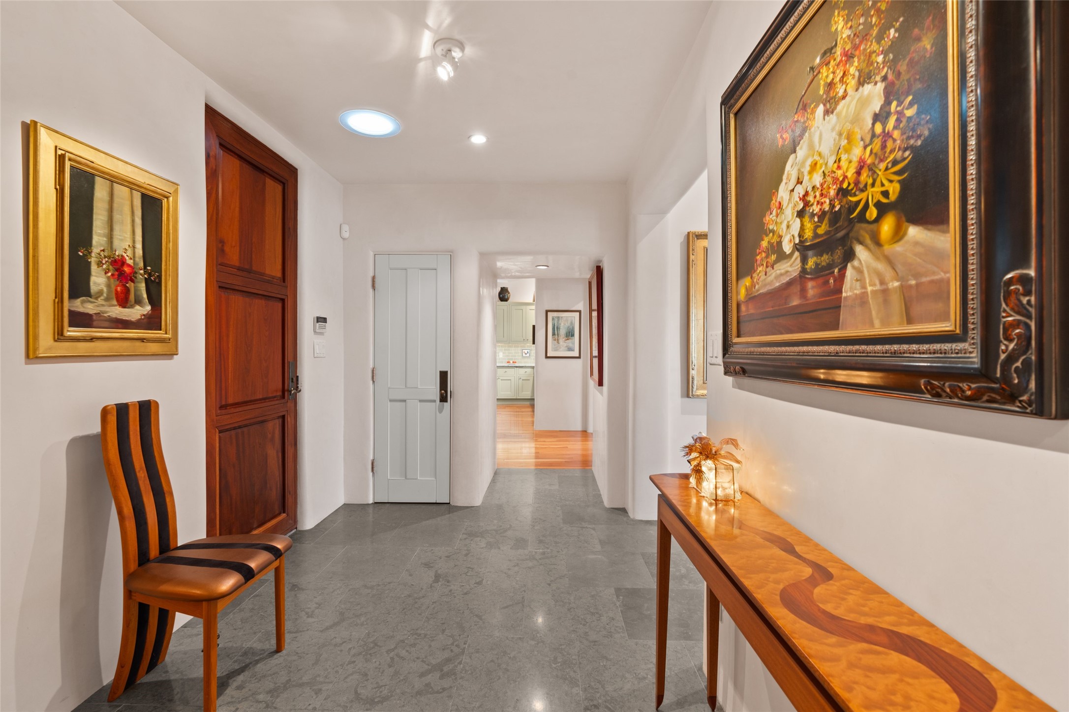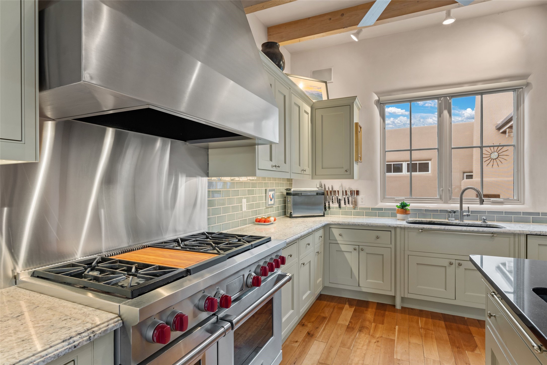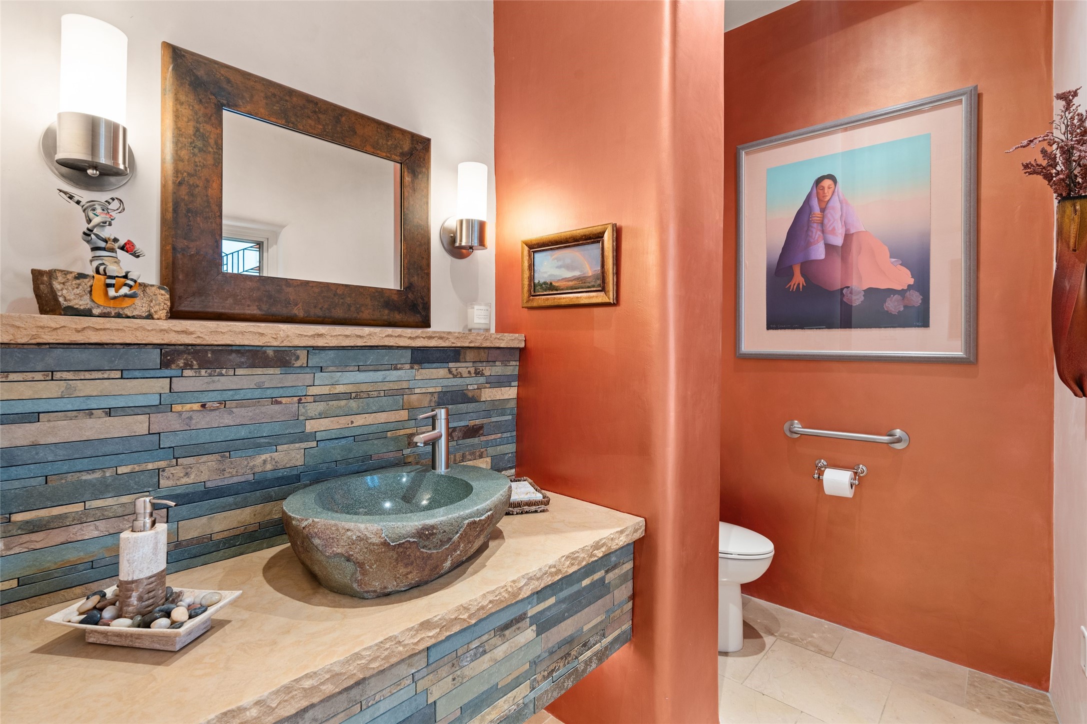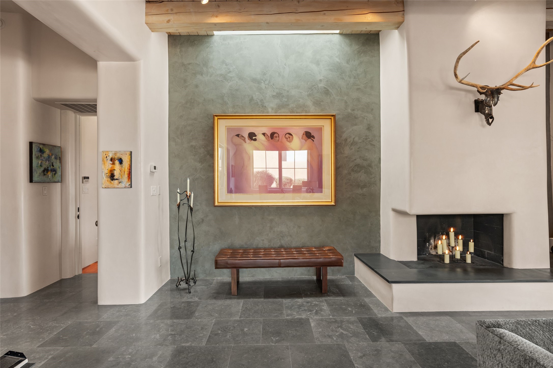 Panoramic Golf Course & Sangre de Cristo Mountain views are yours at this Soft Contemporary Masterpiece in Gated Las Campanas w 3 Bedrooms + Office + Media + 3-1/2 Baths, including a Guest House & 3-Car Garage & 6 Fireplaces. Spacious Living Room features a distinctive fireplace, wet bar & access to the back portal thru 4 glass doors that vanish into the wall, creating a 16-foot opening to the view. The Dining Room has space for 8 & a Chandelier of 6 stunning glass sculptures. The impressive Media Room has 11.2 sound system, refrigerator & reclining sectional couch. Gourmet Kitchen is designed for effortless meal preparation, w Wolf gas range/oven, Vent-a-Hood, Sub-Zero Refrigerator, double dishwasher + 4' x 9' island w prep sink & Insta-Hot water. The cozy Kitchen Nook has a wood-burning fireplace, room for casual dining + 2 lounge chairs.. The Main Bedroom Suite has a wood-burning fireplace, walk-in shower, 16-foot closet & & jetted tub w golf course view. Bedroom 2 is in a separate wing, located near the Den/Office. The free-standing Guest House offers the ultimate in privacy, w a Kitchen, Living area, Bedroom & washer/dryer. This Exquisite Residence has it All - 3 Bedrooms, Office, Media, 3-car garage, free-standing Guest House & recent major Stucco maintenance & GACO Roof Coating..The Outdoor Amenities make it a self-contained resort - Synthetic Putting Green, Fire Pit, Portal for the BBQ plus Golf & Mountain Views - Live the Resort Lifestyle in Las Campanas!