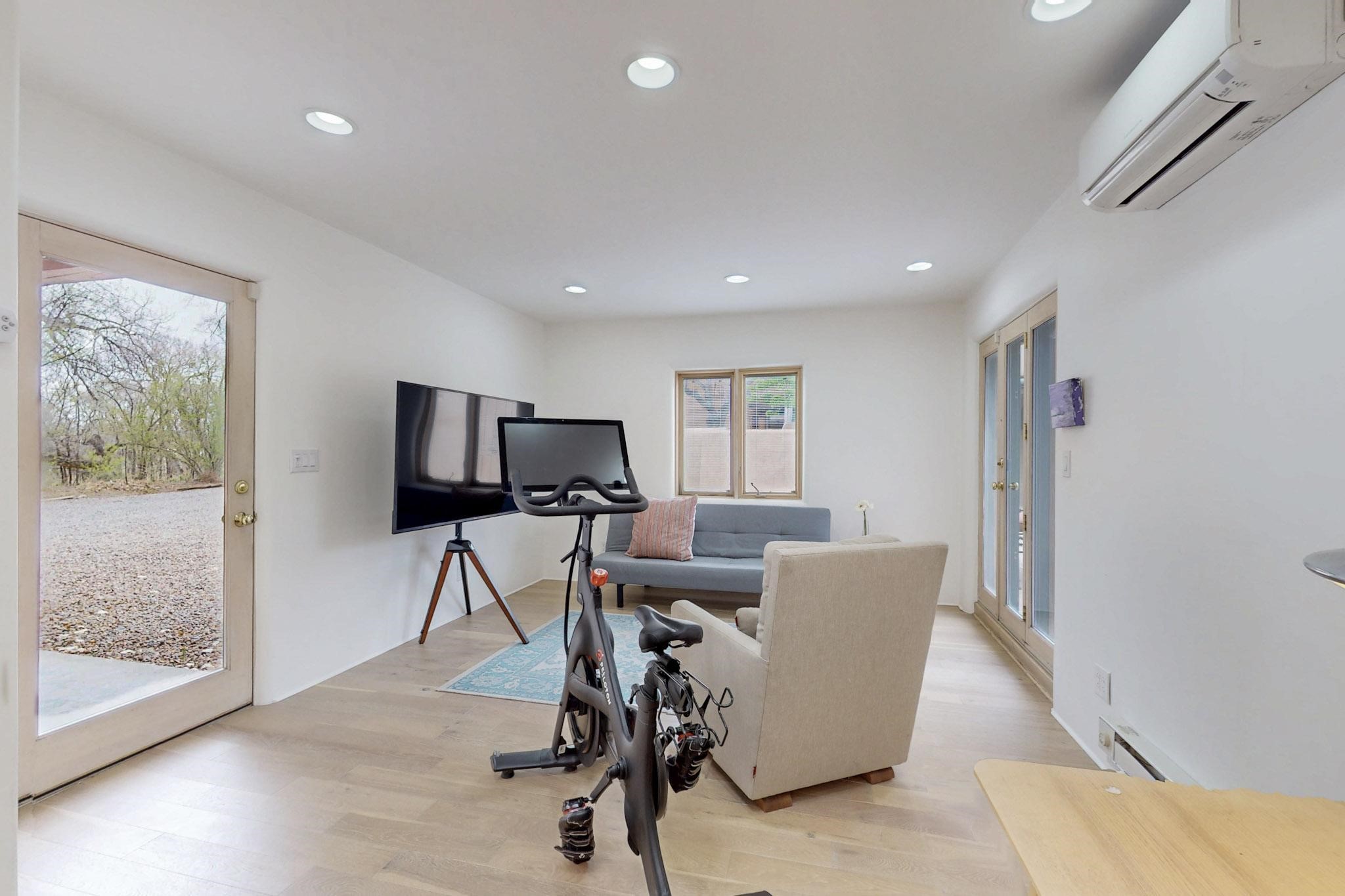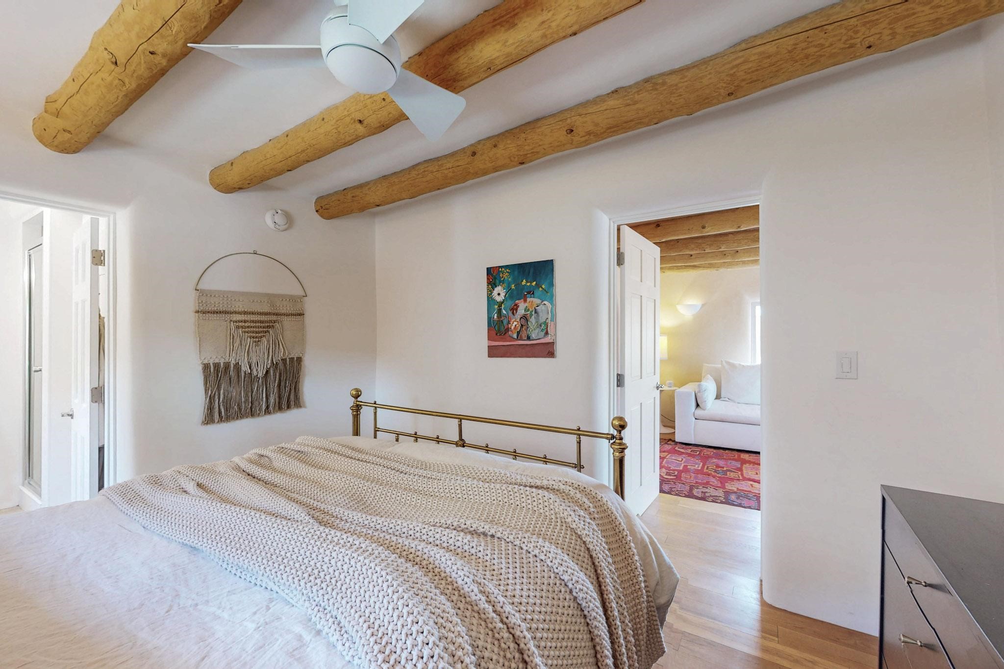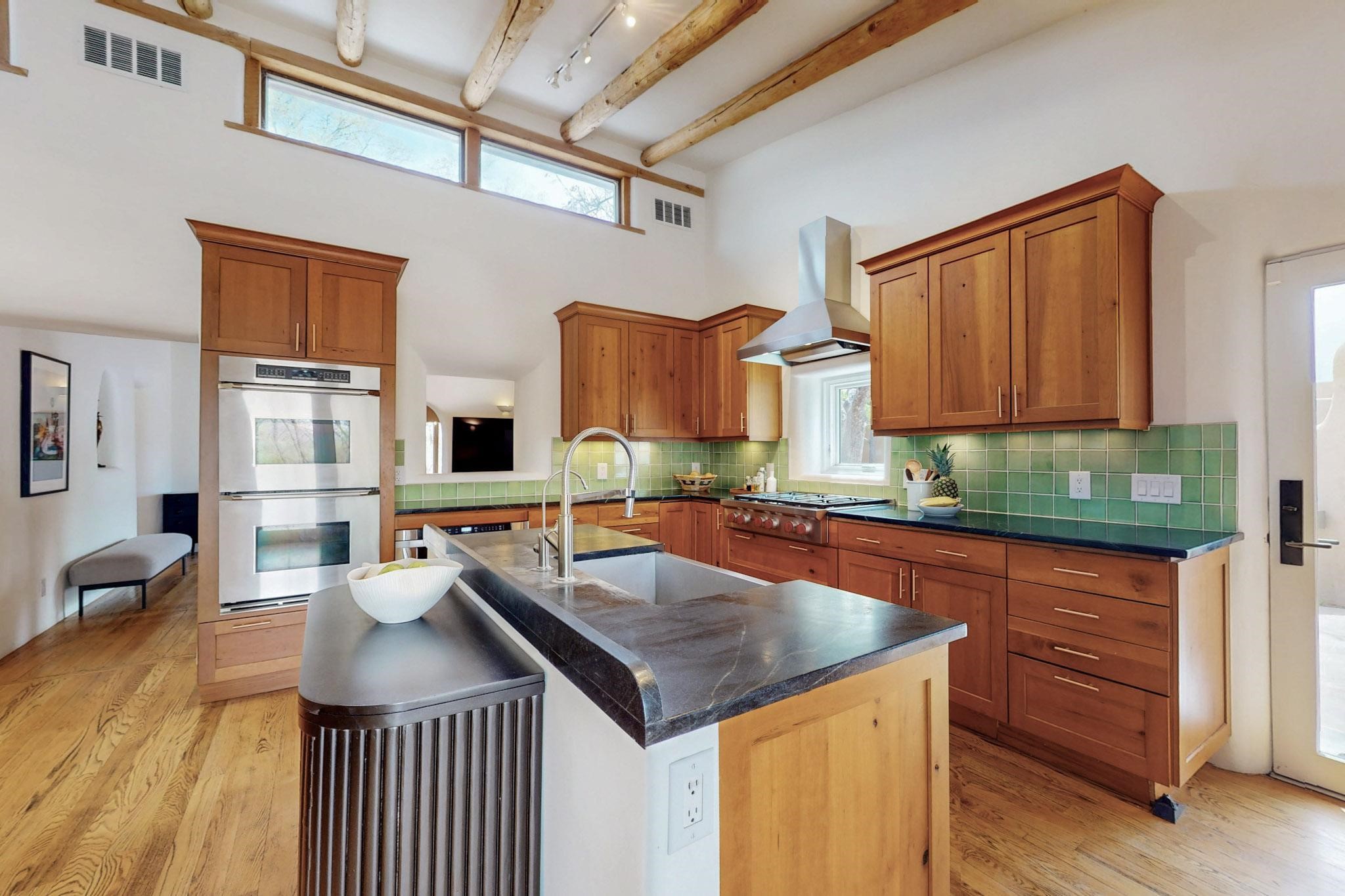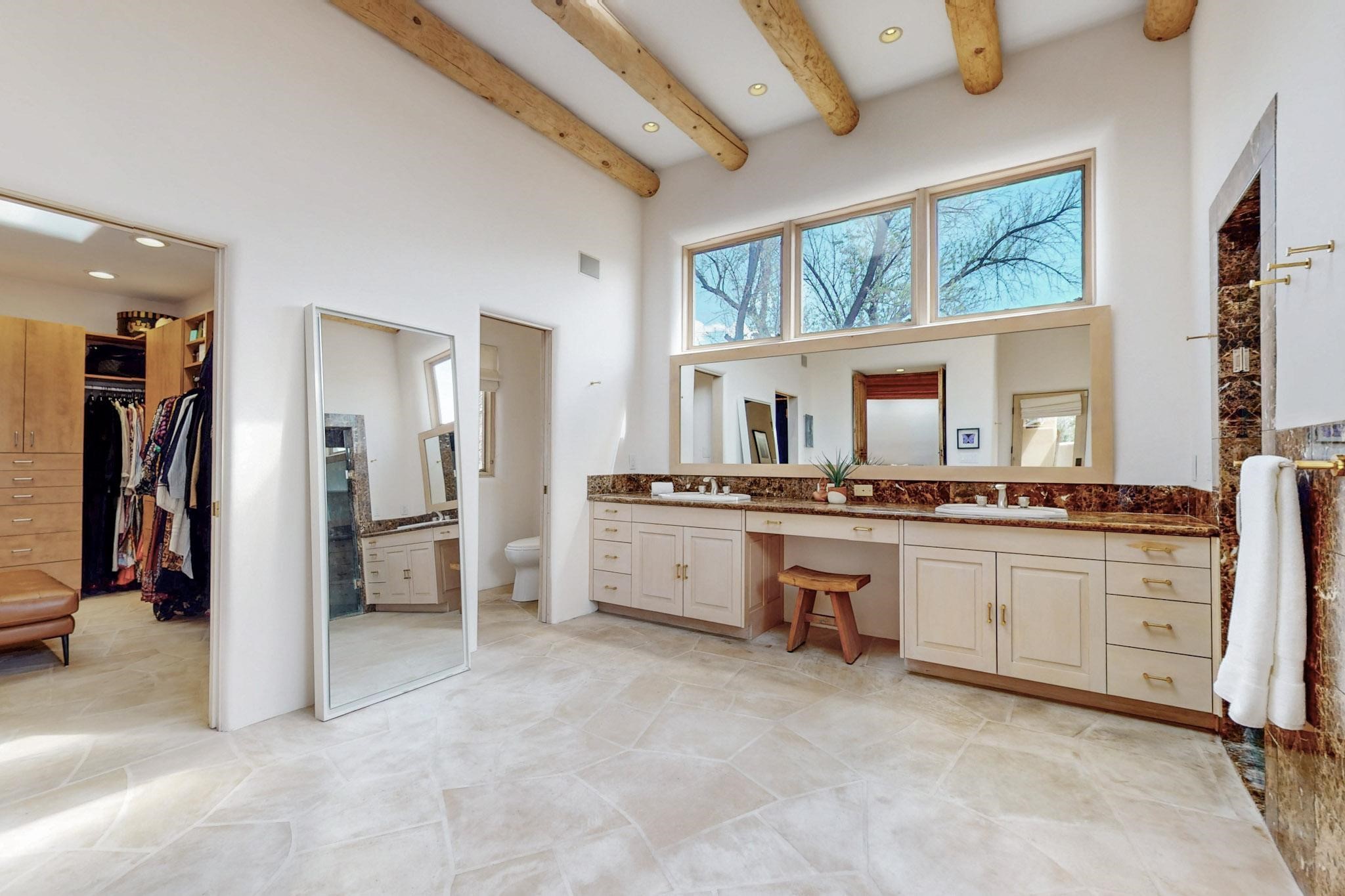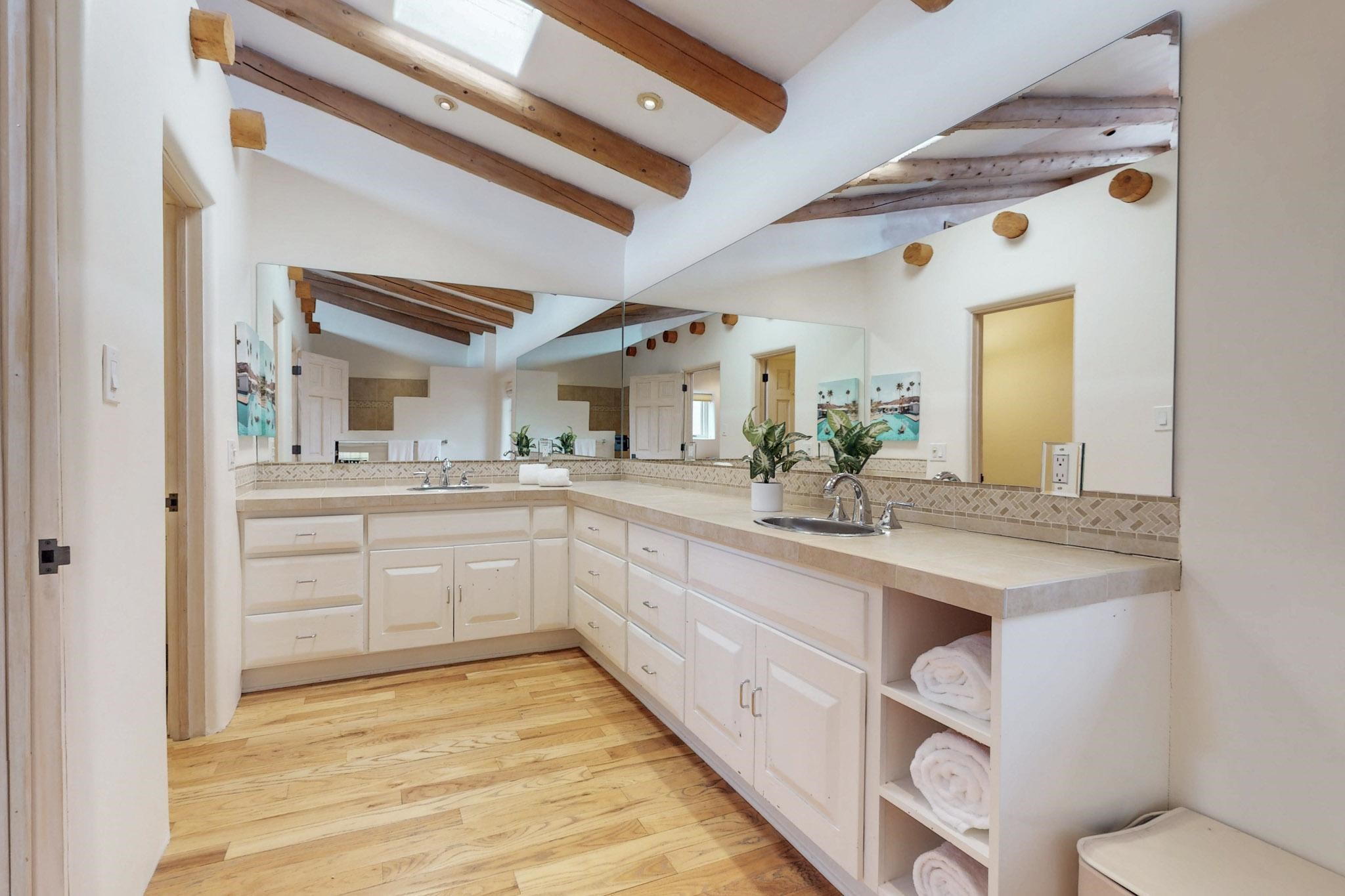 Situated on 2.05 fertile acres in the Nambe Valley lies Casa Alegria. With easy access to both Santa Fe and Los Alamos, this magnificent property boasts authentic Pueblo-style craftsmanship throughout. Surrounding the premiere home on this compound, you'll enjoy courtyards, portals, fireplaces, patios, and landscaped gardens, with mature trees. The interior of this expansive home offers a gourmet kitchen, hardwood and flagstone flooring, viga ceilings, and kiva fireplaces. In its expansive primary bedroom, you'll enjoy a spa bath, walk-in closet, and a spacious patio with its own swimming pool. Additionally, the one-bedroom guesthouse with equally impressive craftsmanship offers a dining area, bathroom, and kitchenette. Adjacent to the oversized 2-car garage is a bonus studio or office space, also with its own bath. Welcome to this spectacular northern New Mexico property.