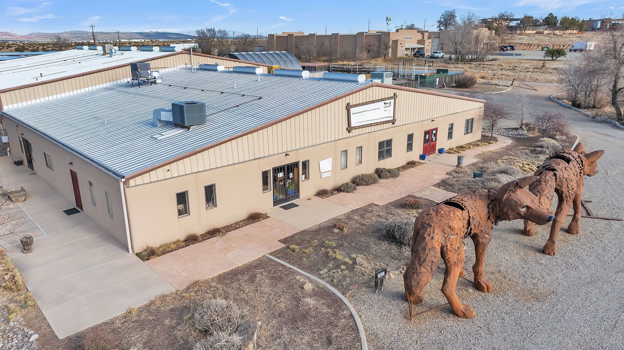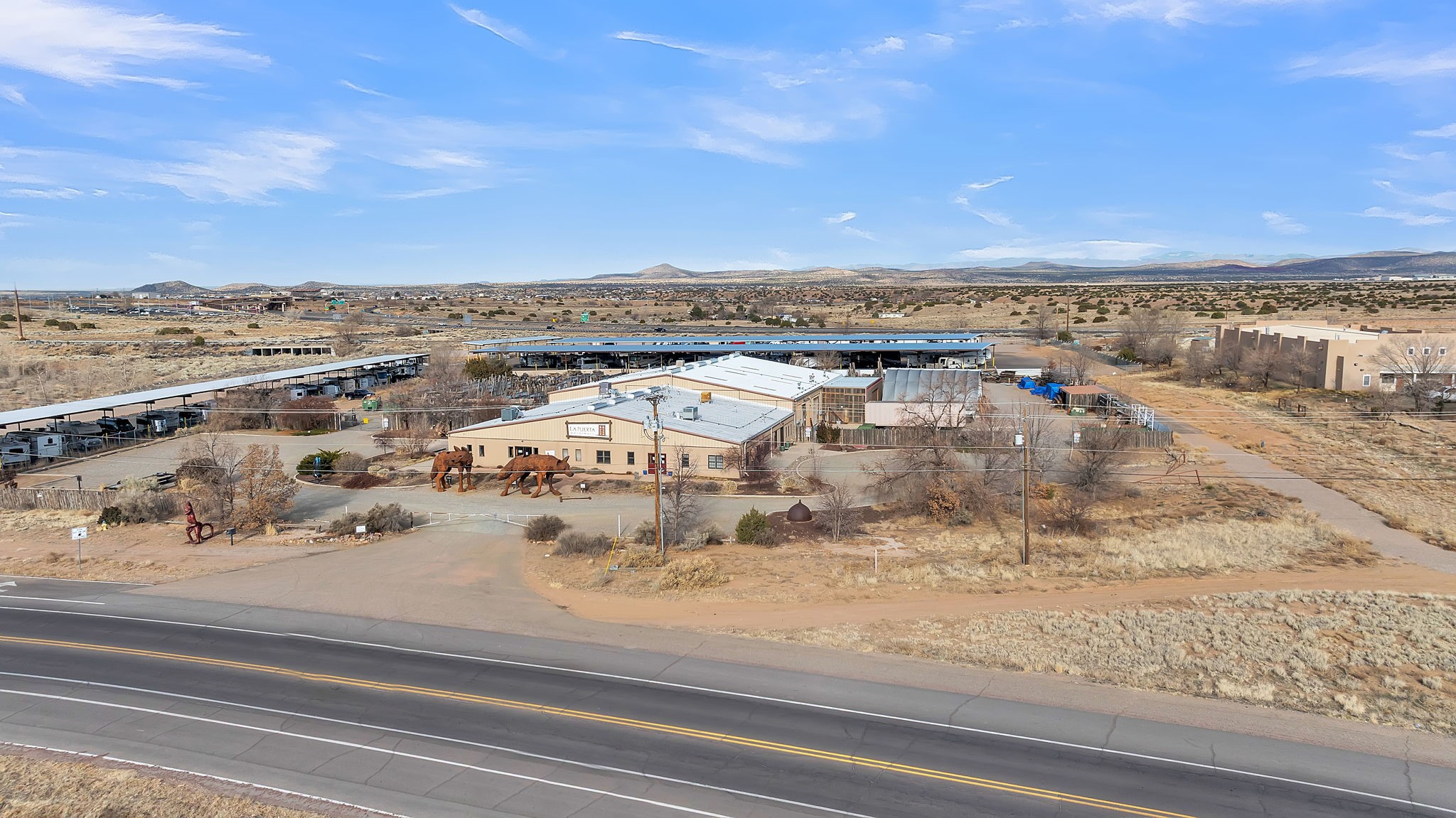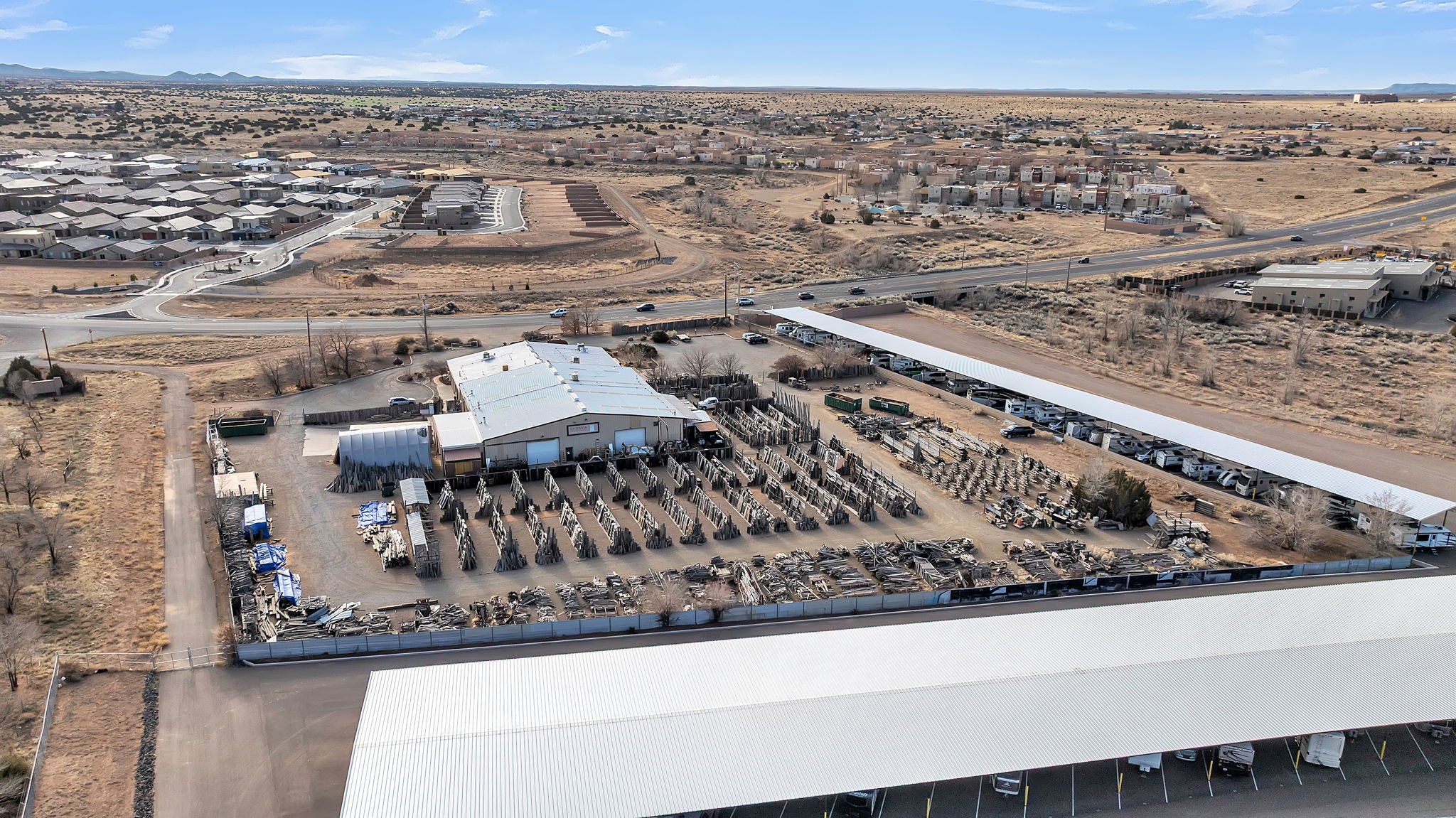 Unlock the Potential of This Prime 4.01-Acre Commercial Property! Situated just outside the Santa Fe city limits, this property delivers the flexibility, space, and strategic location to bring your vision to reality. With frontage directly on NM-14 and conveniently located less than a mile from I-25, this expansive 4.01-acre commercial property offers unbeatable visibility and accessibility. The impressive 19,140+/- square foot building features soaring ceilings (approximately 20 feet) and a versatile layout that accommodates a wide range of uses--from manufacturing and warehousing to dining, retail, art entertainment venues and more. Currently functioning as a woodworking and metalworking facility, the space includes:Showrooms: Ideal for displaying products or services.Private Office Spaces: Designed for efficiency and privacy.Loading Dock with Roll-Up Doors: Ensuring straightforward logistics and delivery.Restroom Facilities and Break Rooms: Providing convenience for staff and visitors.Storage Areas: Perfect for inventory and equipment.The entire property is easily accessible, complete with a fenced storage yard at the rear of the building offering additional utility. With ample parking space, this location can accommodate a significant number of vehicles. Strategically situated just 5 miles from the Santa Fe Regional Airport, this property provides excellent opportunities for business expansion, logistics, and connectivity to wider markets. Located within a Planned Development District -- a vibrant community of thriving establishments, including the Santa Fe Brewing Company, Rancho Viejo, Colibri, Turquoise Trail, and Valle Vista residential subdivisions, as well as the Bisbee Court Industrial Park. OWNER FINANCING AVAILABLE. Contact us today for more information or to schedule a visit.