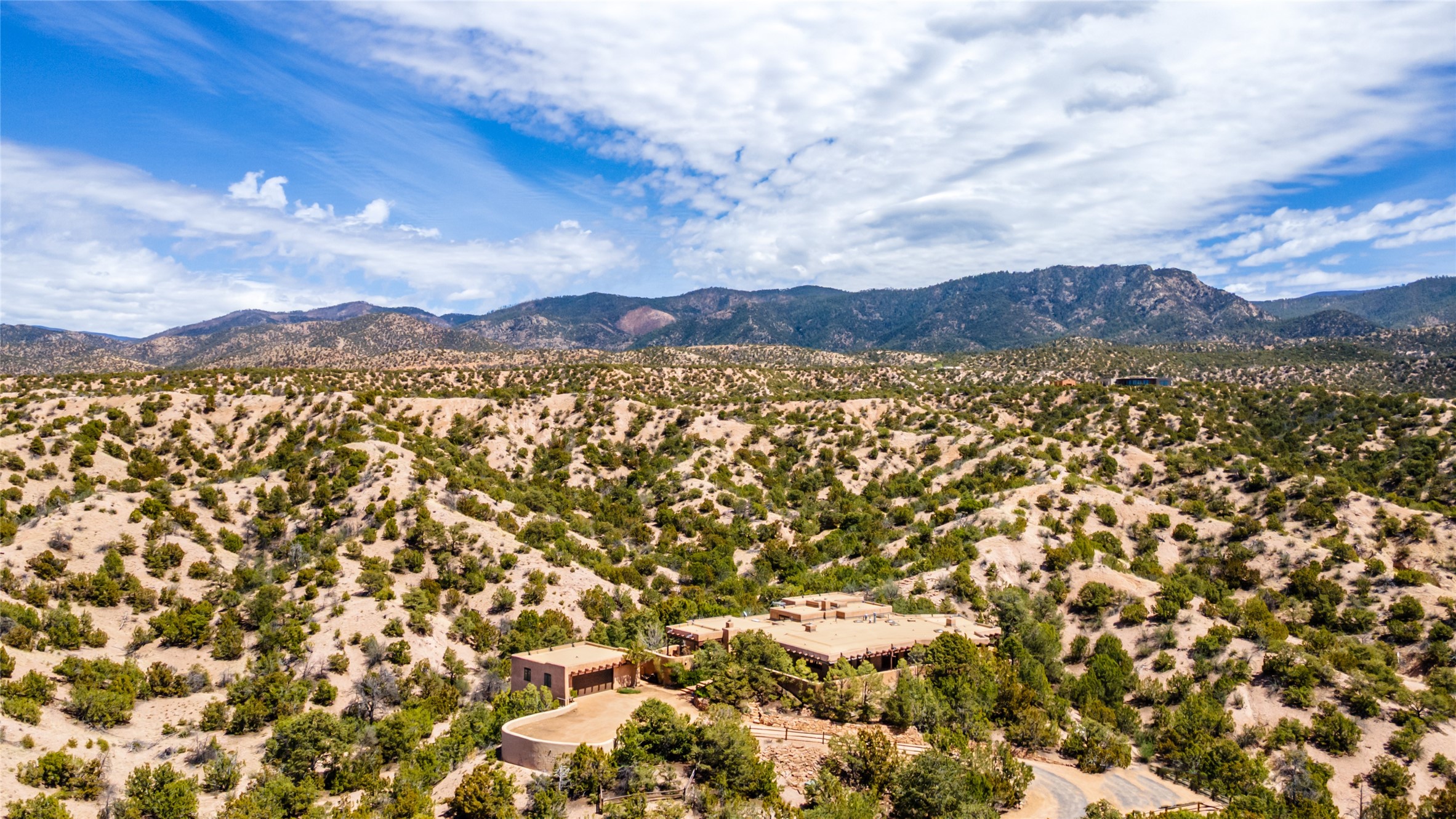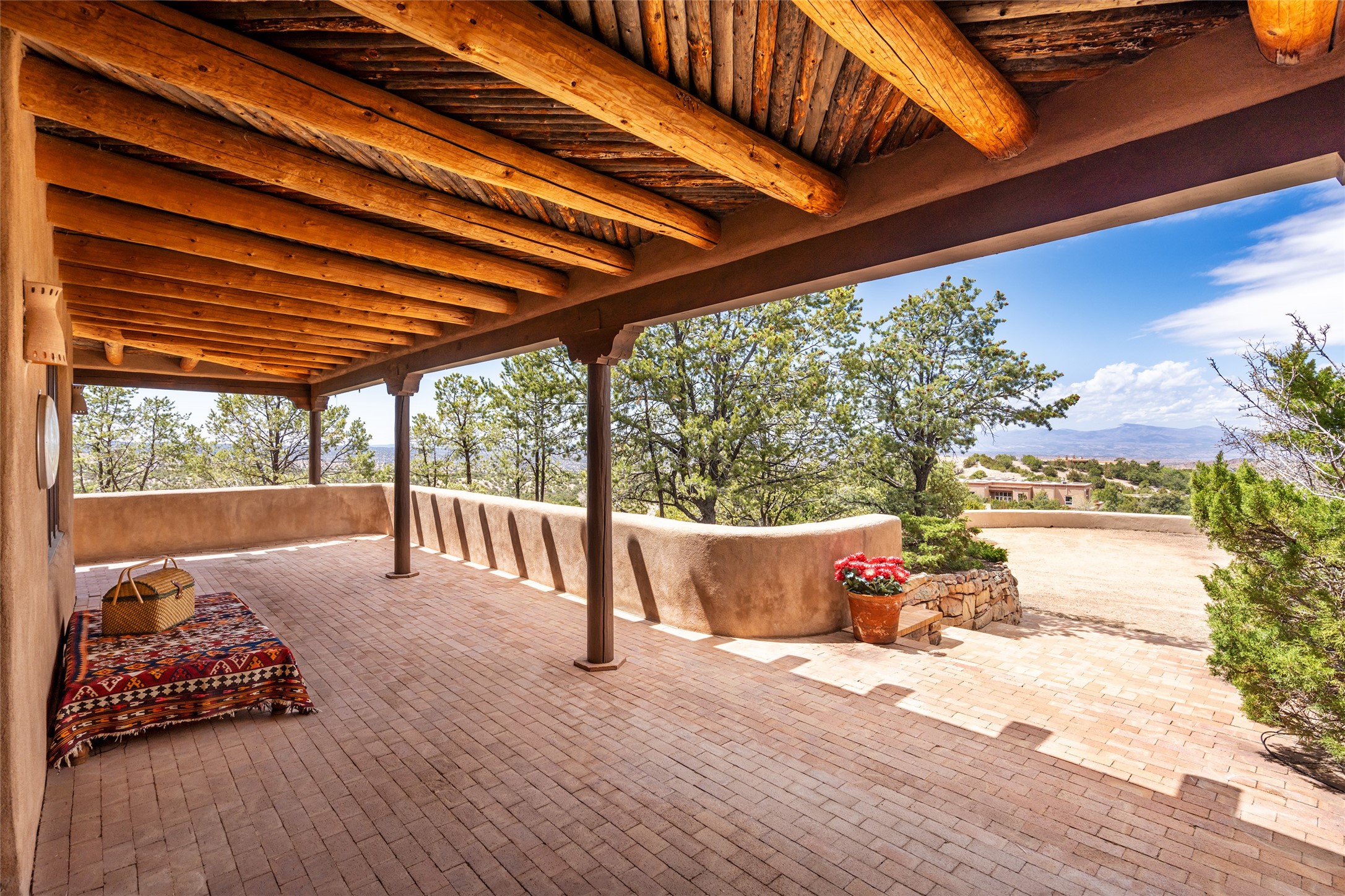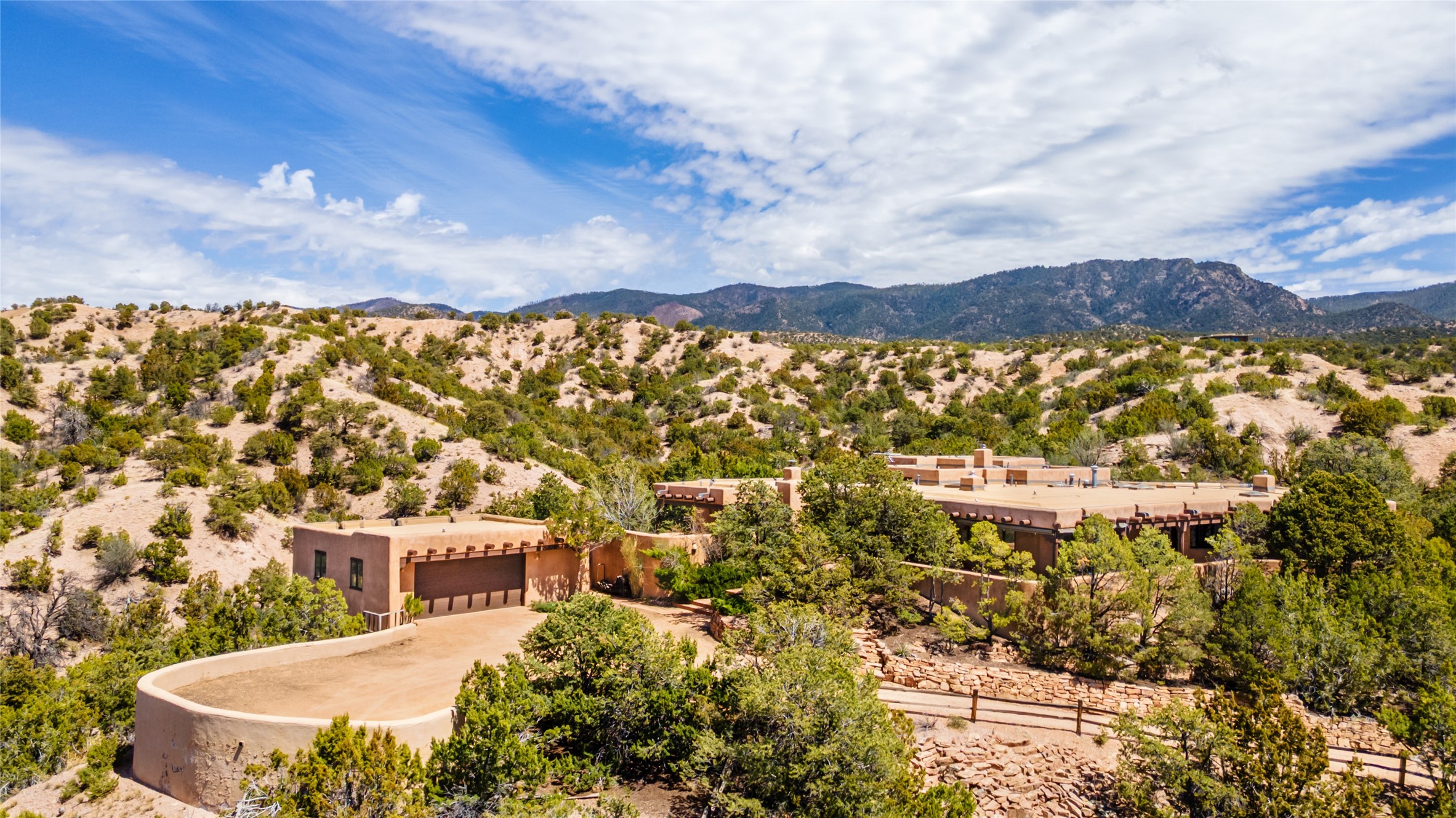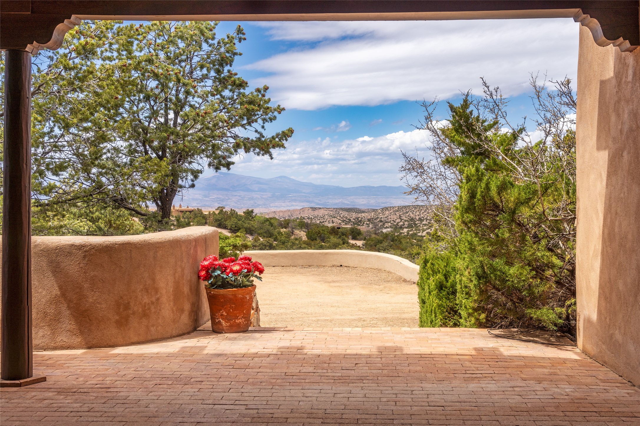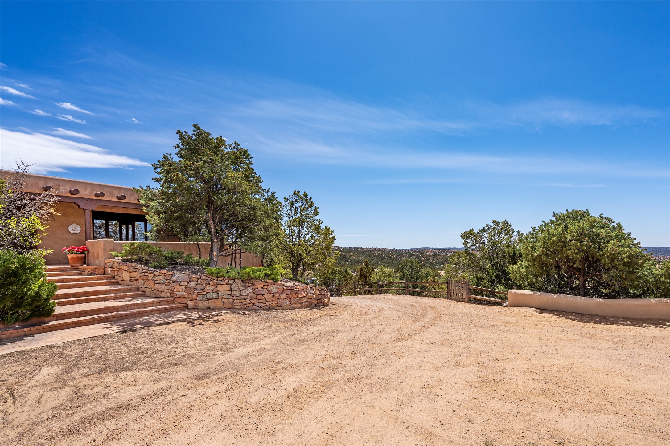 Located in the prestigious gated community of Los Caminitos in Tesuque, New Mexico, 61 Calle Encanto is a spacious residence that offers both comfort and tranquility sited on 8+ acres of scenic land. Traditional Santa Fe features are abundant. The property boasts panoramic views of the Jemez and distant mountain ranges, as well as the Santa Fe Opera house, providing a backdrop of natural beauty that enhances its peaceful, private setting. Sunrises, sunsets, and starry nights will delight. This gracious four-bedroom, five bath home features two primary suites and a private guest wing - thoughtfully separated from the main living areas. The floor plan offers privacy for all and generous living spaces. Additionally, there is an inviting den/library with ample shelves and a cozy fireplace. Another of the home's highlights is its large wrap-around portal, offering shaded spaces for enjoying the serene environment and views or hosting gatherings. The mature landscaping complements the property's natural surroundings. In addition to the property's private amenities, residents of Los Caminitos have access to an inviting clubhouse, with a pool, tennis court, and pickleball court - adding to the lifestyle appeal.