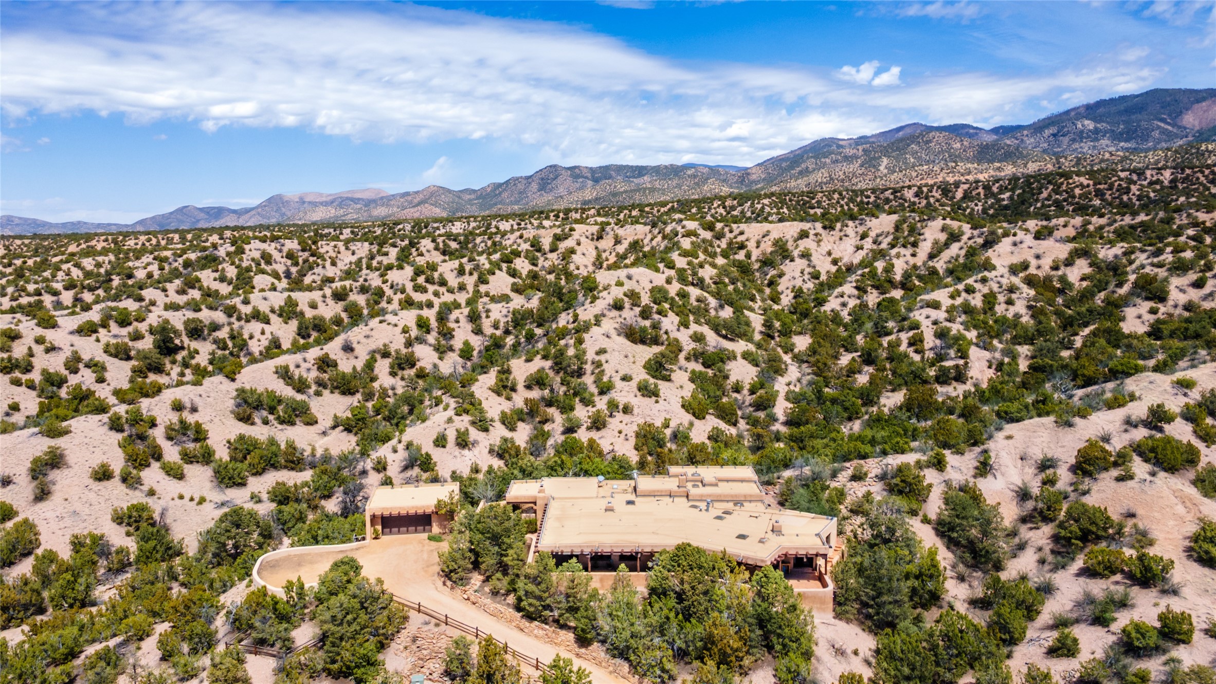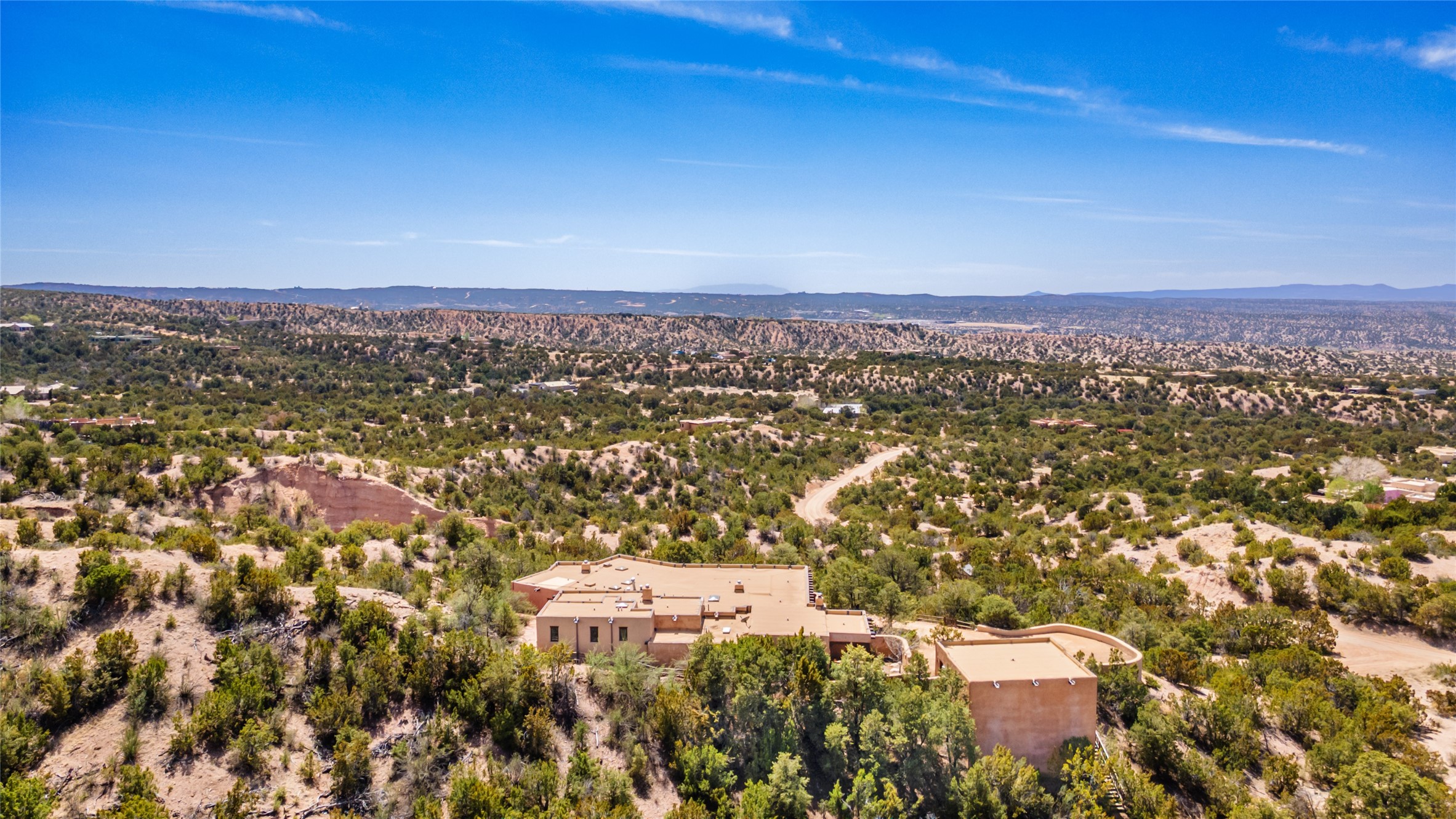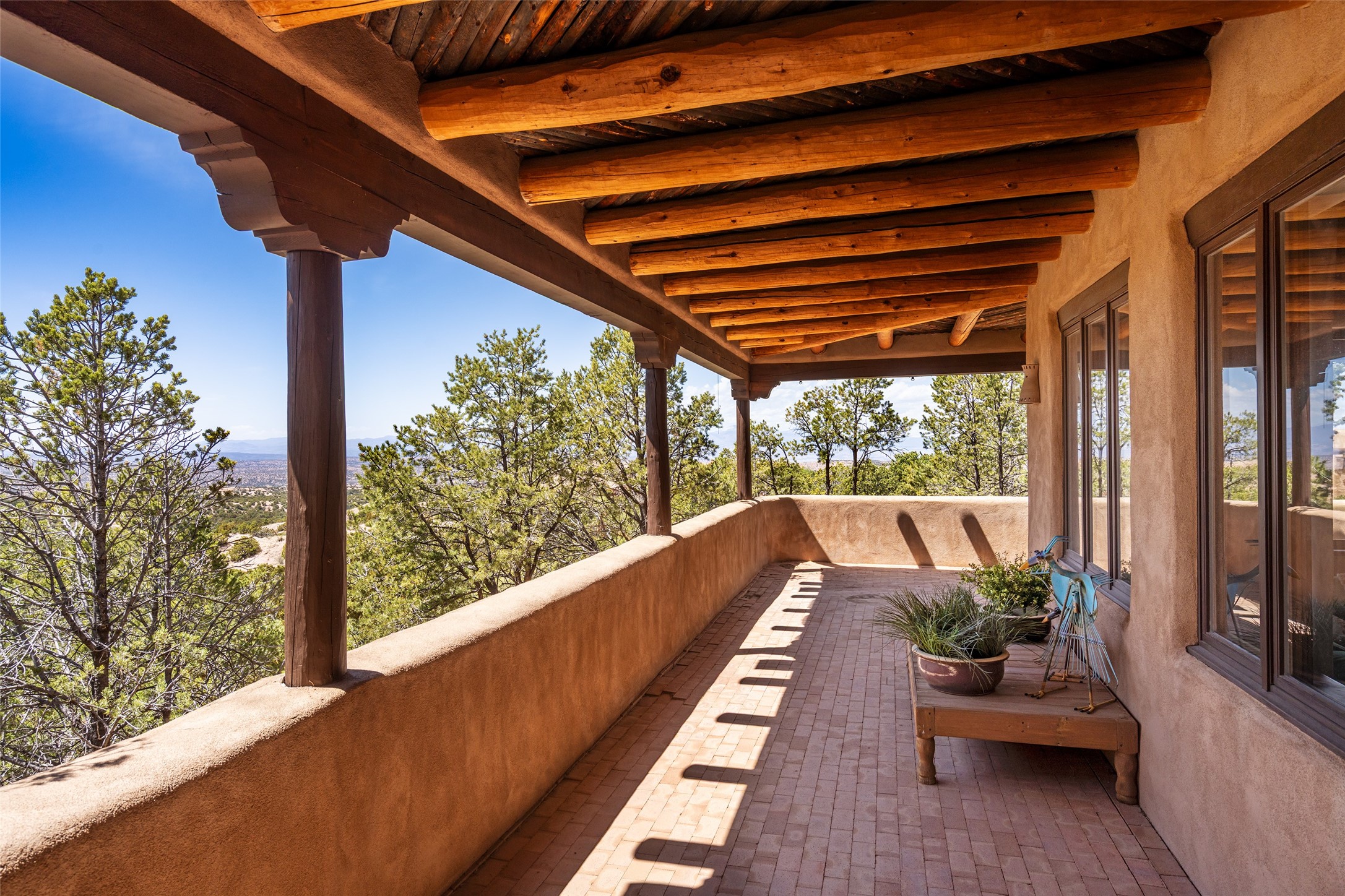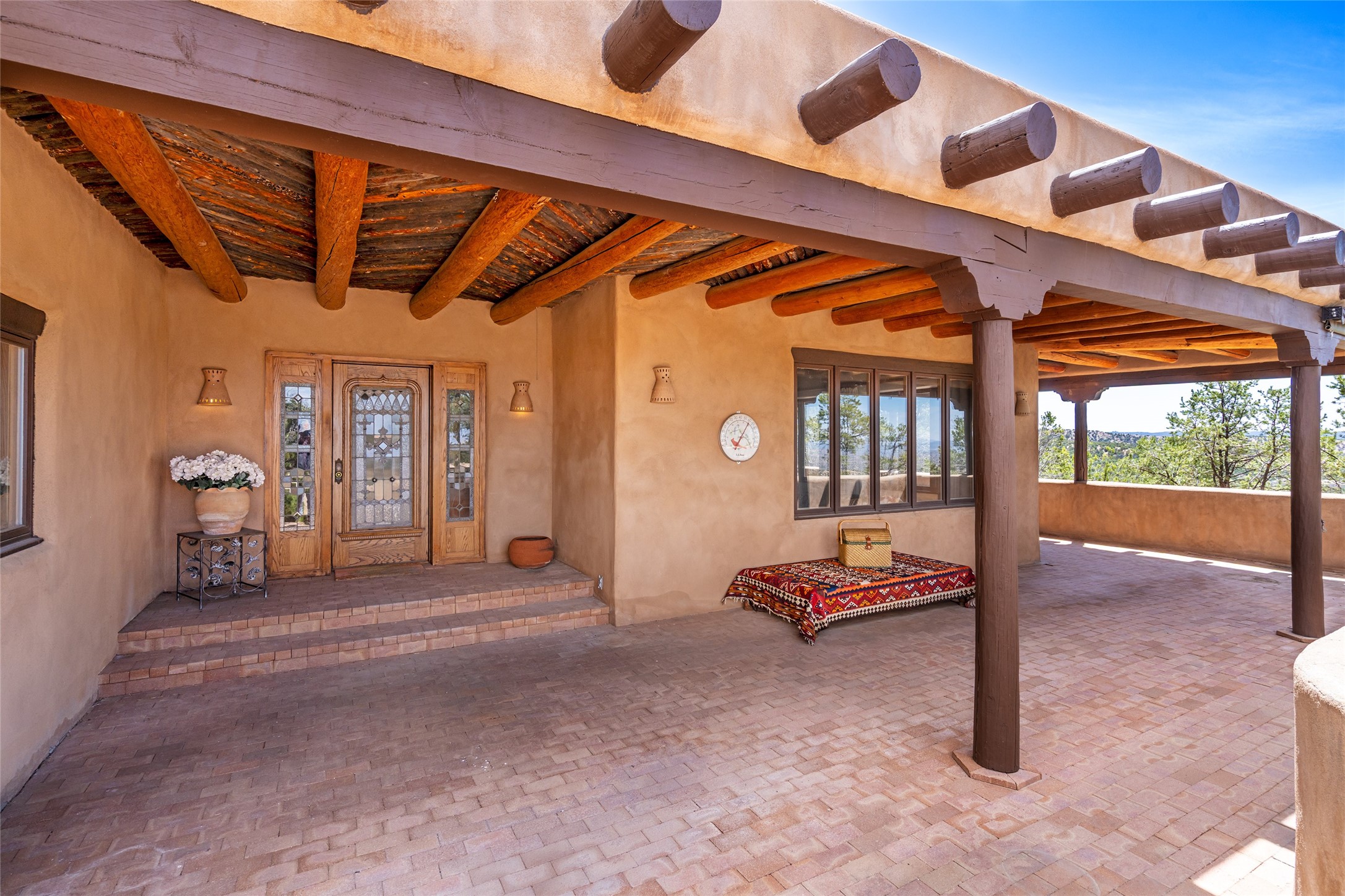 Located in the prestigious gated community of Los Caminitos in Tesuque, New Mexico, 61 Calle Encanto is a spacious residence that offers both comfort and tranquility sited on 8+ acres of scenic land. Traditional Santa Fe features are abundant. The property boasts panoramic views of the Jemez and distant mountain ranges, as well as the Santa Fe Opera house, providing a backdrop of natural beauty that enhances its peaceful, private setting. Sunrises, sunsets, and starry nights will delight. This gracious four-bedroom, five bath home features two primary suites and a private guest wing - thoughtfully separated from the main living areas. The floor plan offers privacy for all and generous living spaces. Additionally, there is an inviting den/library with ample shelves and a cozy fireplace. Another of the home's highlights is its large wrap-around portal, offering shaded spaces for enjoying the serene environment and views or hosting gatherings. The mature landscaping complements the property's natural surroundings. In addition to the property's private amenities, residents of Los Caminitos have access to an inviting clubhouse, with a pool, tennis court, and pickleball court - adding to the lifestyle appeal.