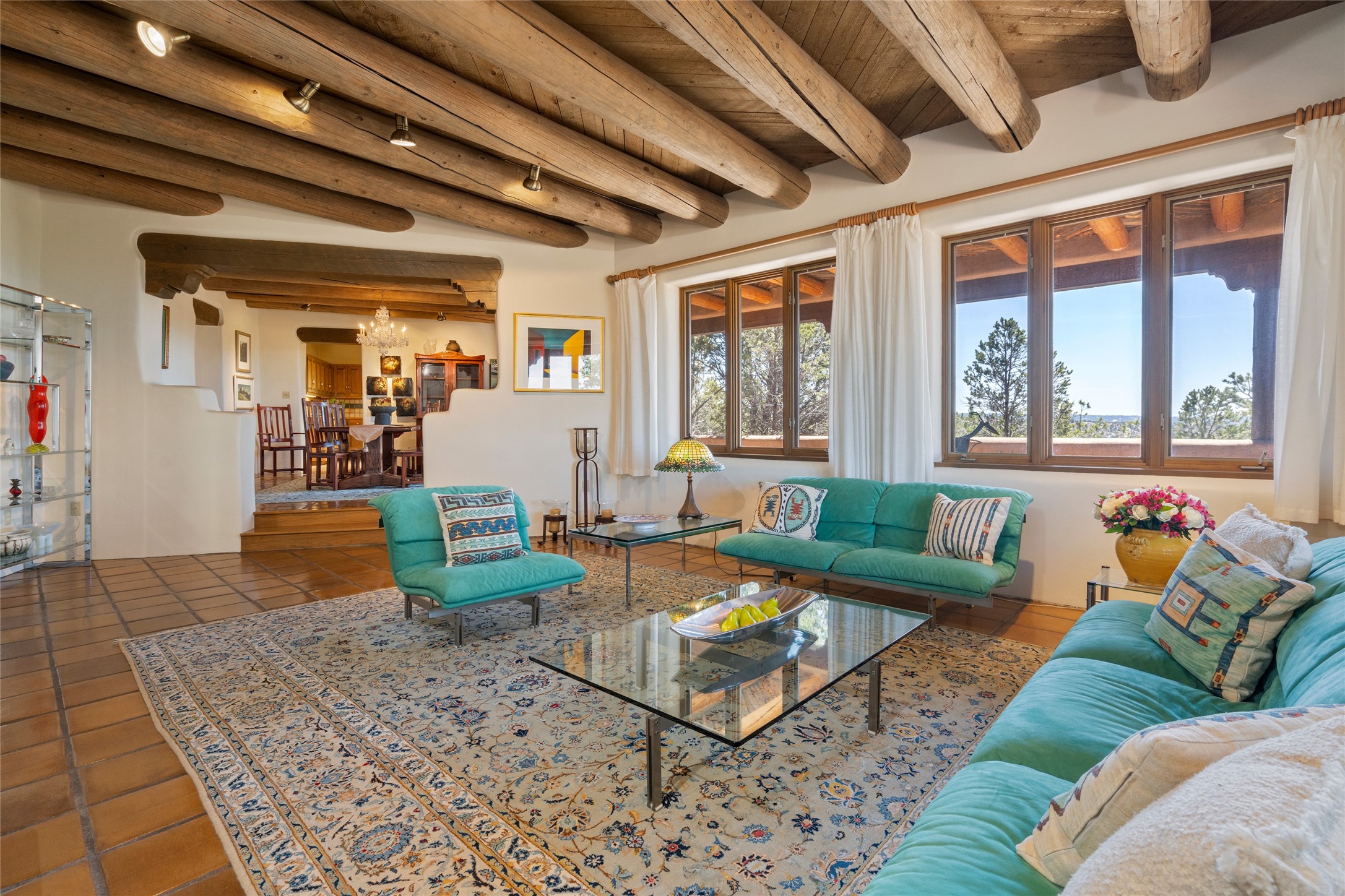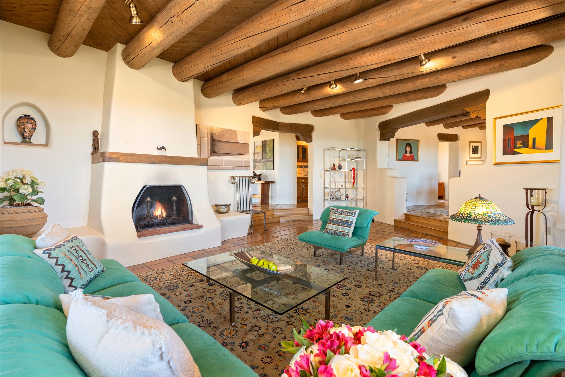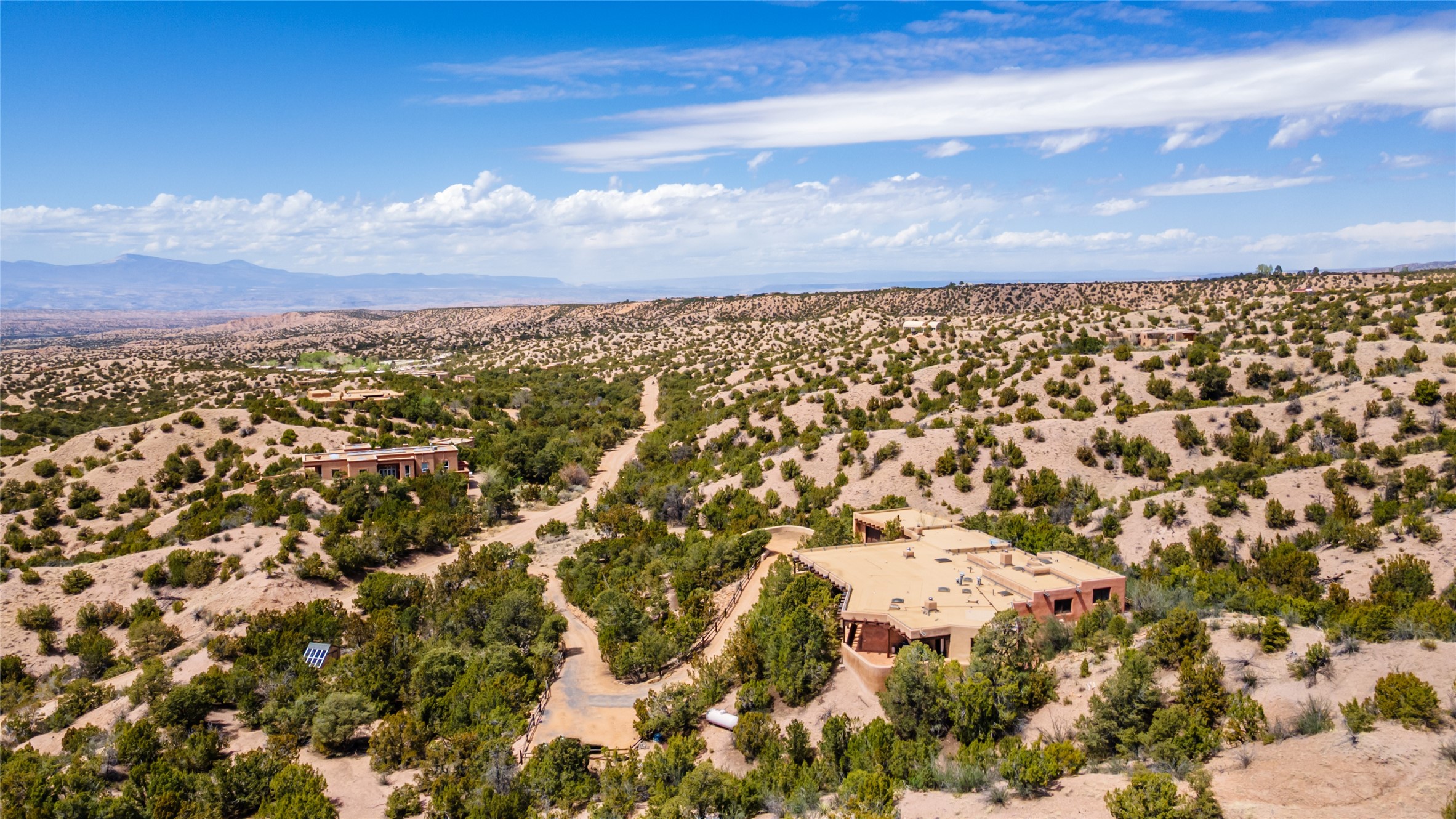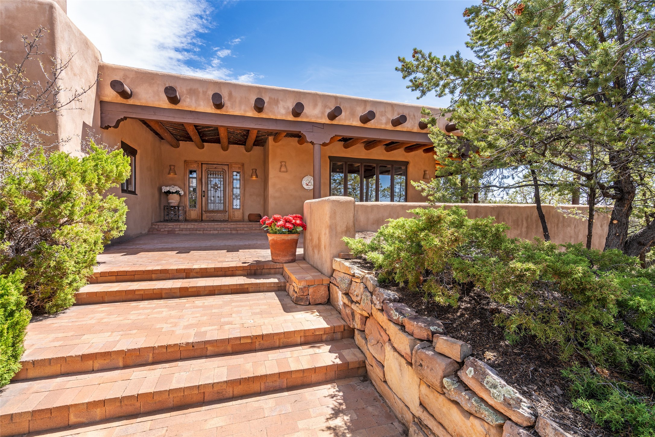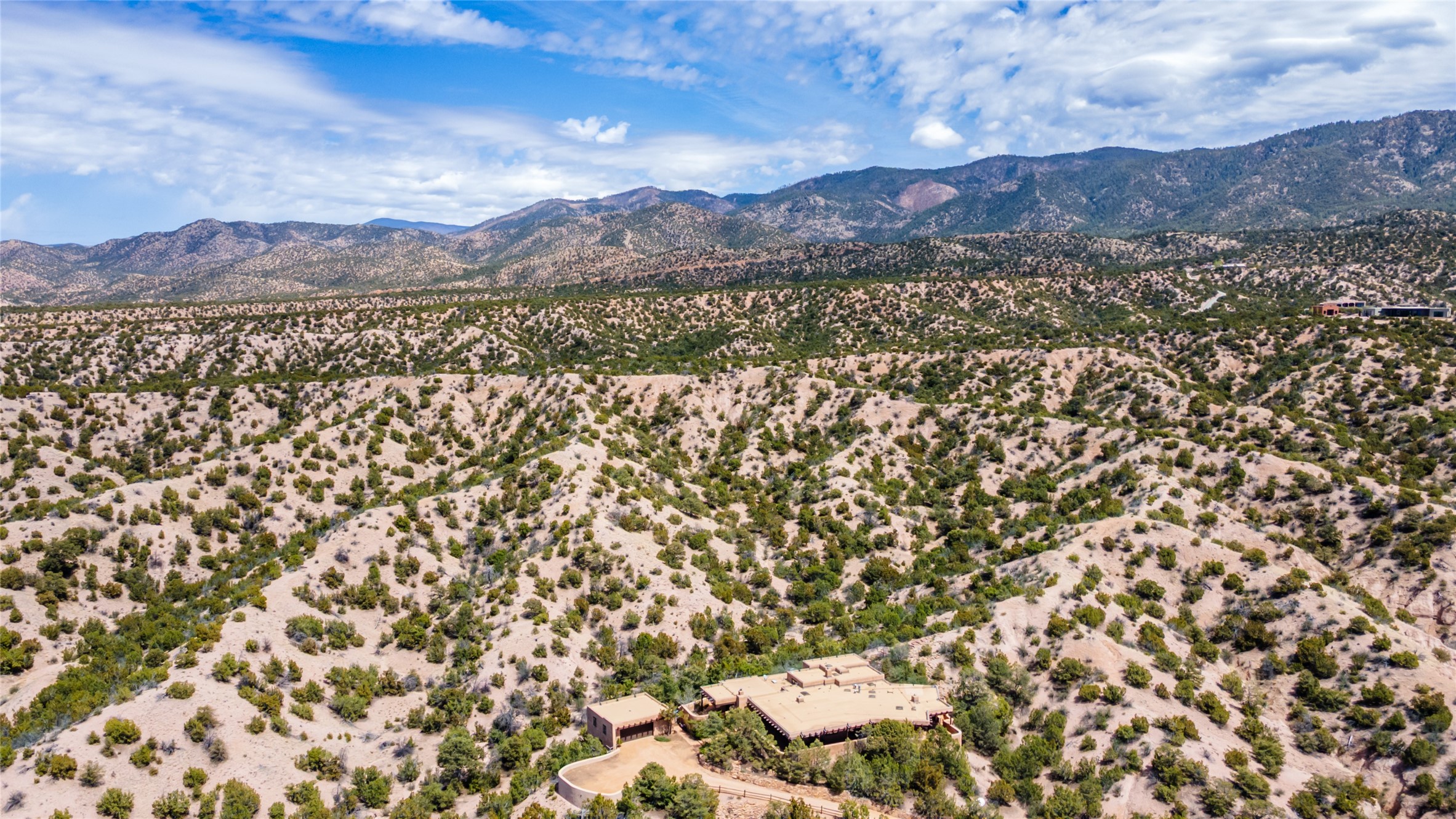 Located in the prestigious gated community of Los Caminitos in Tesuque, New Mexico, 61 Calle Encanto is a spacious residence that offers both comfort and tranquility sited on 8+ acres of scenic land. Traditional Santa Fe features are abundant. The property boasts panoramic views of the Jemez and distant mountain ranges, as well as the Santa Fe Opera house, providing a backdrop of natural beauty that enhances its peaceful, private setting. Sunrises, sunsets, and starry nights will delight. This gracious four-bedroom, five bath home features two primary suites and a private guest wing - thoughtfully separated from the main living areas. The floor plan offers privacy for all and generous living spaces. Additionally, there is an inviting den/library with ample shelves and a cozy fireplace. Another of the home's highlights is its large wrap-around portal, offering shaded spaces for enjoying the serene environment and views or hosting gatherings. The mature landscaping complements the property's natural surroundings. In addition to the property's private amenities, residents of Los Caminitos have access to an inviting clubhouse, with a pool, tennis court, and pickleball court - adding to the lifestyle appeal.