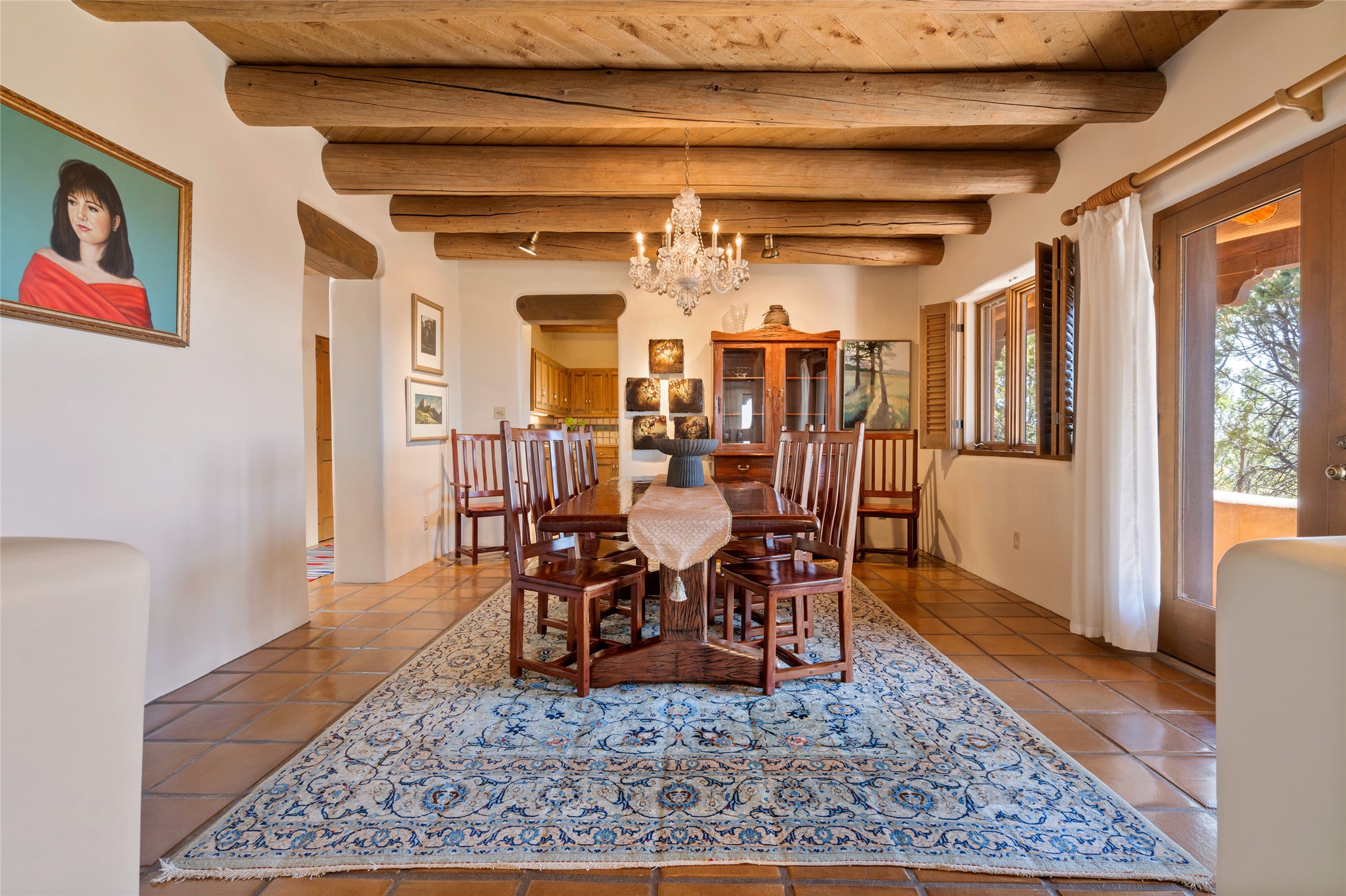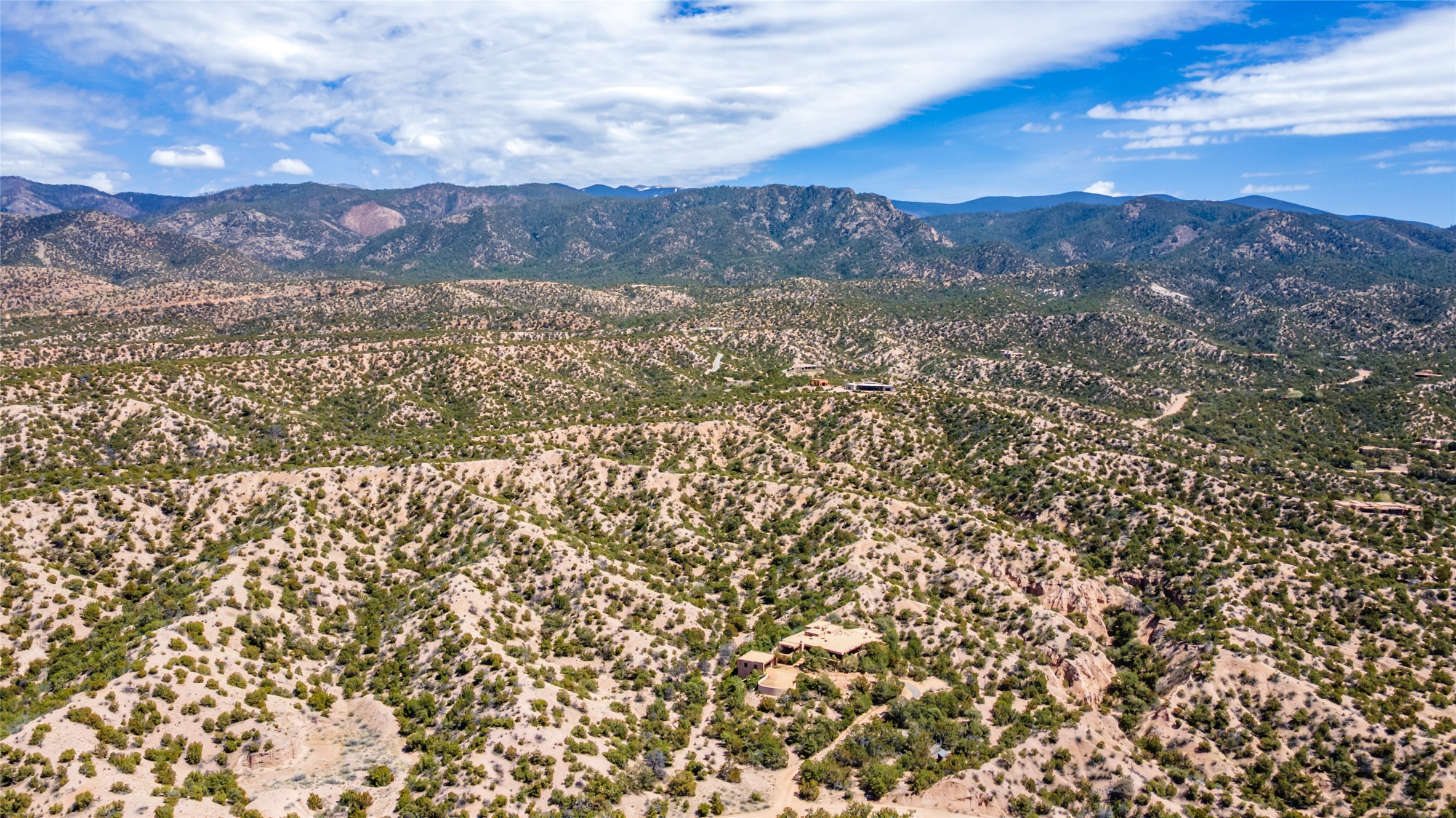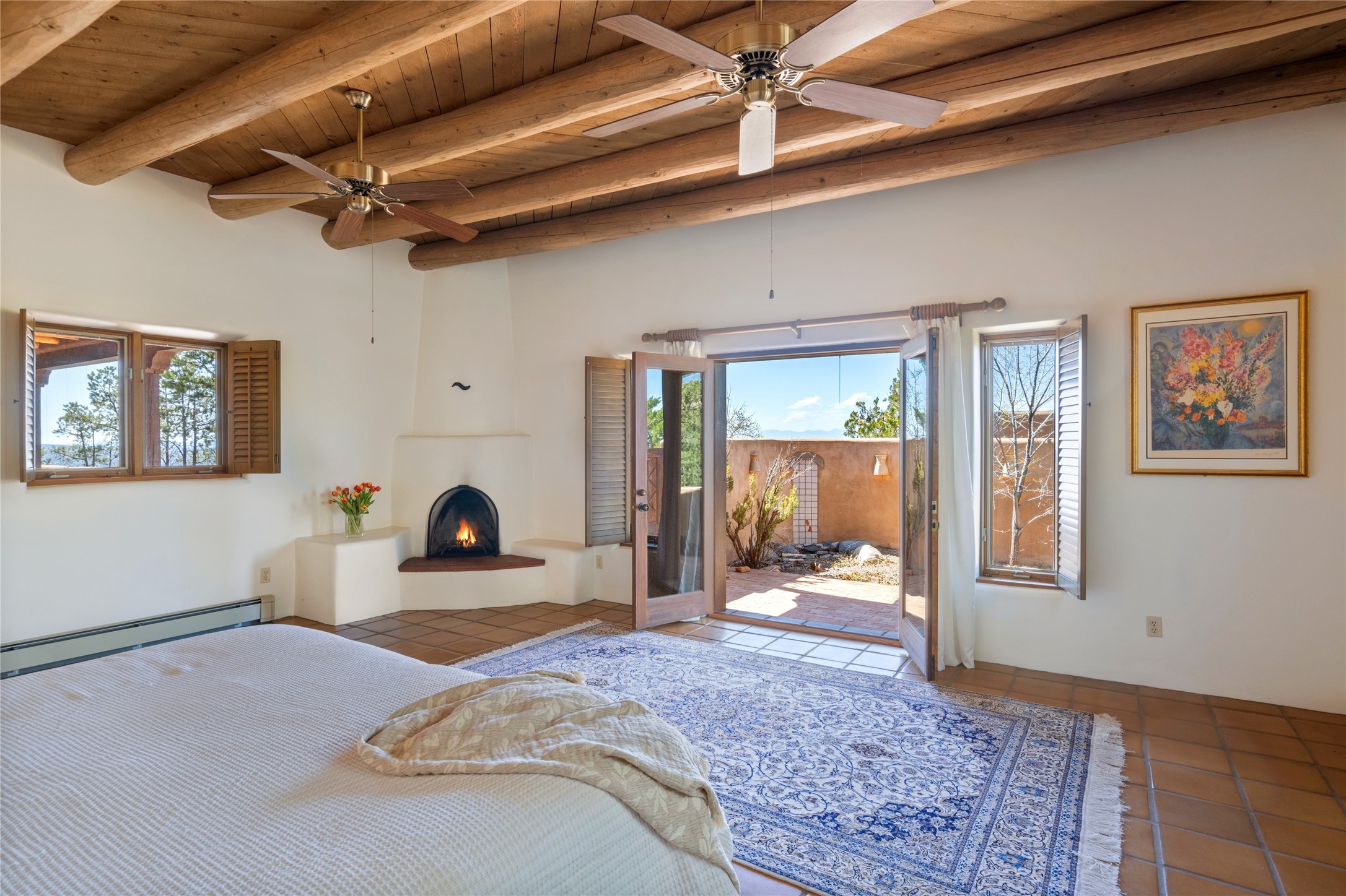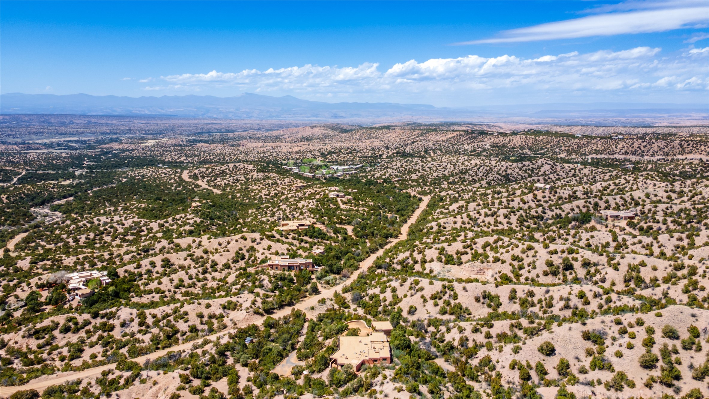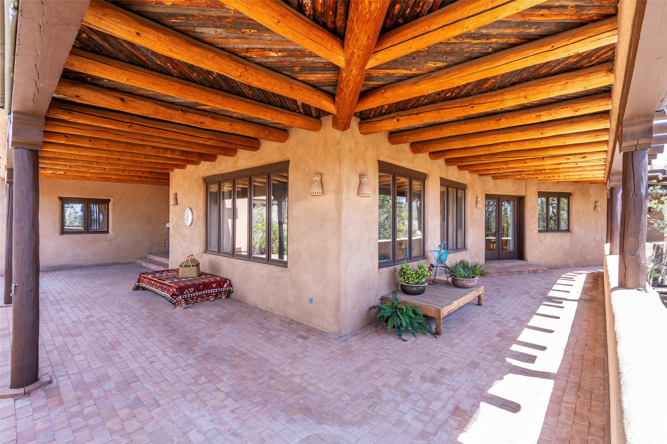 Located in the prestigious gated community of Los Caminitos in Tesuque, New Mexico, 61 Calle Encanto is a spacious residence that offers both comfort and tranquility sited on 8+ acres of scenic land. Traditional Santa Fe features are abundant. The property boasts panoramic views of the Jemez and distant mountain ranges, as well as the Santa Fe Opera house, providing a backdrop of natural beauty that enhances its peaceful, private setting. Sunrises, sunsets, and starry nights will delight. This gracious four-bedroom, five bath home features two primary suites and a private guest wing - thoughtfully separated from the main living areas. The floor plan offers privacy for all and generous living spaces. Additionally, there is an inviting den/library with ample shelves and a cozy fireplace. Another of the home's highlights is its large wrap-around portal, offering shaded spaces for enjoying the serene environment and views or hosting gatherings. The mature landscaping complements the property's natural surroundings. In addition to the property's private amenities, residents of Los Caminitos have access to an inviting clubhouse, with a pool, tennis court, and pickleball court - adding to the lifestyle appeal.
