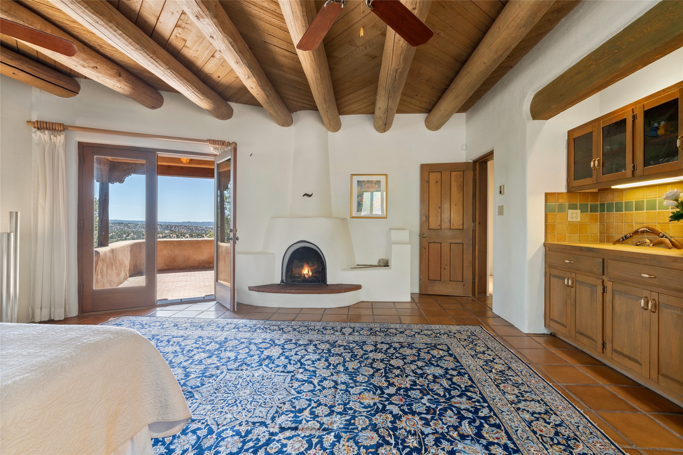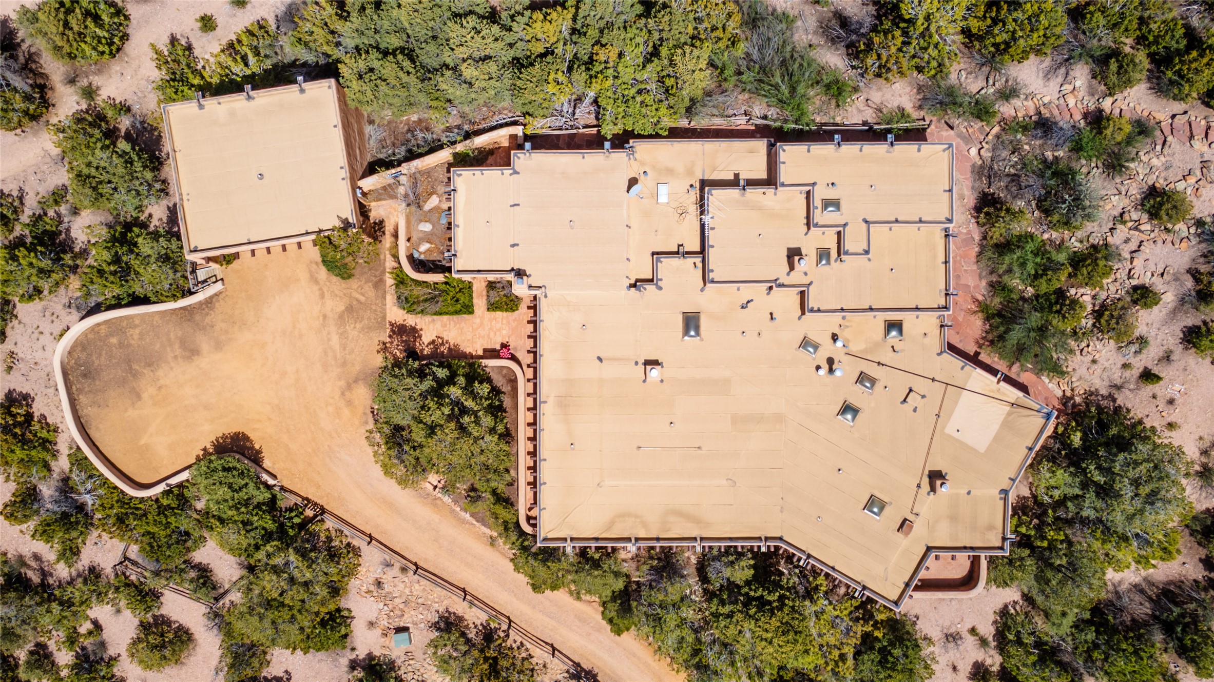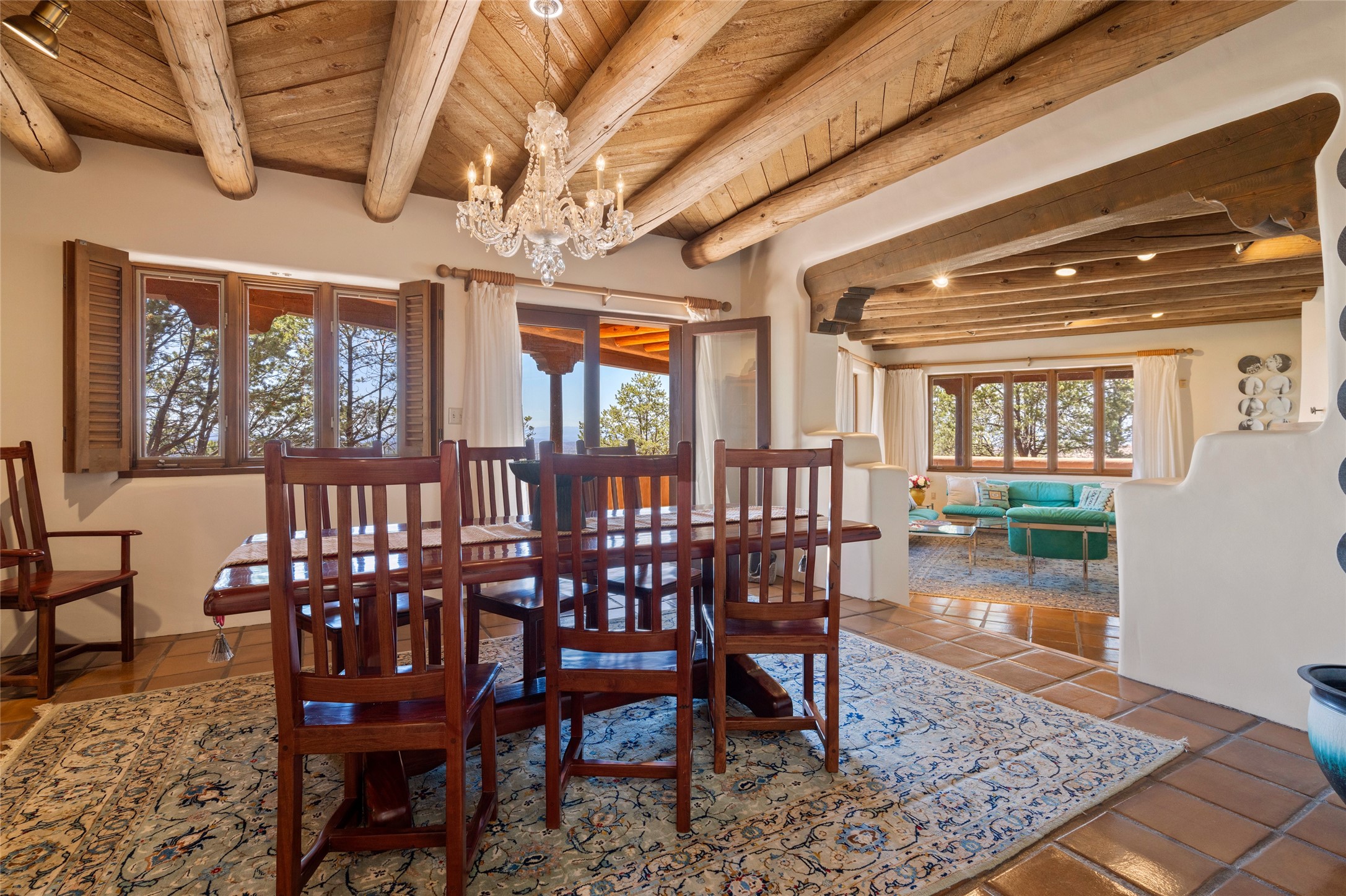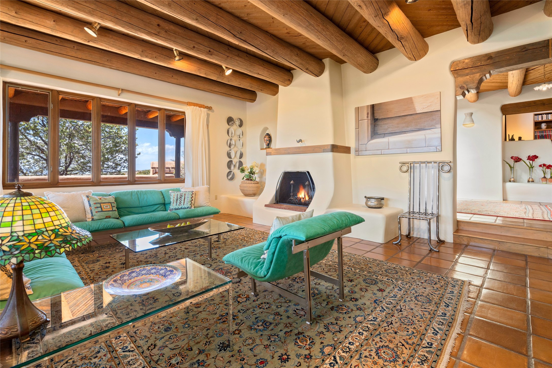 Located in the prestigious gated community of Los Caminitos in Tesuque, New Mexico, 61 Calle Encanto is a spacious residence that offers both comfort and tranquility sited on 8+ acres of scenic land. Traditional Santa Fe features are abundant. The property boasts panoramic views of the Jemez and distant mountain ranges, as well as the Santa Fe Opera house, providing a backdrop of natural beauty that enhances its peaceful, private setting. Sunrises, sunsets, and starry nights will delight. This gracious four-bedroom, five bath home features two primary suites and a private guest wing - thoughtfully separated from the main living areas. The floor plan offers privacy for all and generous living spaces. Additionally, there is an inviting den/library with ample shelves and a cozy fireplace. Another of the home's highlights is its large wrap-around portal, offering shaded spaces for enjoying the serene environment and views or hosting gatherings. The mature landscaping complements the property's natural surroundings. In addition to the property's private amenities, residents of Los Caminitos have access to an inviting clubhouse, with a pool, tennis court, and pickleball court - adding to the lifestyle appeal.