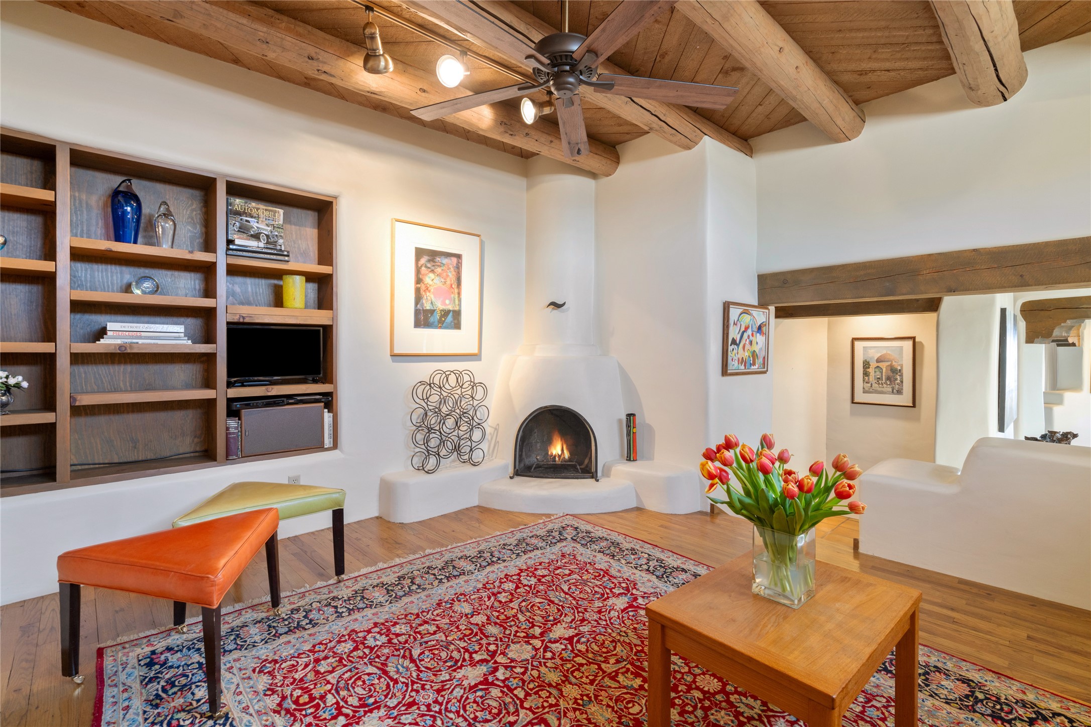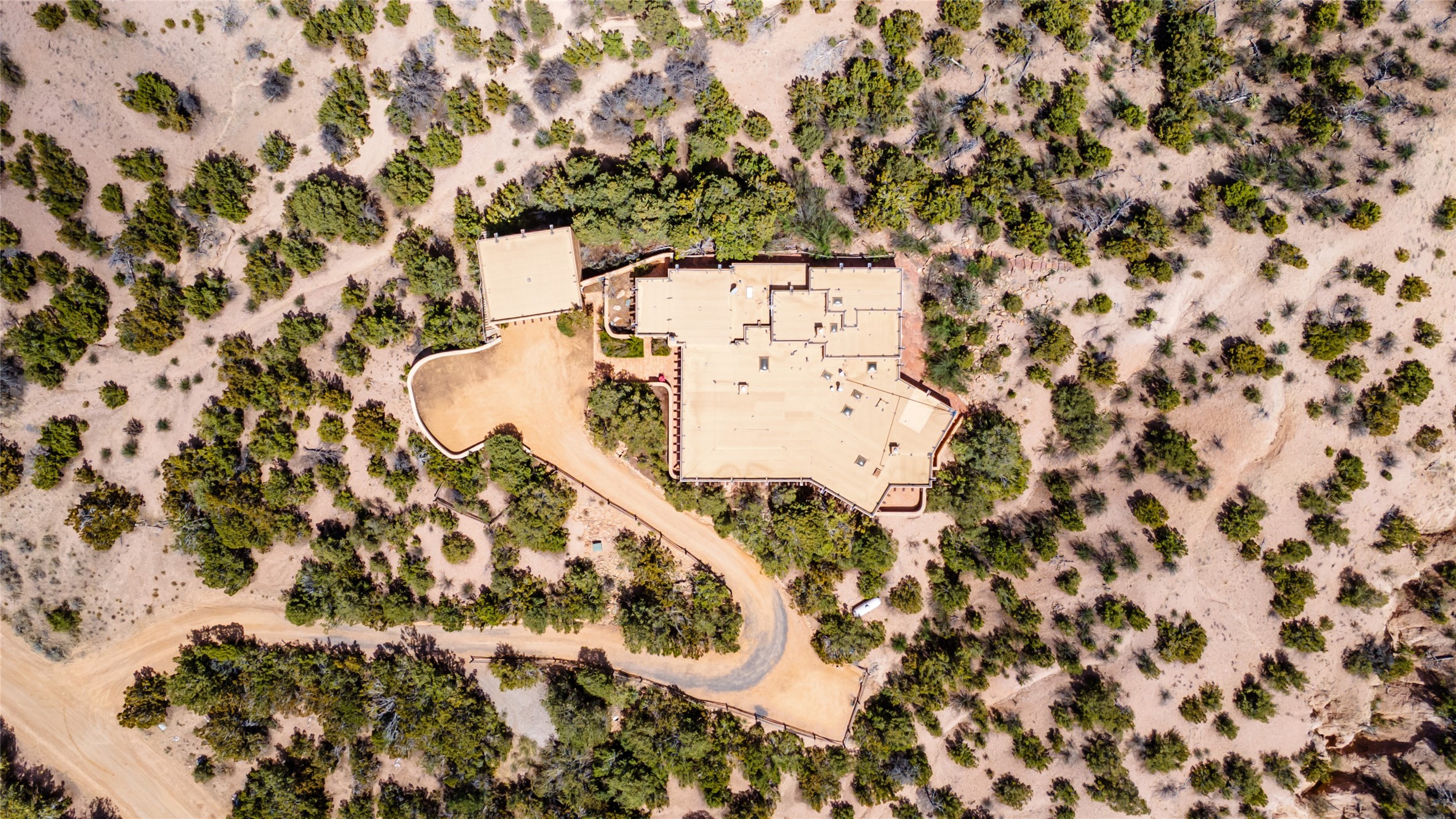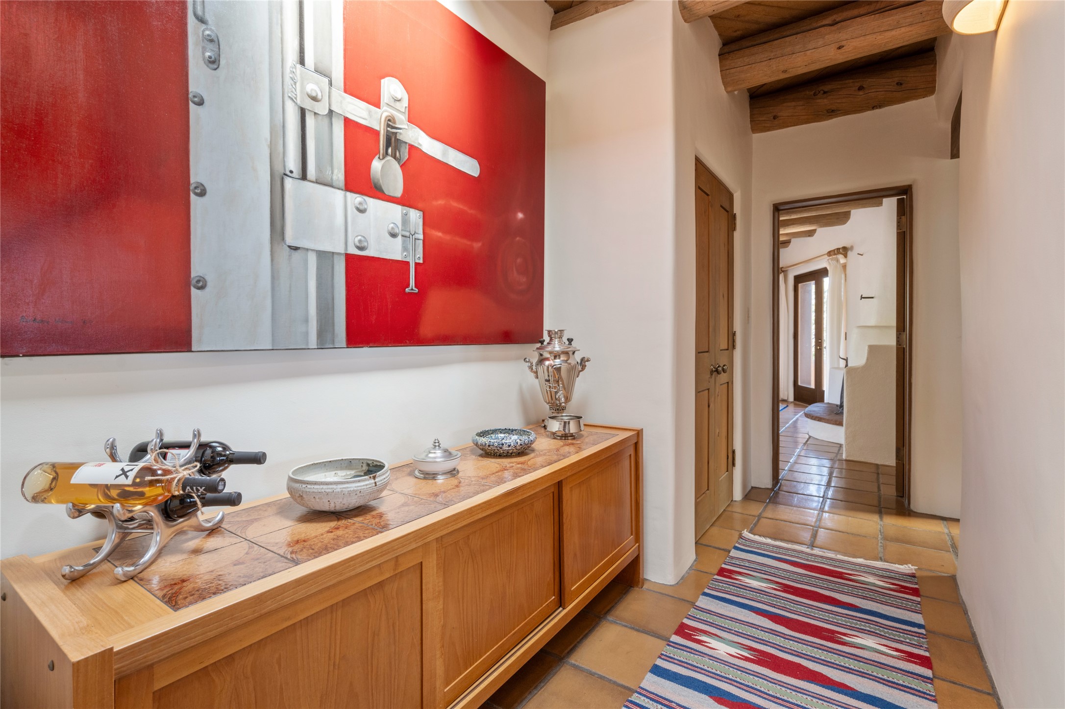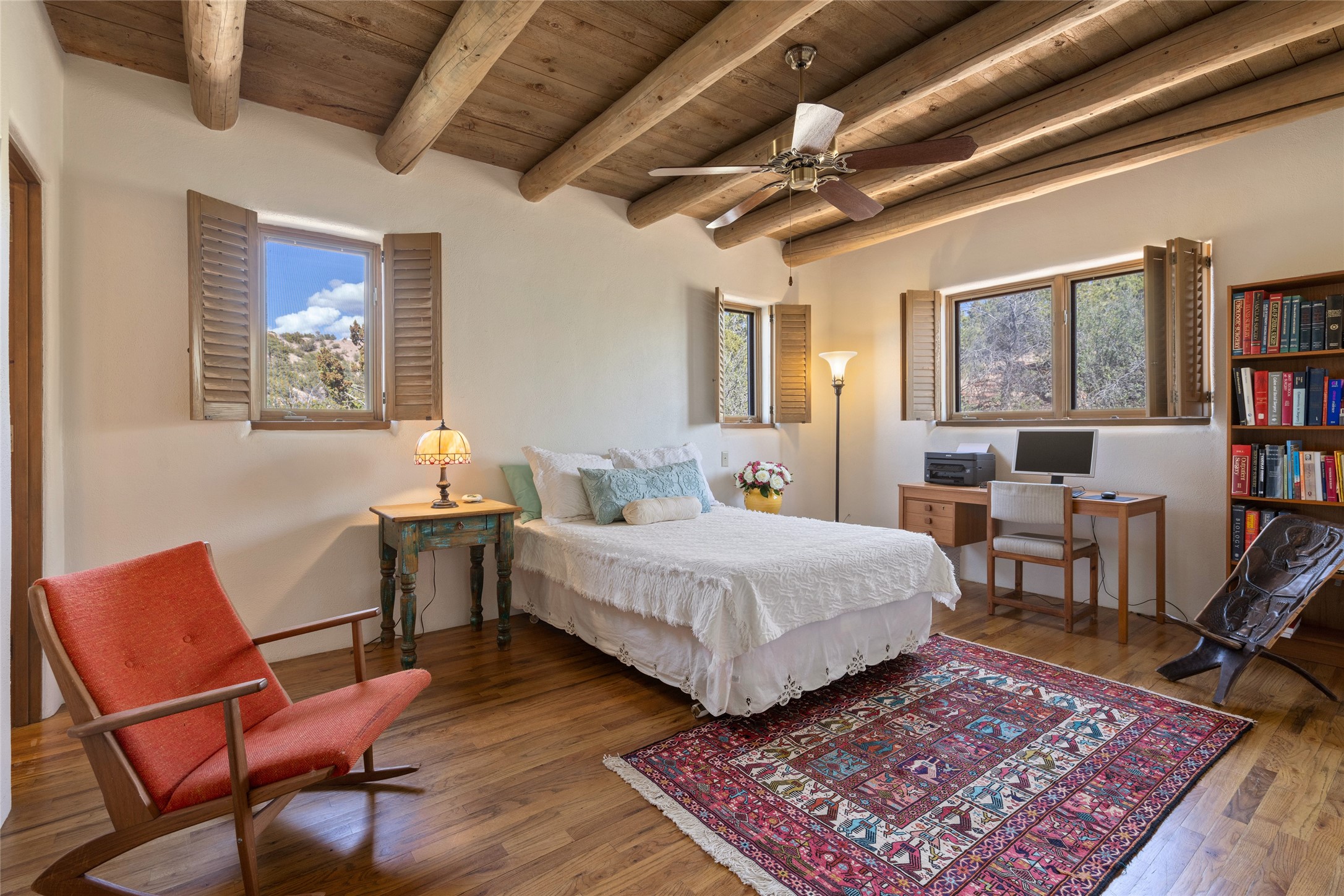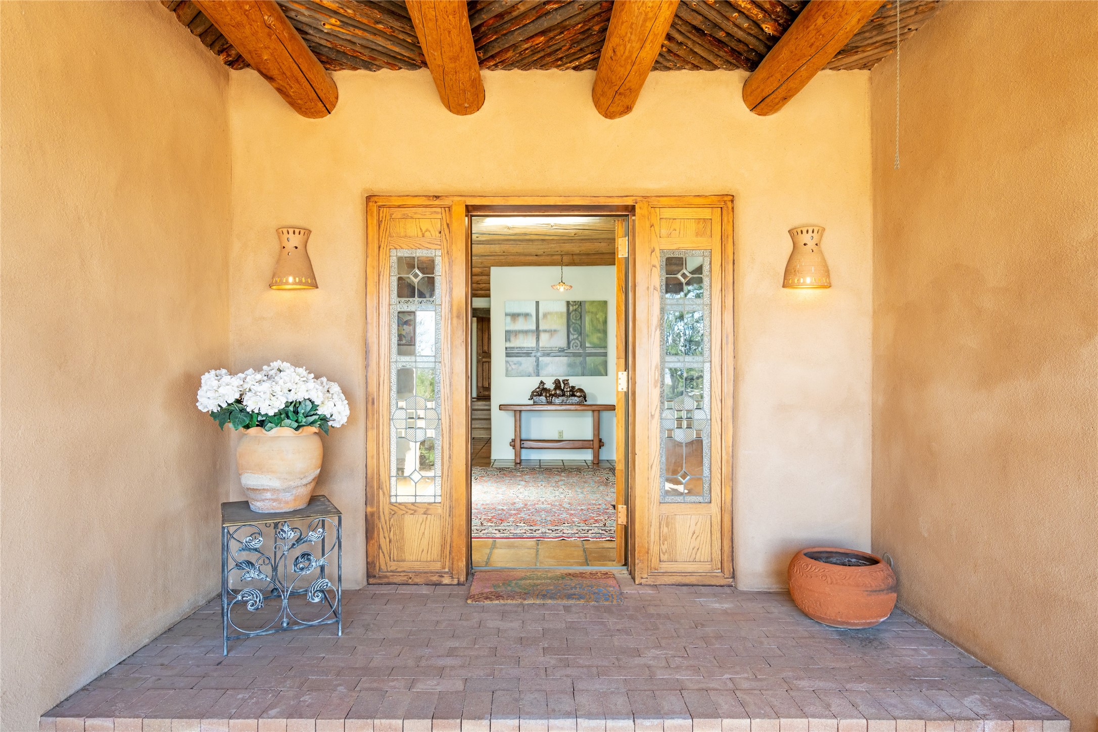 Located in the prestigious gated community of Los Caminitos in Tesuque, New Mexico, 61 Calle Encanto is a spacious residence that offers both comfort and tranquility sited on 8+ acres of scenic land. Traditional Santa Fe features are abundant. The property boasts panoramic views of the Jemez and distant mountain ranges, as well as the Santa Fe Opera house, providing a backdrop of natural beauty that enhances its peaceful, private setting. Sunrises, sunsets, and starry nights will delight. This gracious four-bedroom, five bath home features two primary suites and a private guest wing - thoughtfully separated from the main living areas. The floor plan offers privacy for all and generous living spaces. Additionally, there is an inviting den/library with ample shelves and a cozy fireplace. Another of the home's highlights is its large wrap-around portal, offering shaded spaces for enjoying the serene environment and views or hosting gatherings. The mature landscaping complements the property's natural surroundings. In addition to the property's private amenities, residents of Los Caminitos have access to an inviting clubhouse, with a pool, tennis court, and pickleball court - adding to the lifestyle appeal.