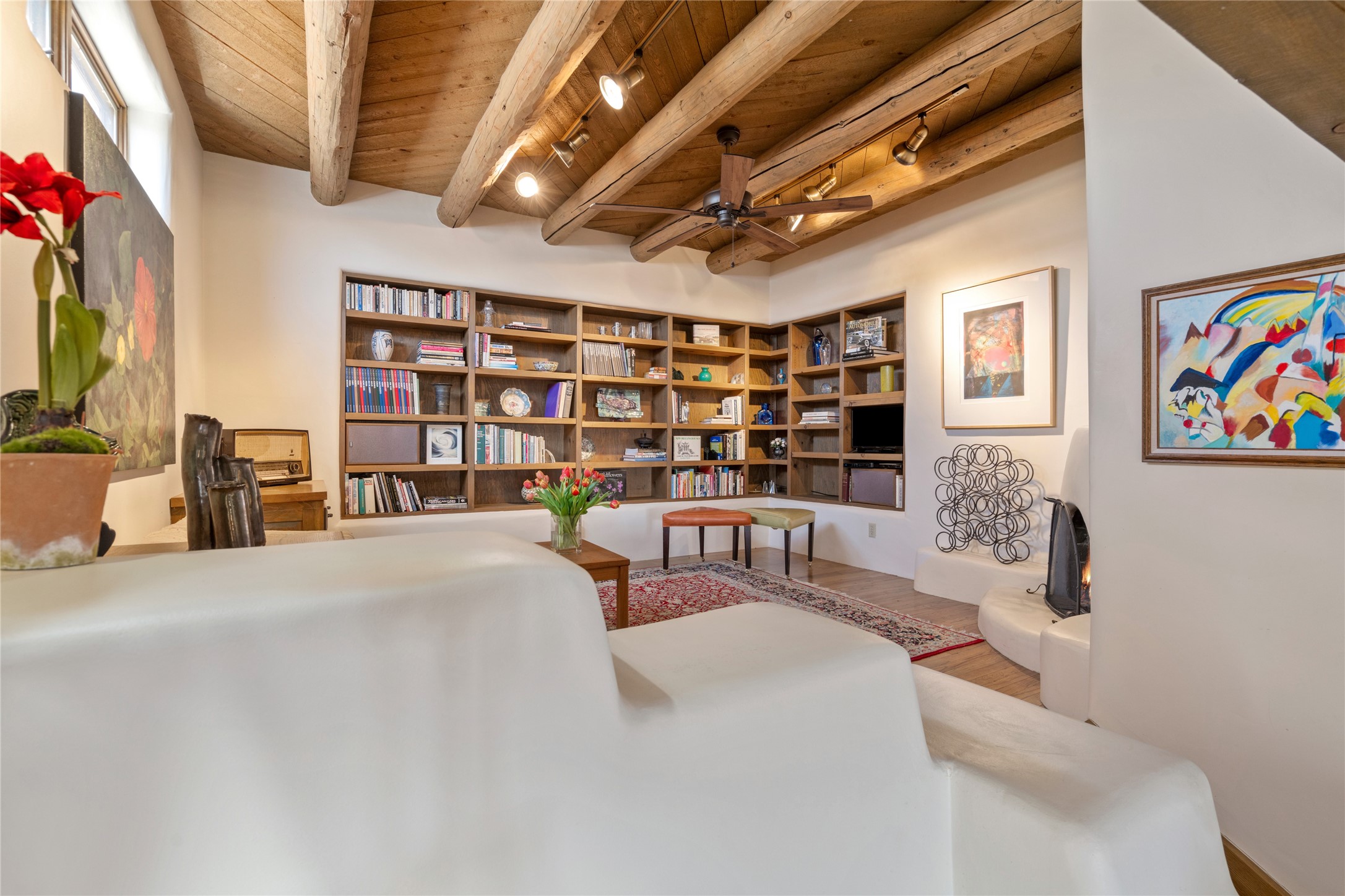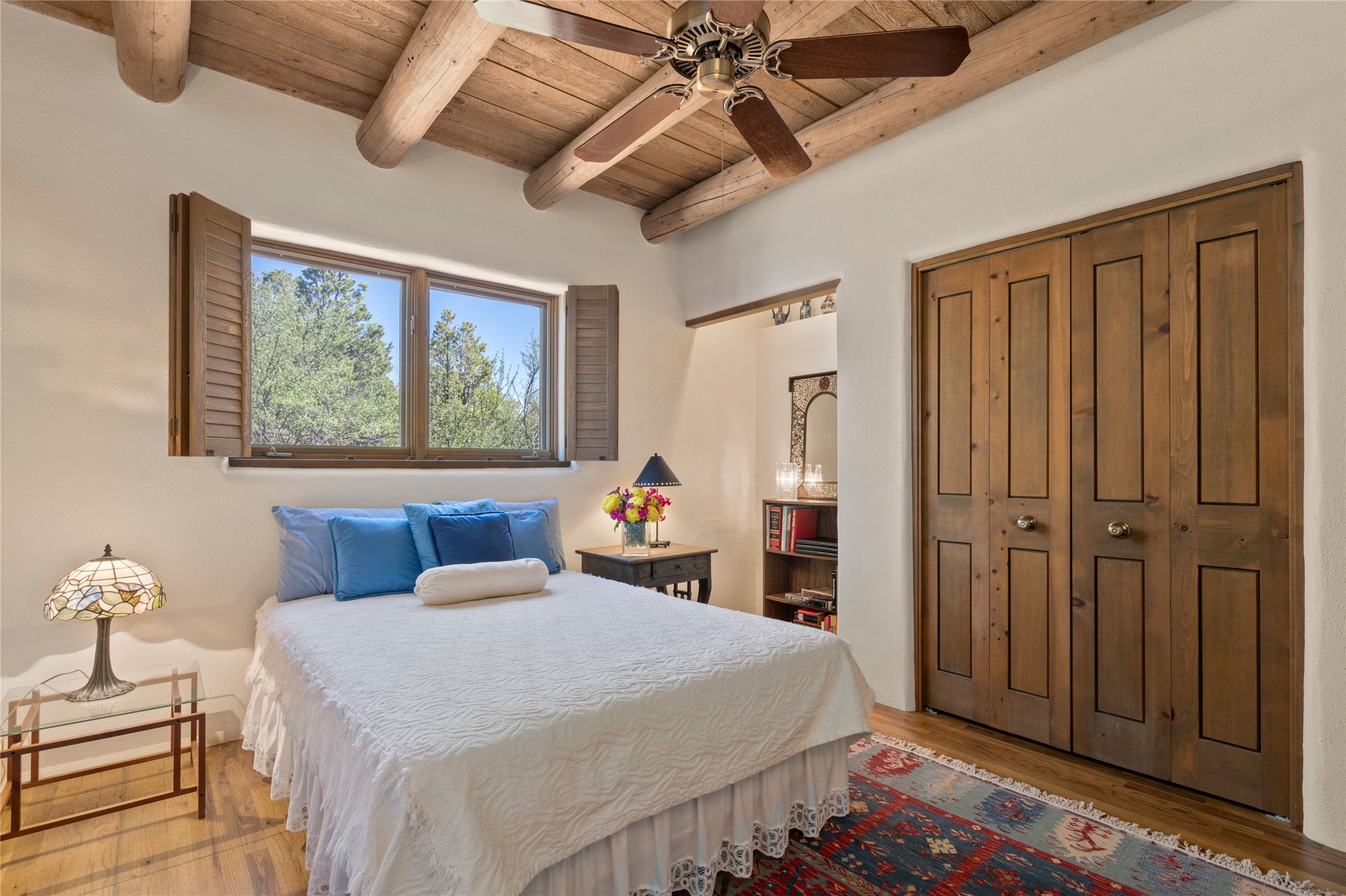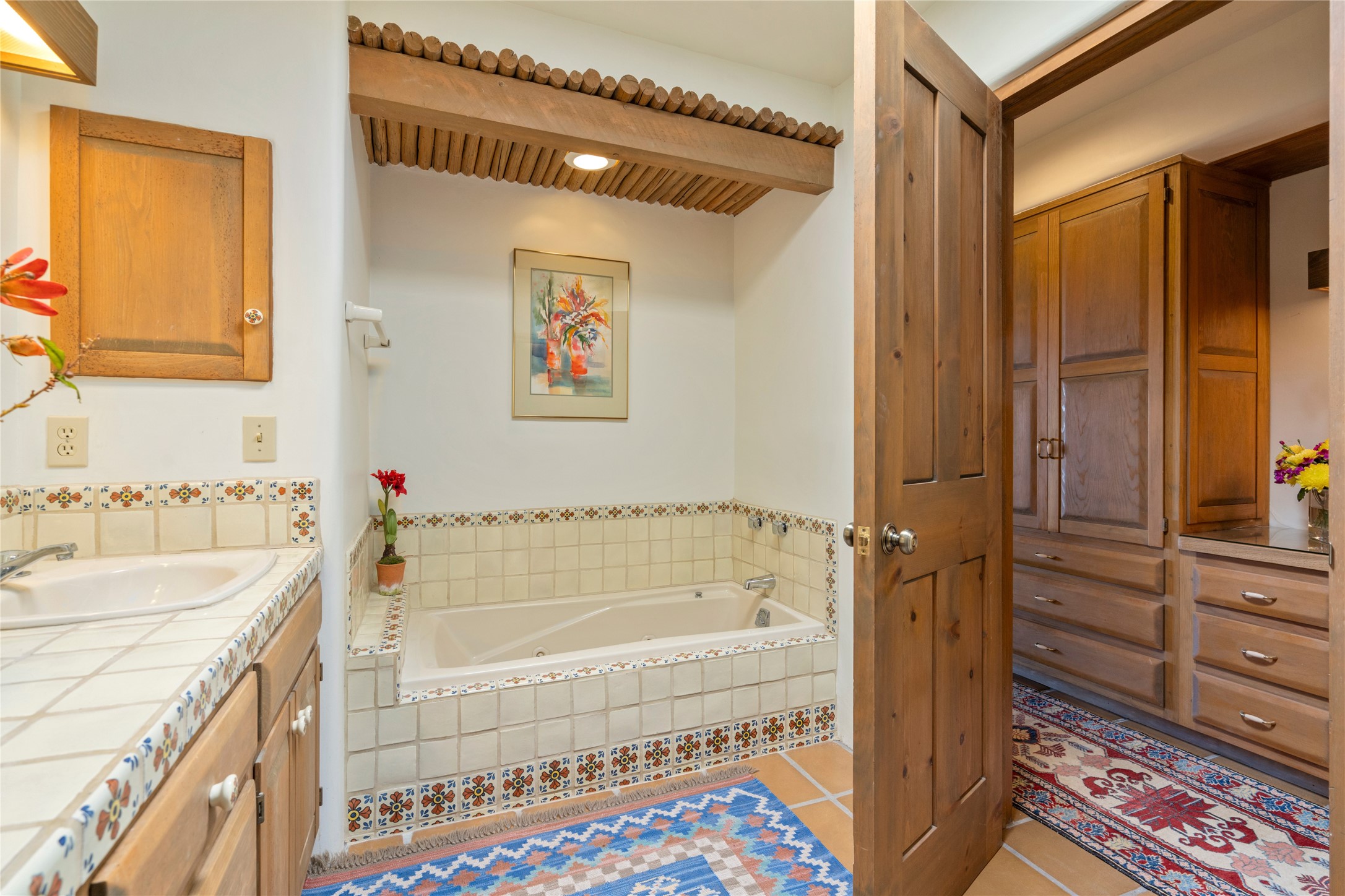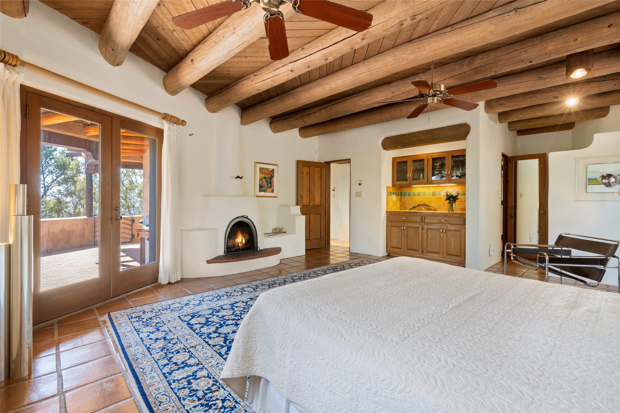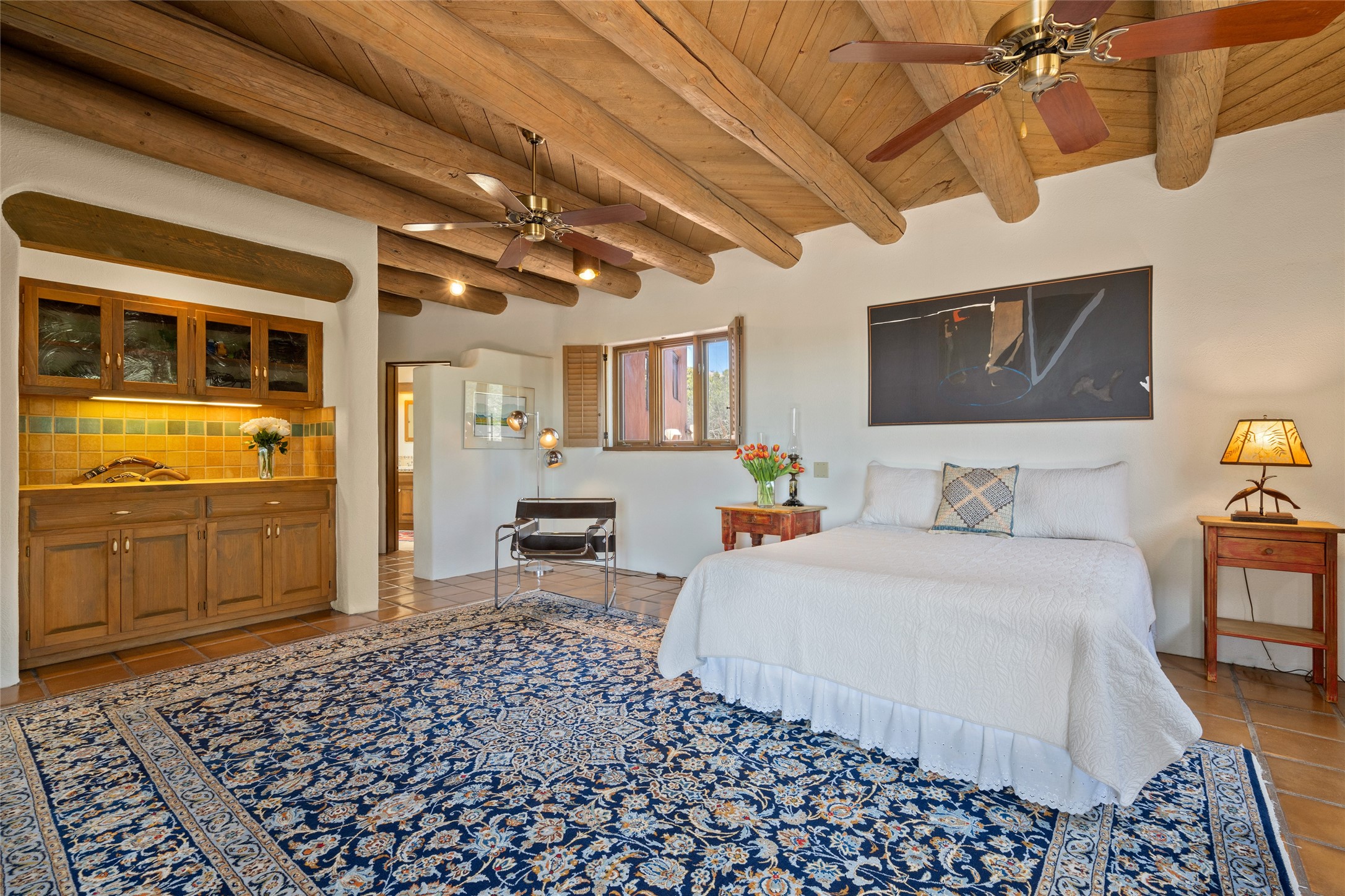 Located in the prestigious gated community of Los Caminitos in Tesuque, New Mexico, 61 Calle Encanto is a spacious residence that offers both comfort and tranquility sited on 8+ acres of scenic land. Traditional Santa Fe features are abundant. The property boasts panoramic views of the Jemez and distant mountain ranges, as well as the Santa Fe Opera house, providing a backdrop of natural beauty that enhances its peaceful, private setting. Sunrises, sunsets, and starry nights will delight. This gracious four-bedroom, five bath home features two primary suites and a private guest wing - thoughtfully separated from the main living areas. The floor plan offers privacy for all and generous living spaces. Additionally, there is an inviting den/library with ample shelves and a cozy fireplace. Another of the home's highlights is its large wrap-around portal, offering shaded spaces for enjoying the serene environment and views or hosting gatherings. The mature landscaping complements the property's natural surroundings. In addition to the property's private amenities, residents of Los Caminitos have access to an inviting clubhouse, with a pool, tennis court, and pickleball court - adding to the lifestyle appeal.